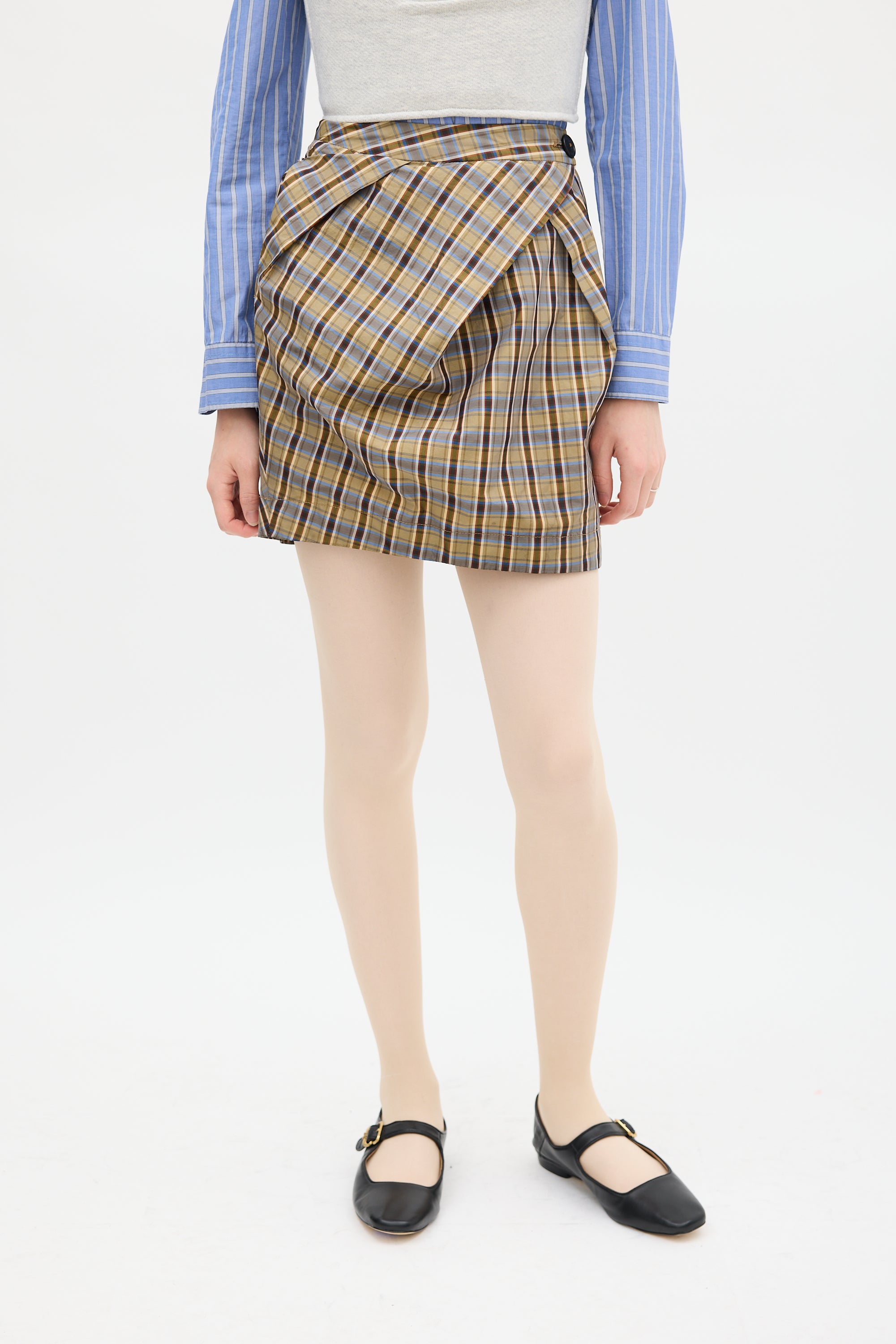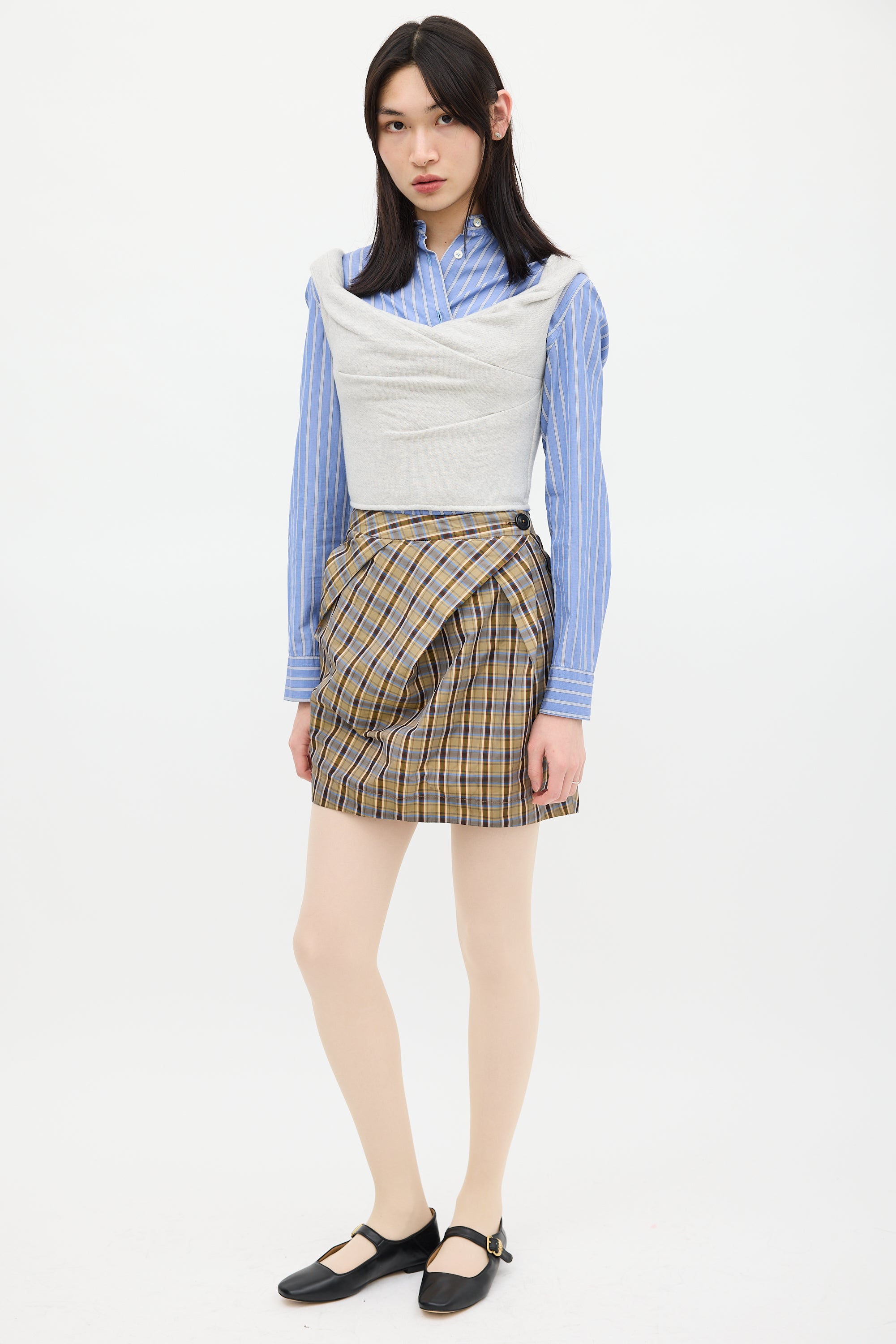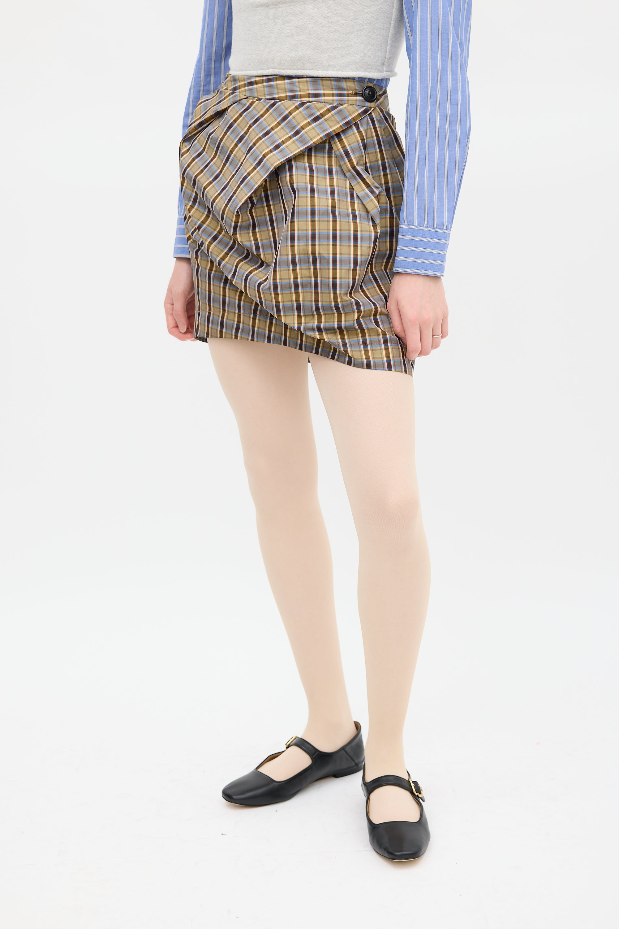 Pre-owned Vivienne Westwood brown skirt featuring a multicolour plaid pattern throughout, two slip pockets at hip, gathered detailing at front, and wrapped button detail at waist.
