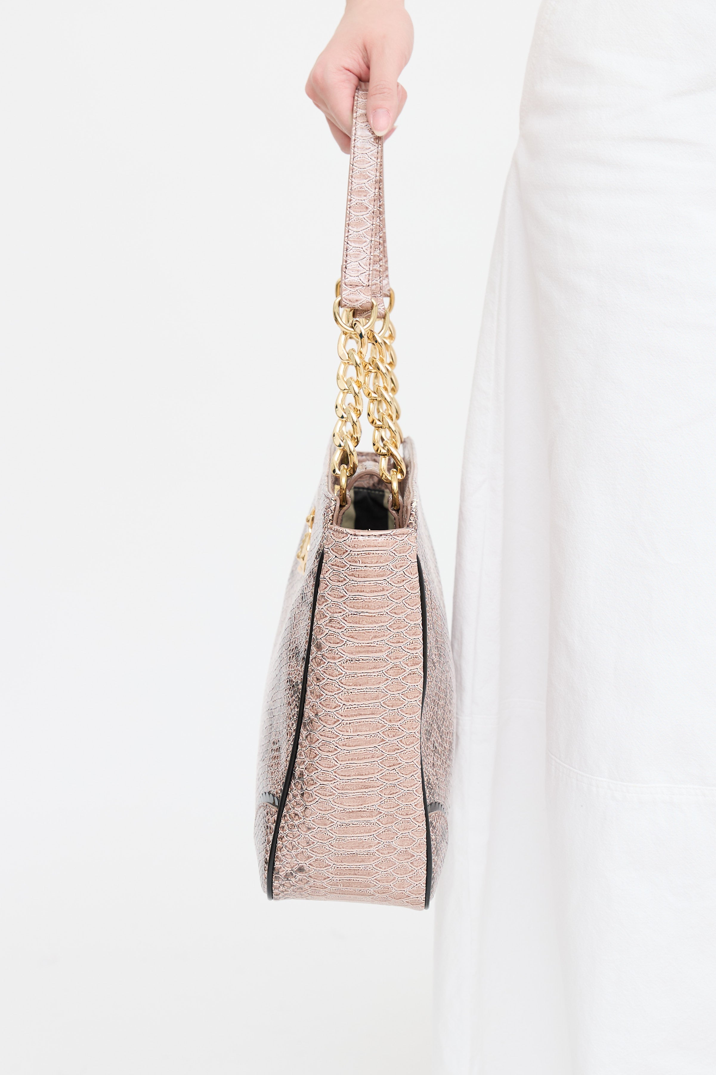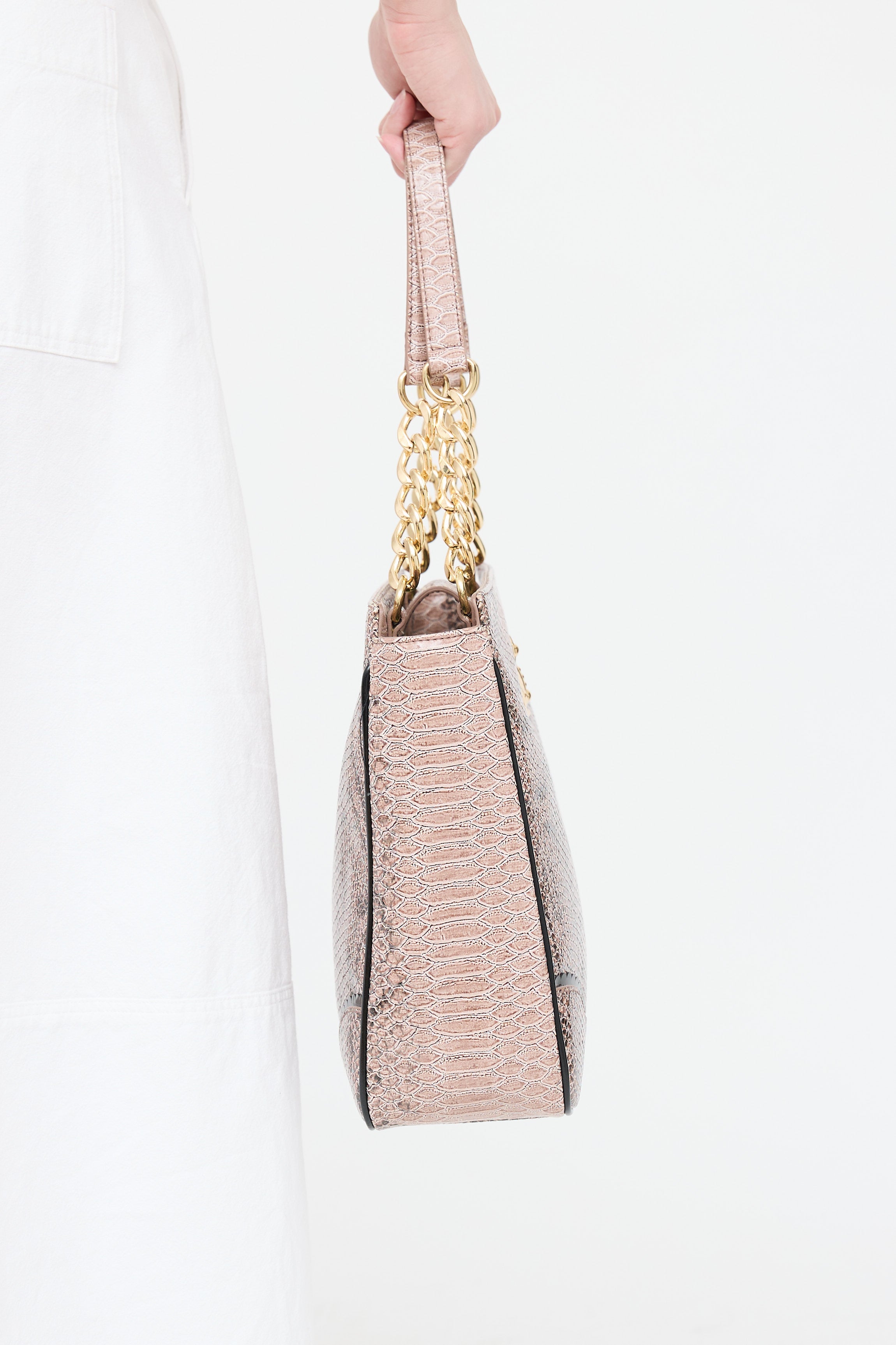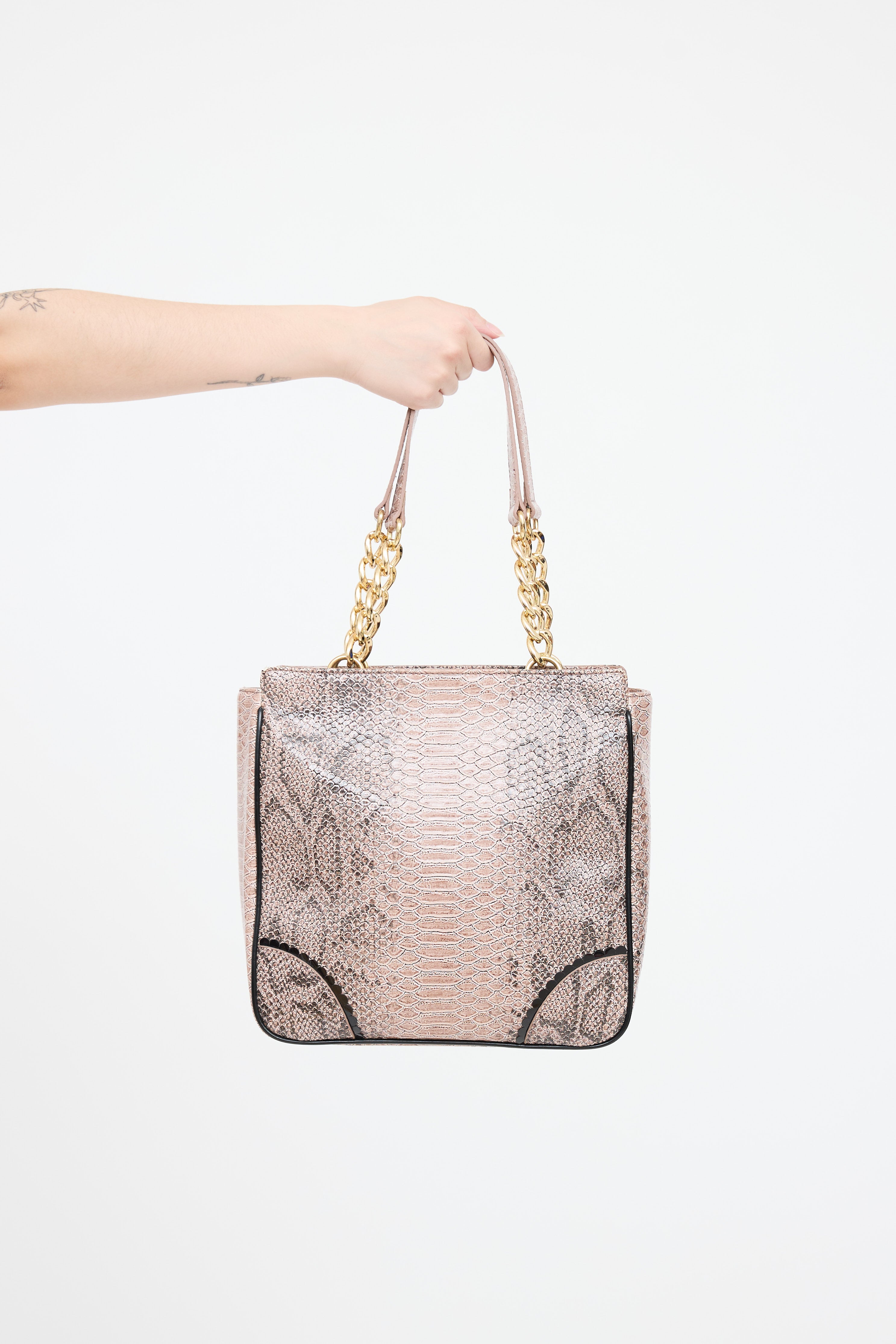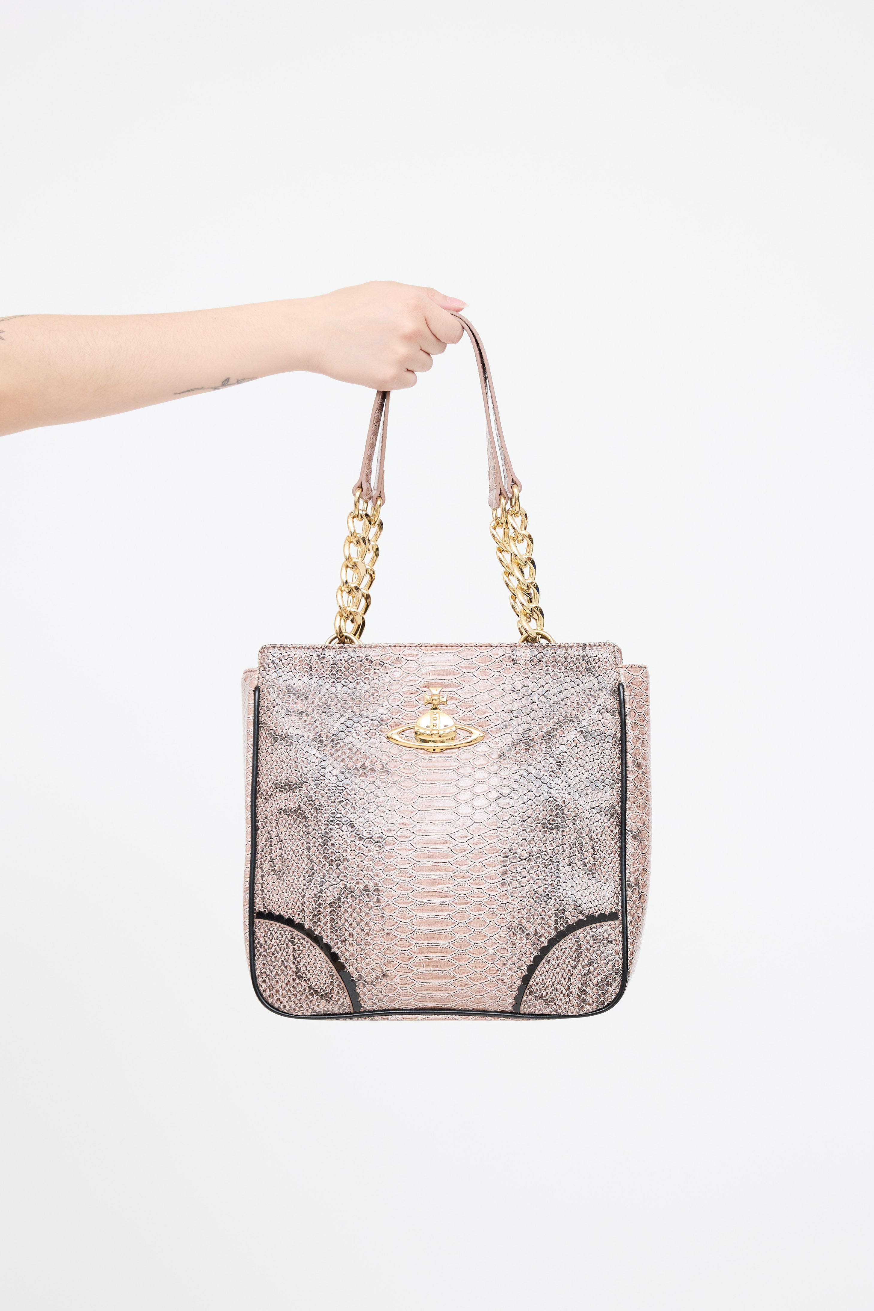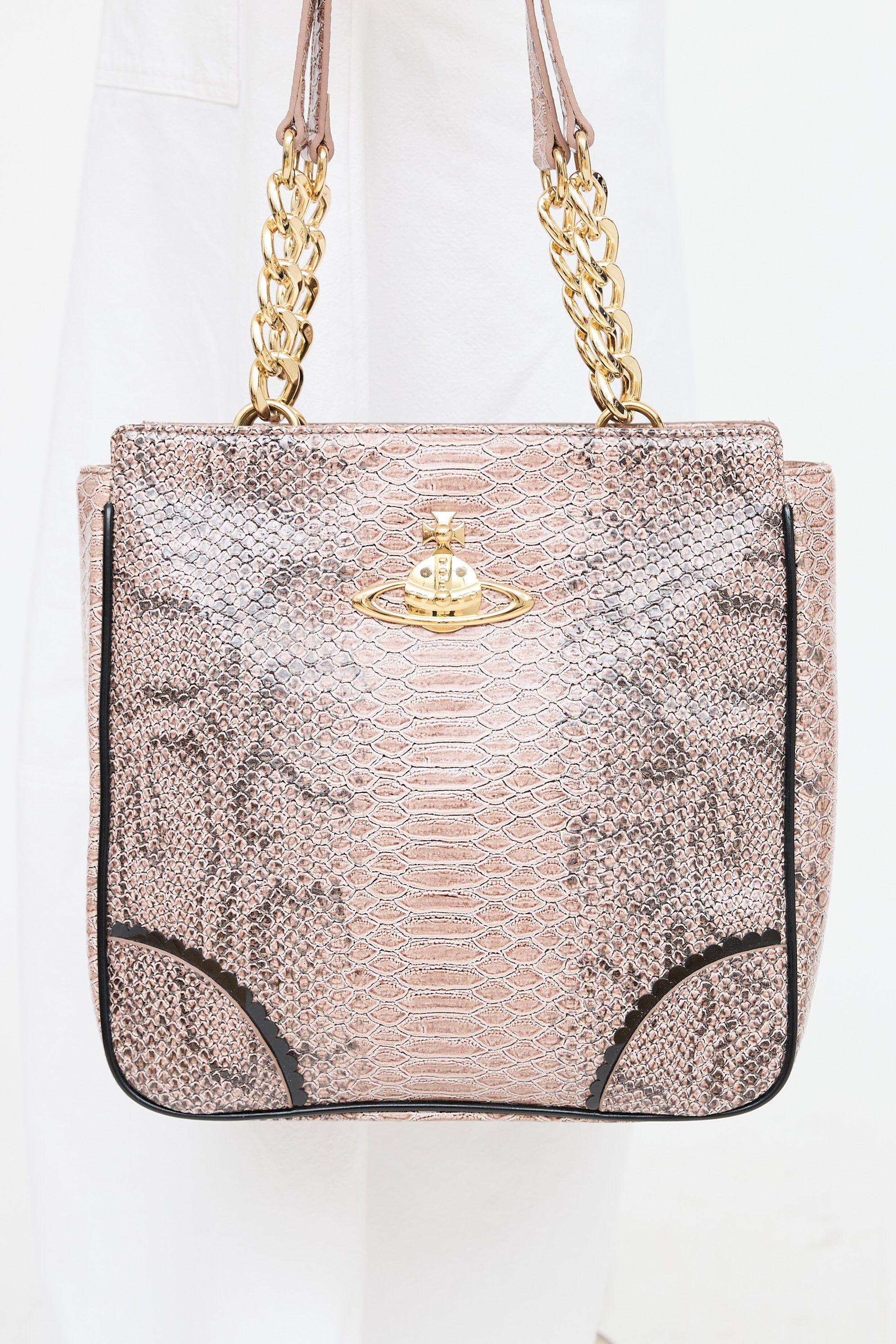 Pre-owned Vivienne Westwood taupe snakeskin top handle bag featuring dual flat top handles with gold tone chain-links, gold tone logo at front, patent leather scallop trim at bottom corners, structured base, open top with magnetic snap closure, one main compartment with striped lining and two interior slip pockets and one zip pocket.