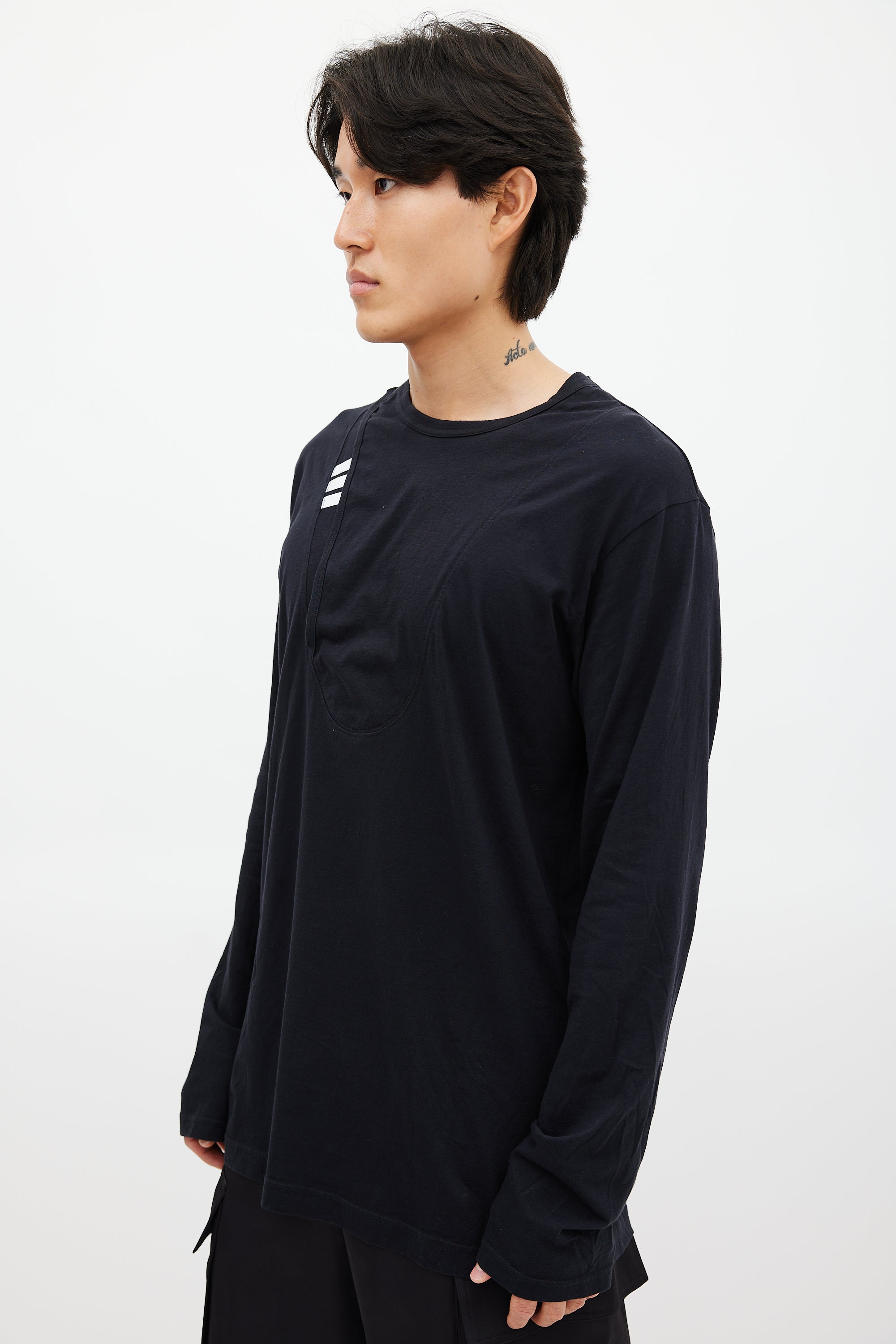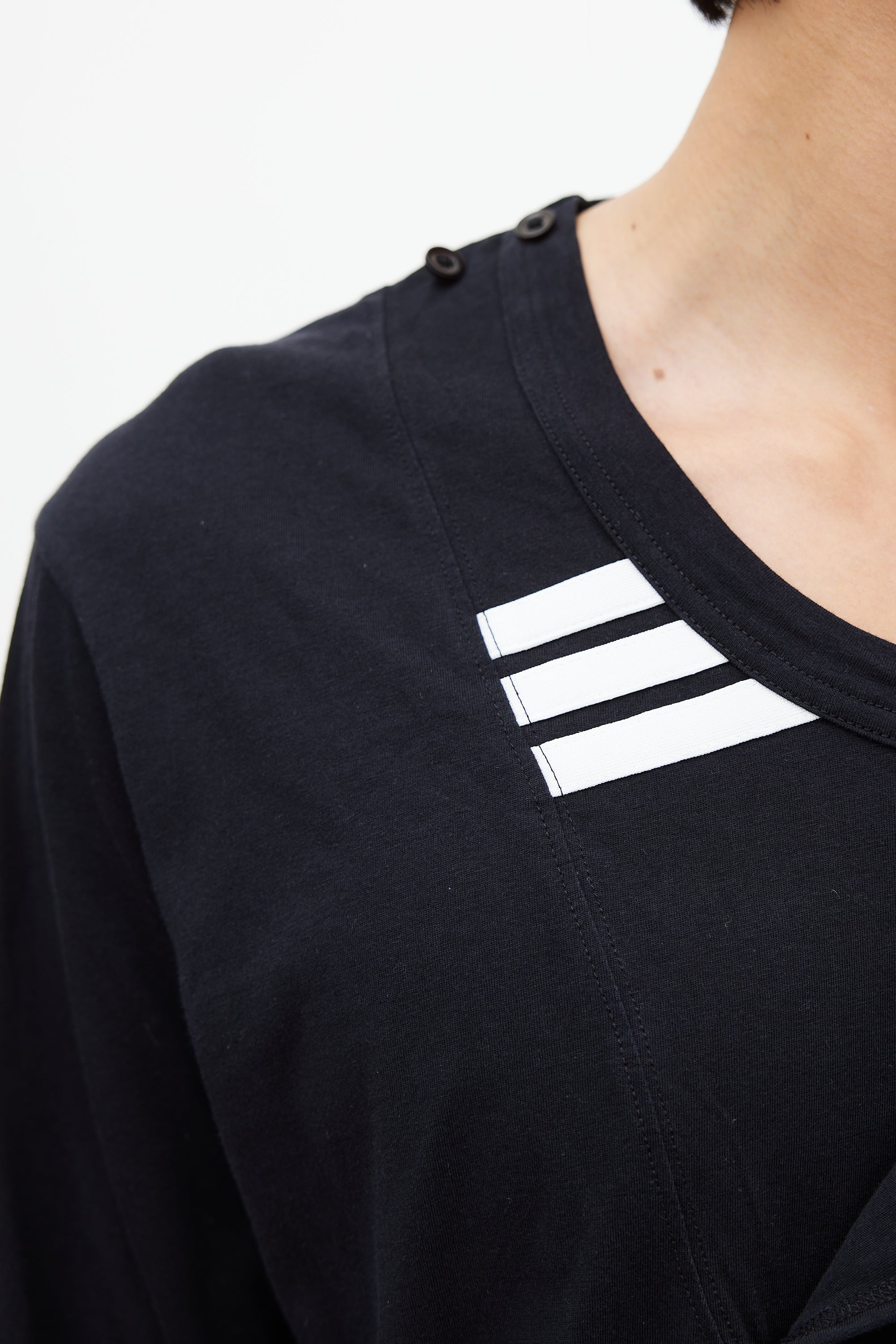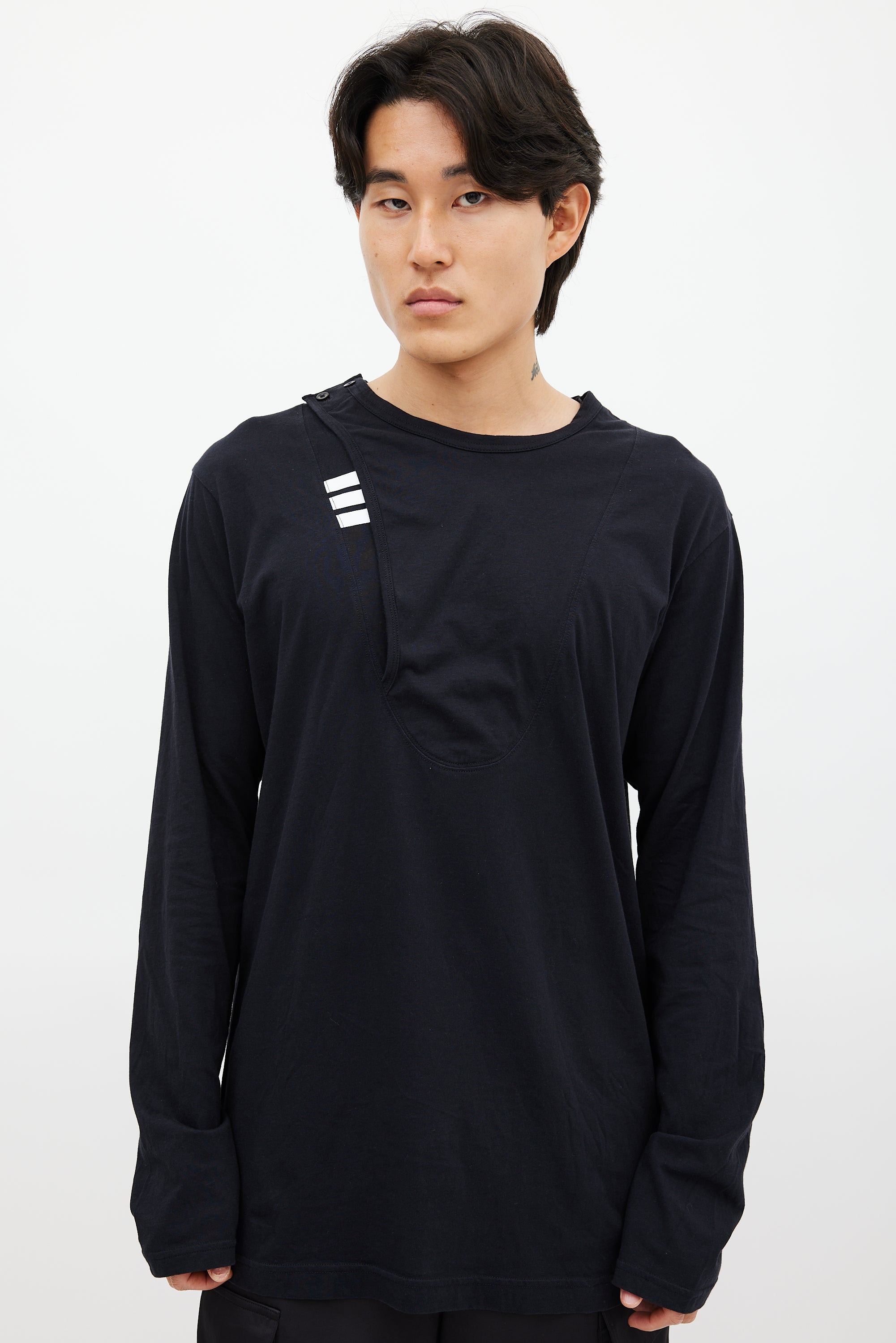 Pre-owned Y-3 black top featuring a round neckline, white striped detail at chest, long sleeves, and asymmetrical buttoned overlay at front.