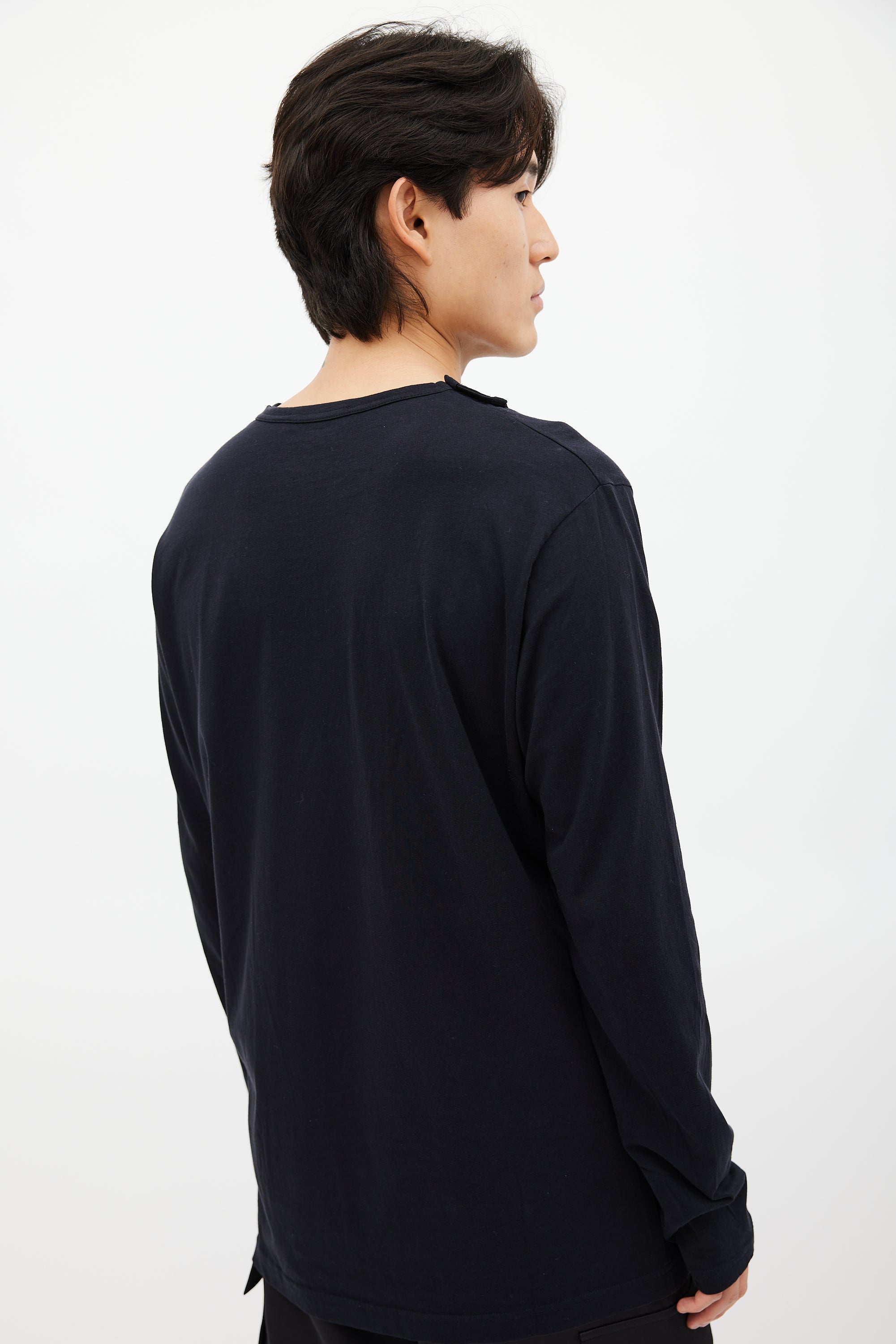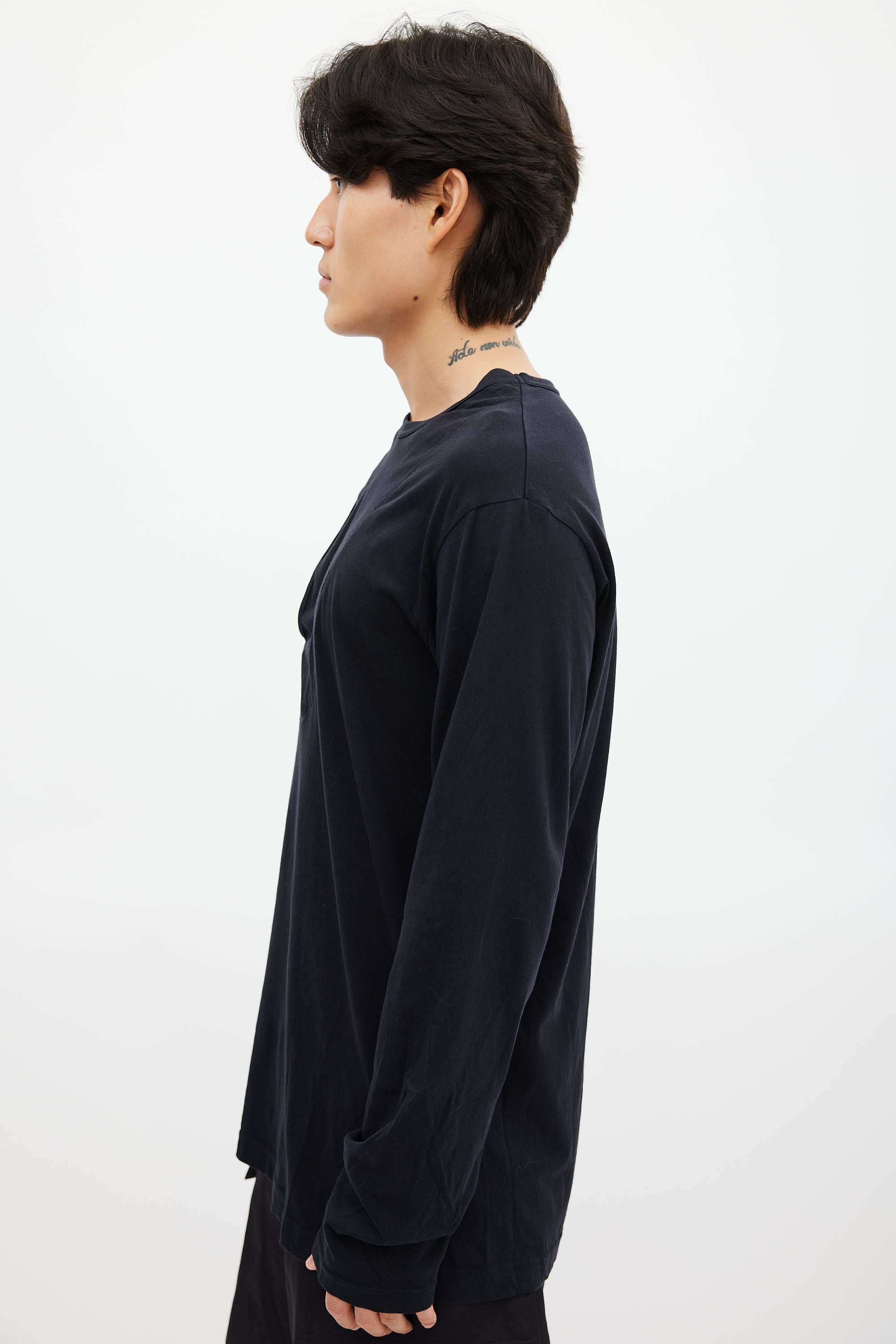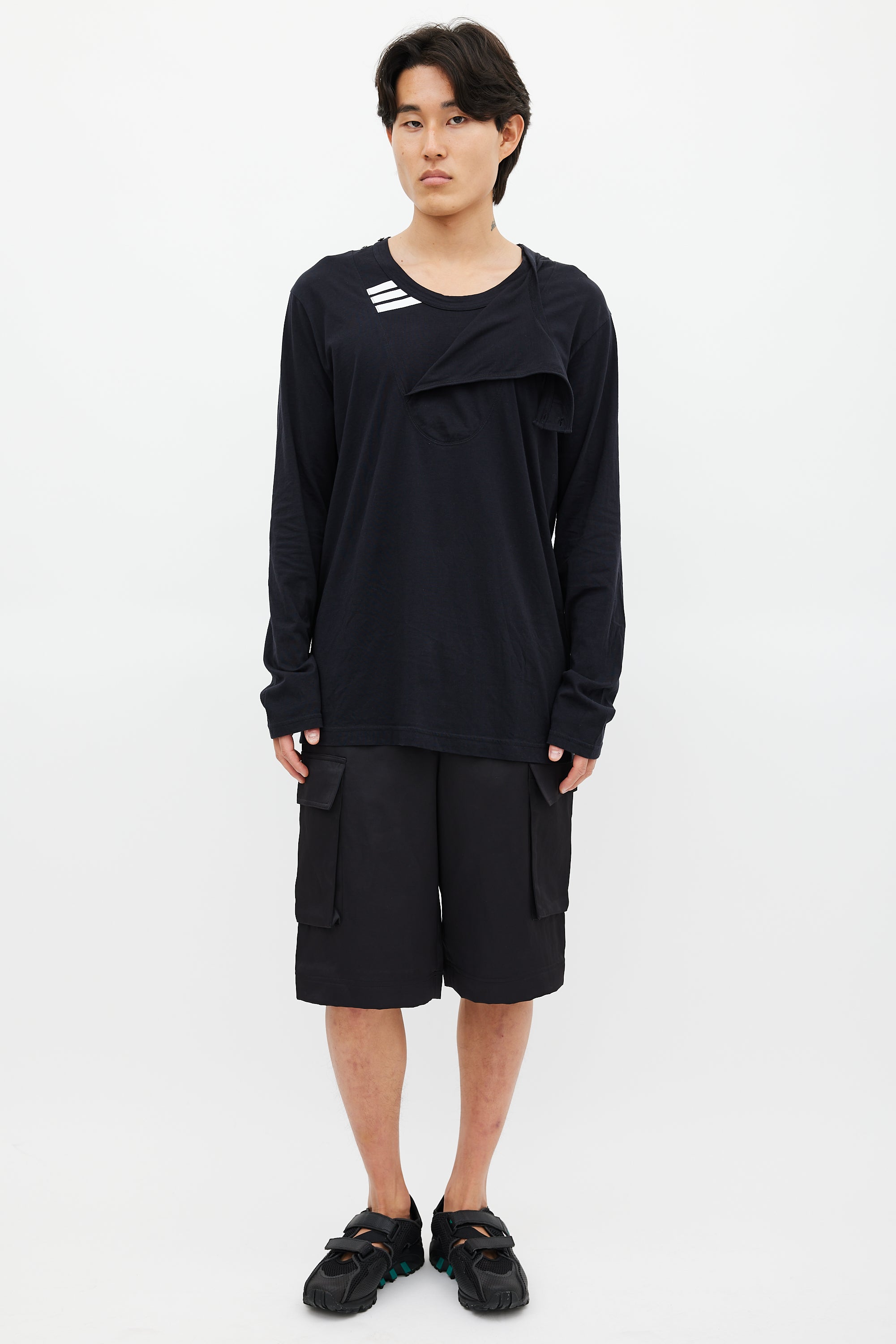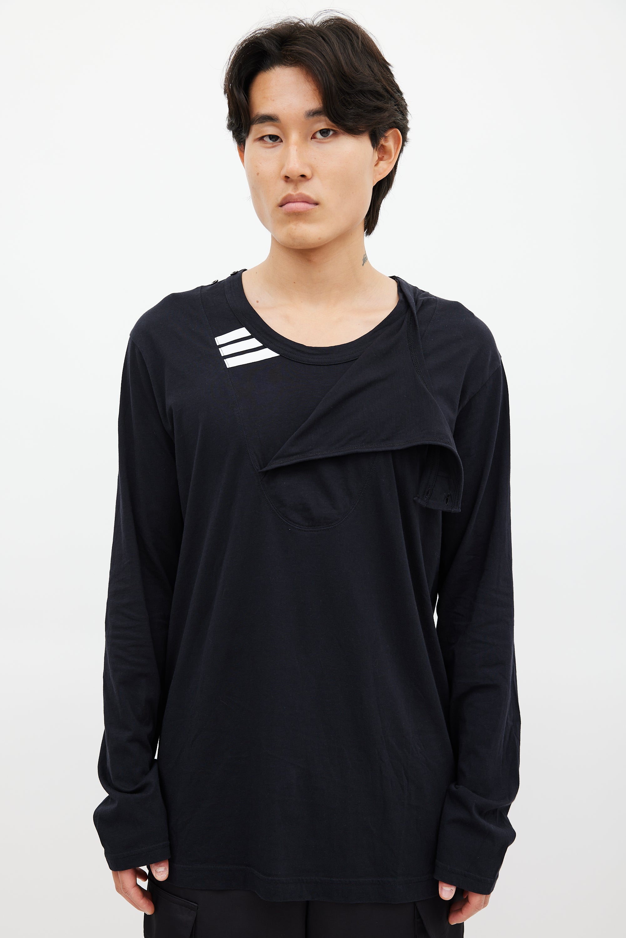 Pre-owned Y-3 black top featuring a round neckline, white striped detail at chest, long sleeves, and asymmetrical buttoned overlay at front.