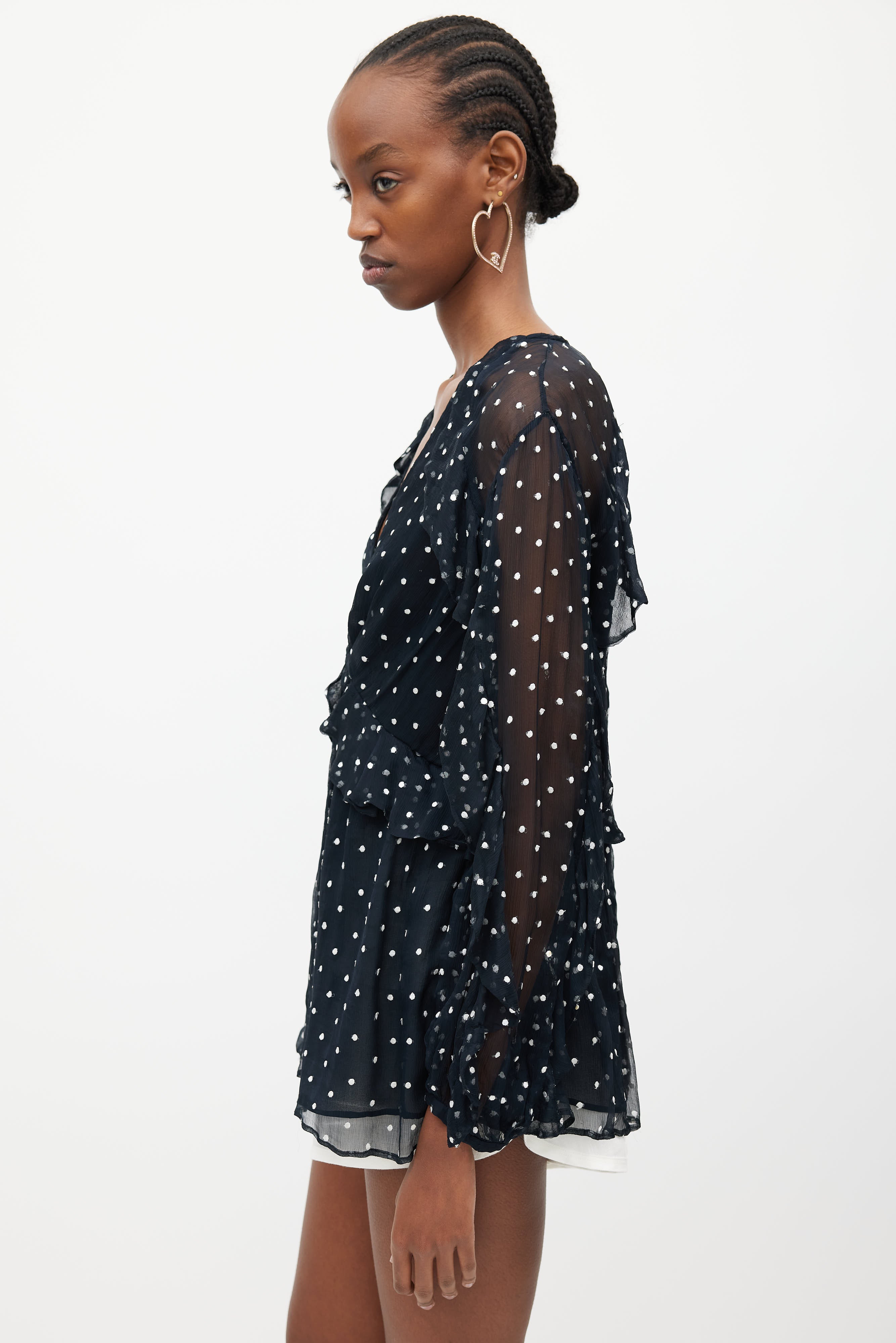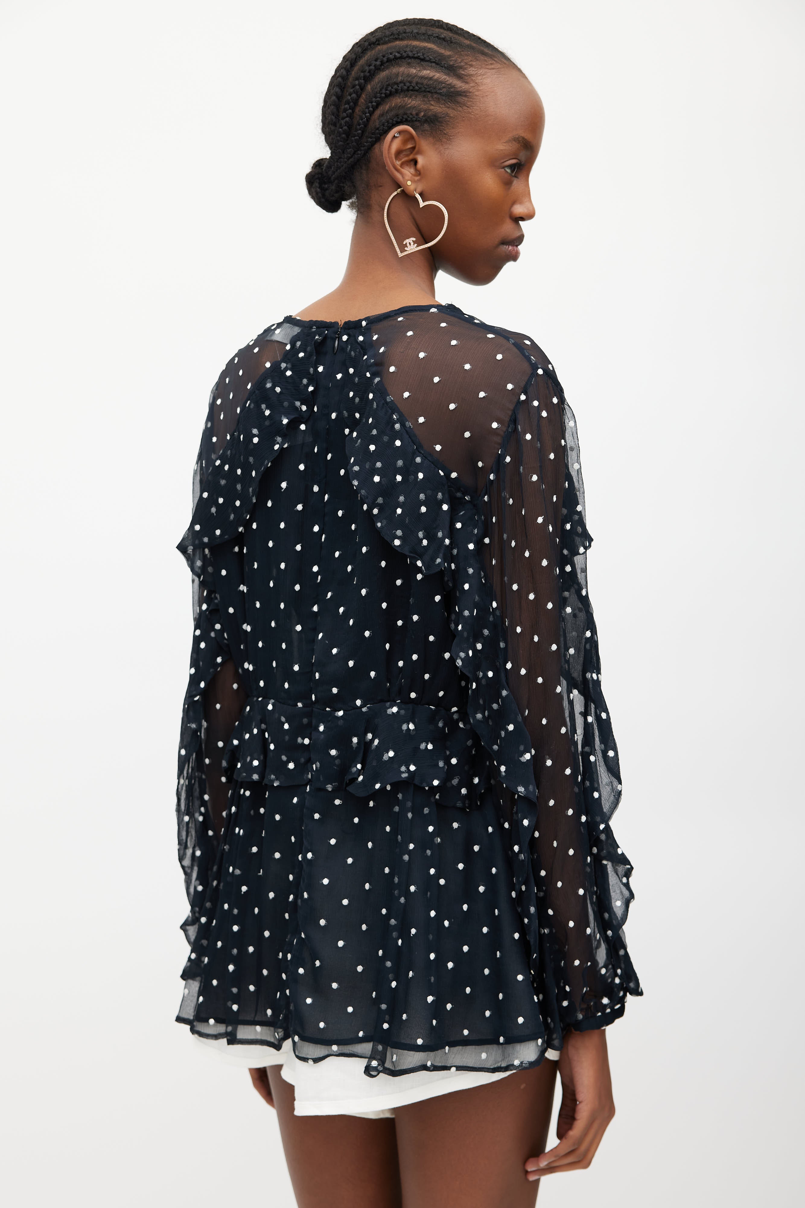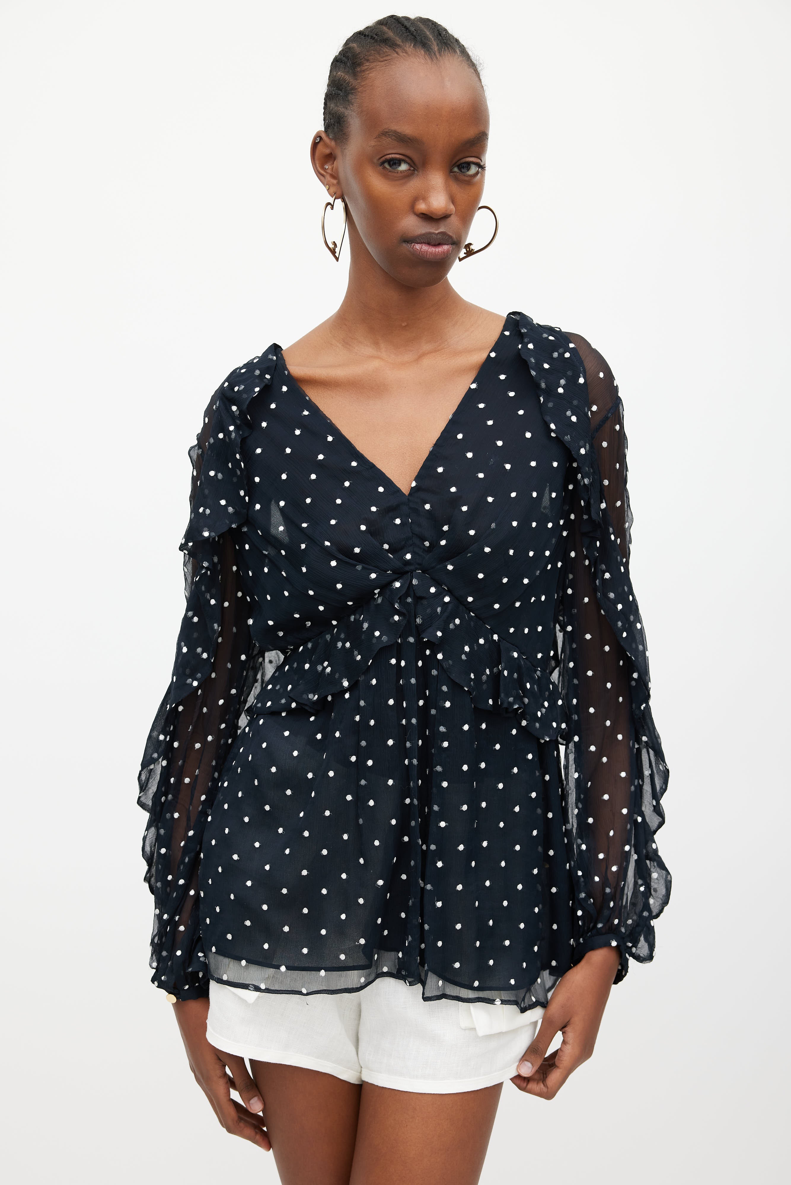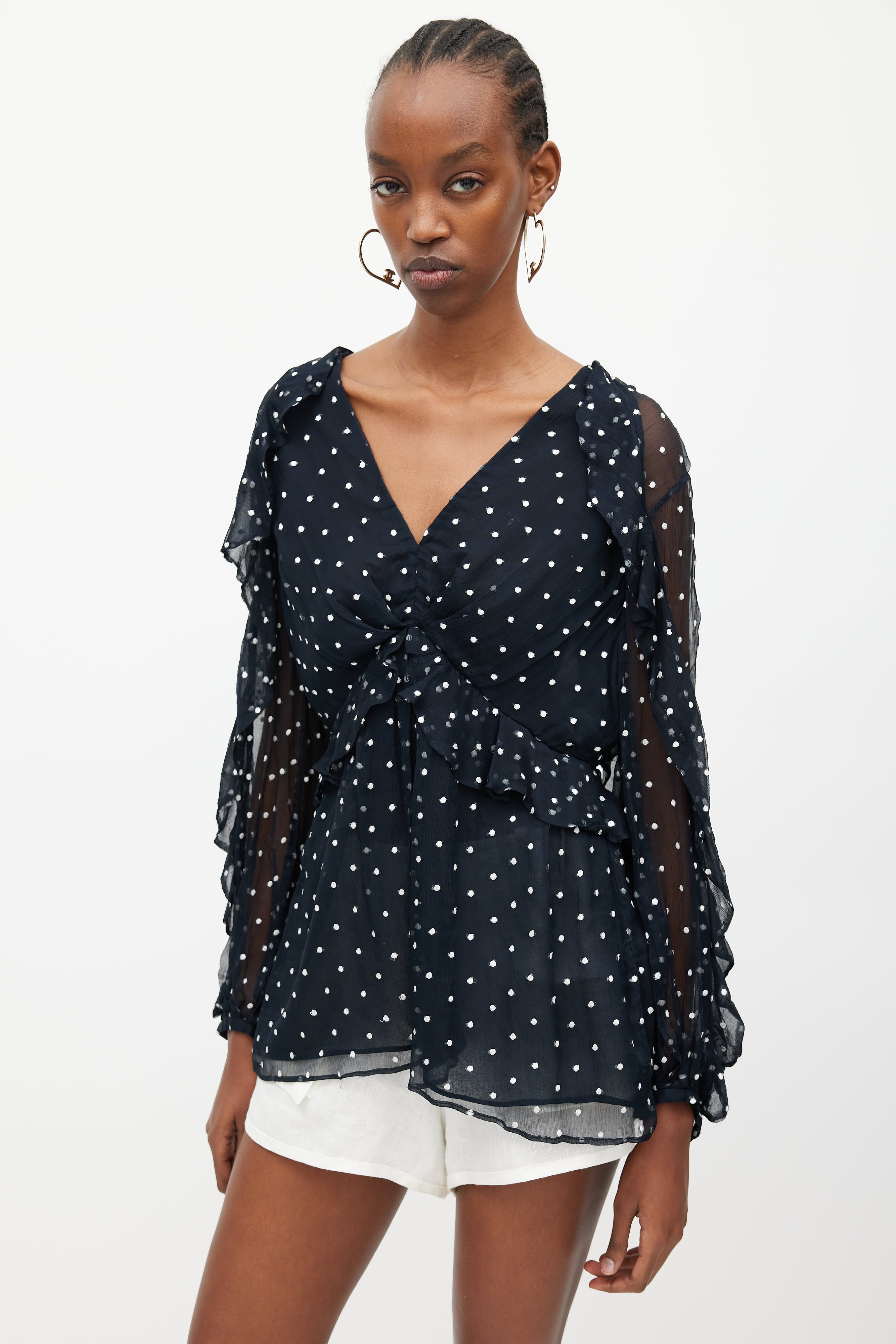 Pre-owned Zimmermann navy and white silk blouse featuring V-neckline, concealed zip closure at back, white embroidered polka dots, and ruffles at sleeves and front. Clipped to fit model.
