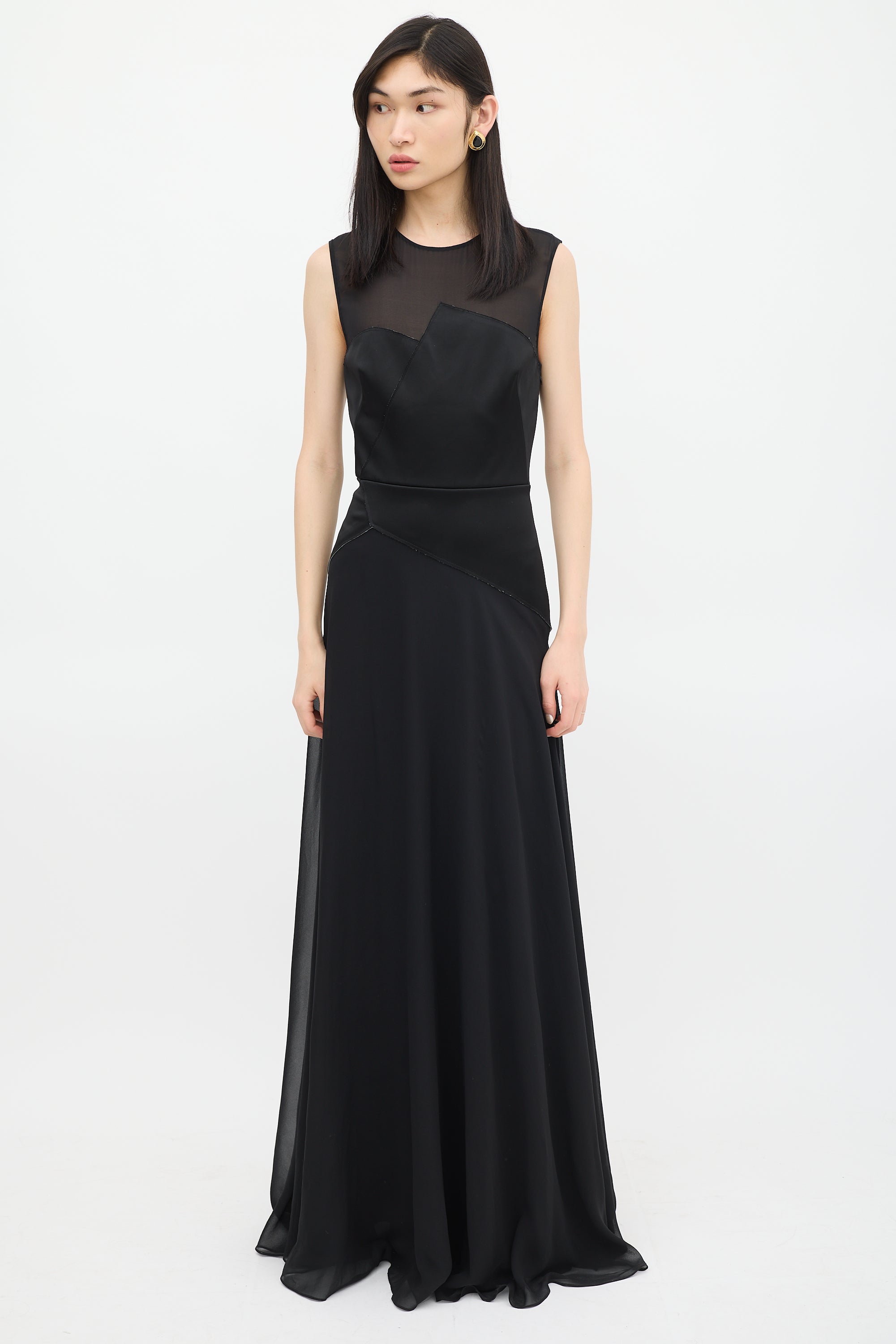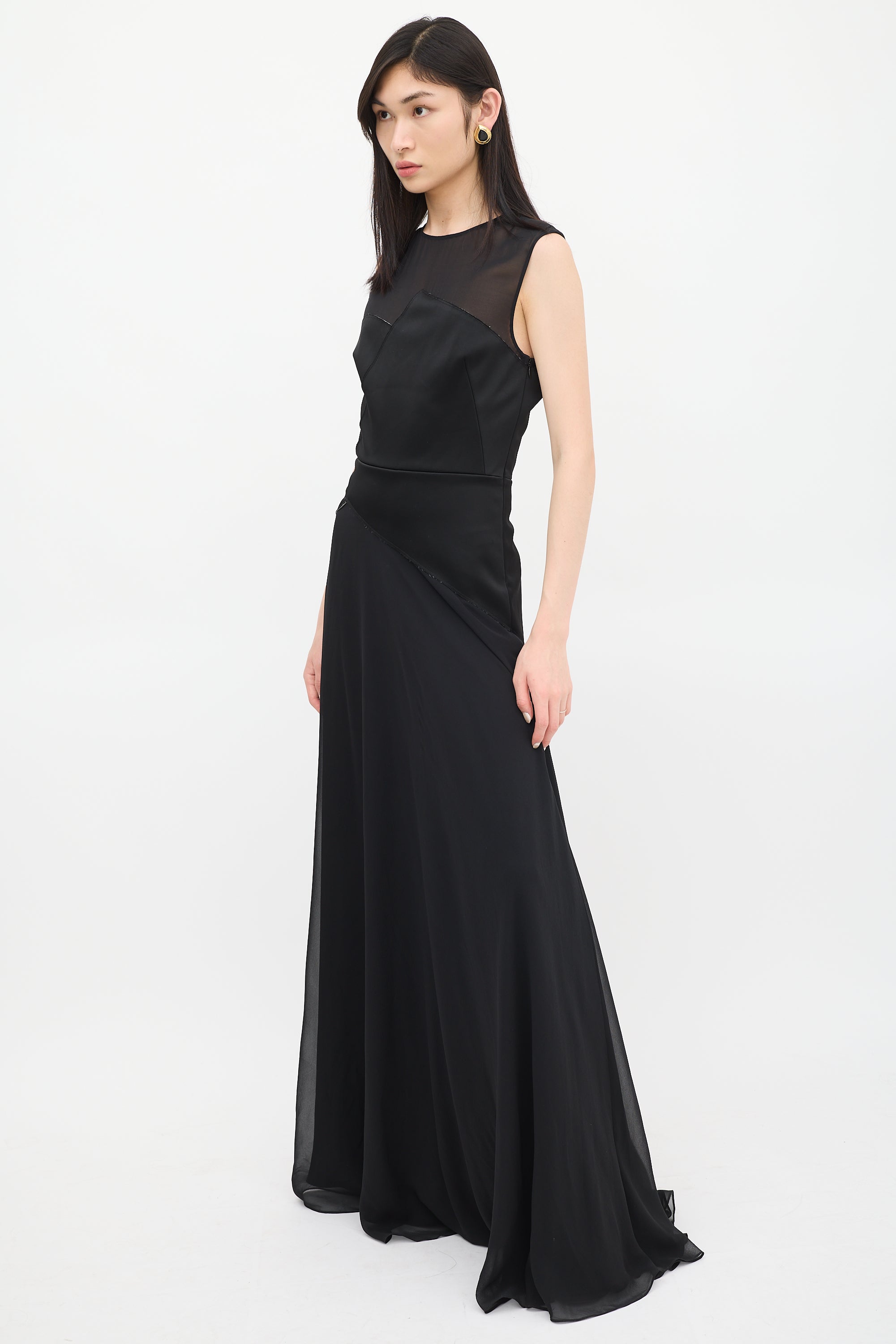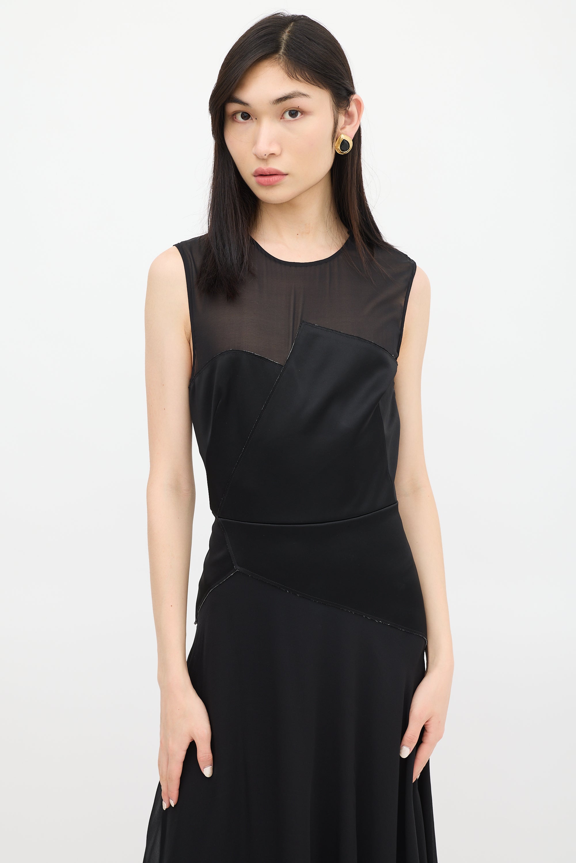 Pre-owned 3.1 Phillip Lim black silk dress featuring a round neckline, sleeveless styling, zip detail at shoulder, tonal panelled bust, and zip closure at side. Lined. Clipped to fit model.