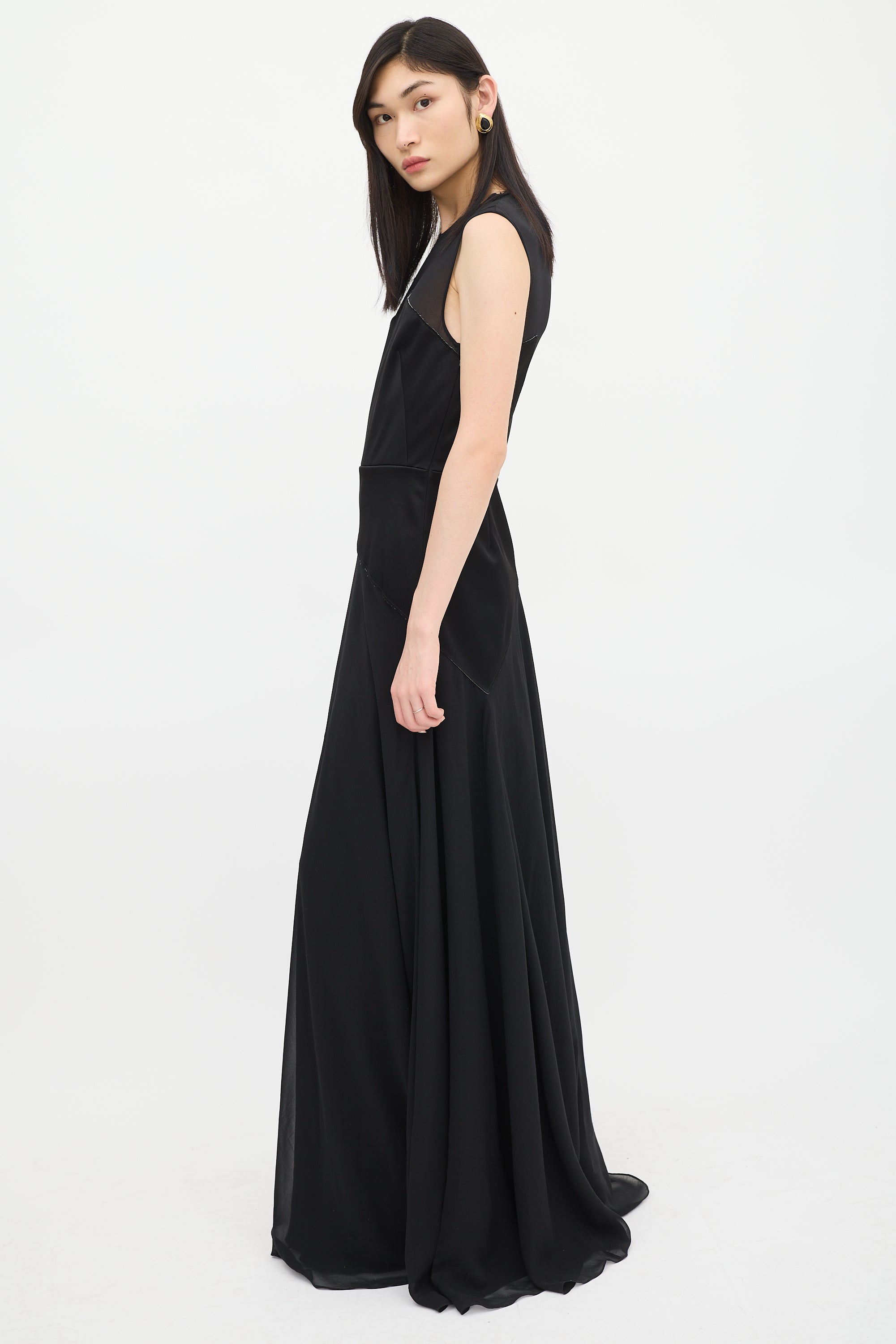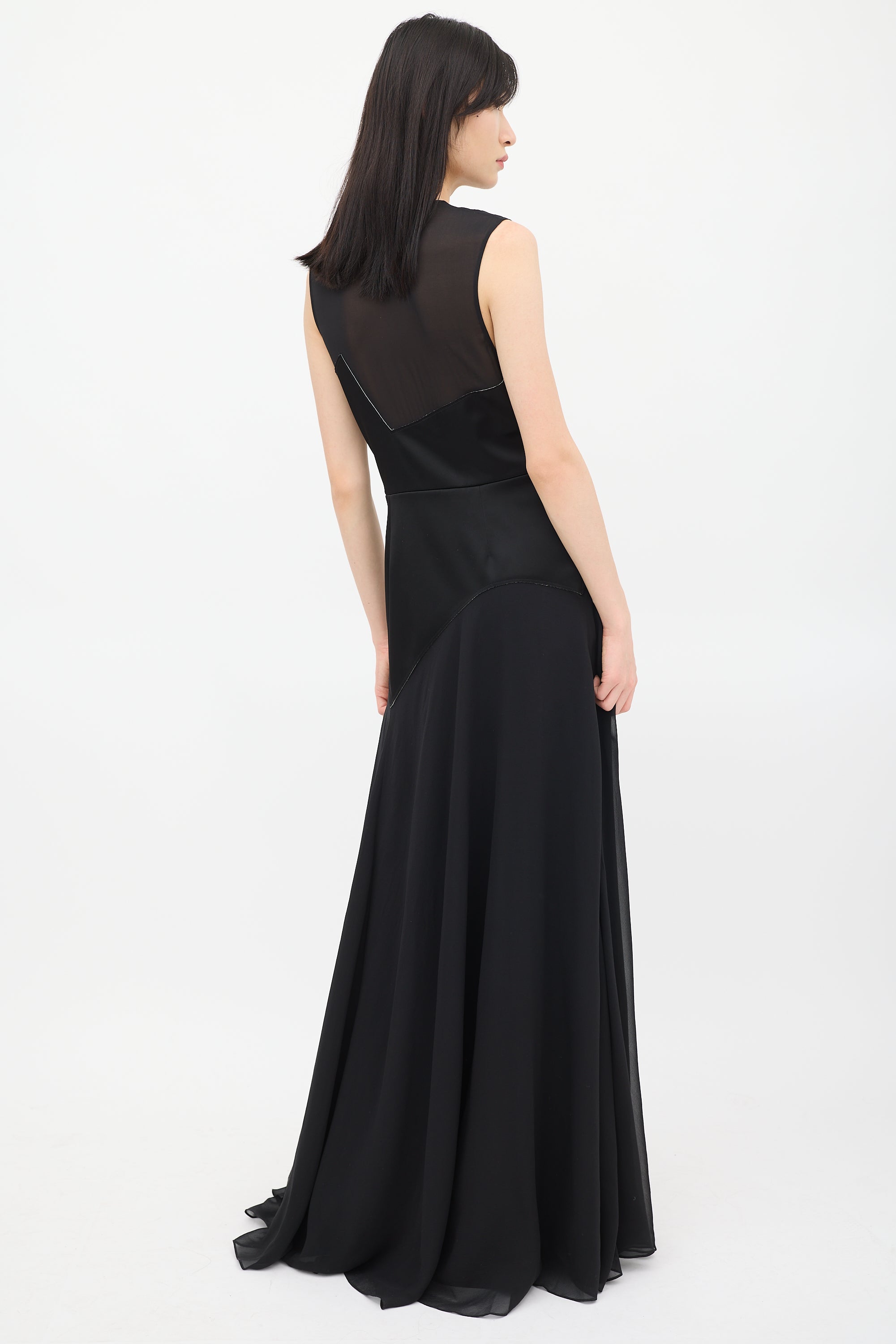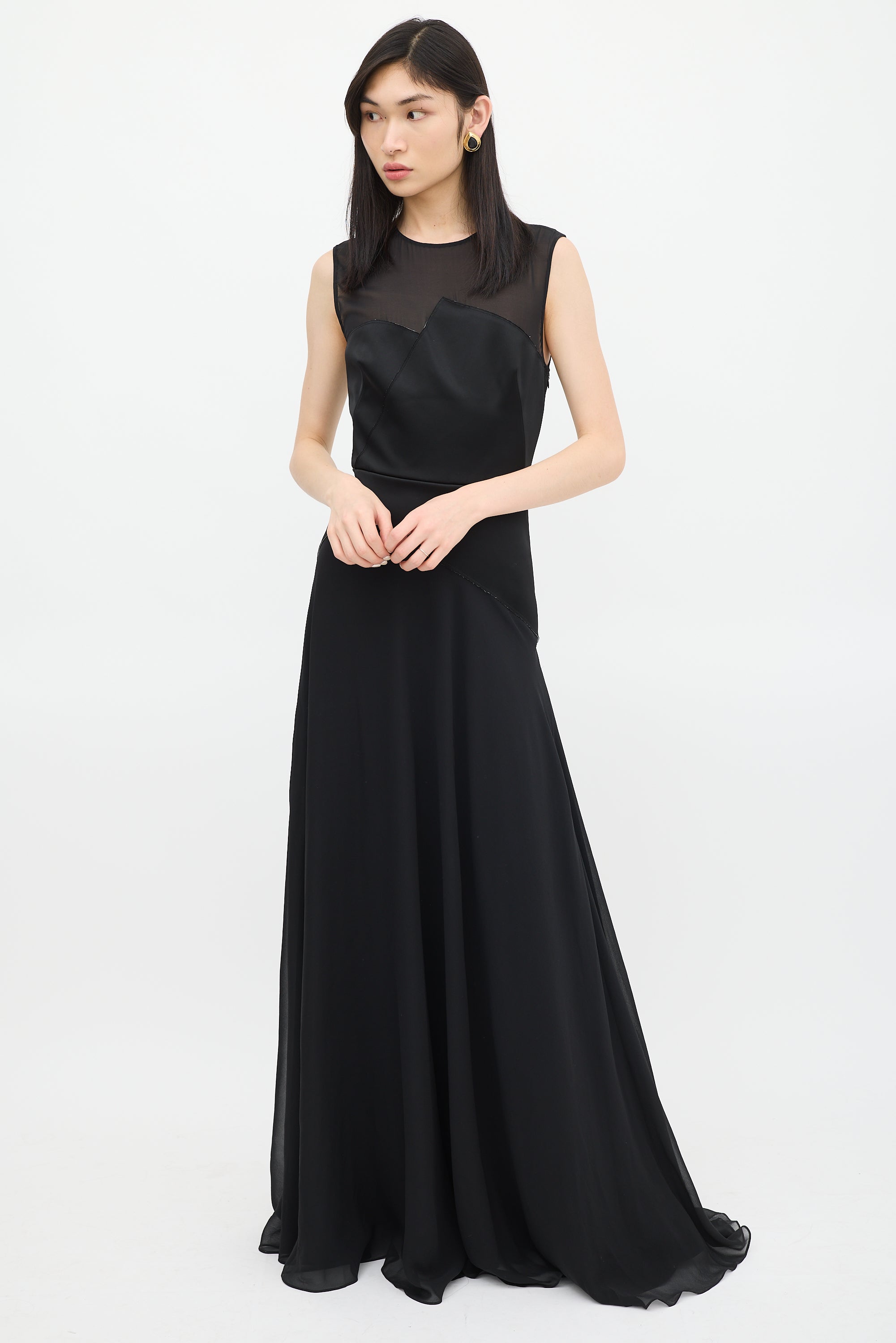 Pre-owned 3.1 Phillip Lim black silk dress featuring a round neckline, sleeveless styling, zip detail at shoulder, tonal panelled bust, and zip closure at side. Lined. Clipped to fit model.