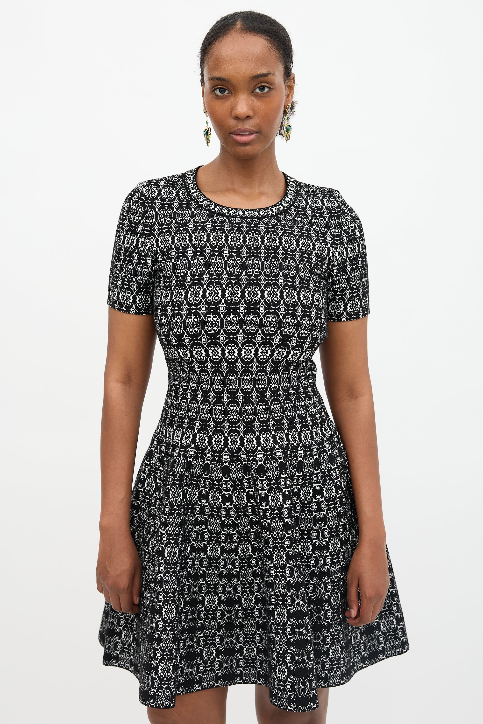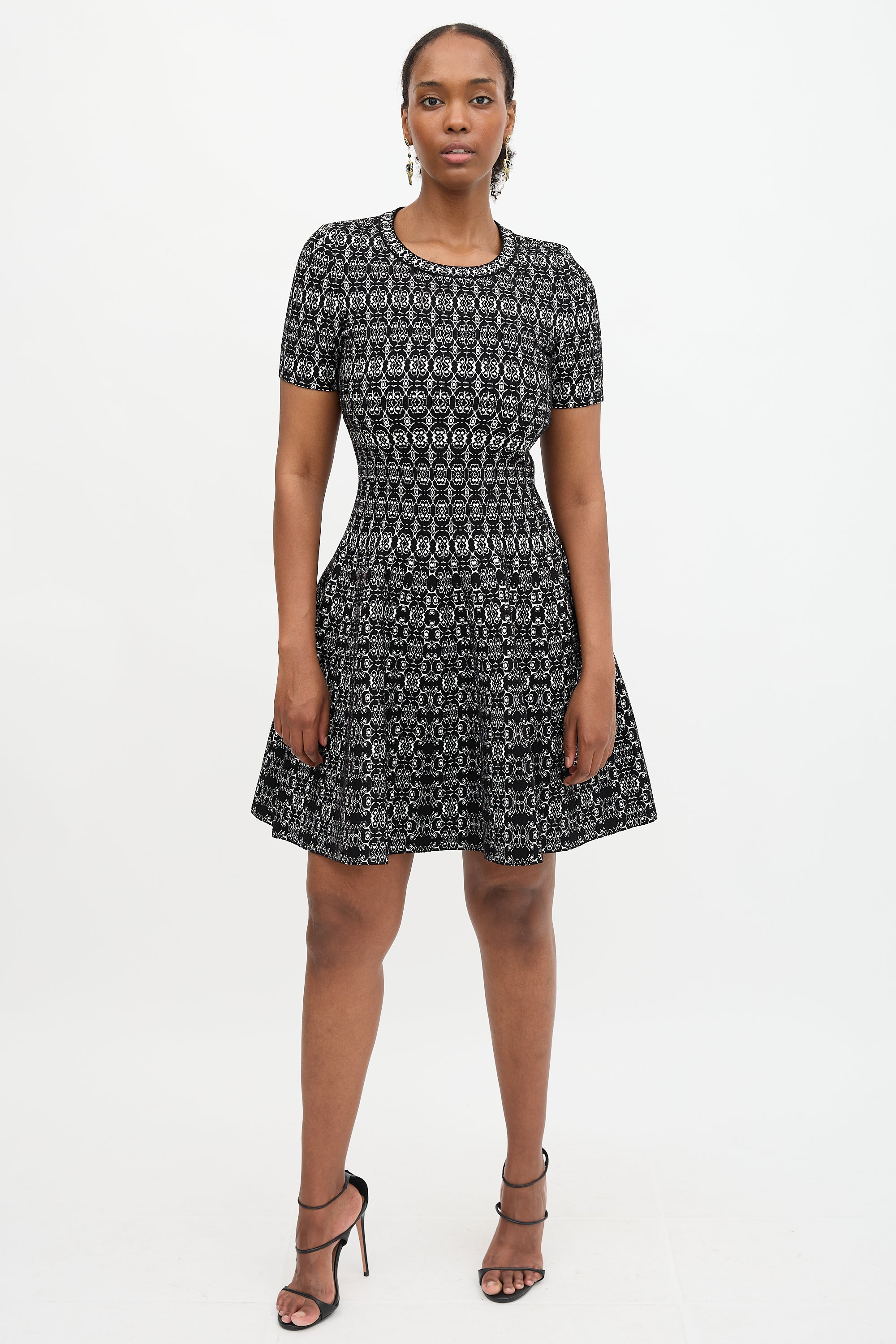 Pre-owned Alaïa black and white knit jersey midi dress featuring round neckline, flared skirt, jacquard pattern, and concealed side zip.