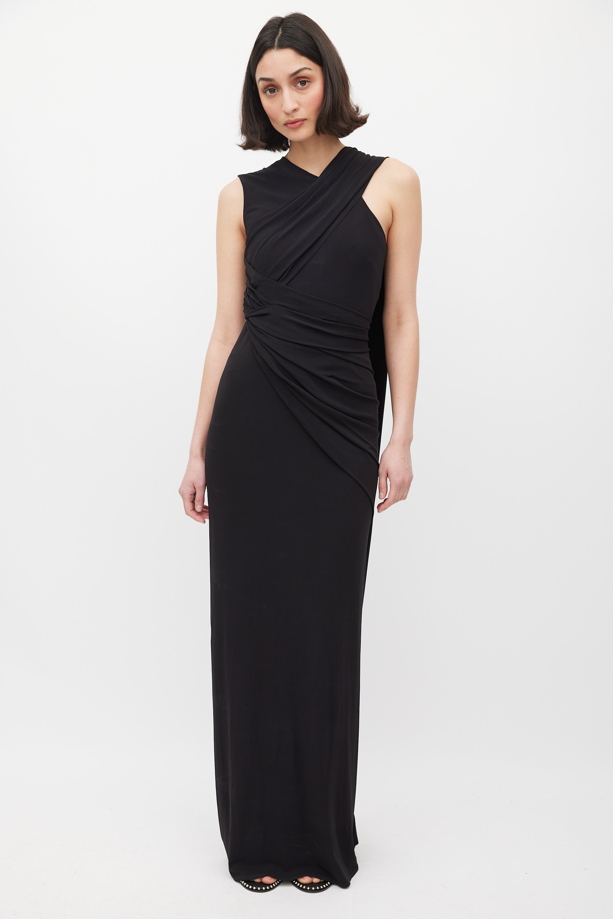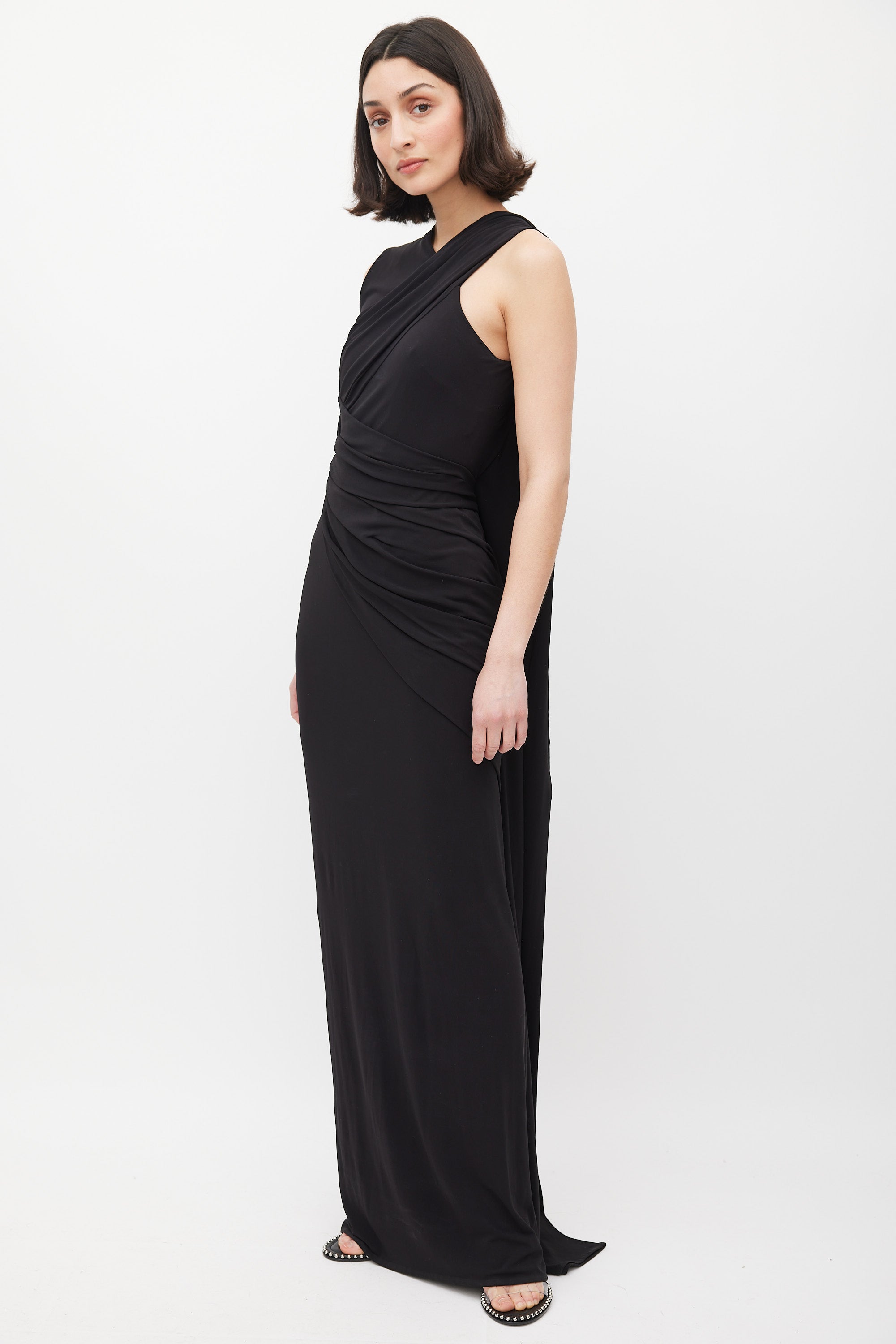 Pre-owned Alexander Wang black sleeveless maxi dress featuring a round neckline, asymmetrical draped front, and back cutout. Lined.