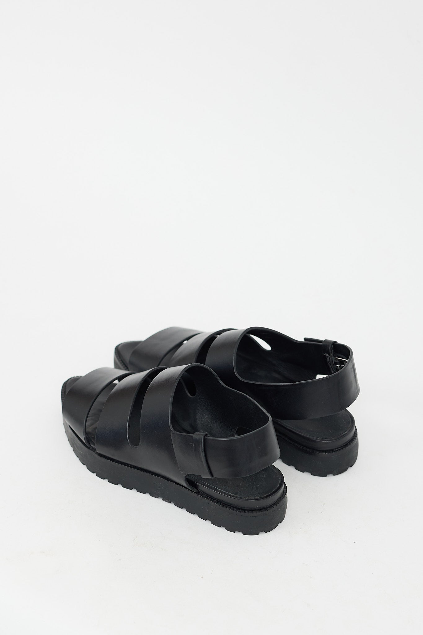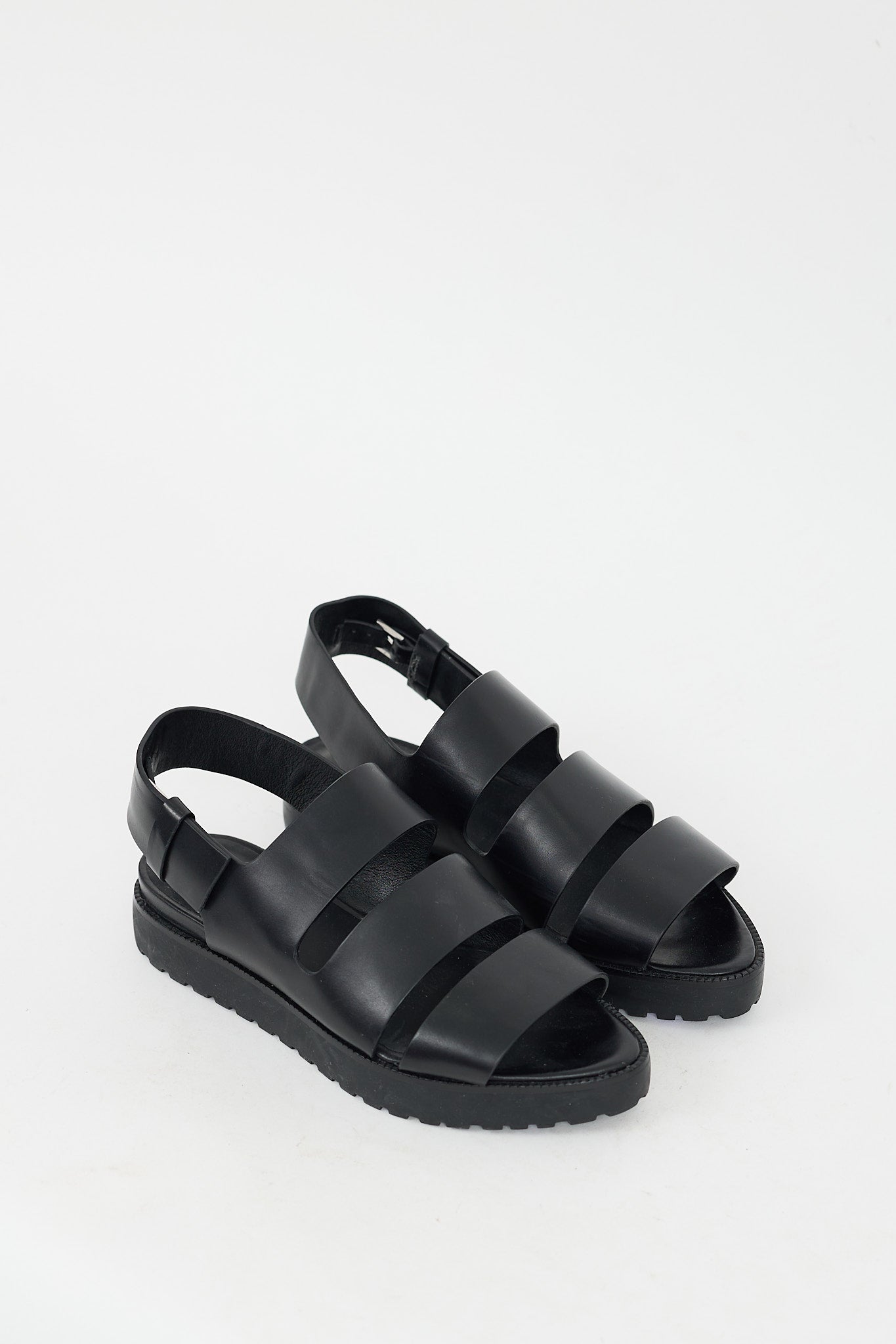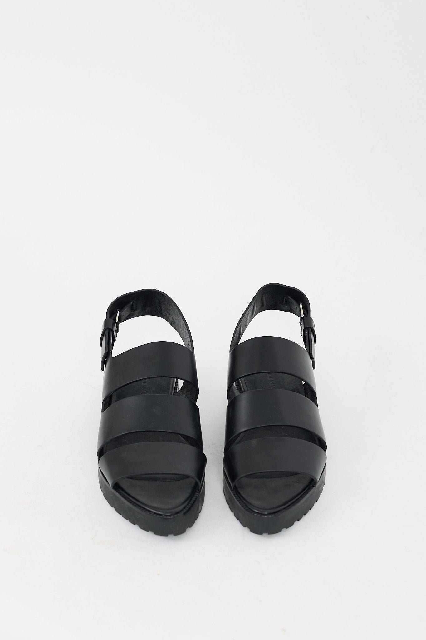 Pre-owned Alexander Wang black leather Alisha sandals featuring open pointed toe, three straps at upper, adjustable ankle strap with concealed buckle closure, and platform sole.