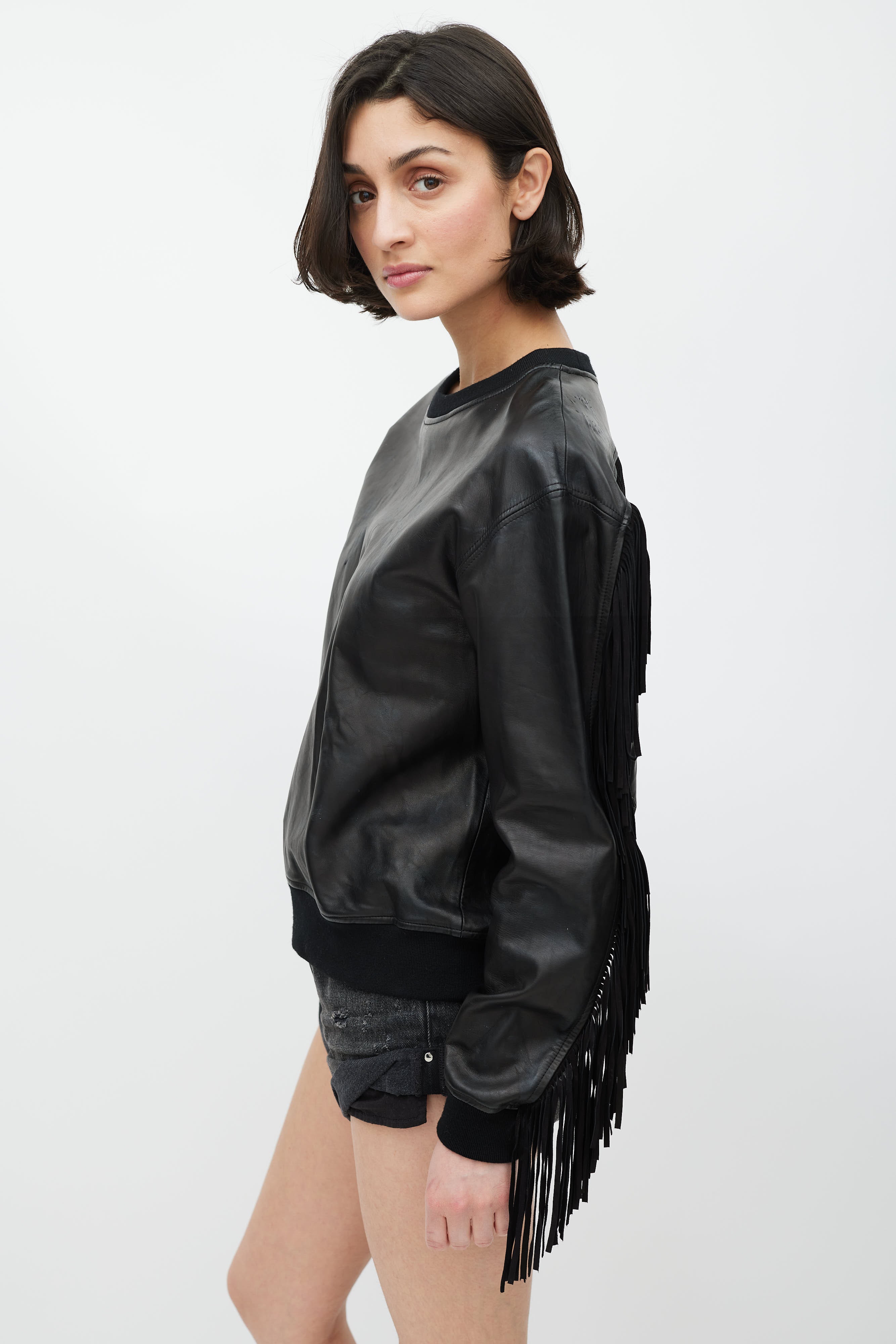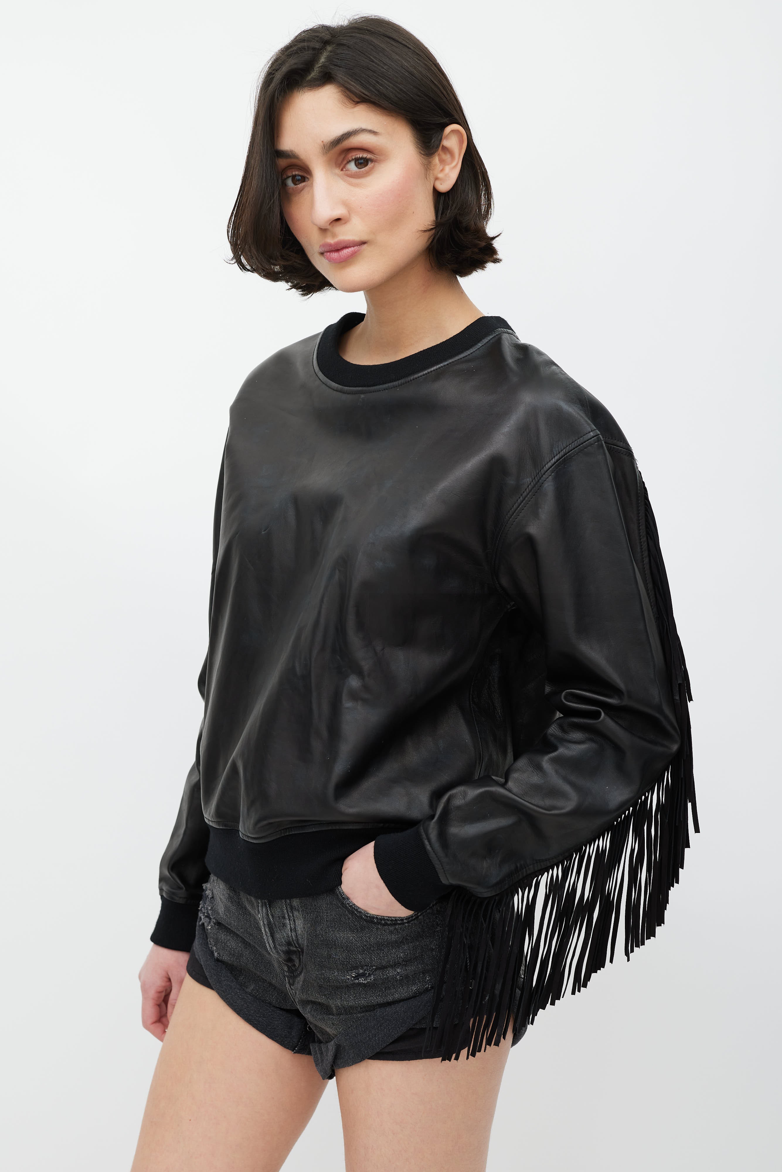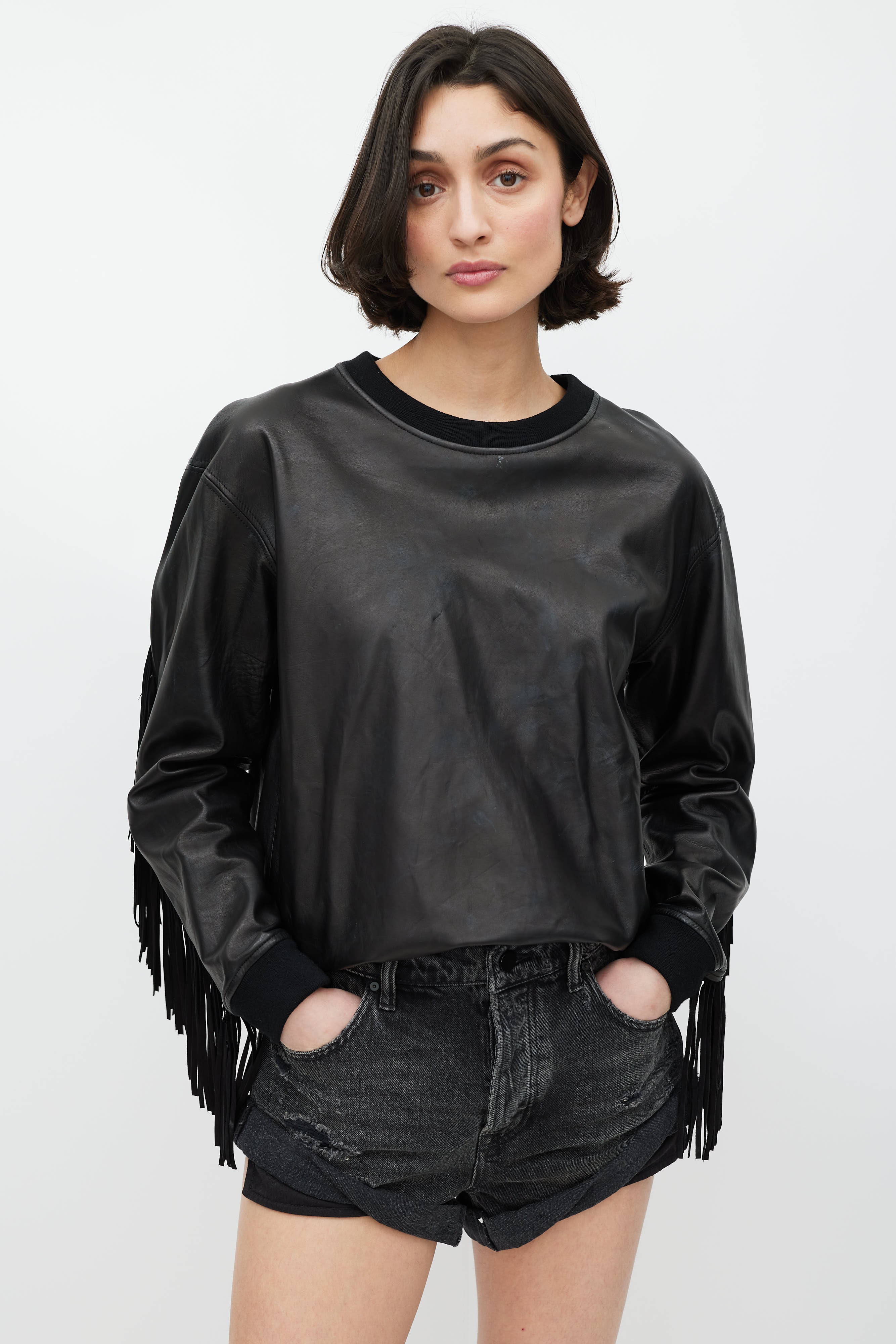 Pre-owned Alexander Wang black leather sweatshirt featuring ribbed crewneck, cuffs and hem, suede fringe at back and sleeve, and paneling at back.