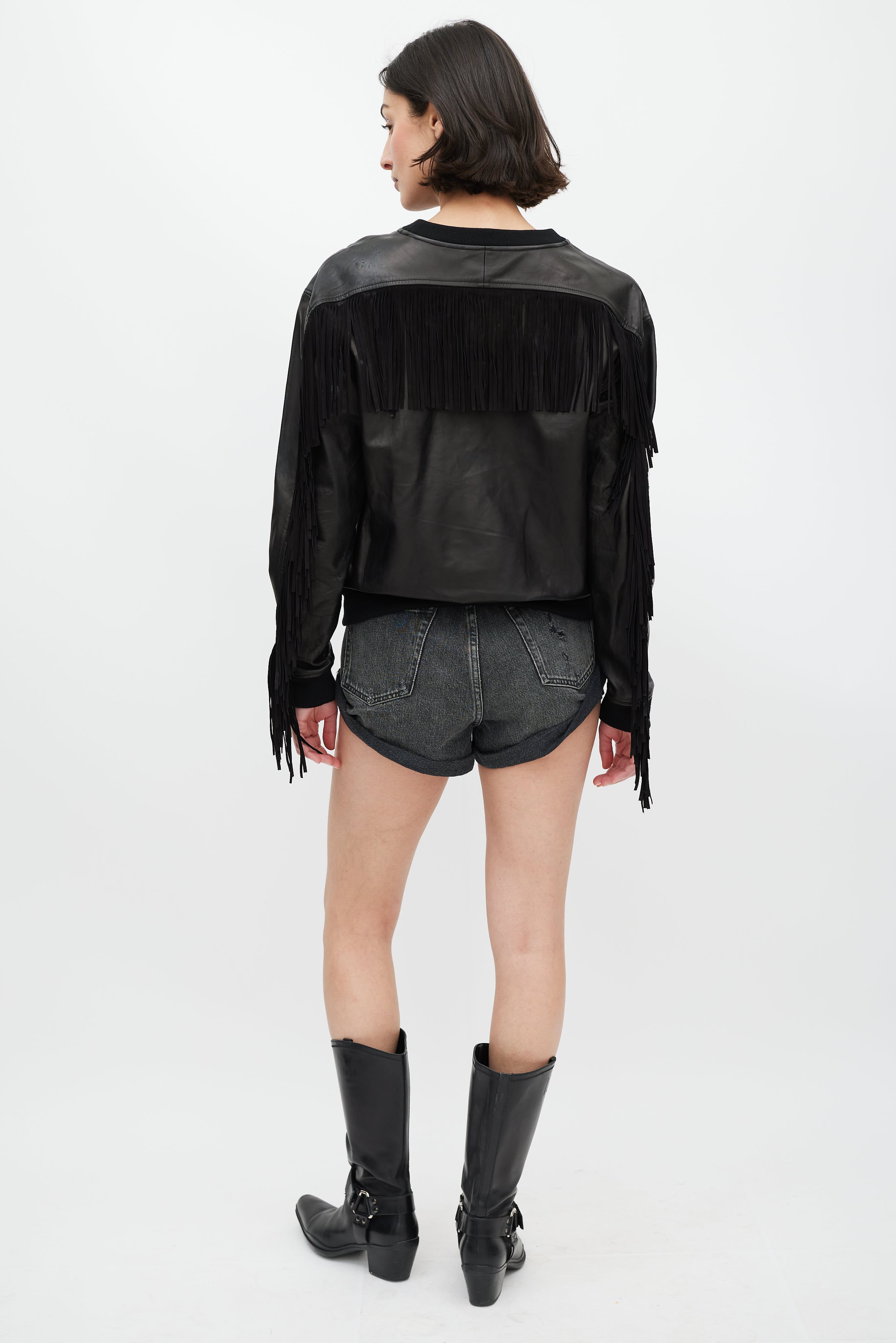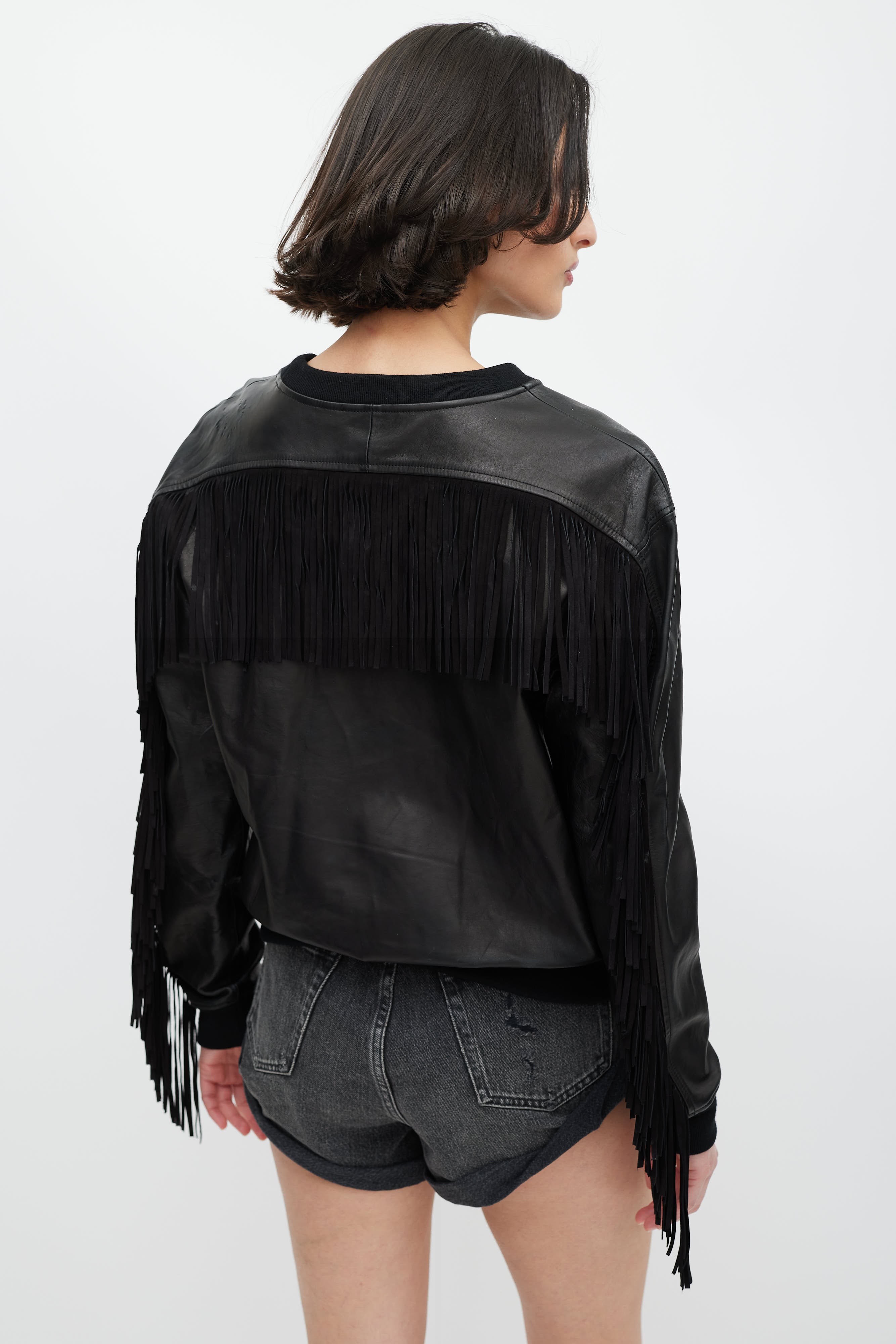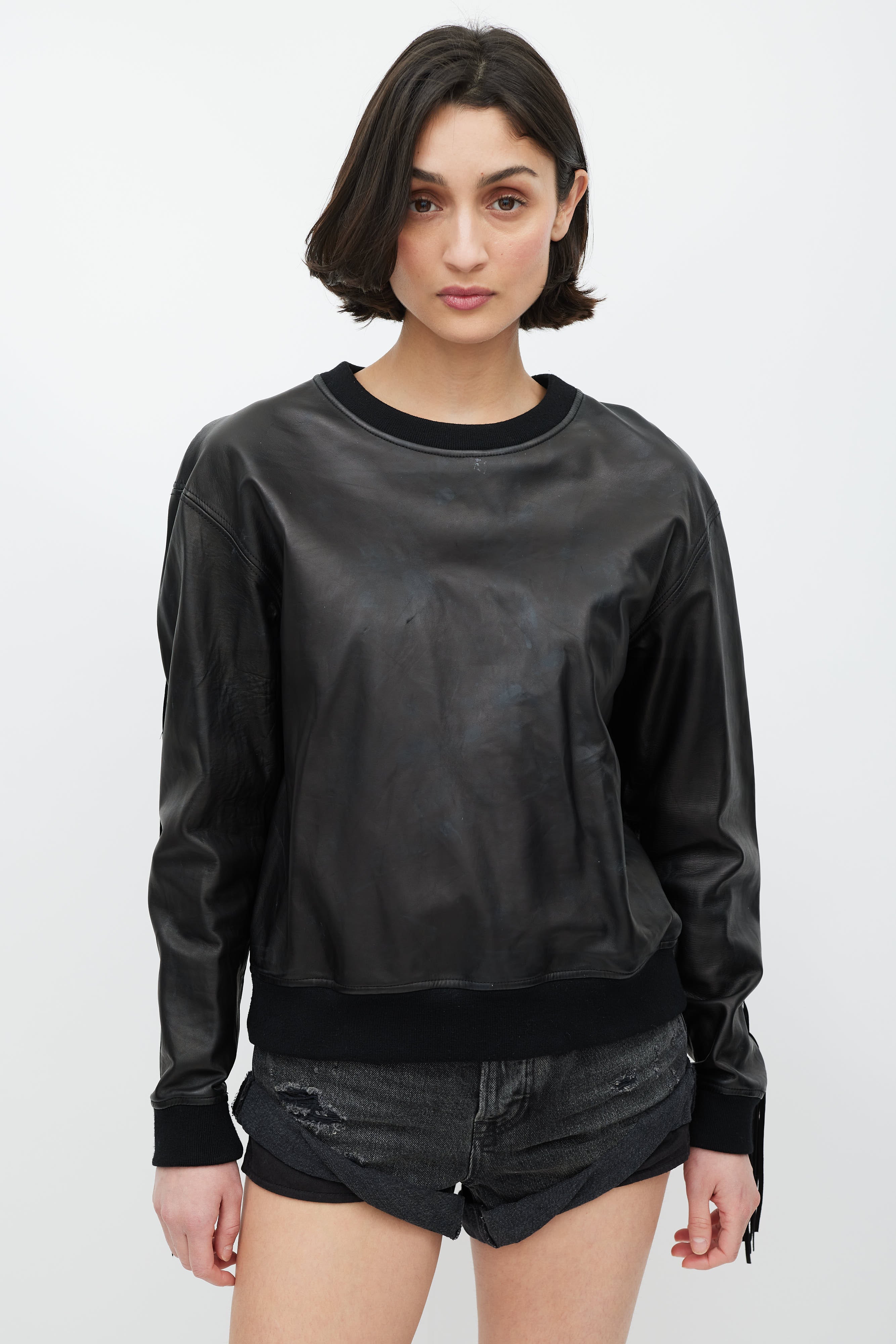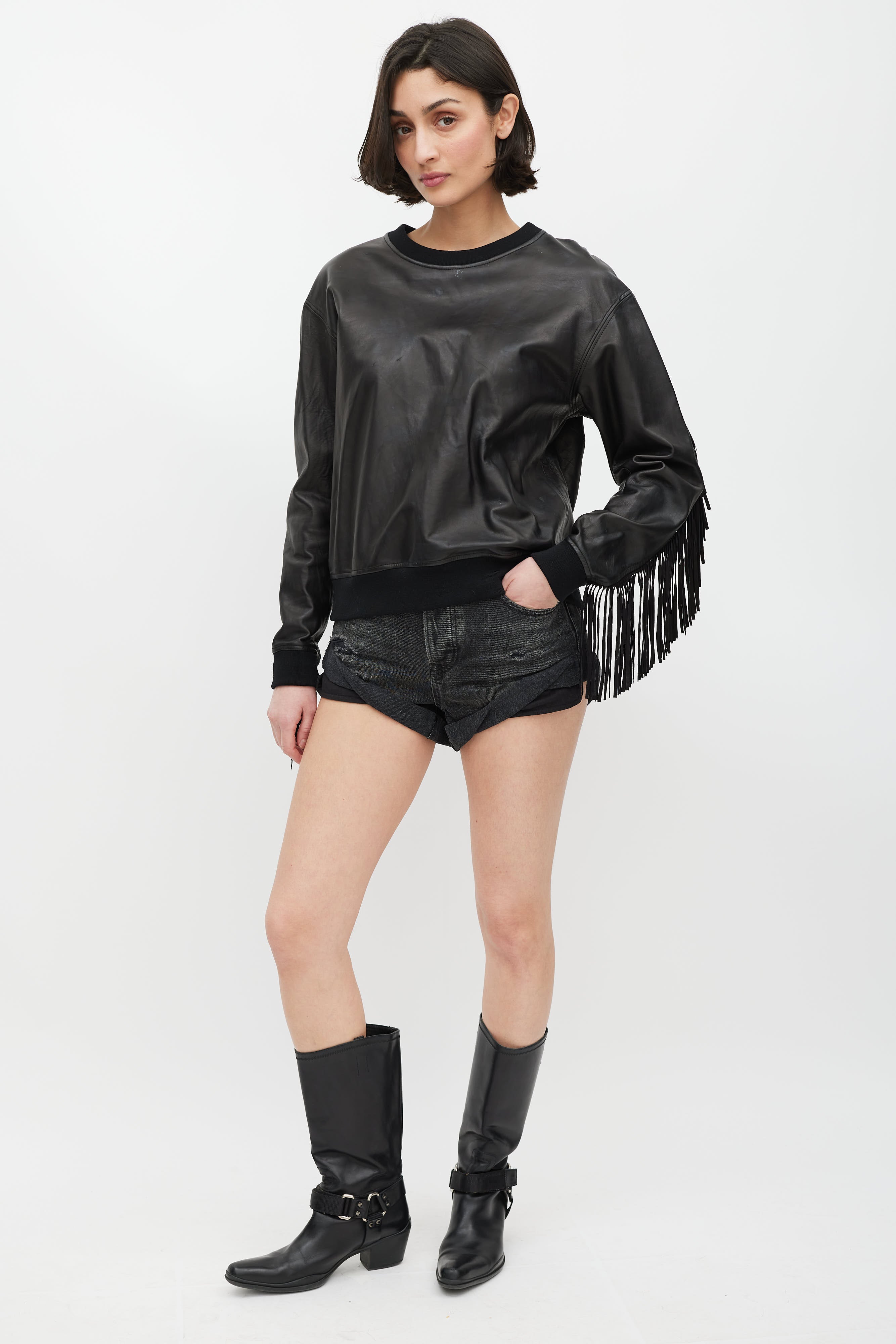 Pre-owned Alexander Wang black leather sweatshirt featuring ribbed crewneck, cuffs and hem, suede fringe at back and sleeve, and paneling at back.