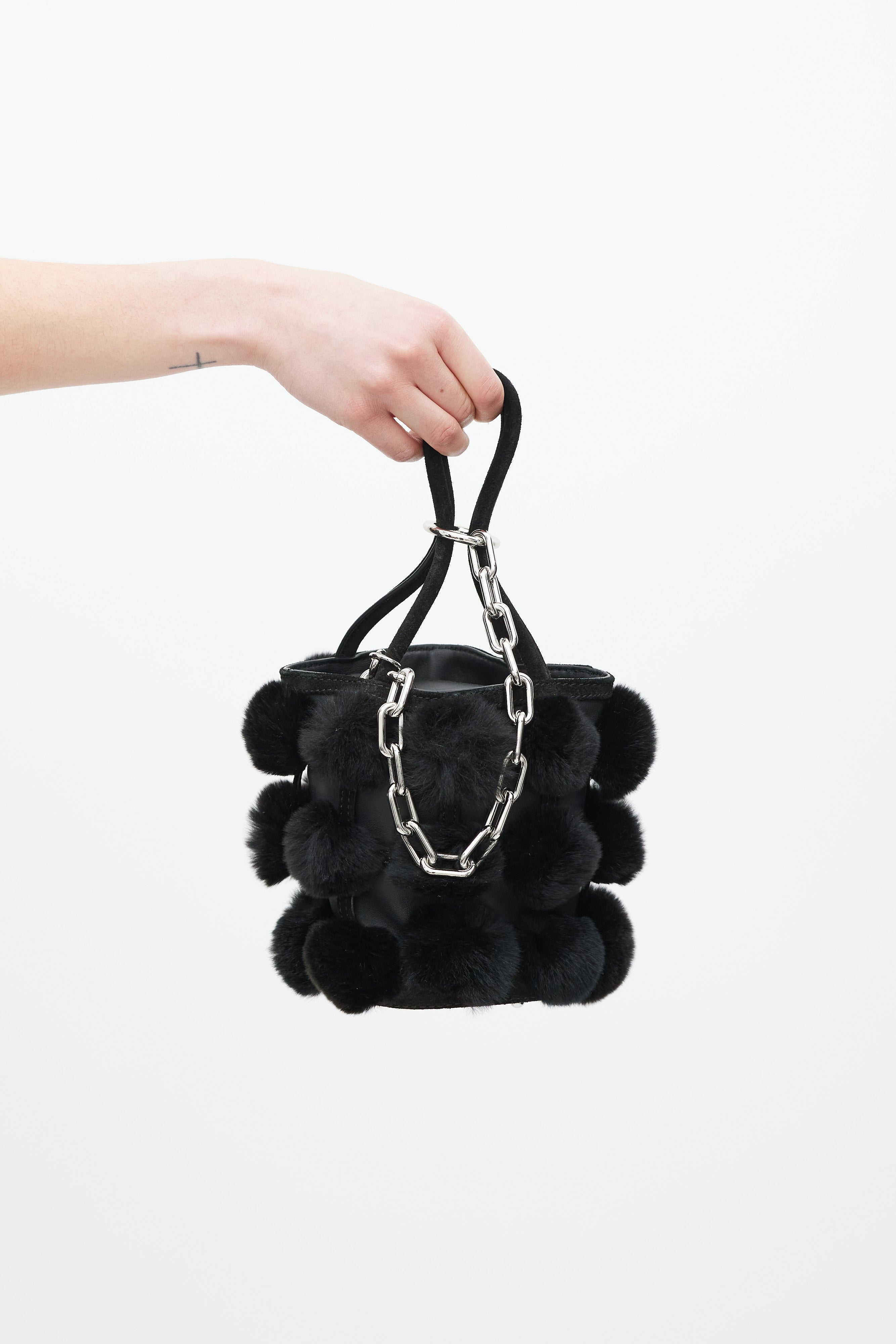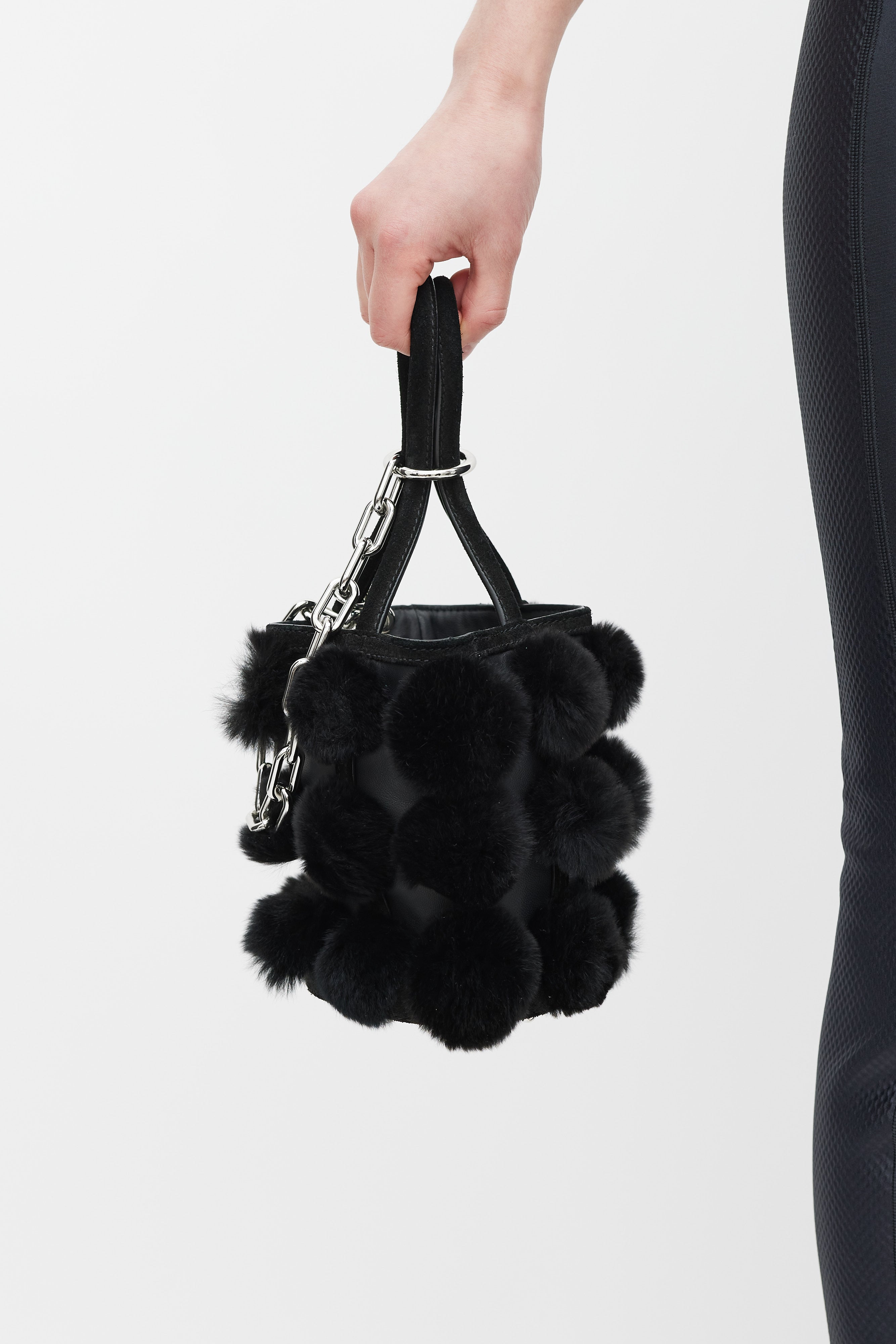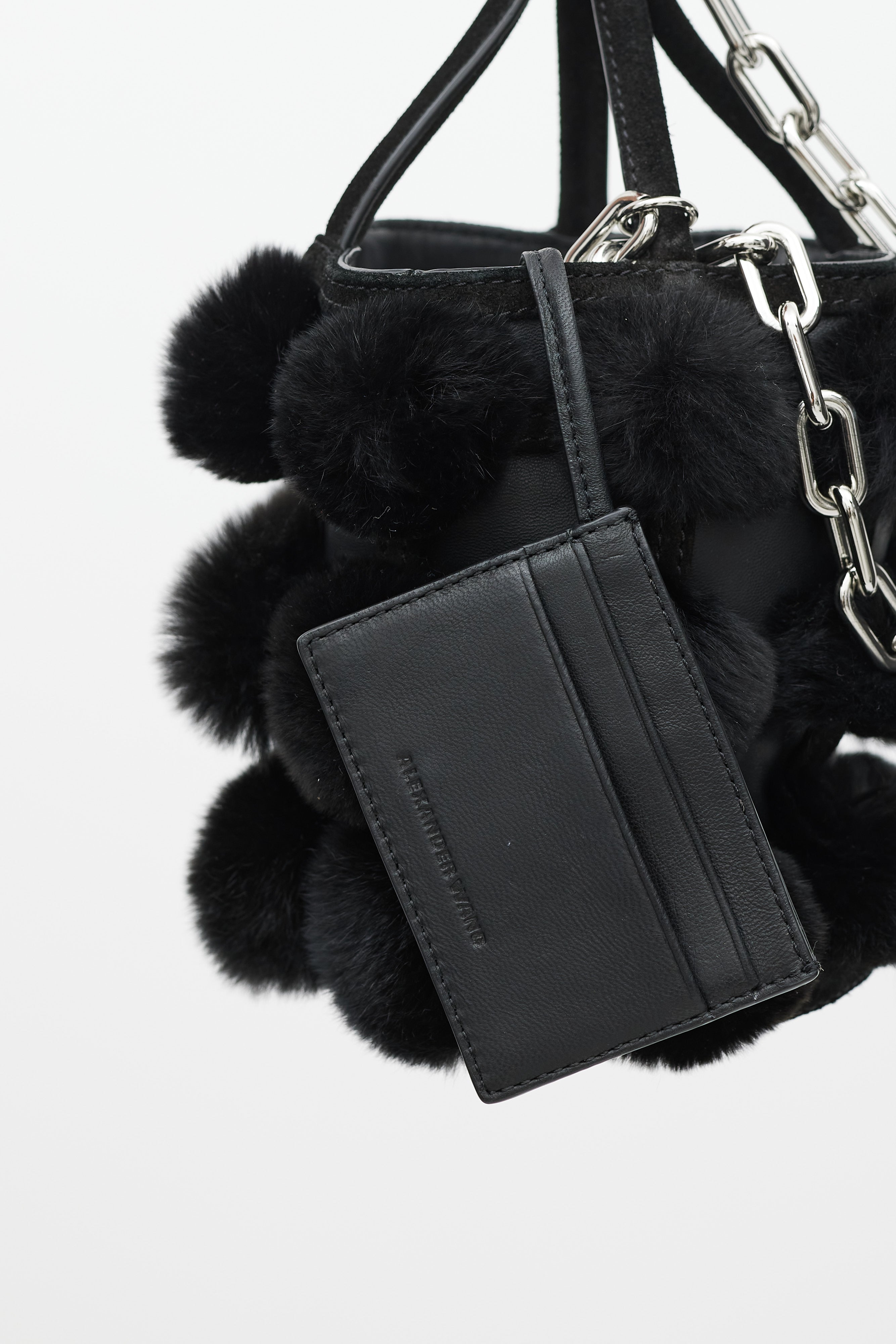 Pre-owned Alexander Wang black leather and fur Roxy bucket bag featuring two rolled suede top handles with silver chain attached, suede trim throughout, black leather body, suede base, feet at base, silver hardware throughout, black rabbit fur ball detail throughout, black leather cardholder with 3 slots attached to interior, and interior lined with black leather.