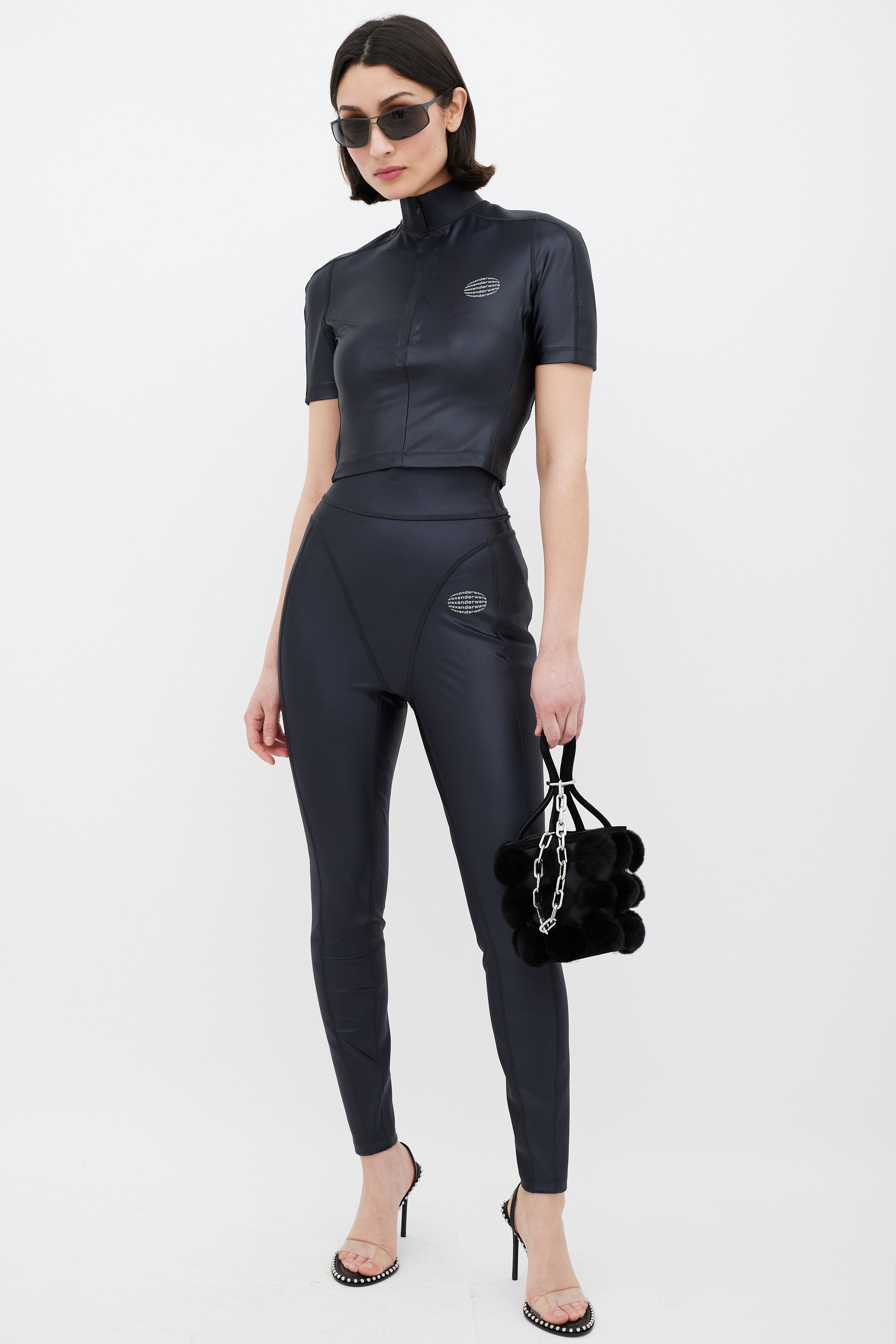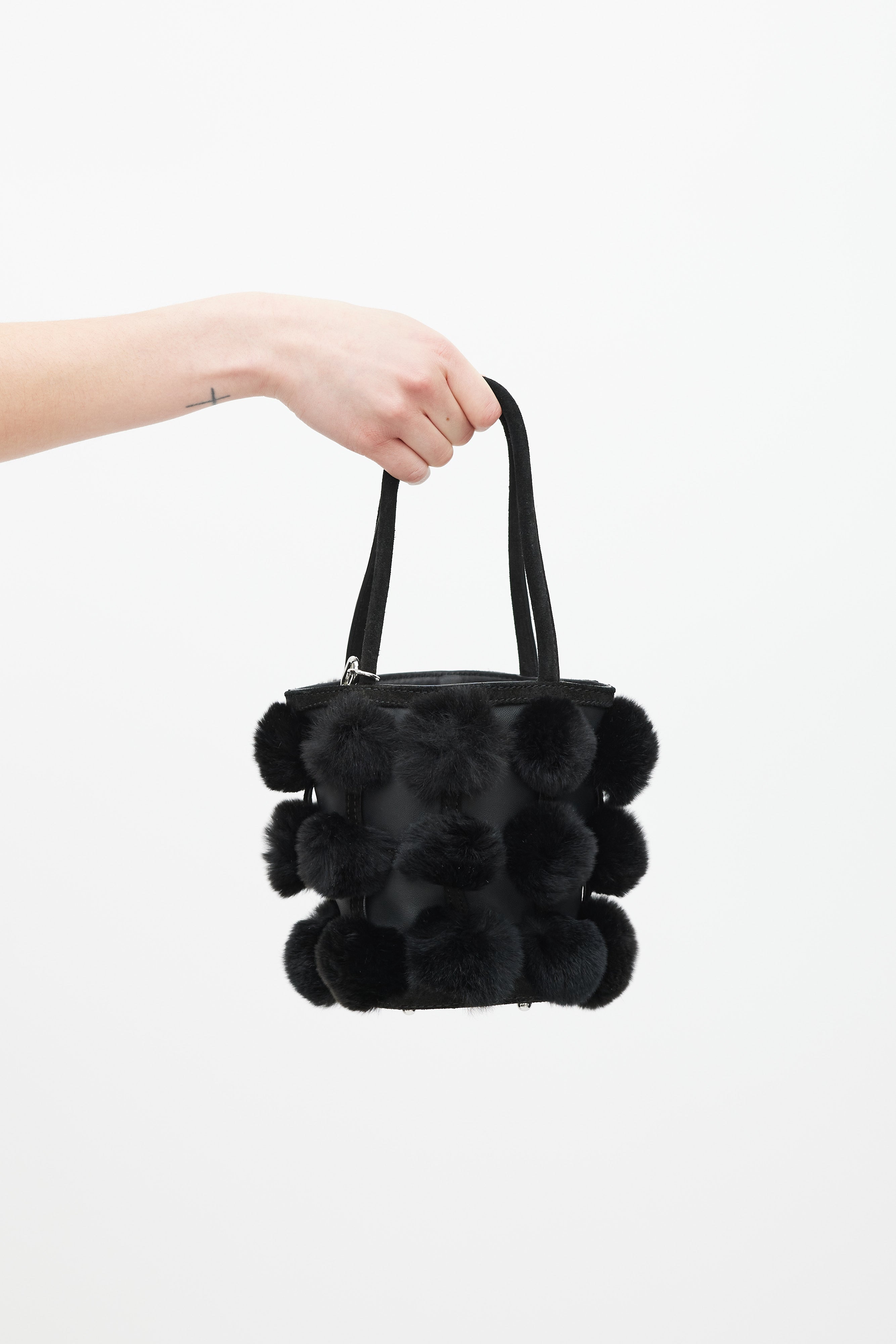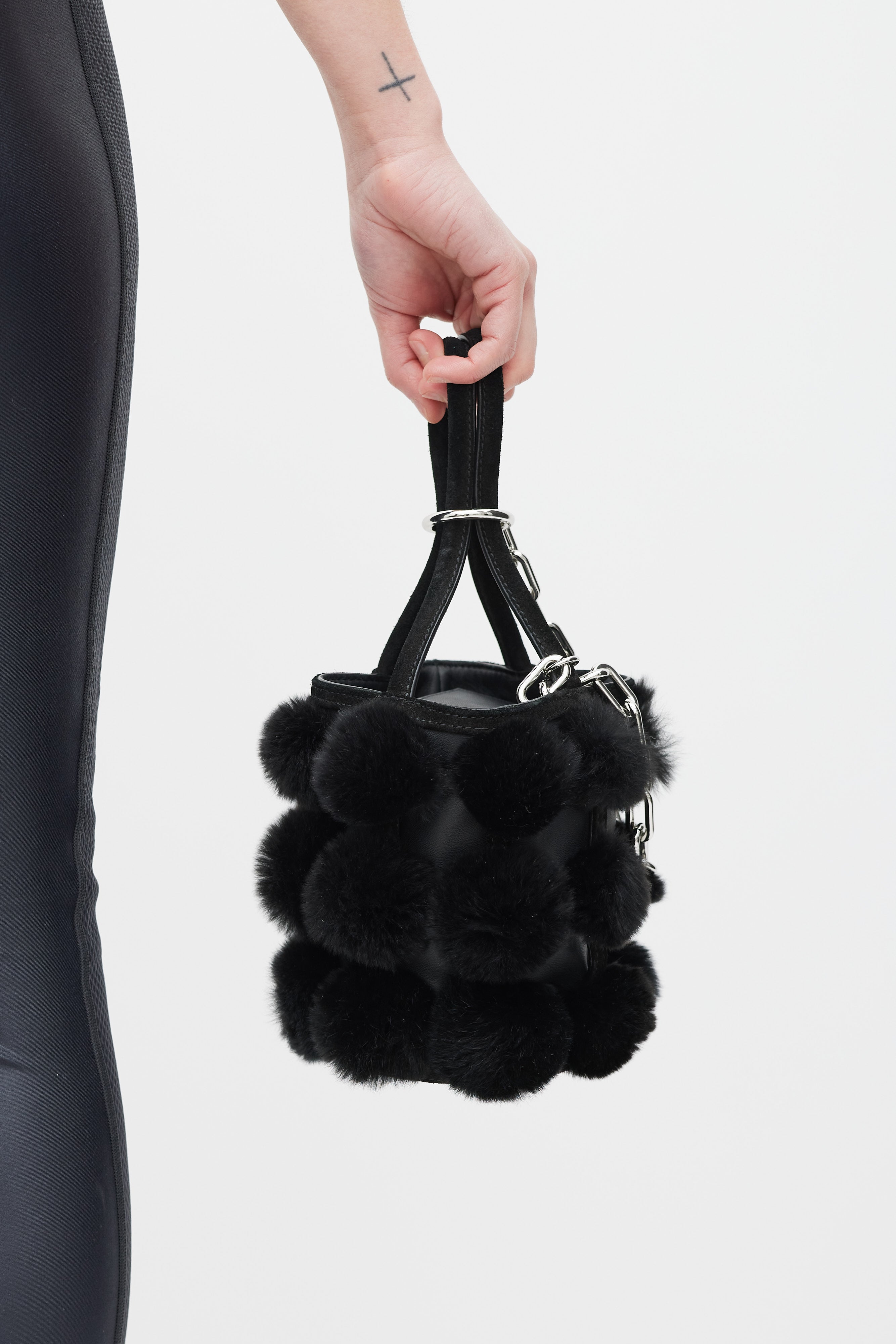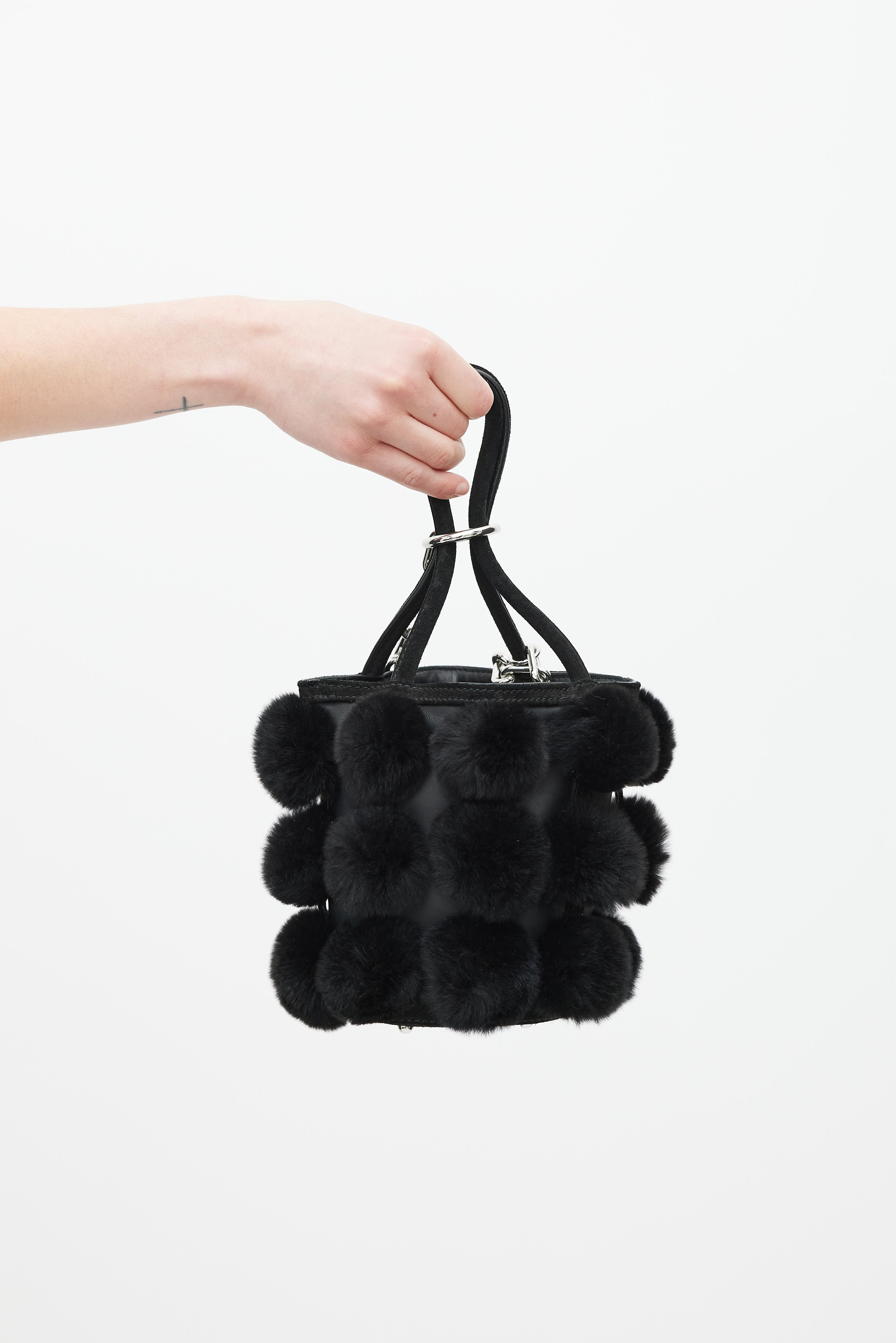 Pre-owned Alexander Wang black leather and fur Roxy bucket bag featuring two rolled suede top handles with silver chain attached, suede trim throughout, black leather body, suede base, feet at base, silver hardware throughout, black rabbit fur ball detail throughout, black leather cardholder with 3 slots attached to interior, and interior lined with black leather.