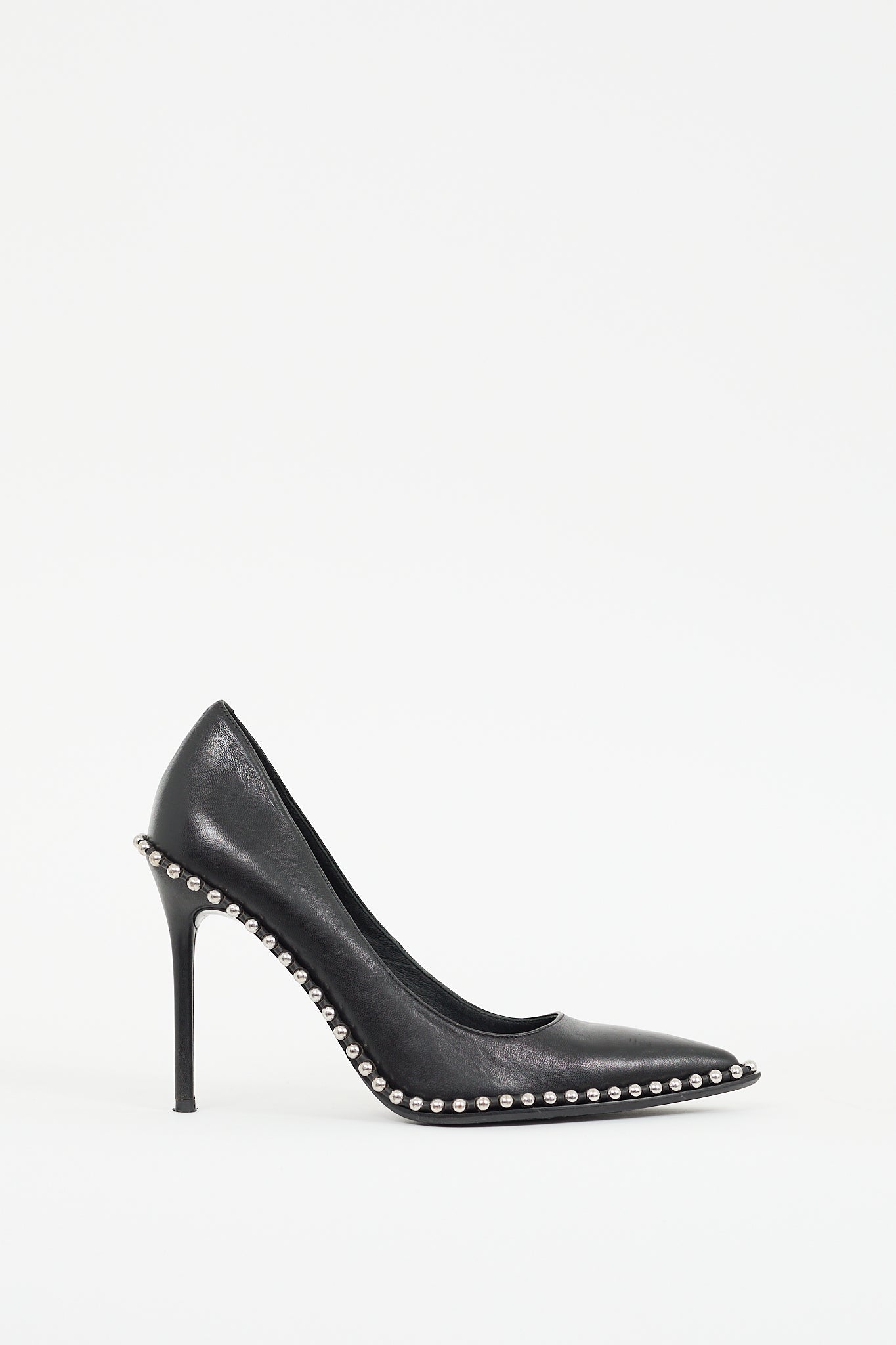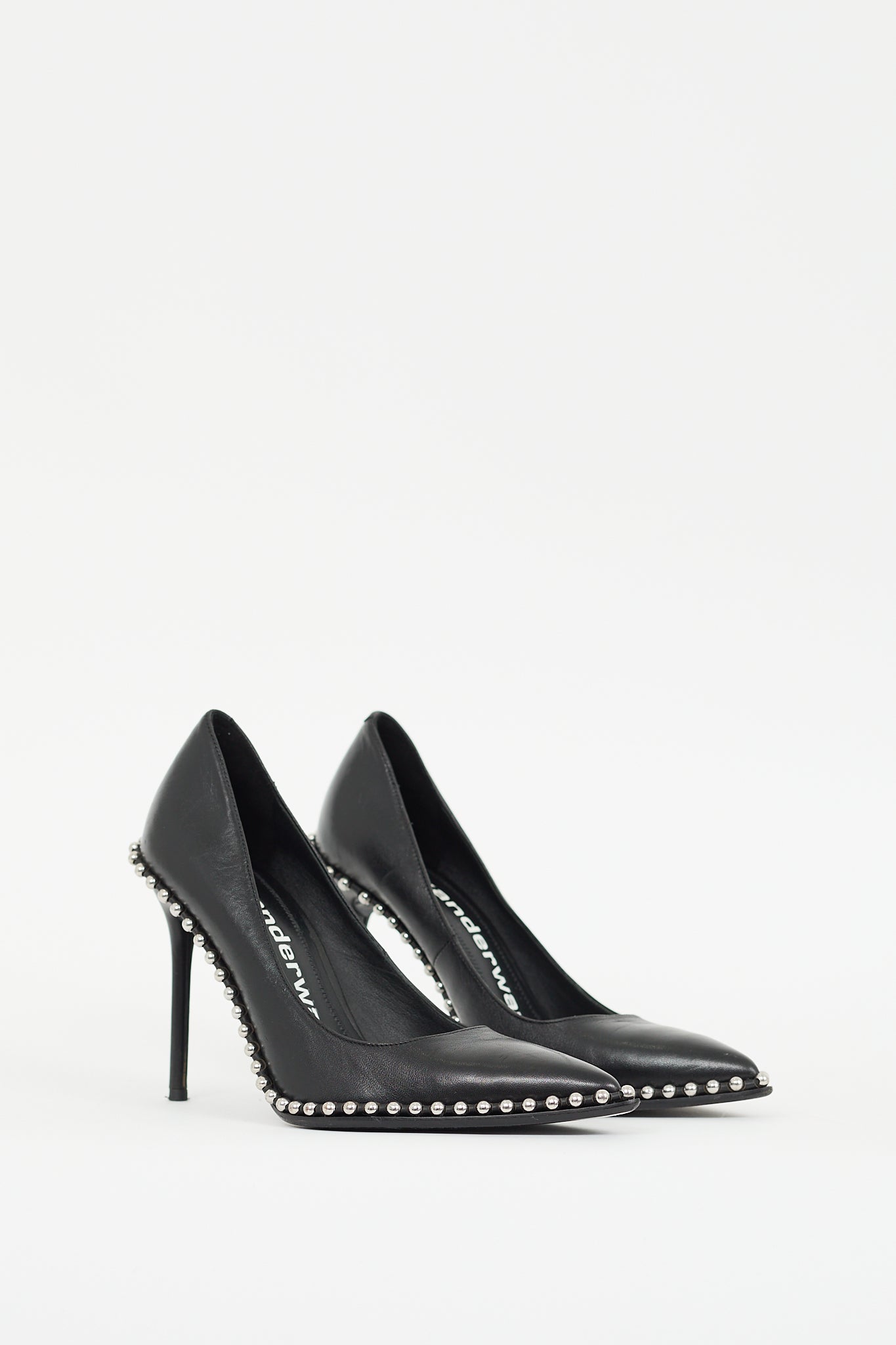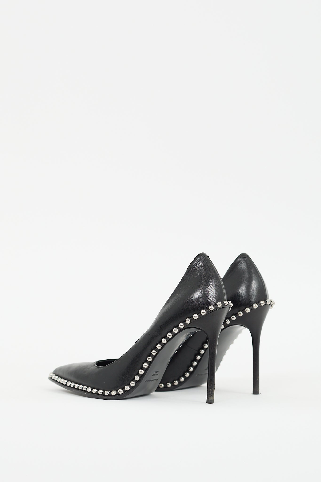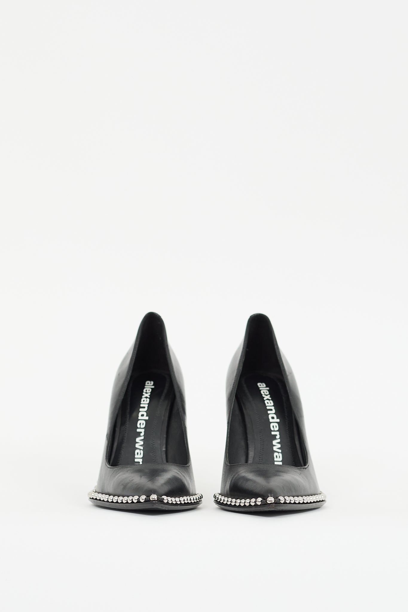 Pre-owned Alexander Wang black leather pumps featuring pointed toe, silver tone ball chain trim at midsole, covered stiletto heel, and slip on entry. Comes with dust bag.