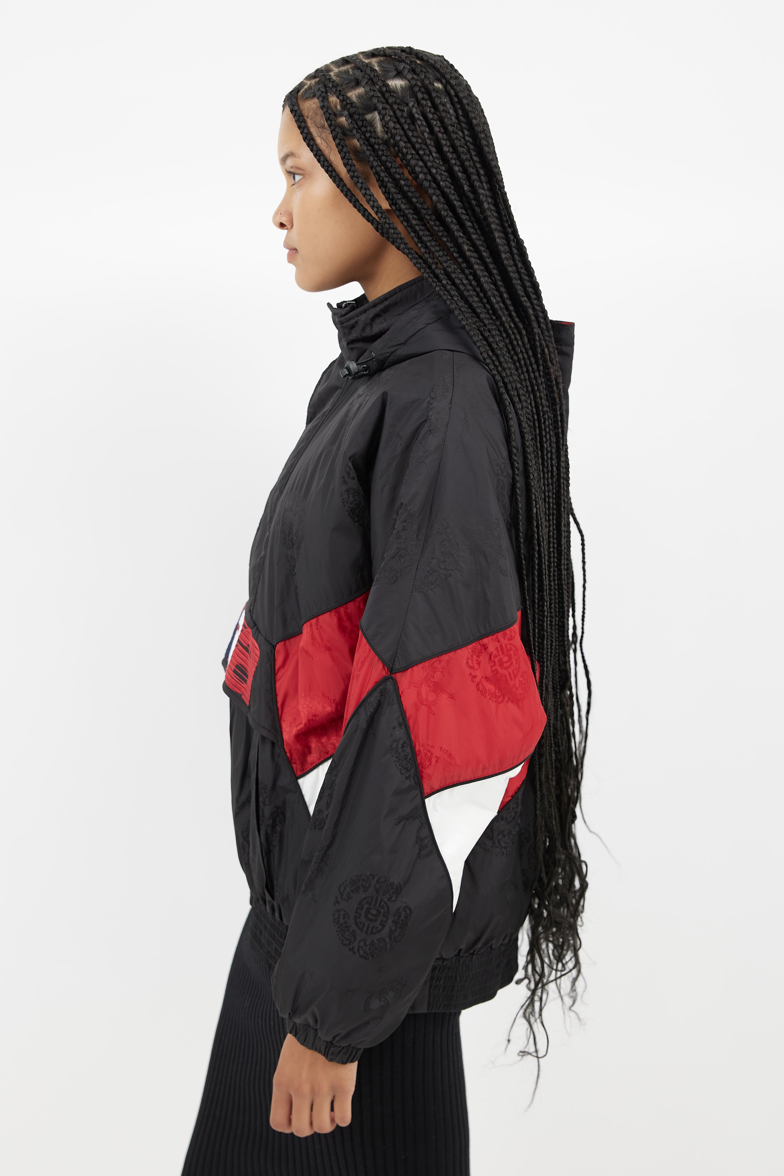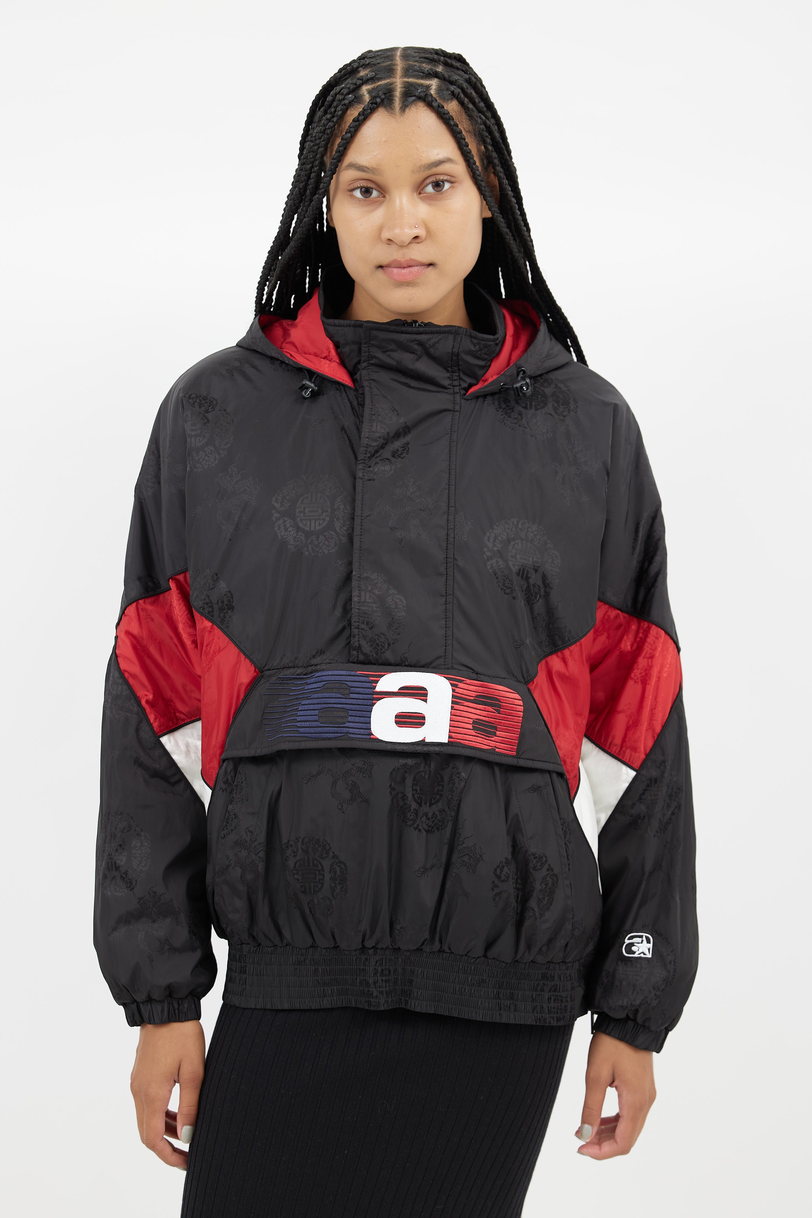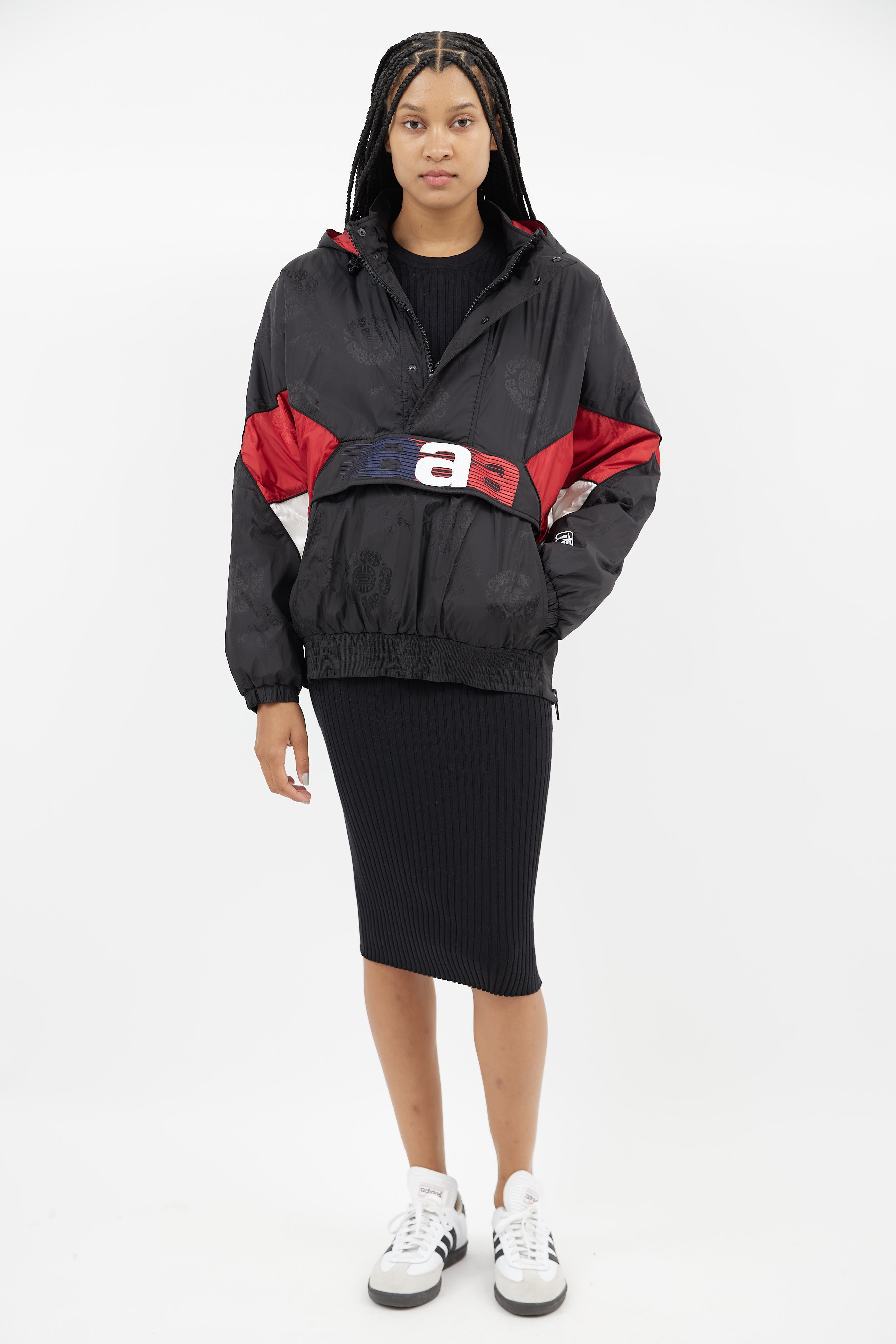 Pre-owned Alexander Wang black jacket featuring half zip closure, attached hood, elasticized cuffs, white and red satin panelling detail, multicolour "A" webbed logo at front pocket, and side vents with zip closure. Lined.