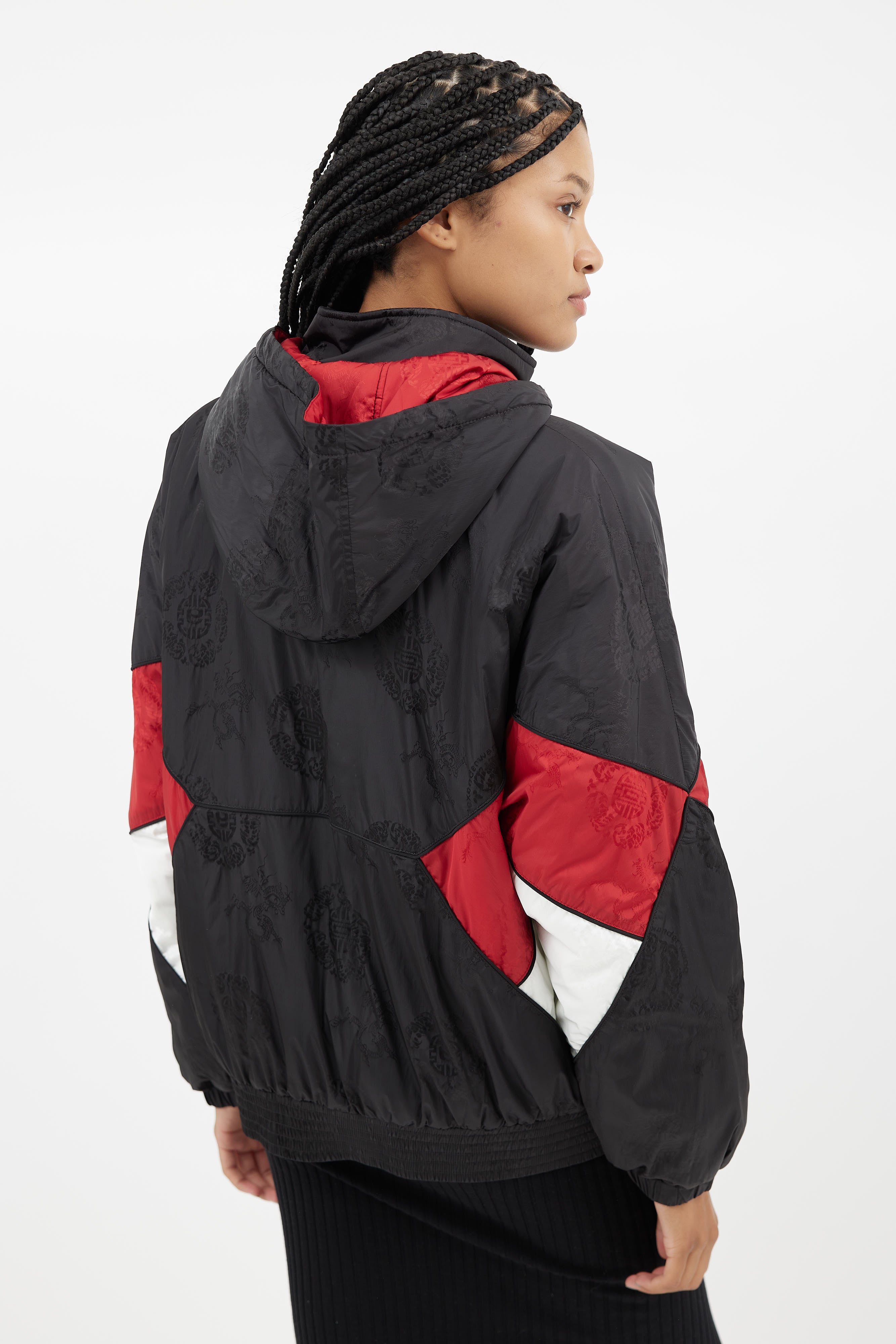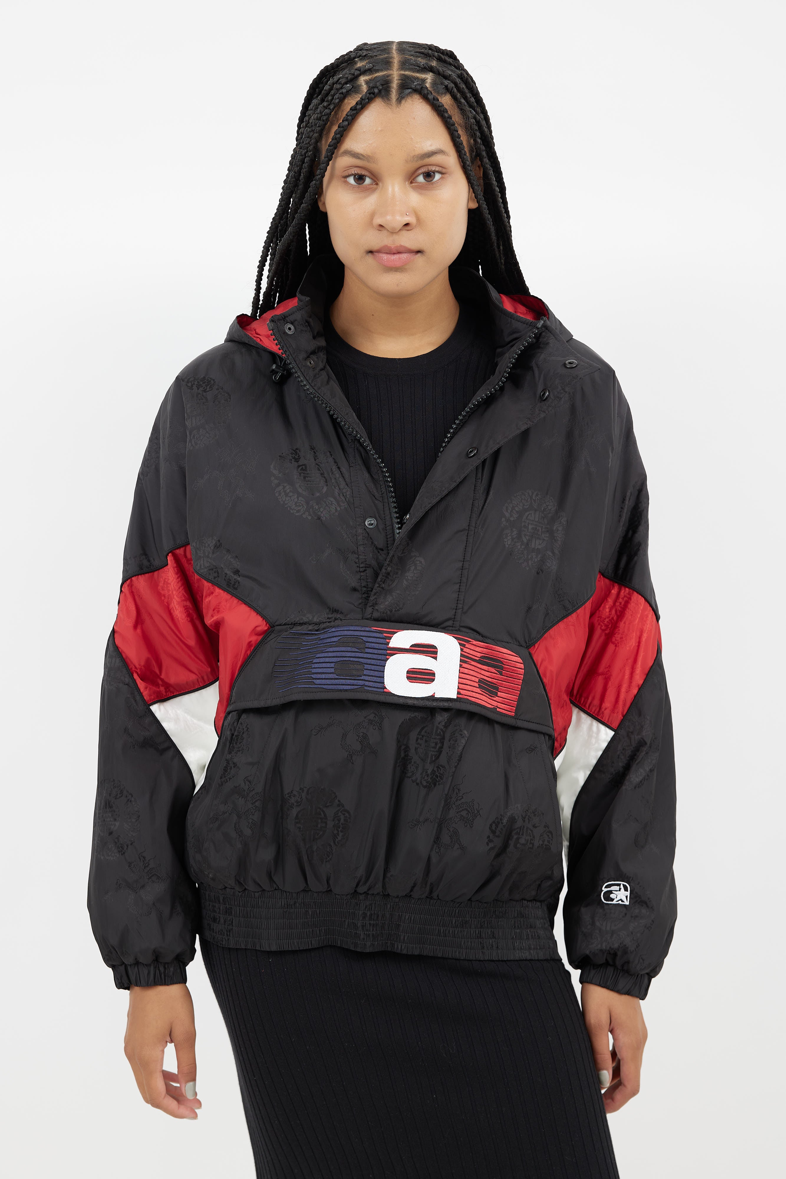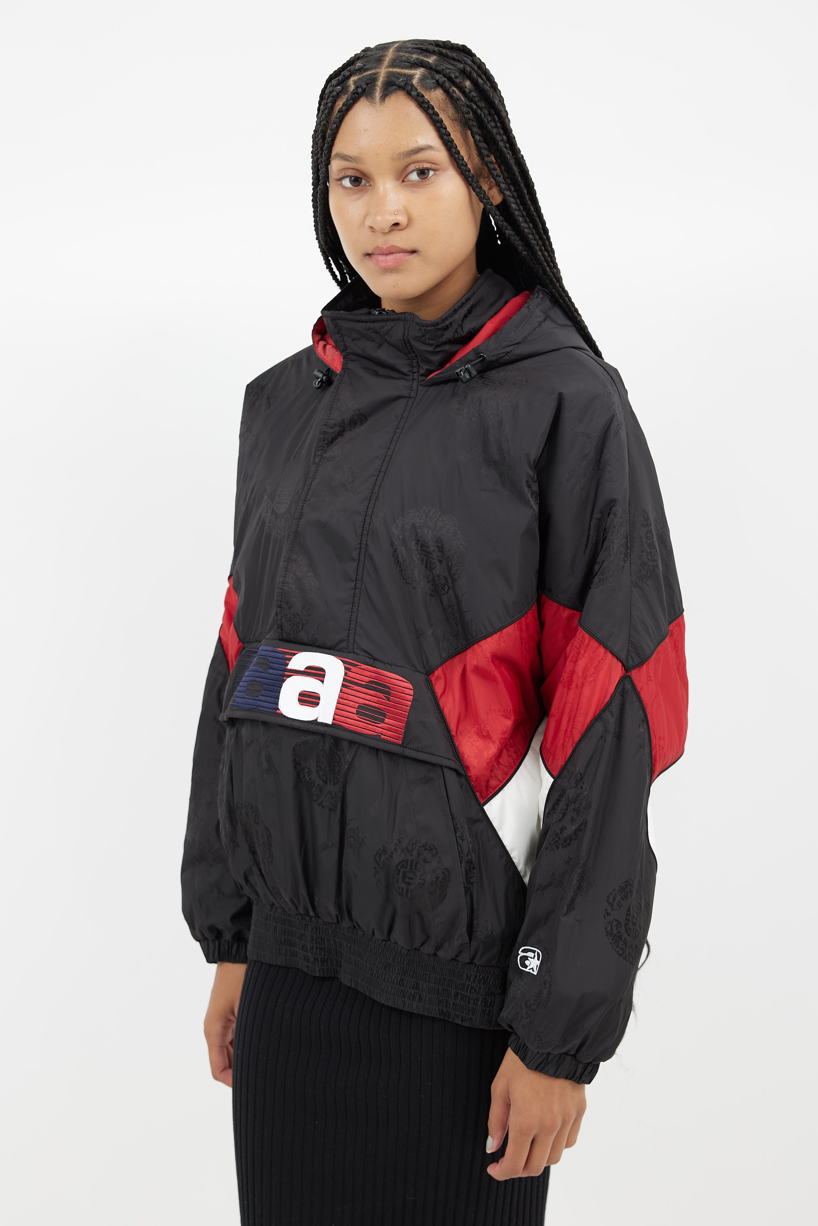 Pre-owned Alexander Wang black jacket featuring half zip closure, attached hood, elasticized cuffs, white and red satin panelling detail, multicolour "A" webbed logo at front pocket, and side vents with zip closure. Lined.
