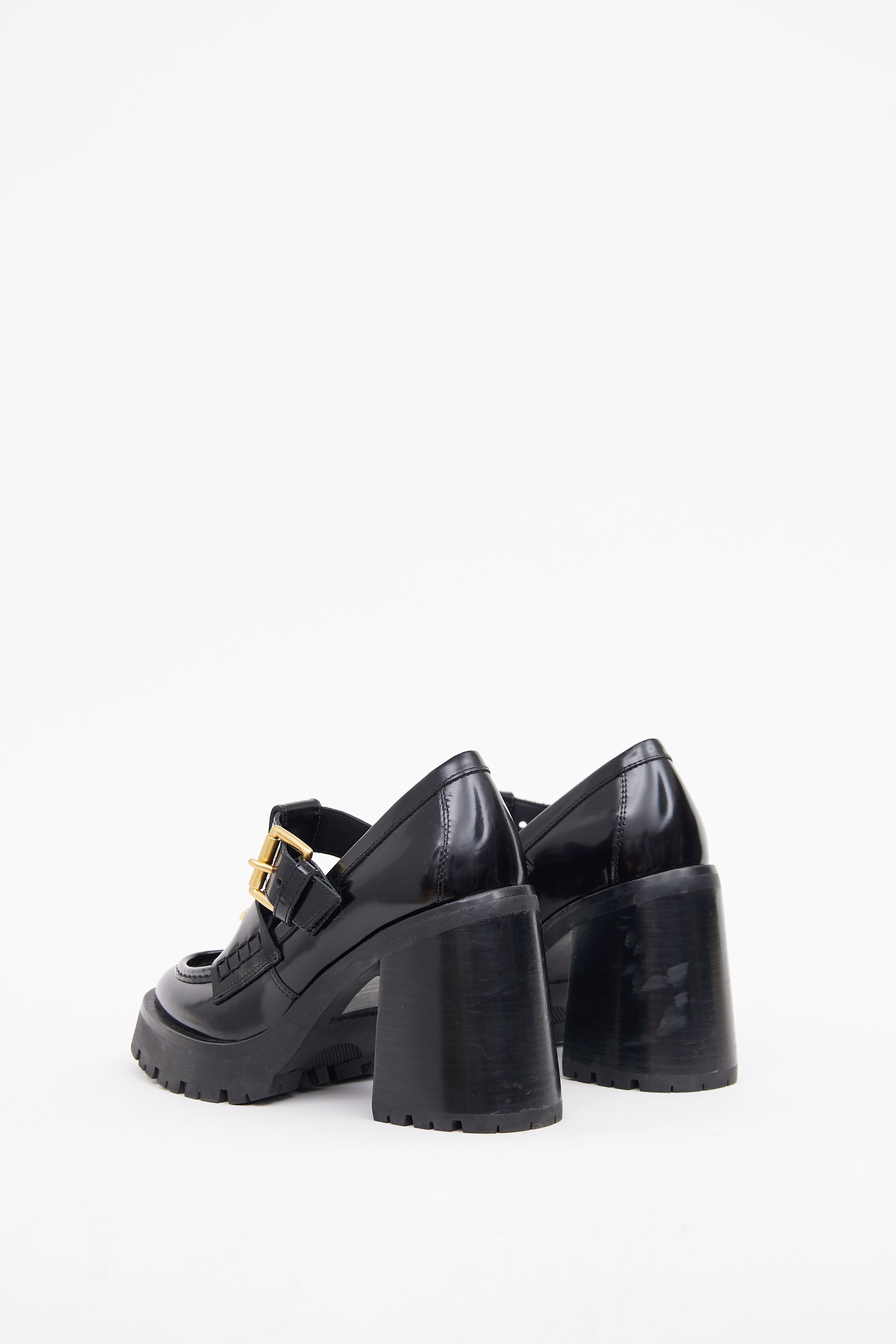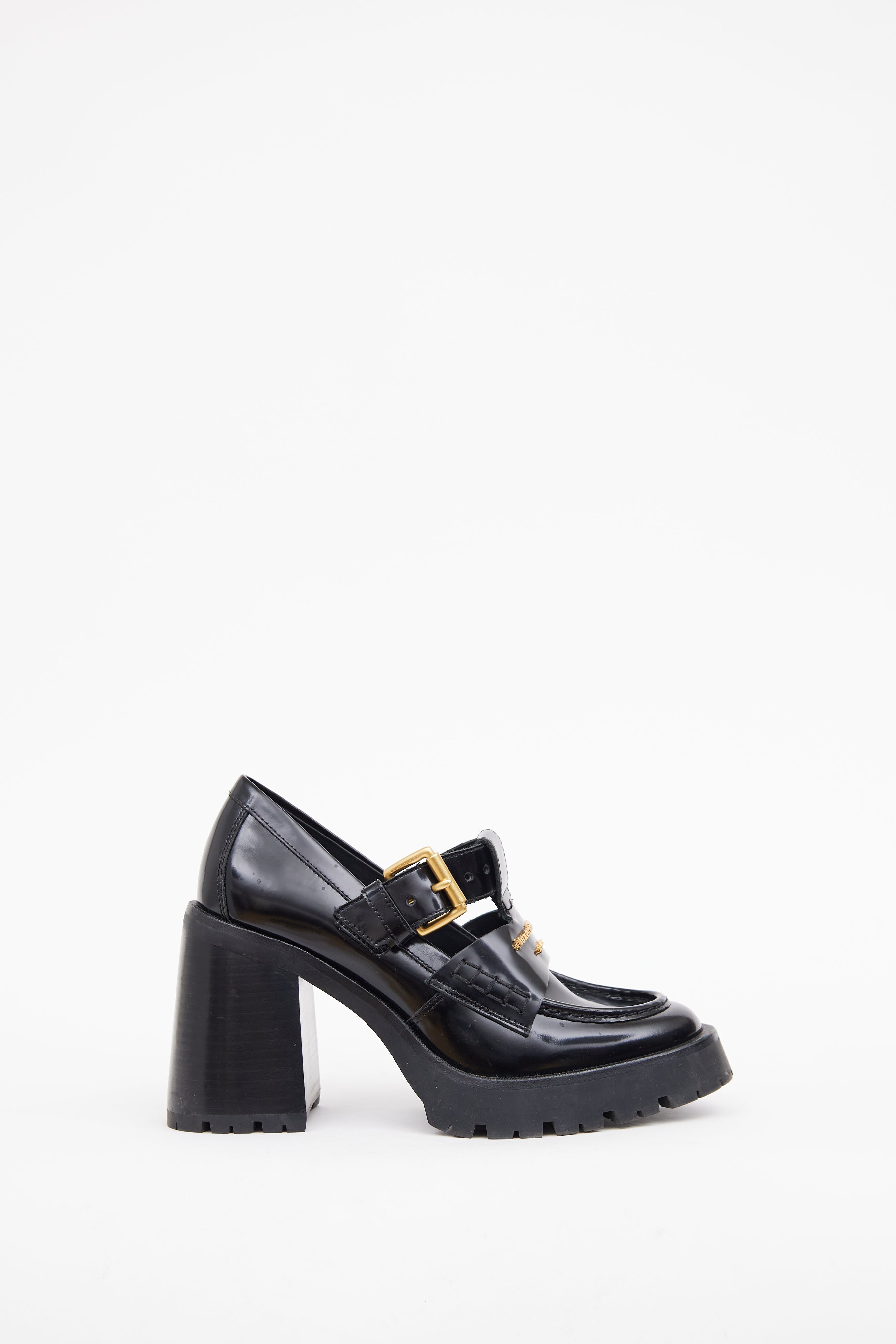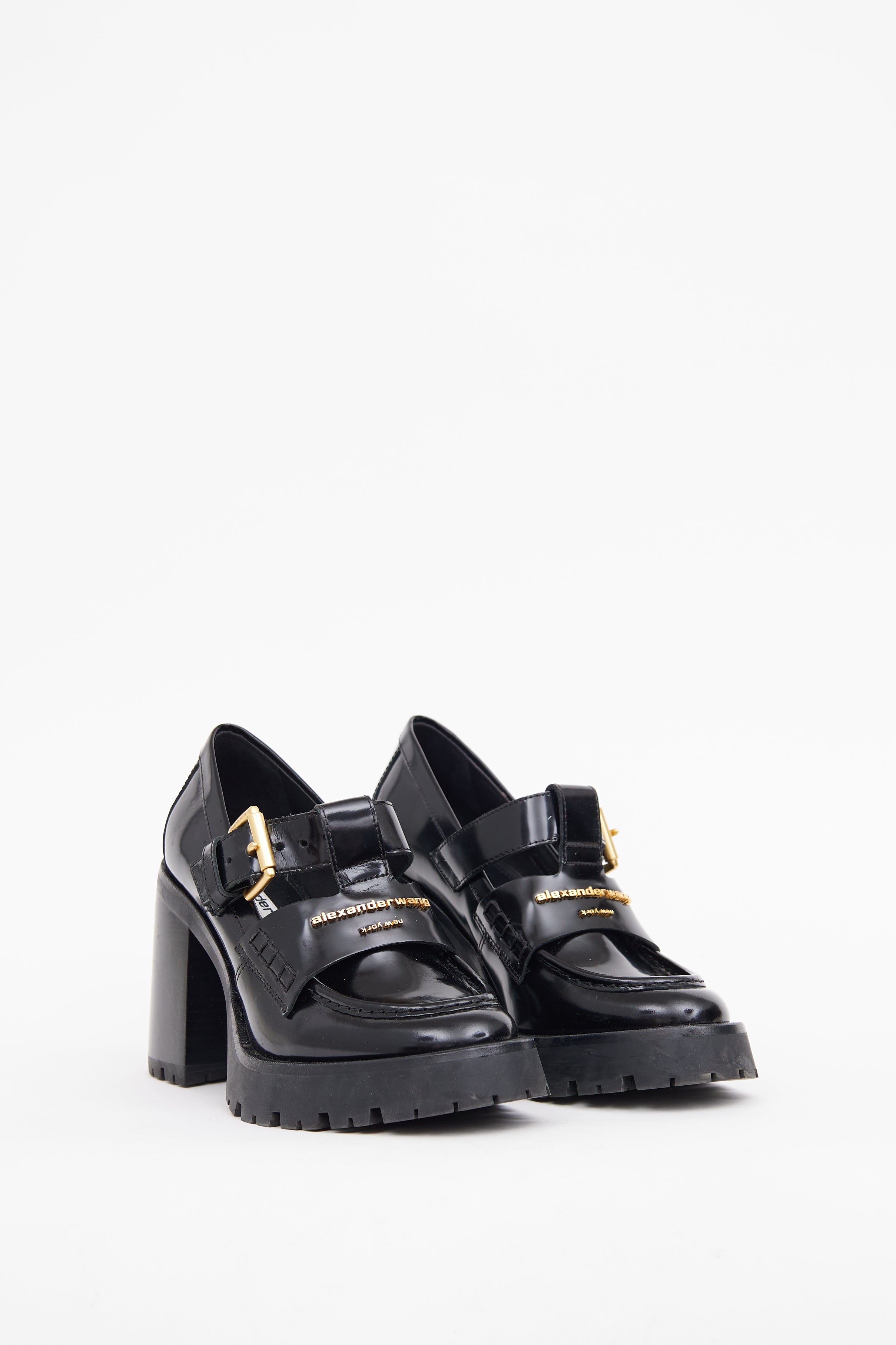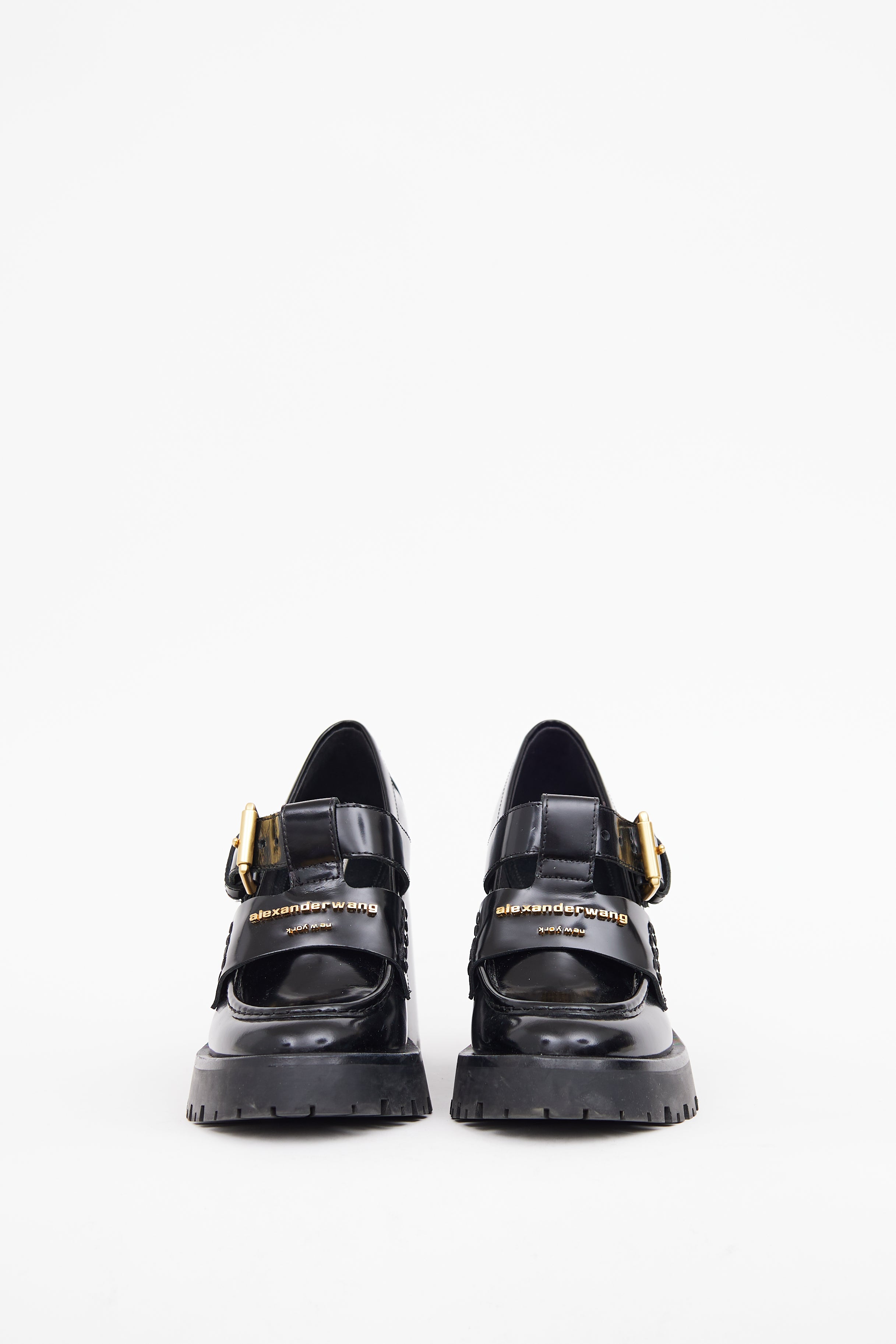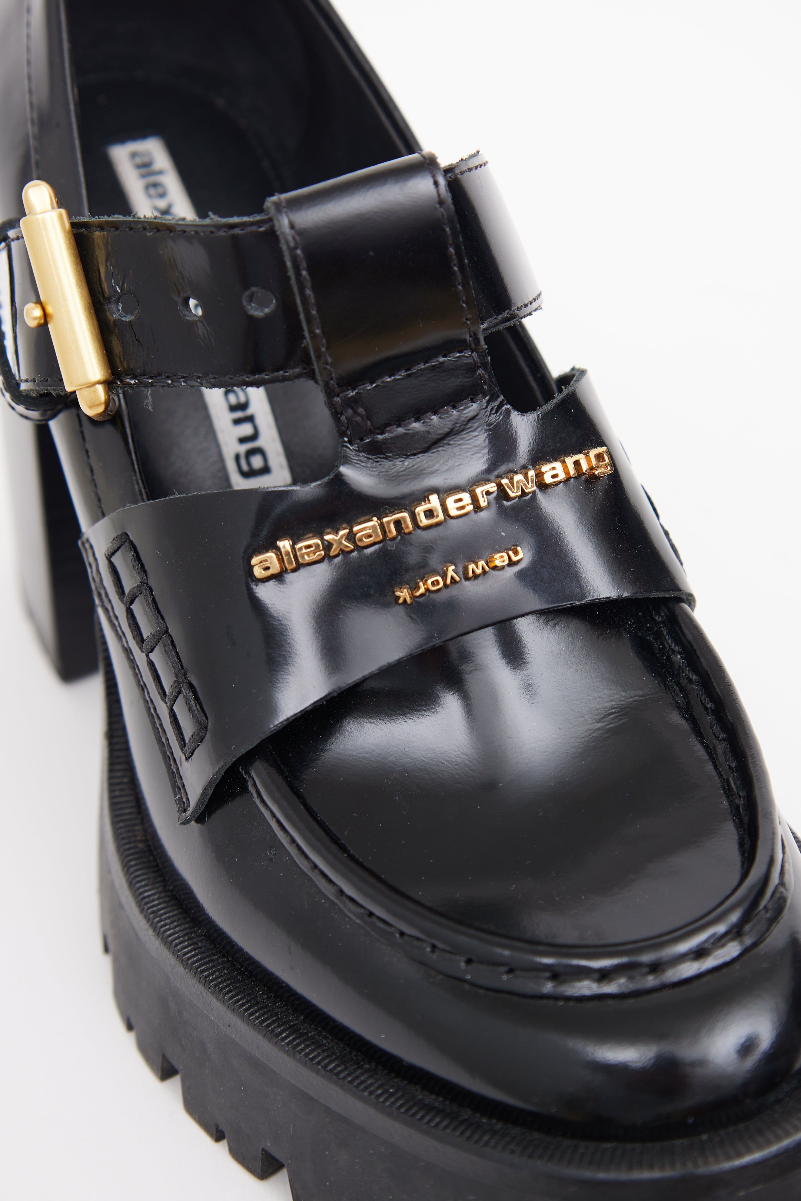 Pre-owned Alexander Wang black Carter loafers featuring round toe, treaded platform midsole, adjustable strap with cut out detail on upper, gold tone hardware, logo text plaque on upper and block heel.