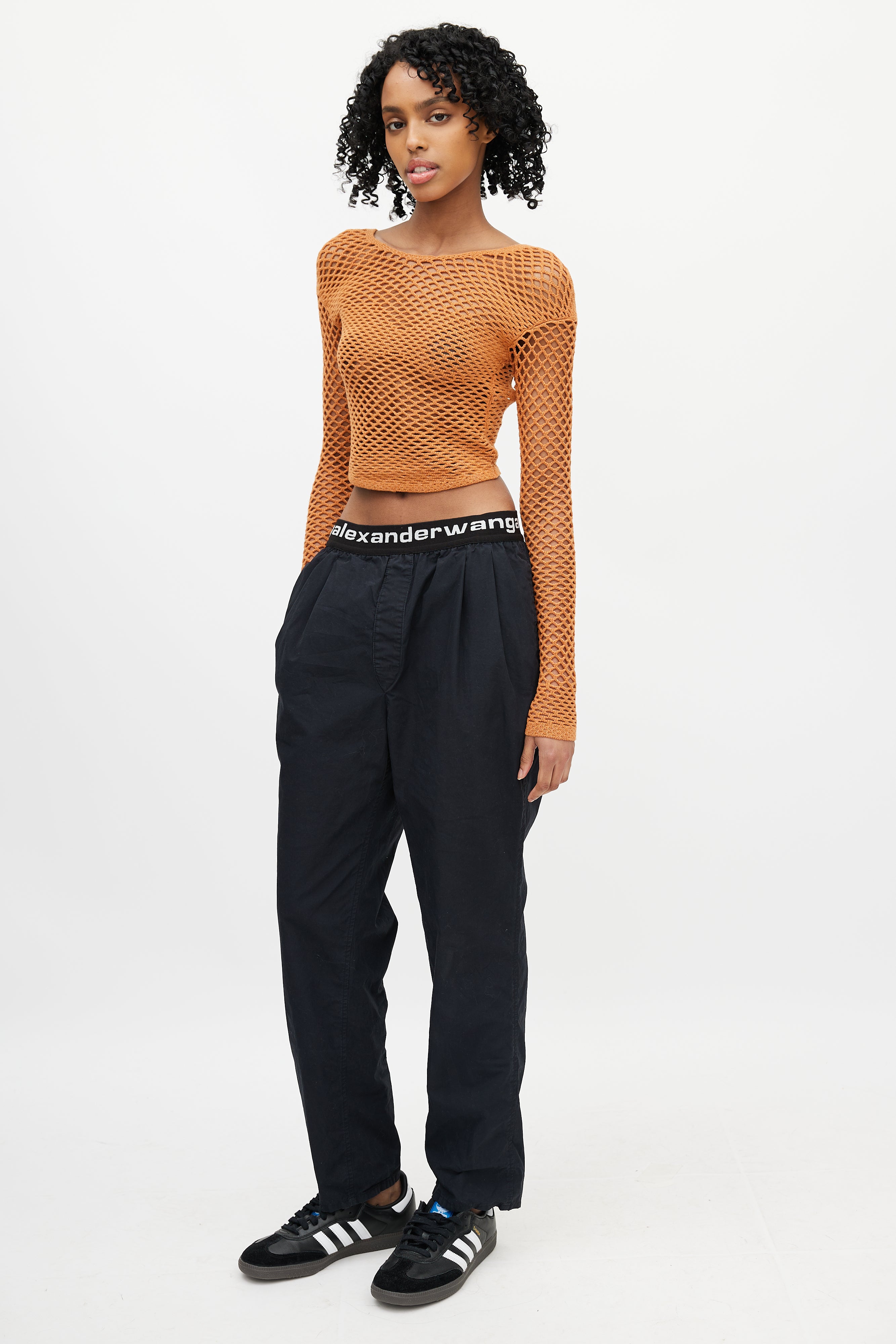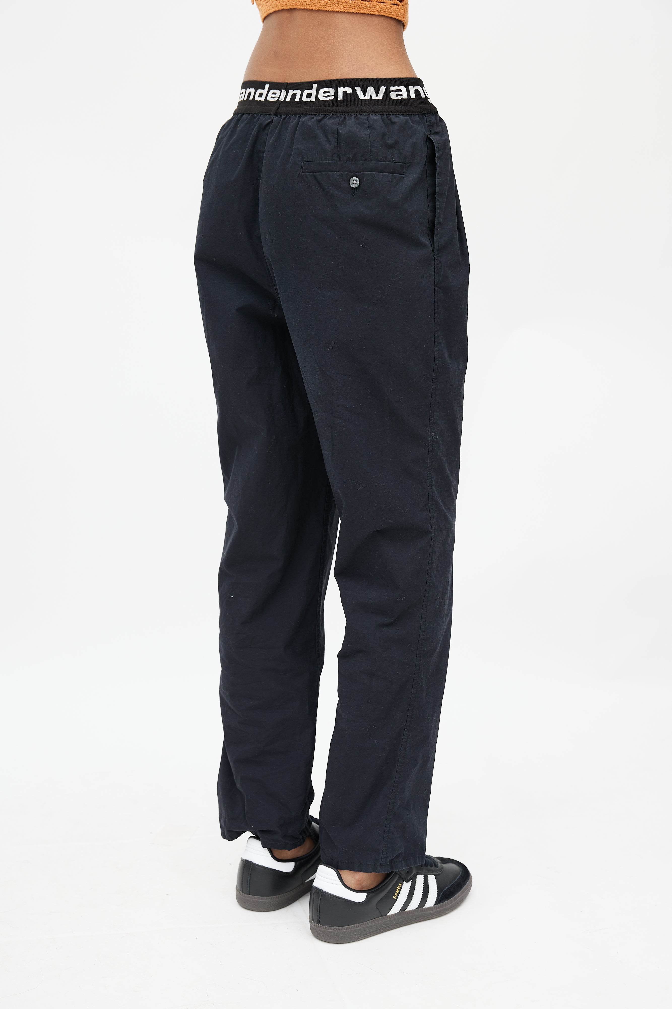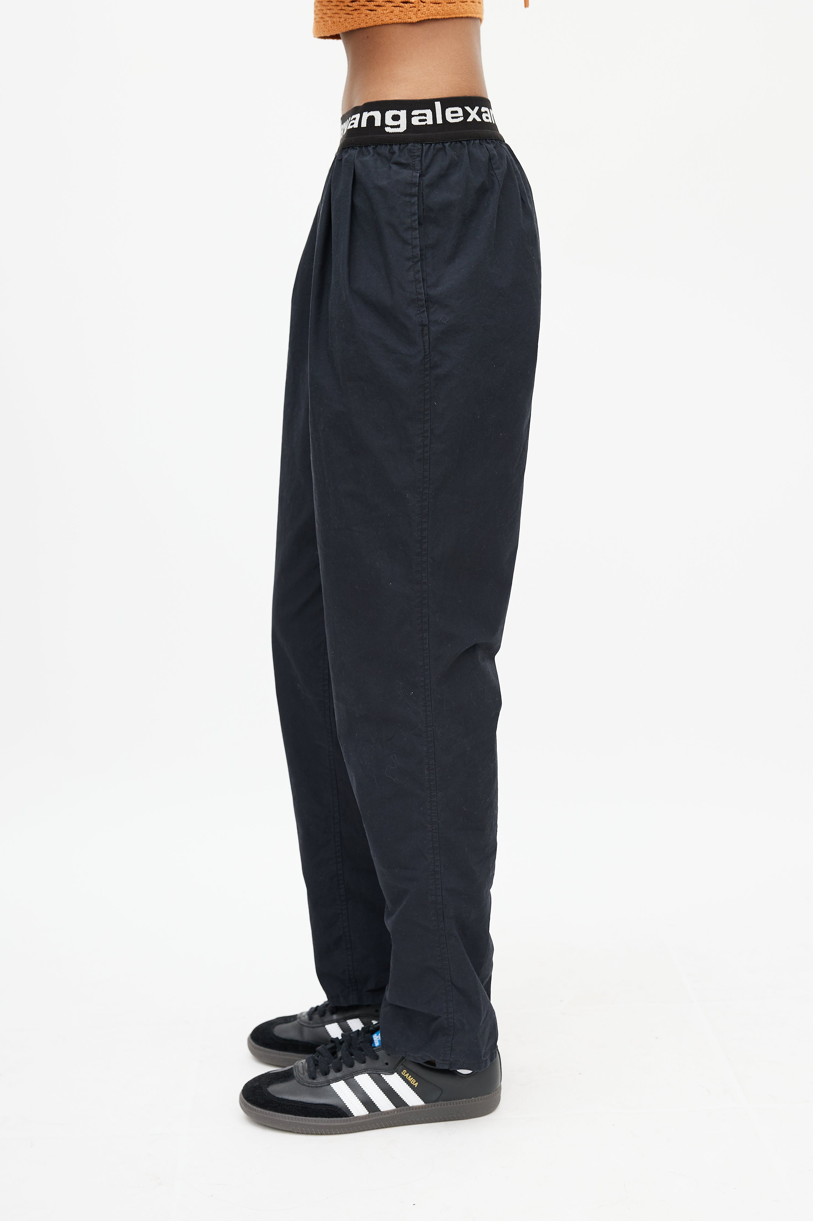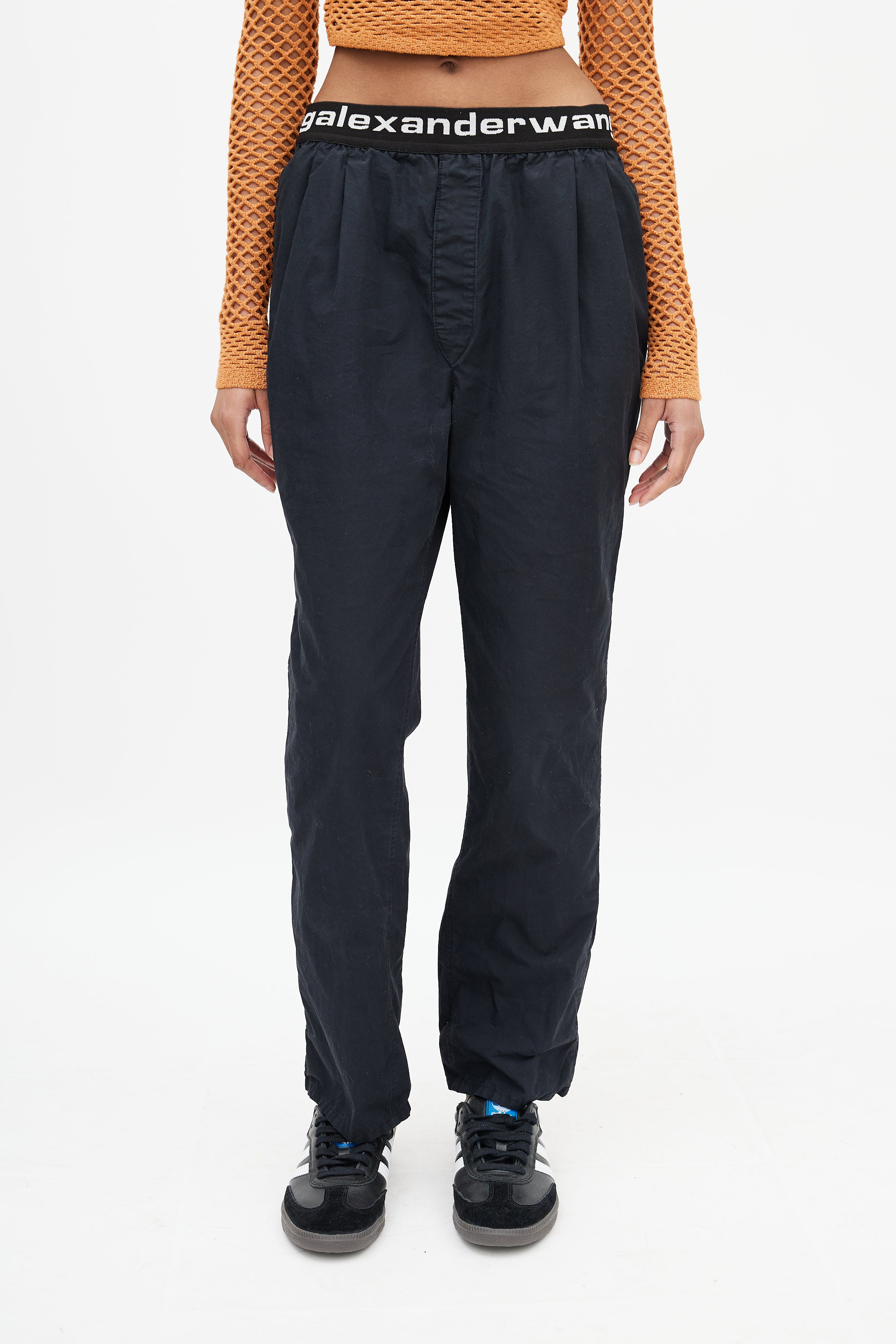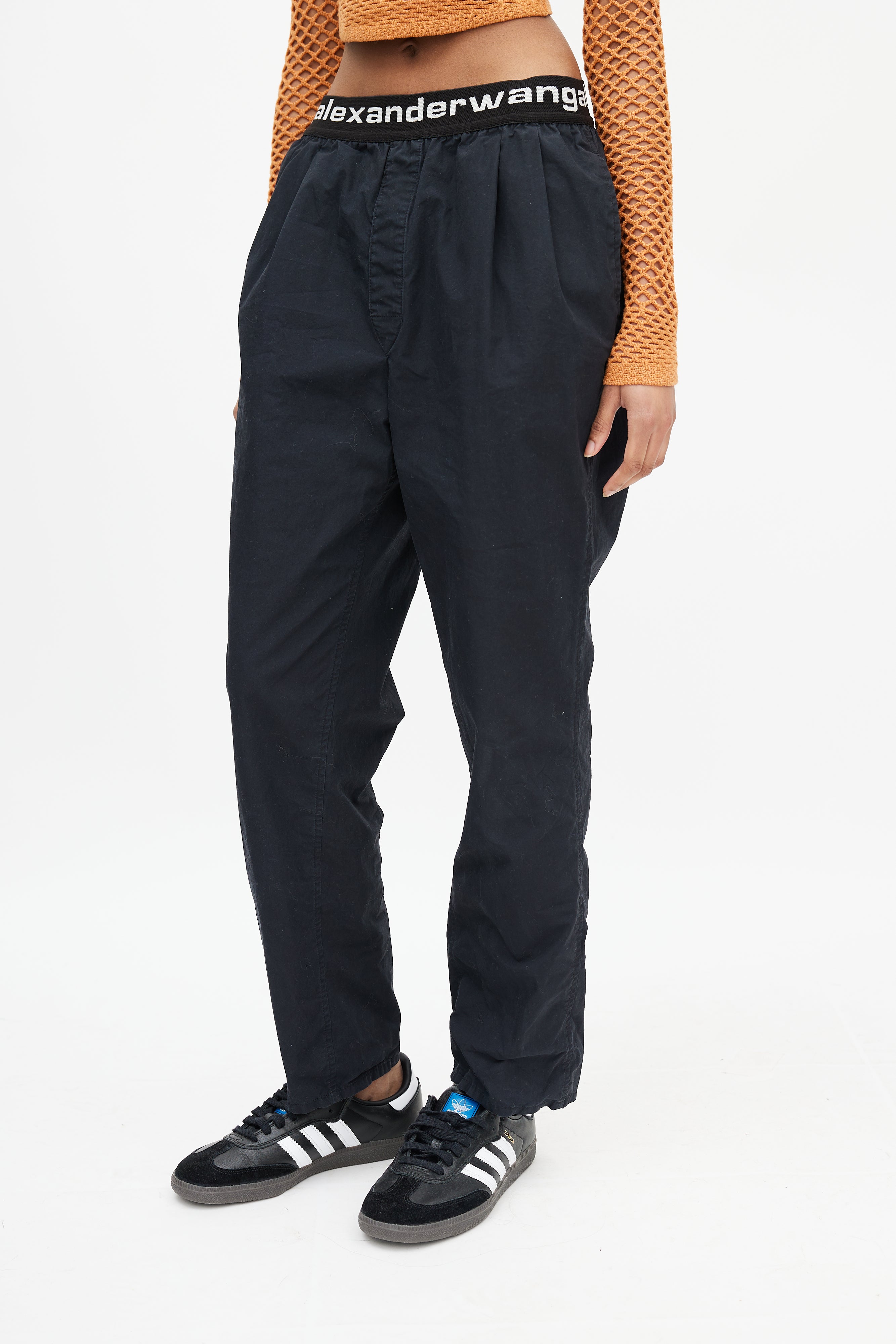 Pre-owned Alexander Wang black trousers featuring an elasticized waist with white woven logo, two slip pockets at hip, one welt pocket at back, and straight leg.
