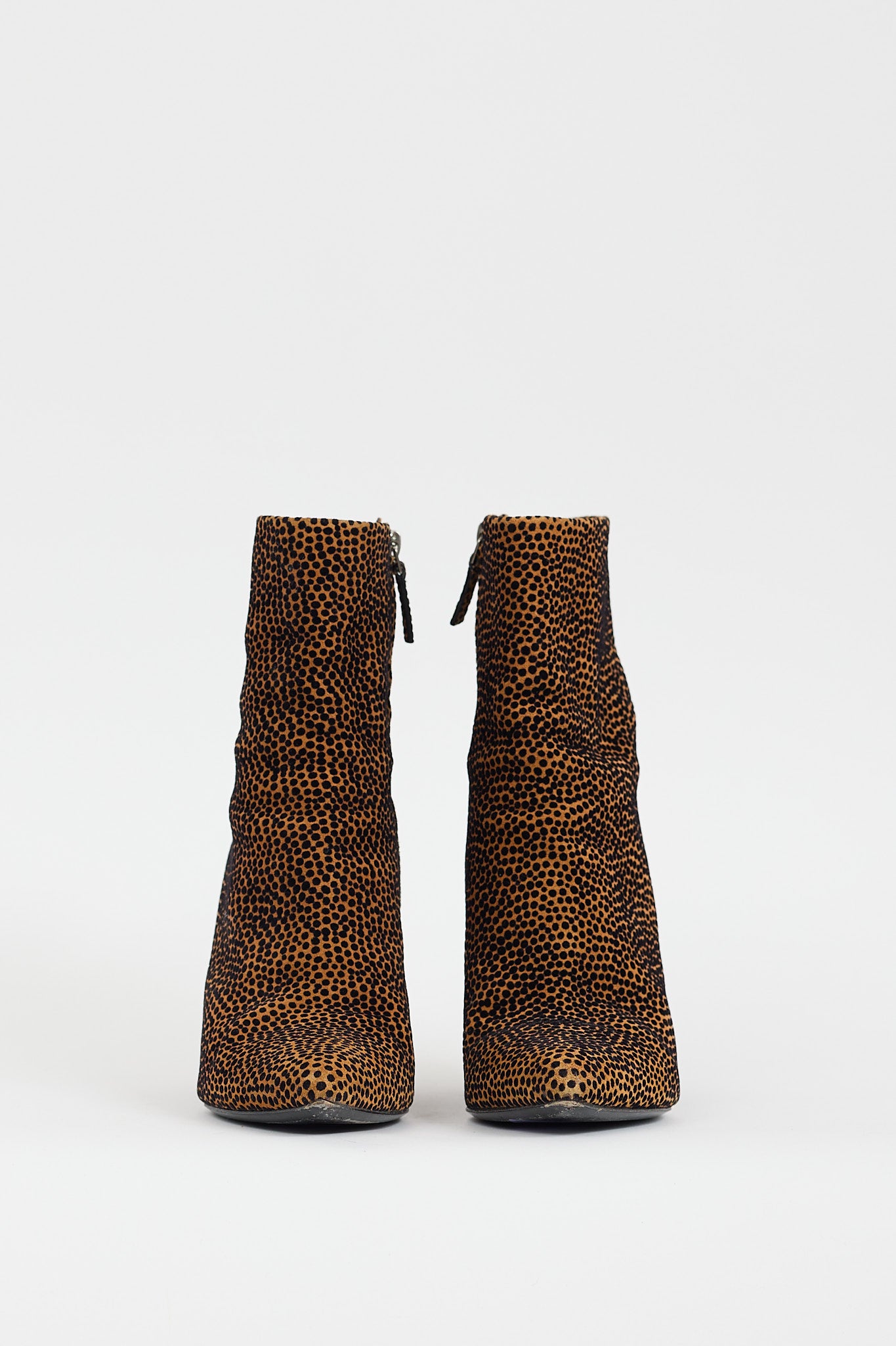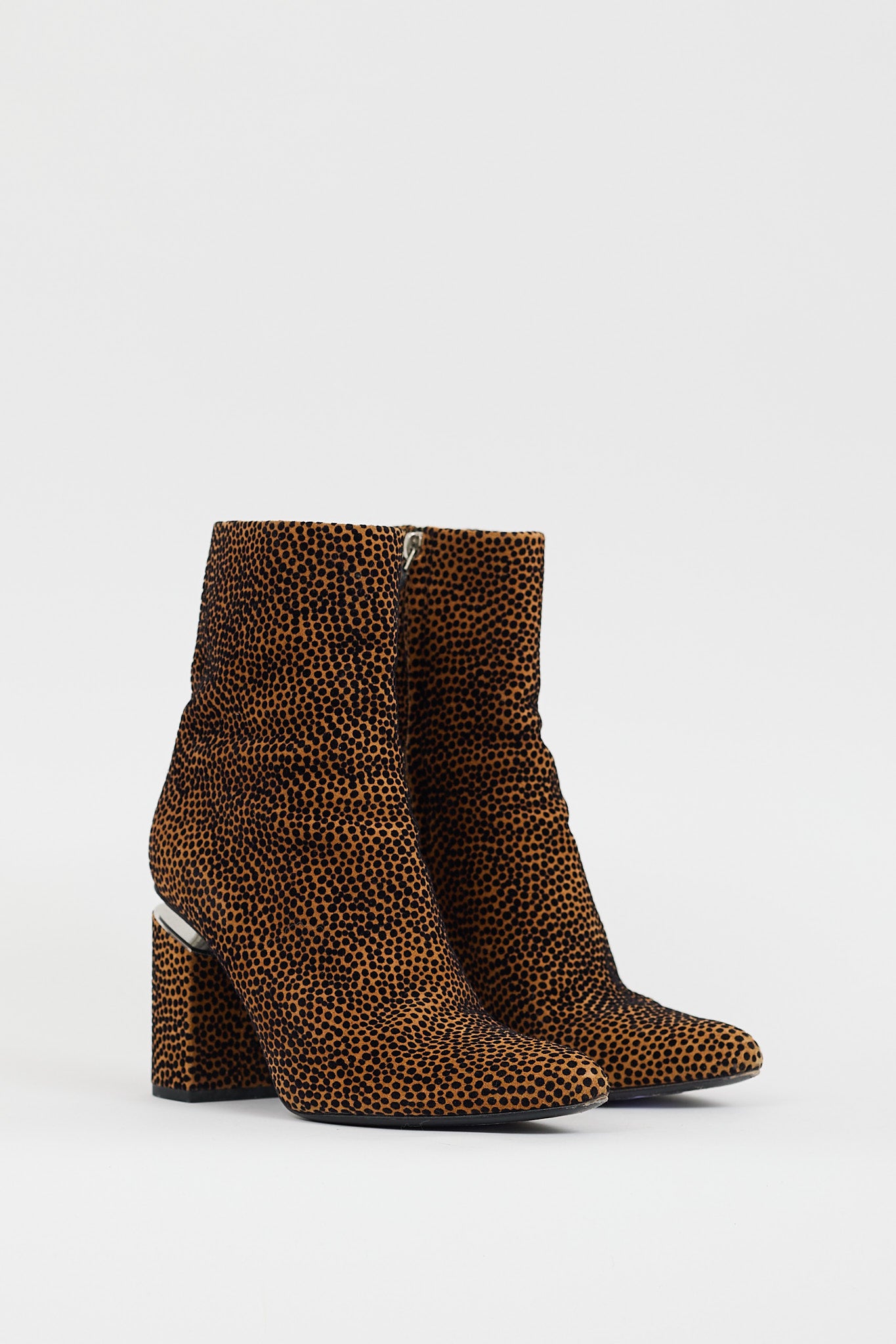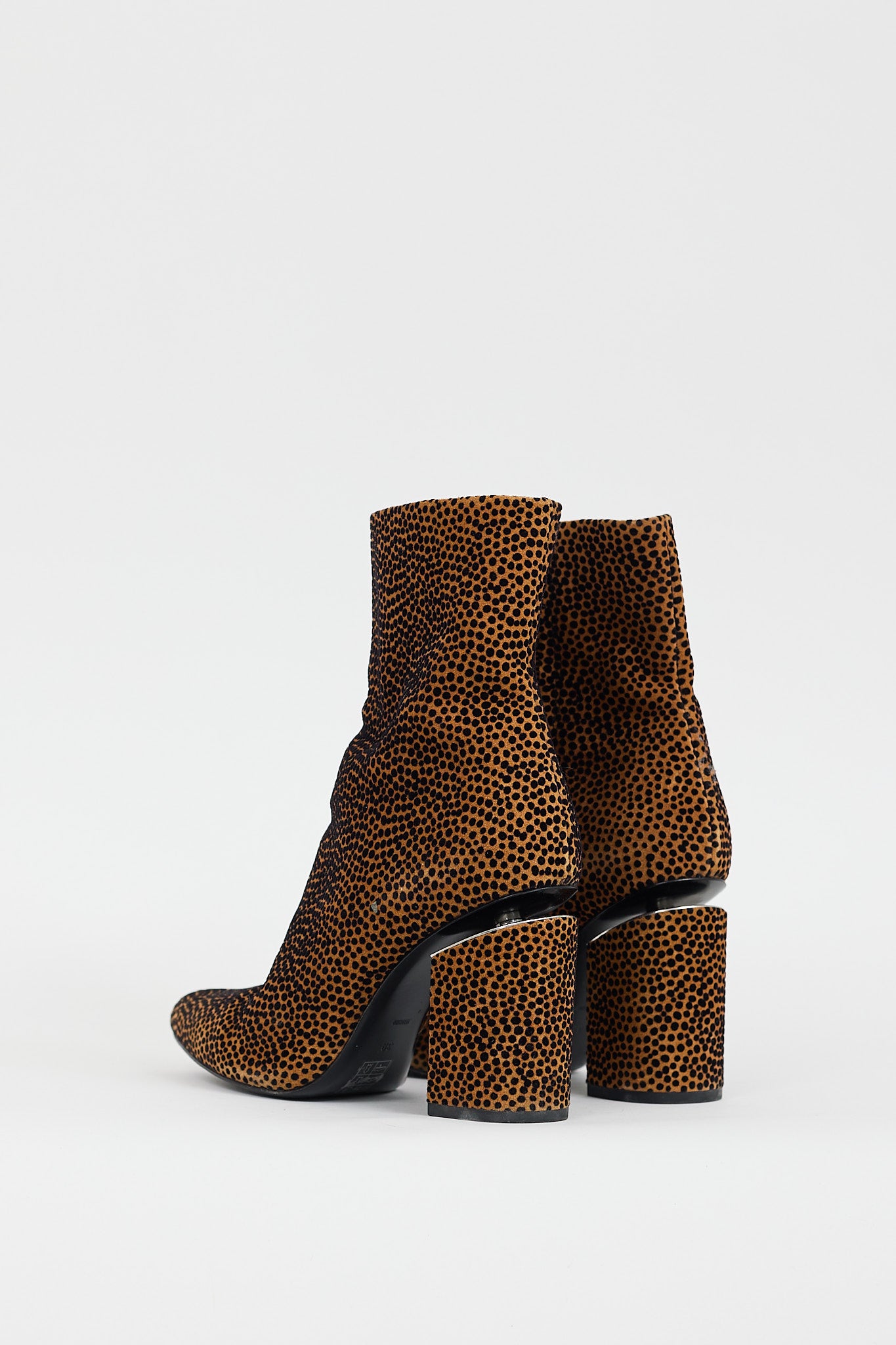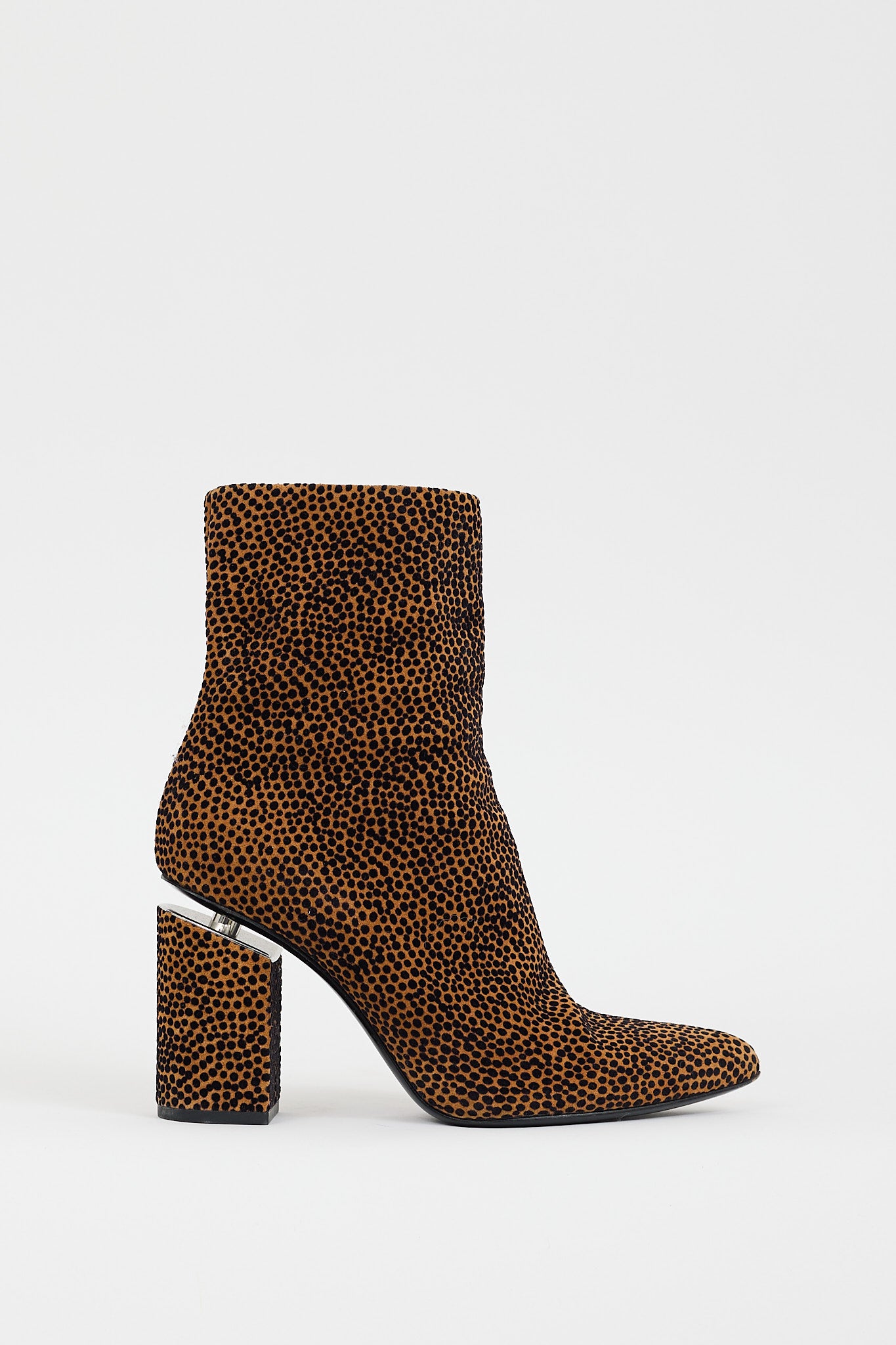 Pre-owned Alexander Wang brown and black dotted Kirby boot featuring a pointed toe, inner side zip, and separated covered block heel. Comes with original box.