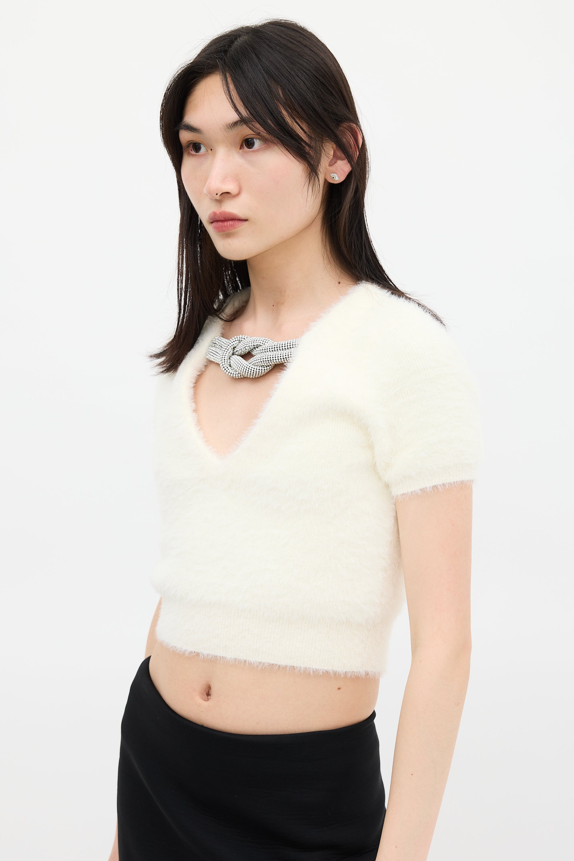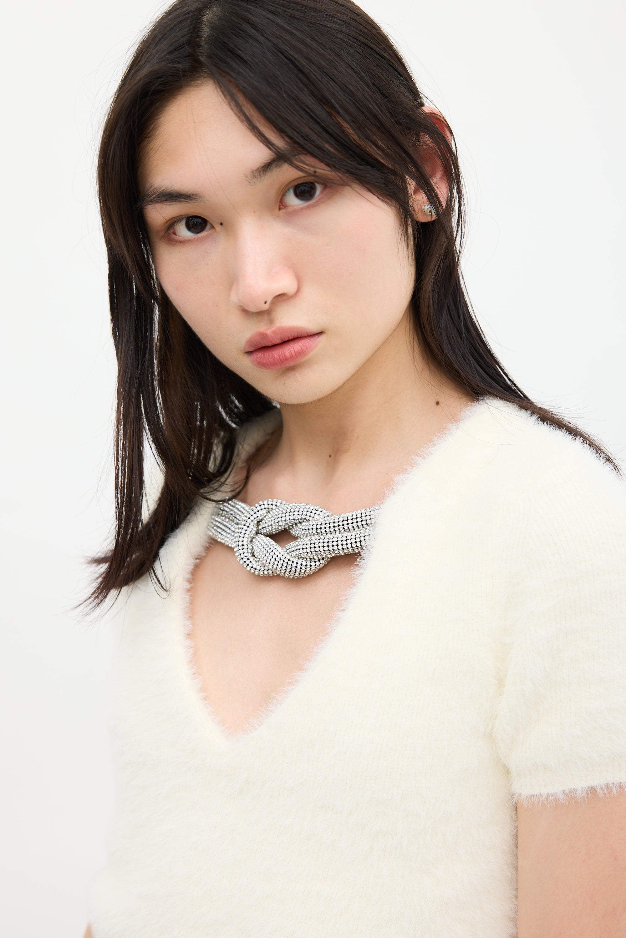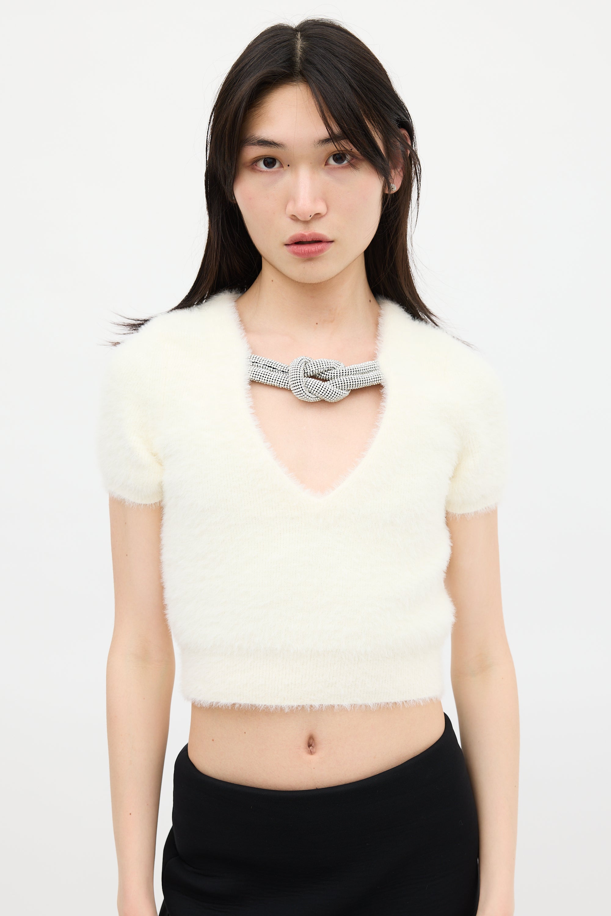 Pre-owned Alexander Wang cream sweater featuring a V-neckline, knotted jewel embellished hardware at front, short sleeves, and ribbed hem.