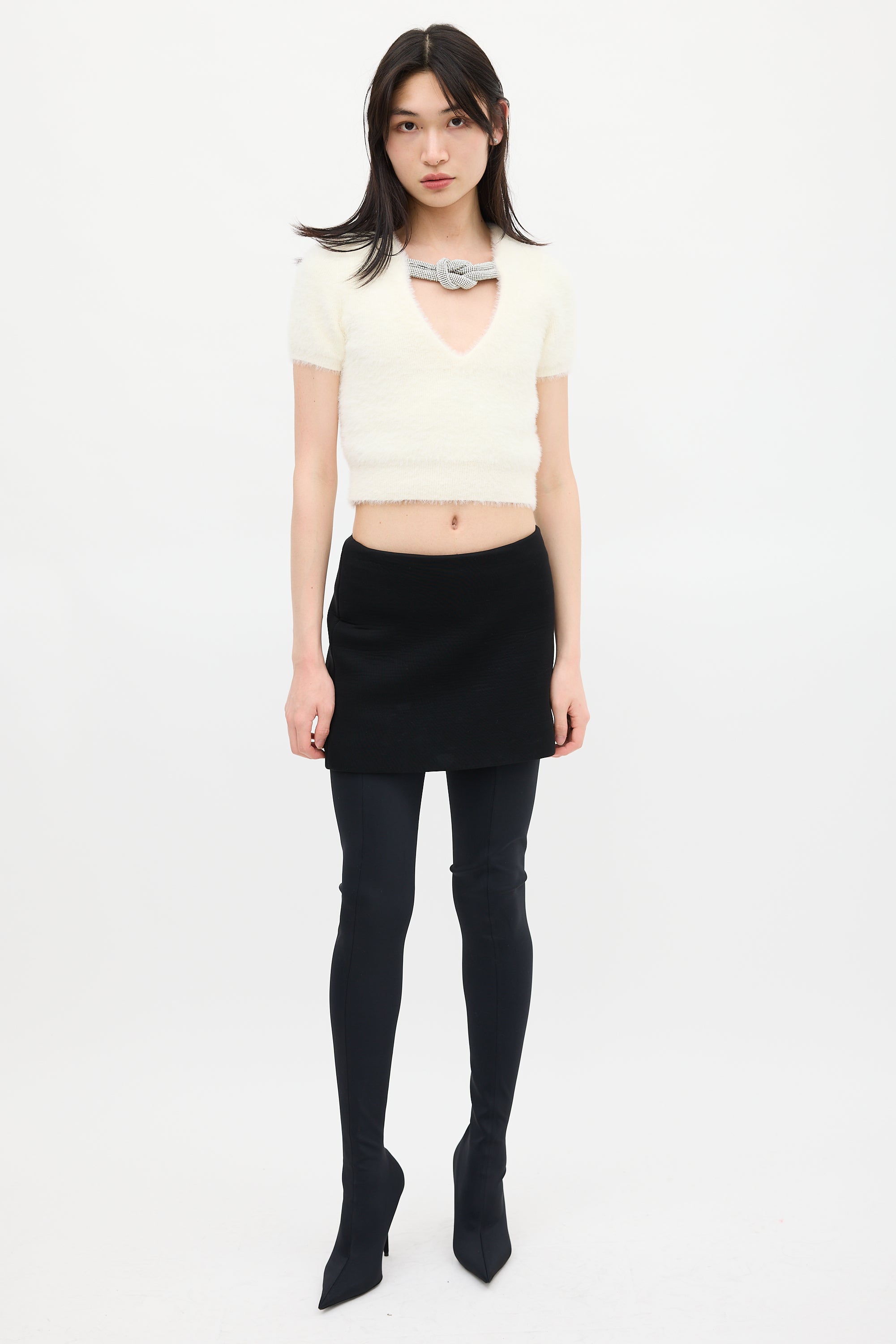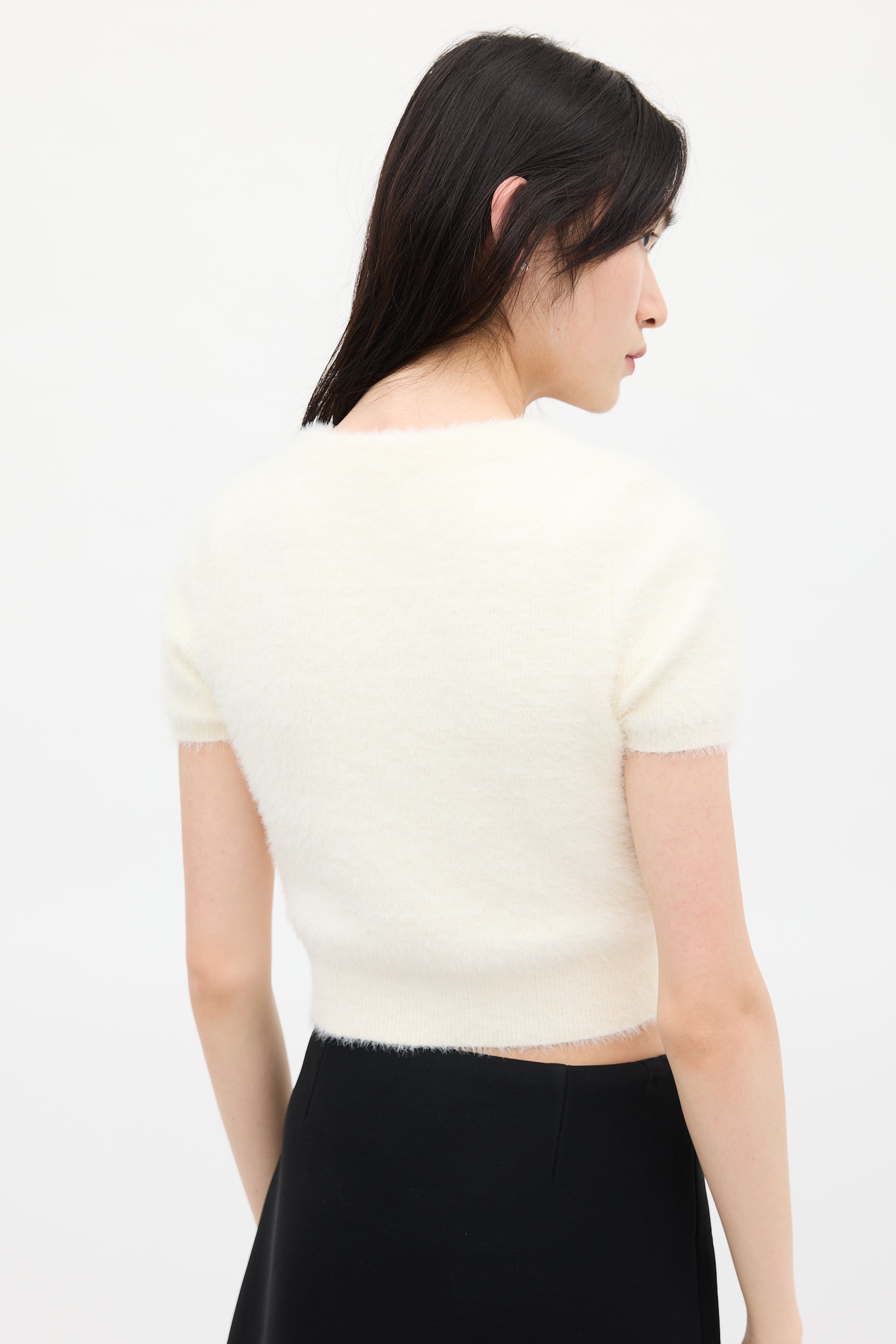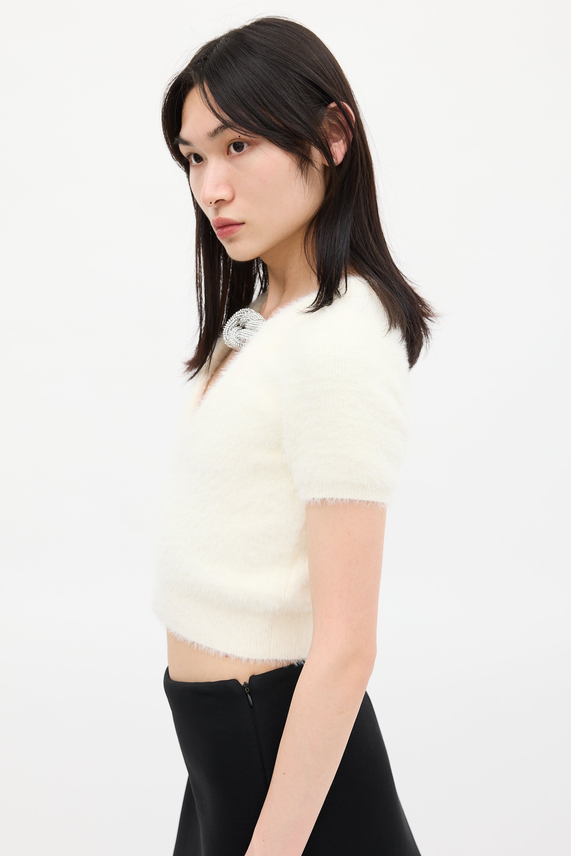 Pre-owned Alexander Wang cream sweater featuring a V-neckline, knotted jewel embellished hardware at front, short sleeves, and ribbed hem.