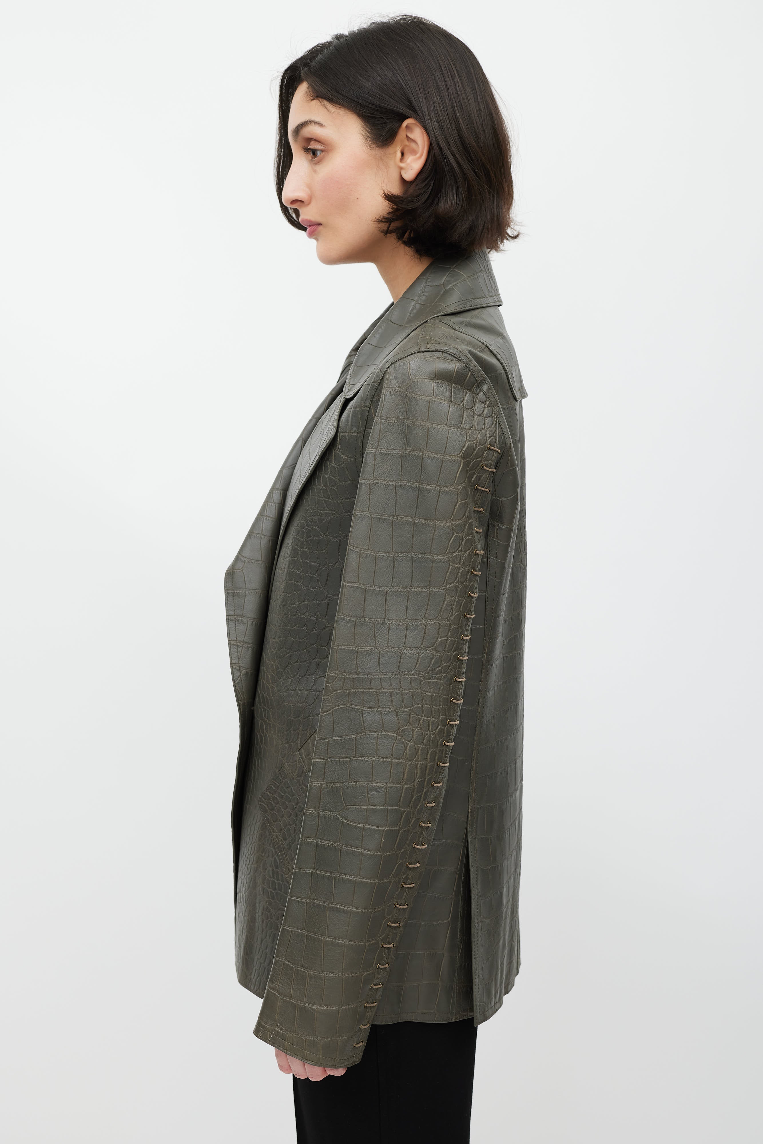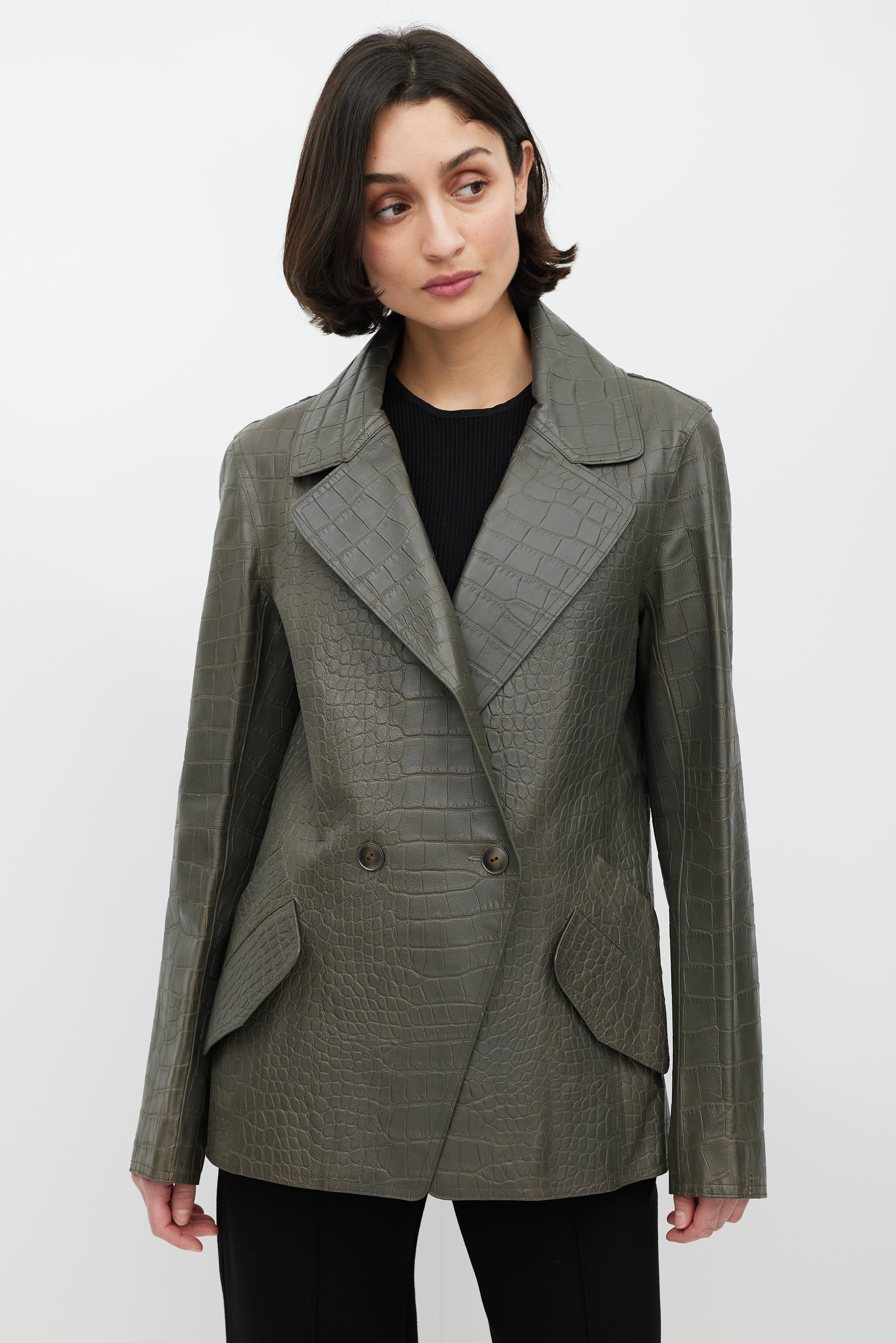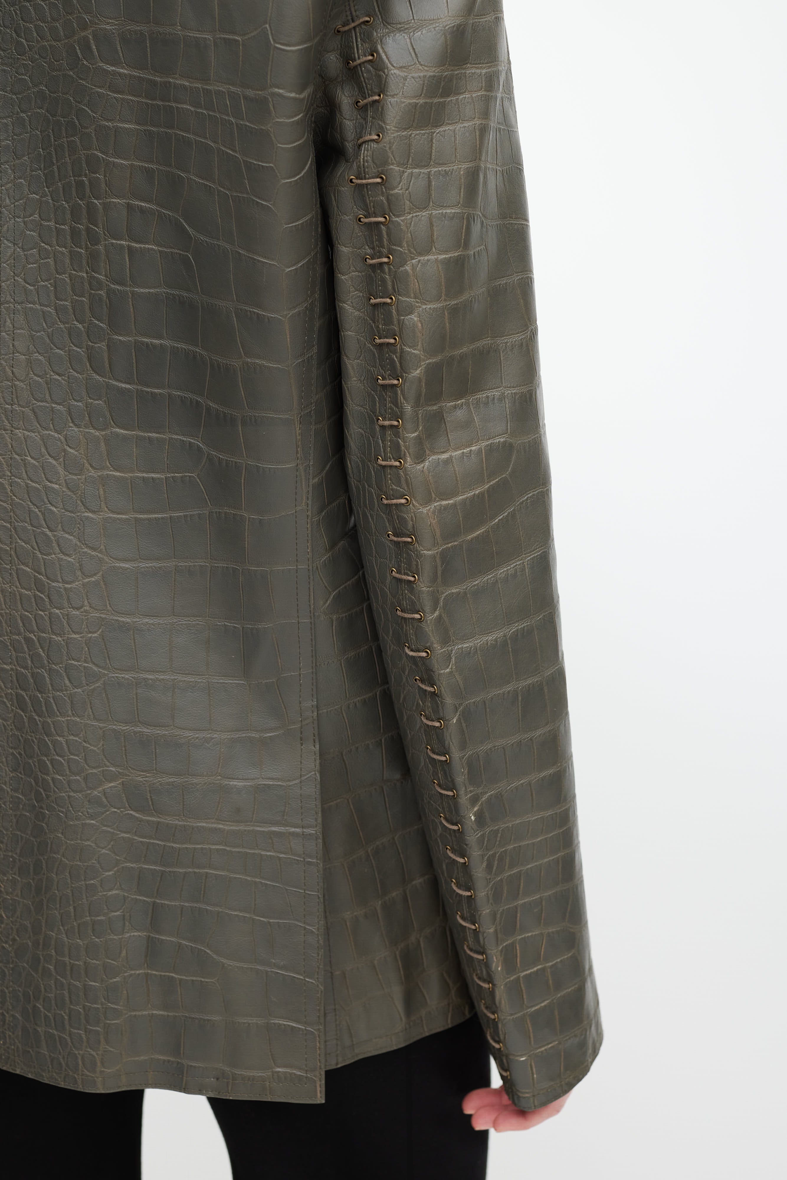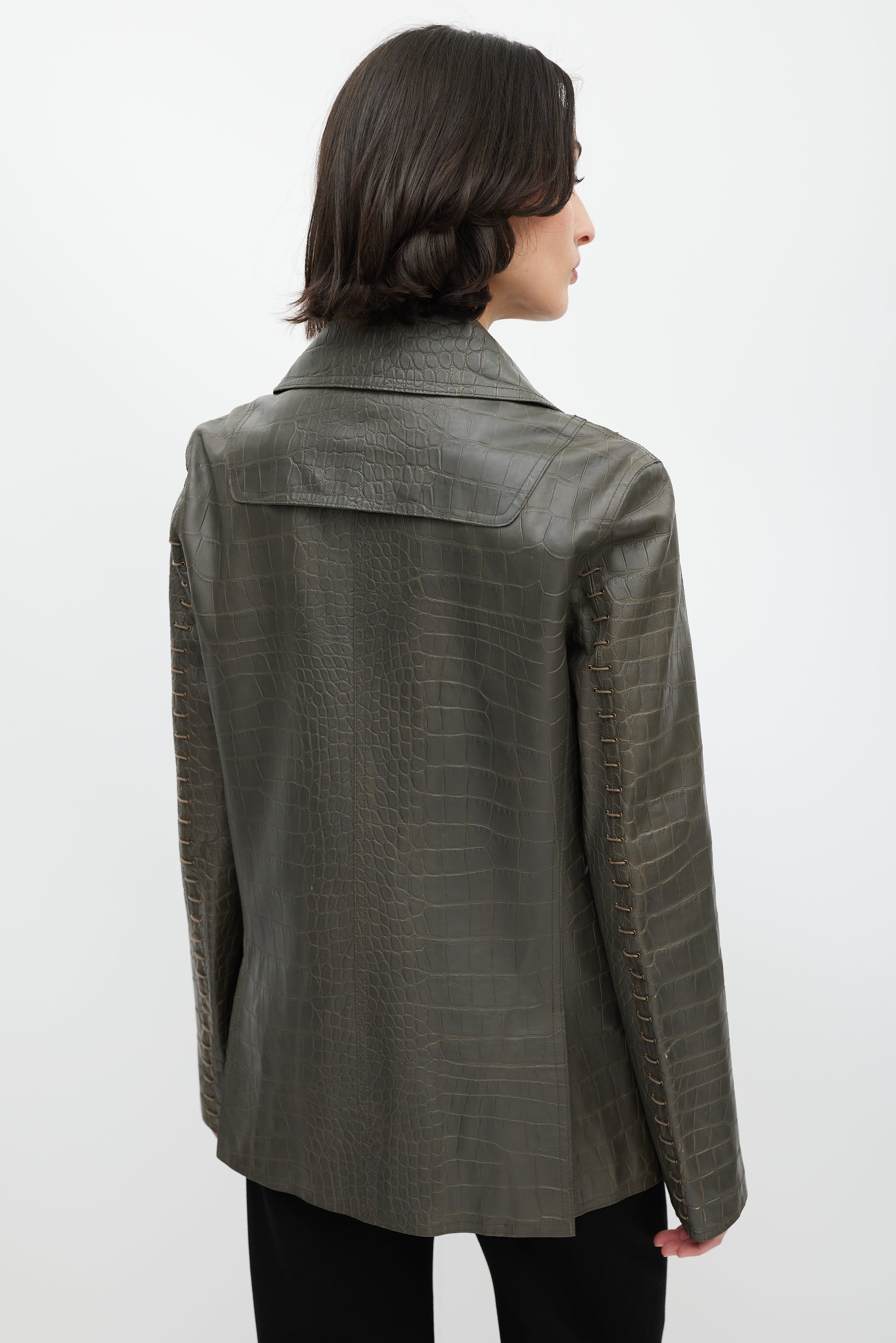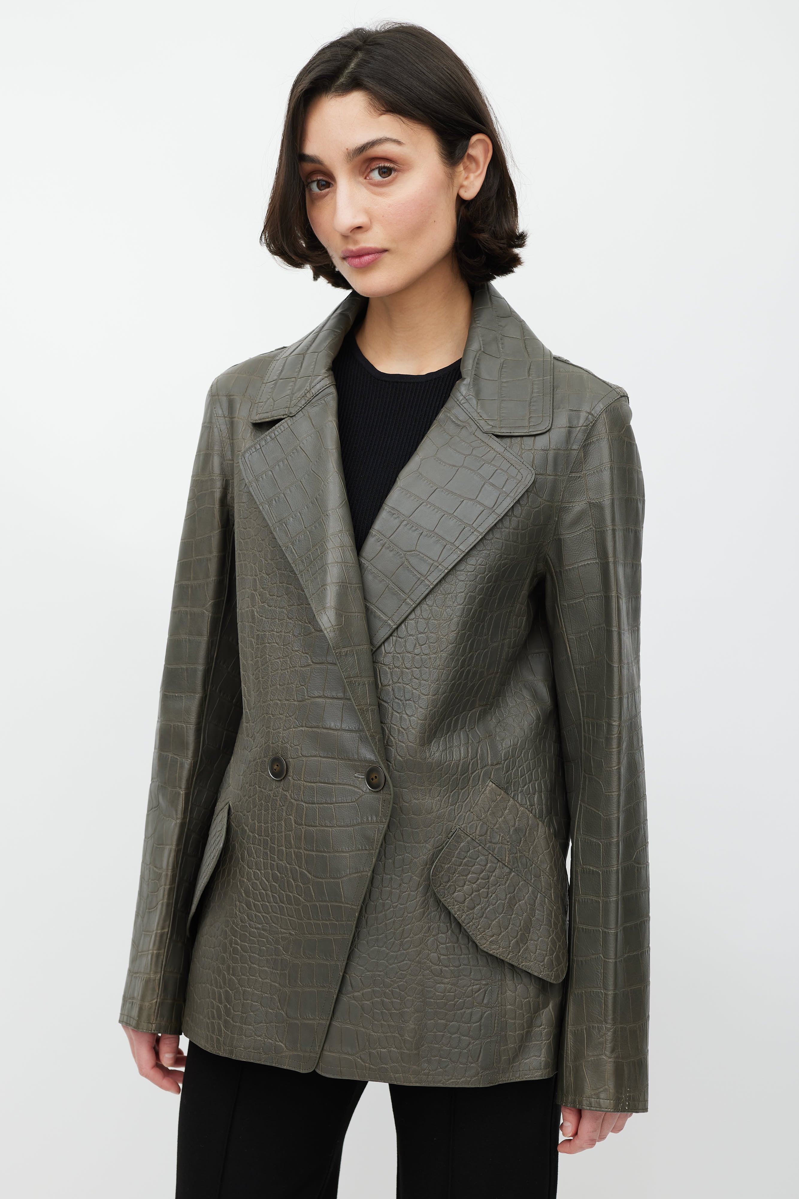 Pre-owned Alexander Wang grey leather blazer featuring croc embossed detail all over, notch lapels, double breasted closure with brass buttons, pockets at waist, lace up detail on sleeve, leather patch on back, and zipped double vent at back.