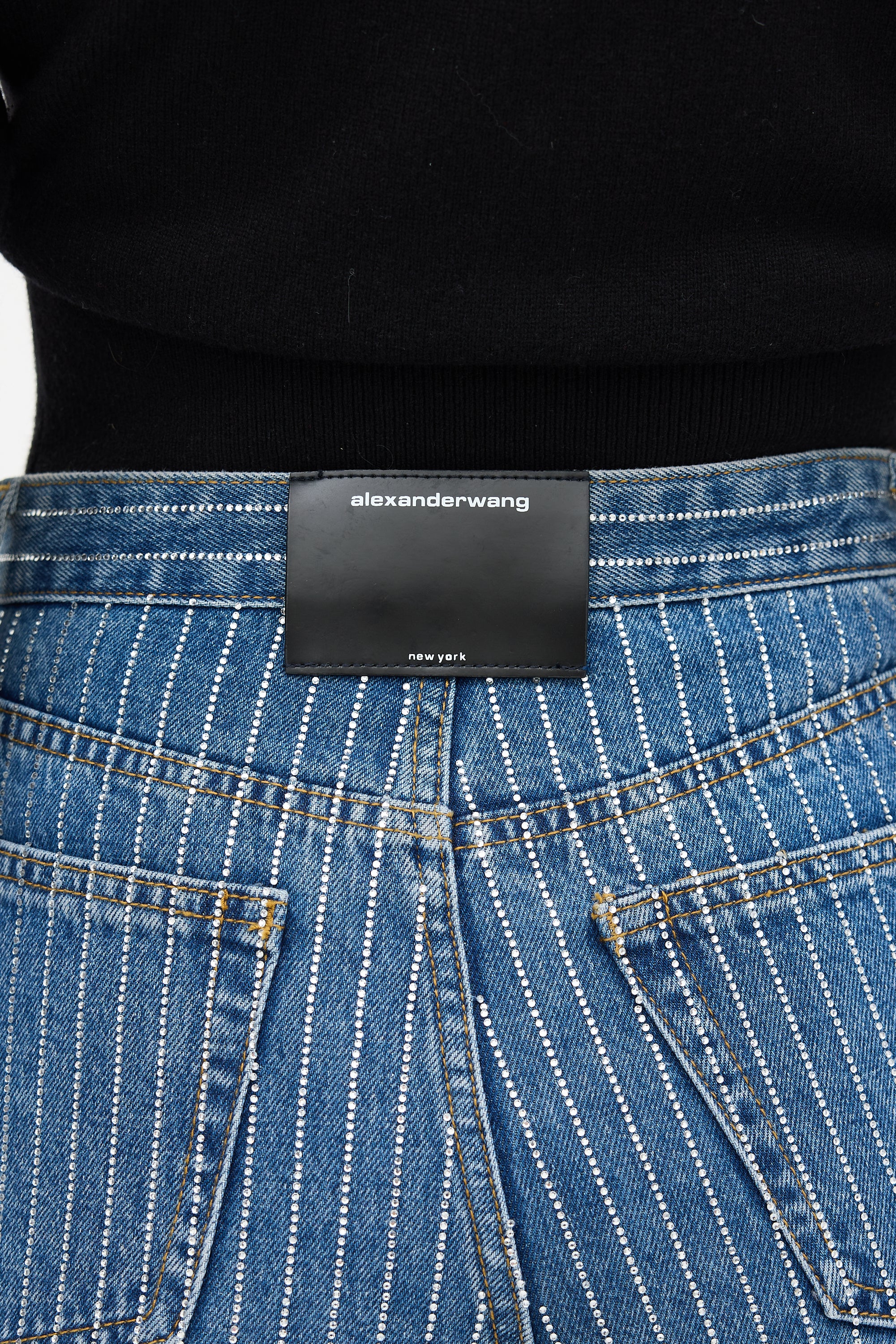 Pre-owned Alexander Wang medium wash denim mini shorts featuring a high waist, four pocket styling, side slits, black leather Jacron patch at centre back waist, rhinestone embellishment throughout, and zip fly.