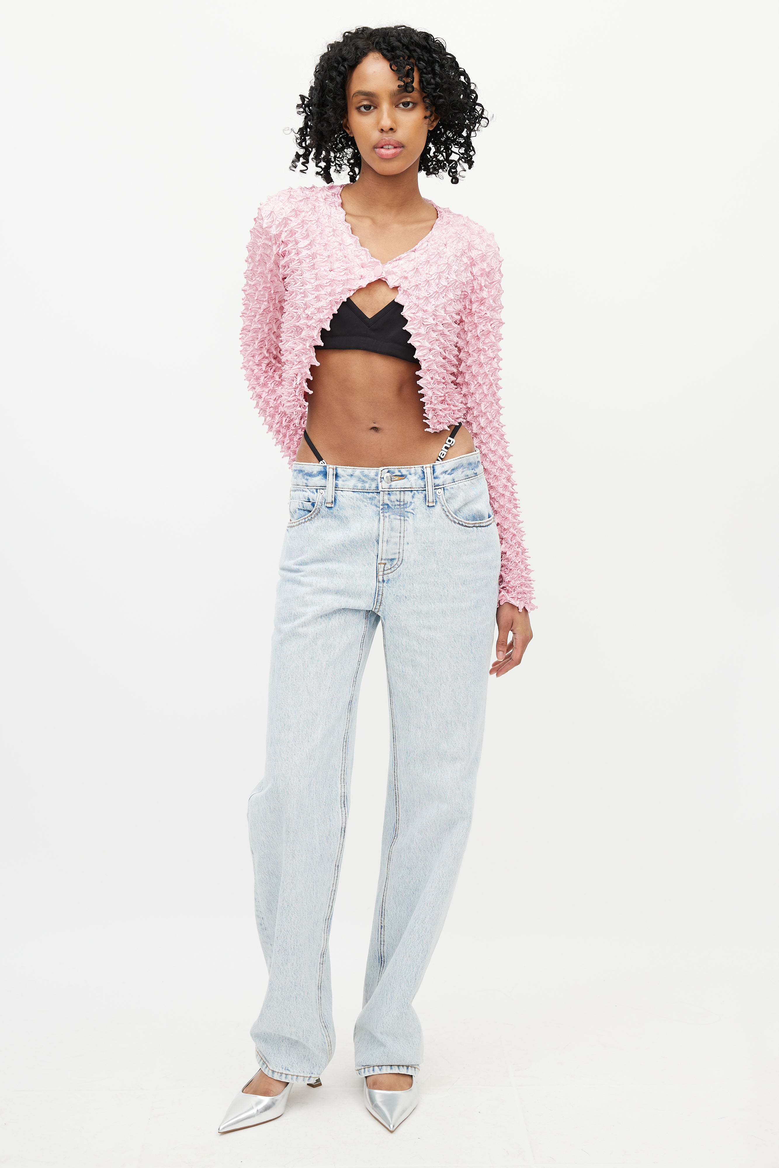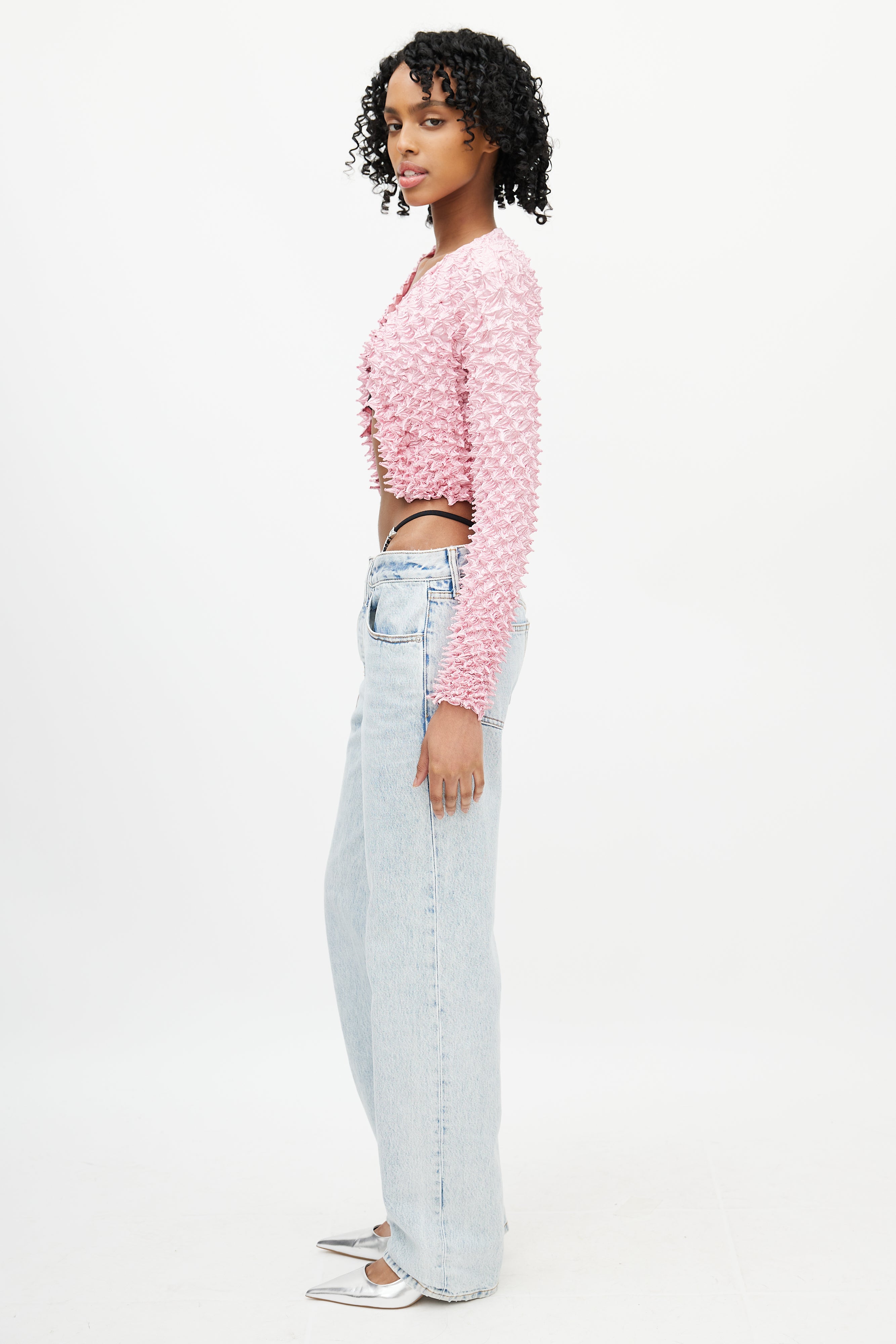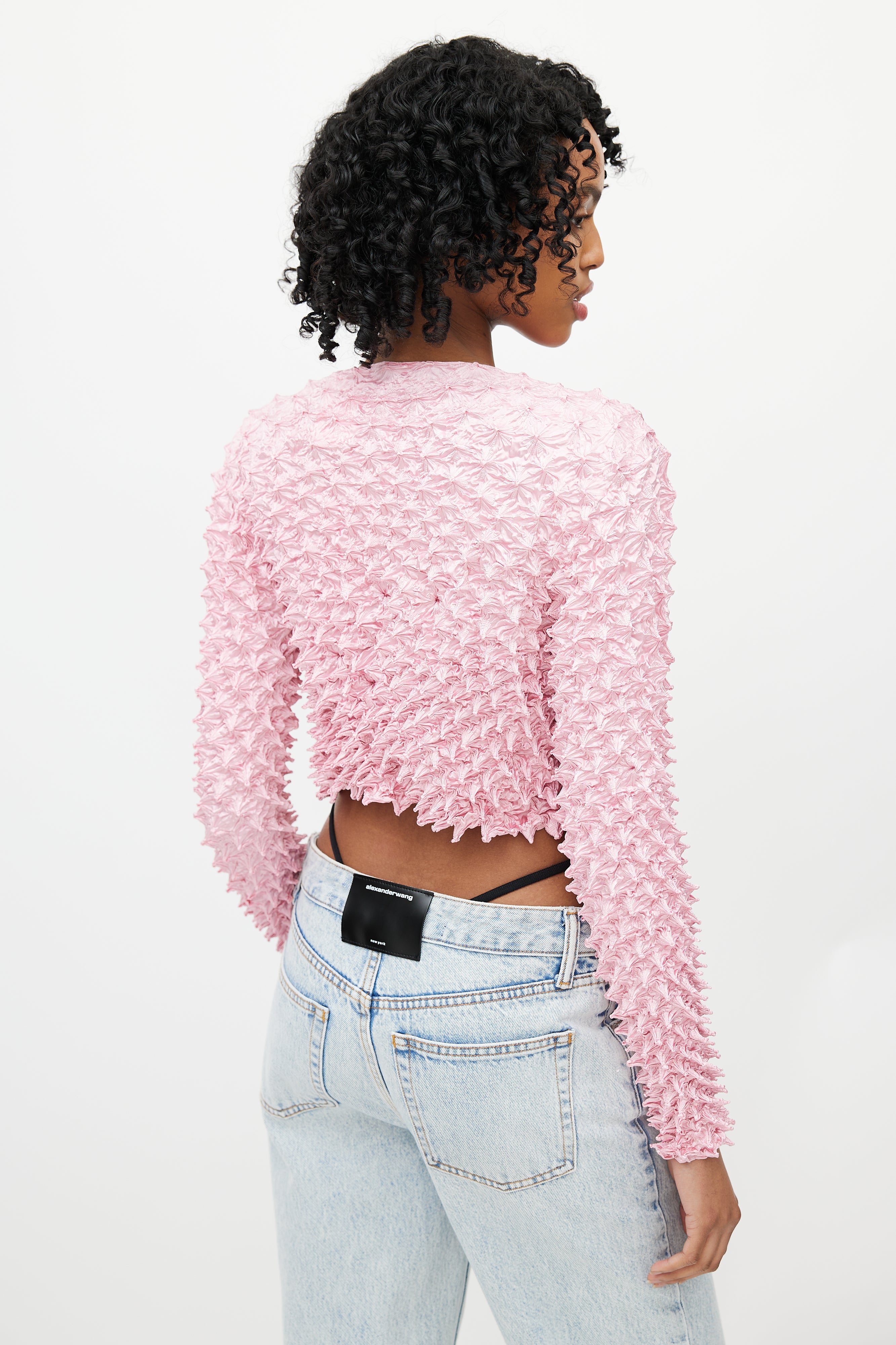 Pre-owned Alexander Wang pink cardigan featuring garment pleating, V-neckline, cropped fit, long sleeves, and button closure.