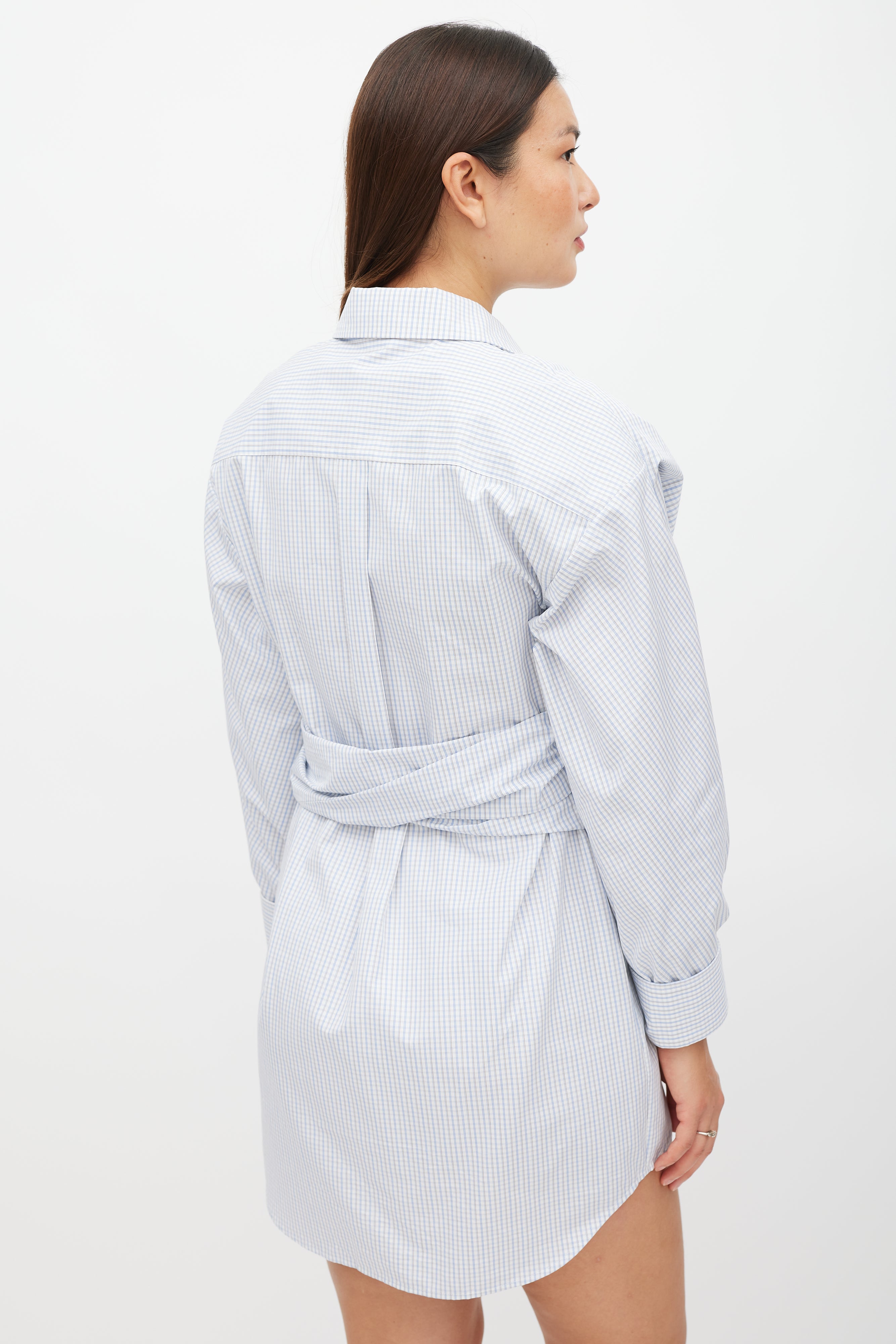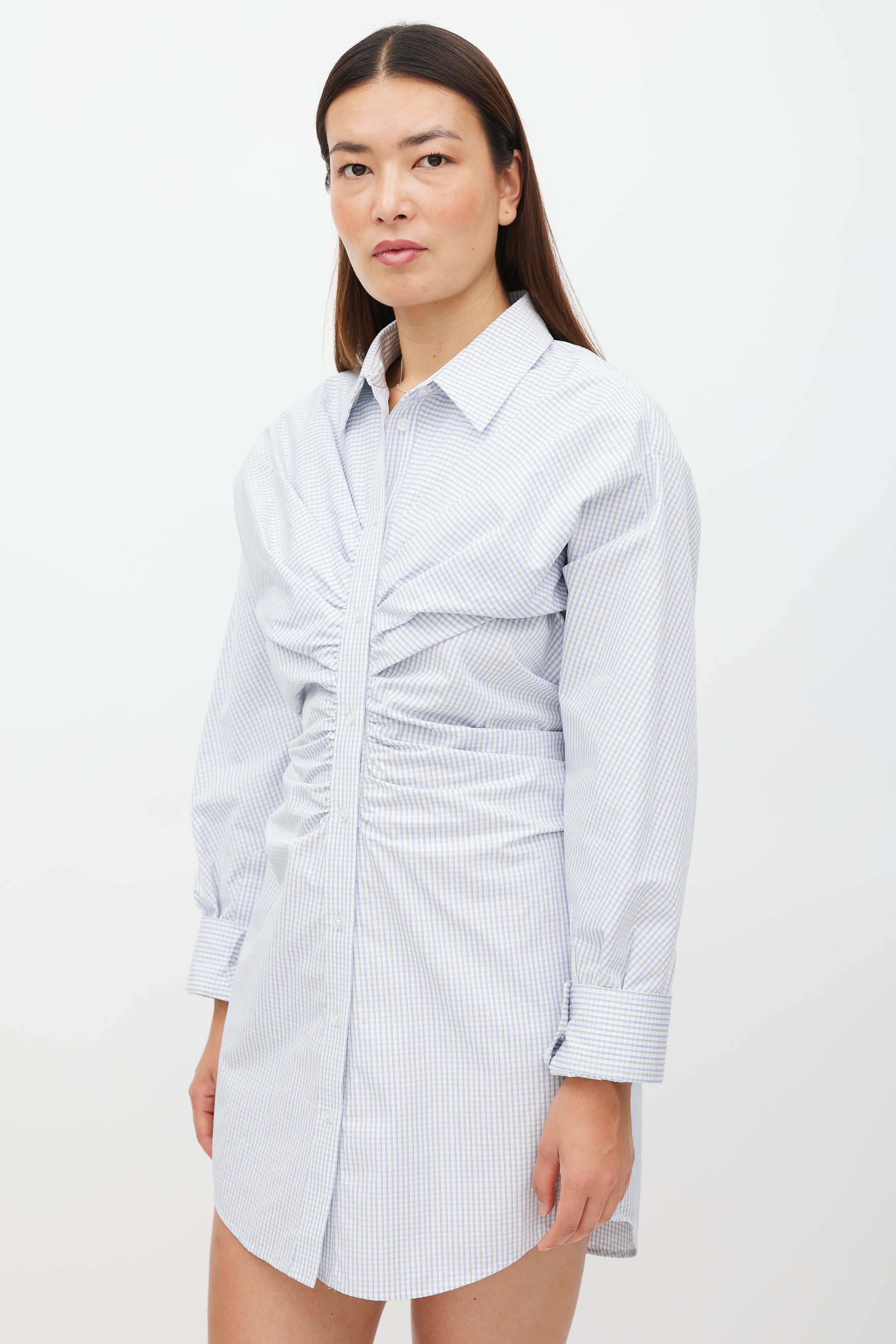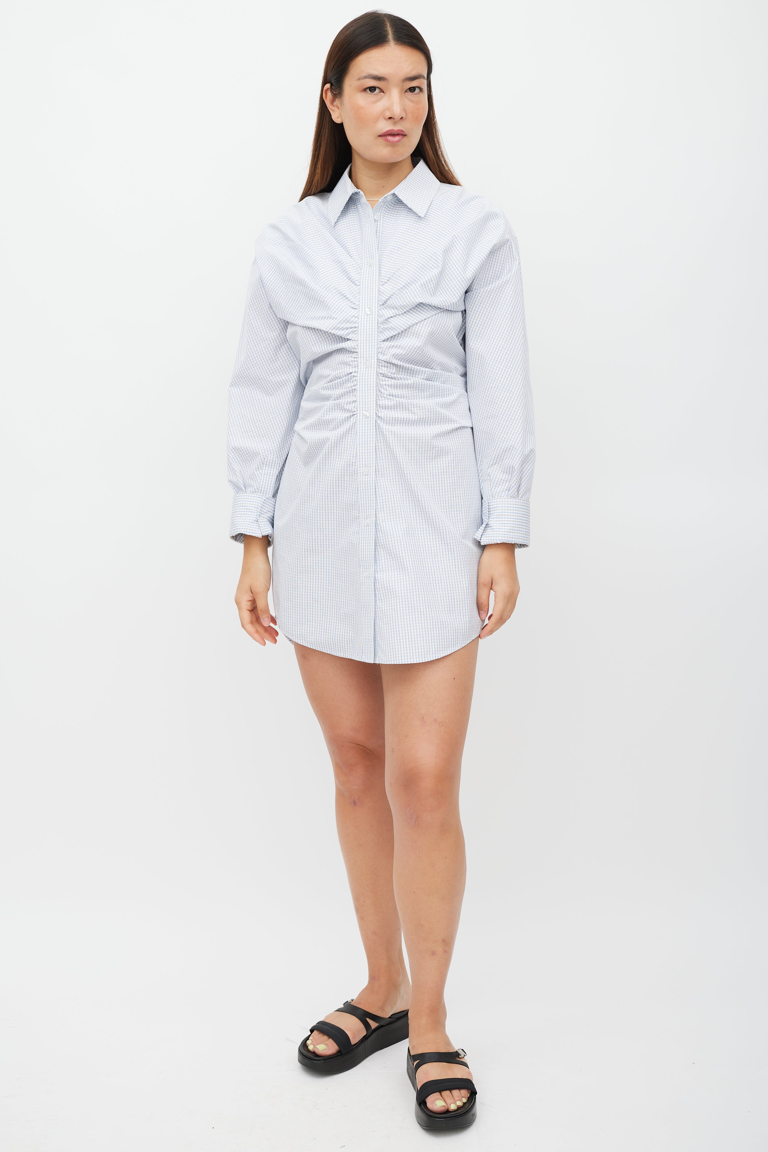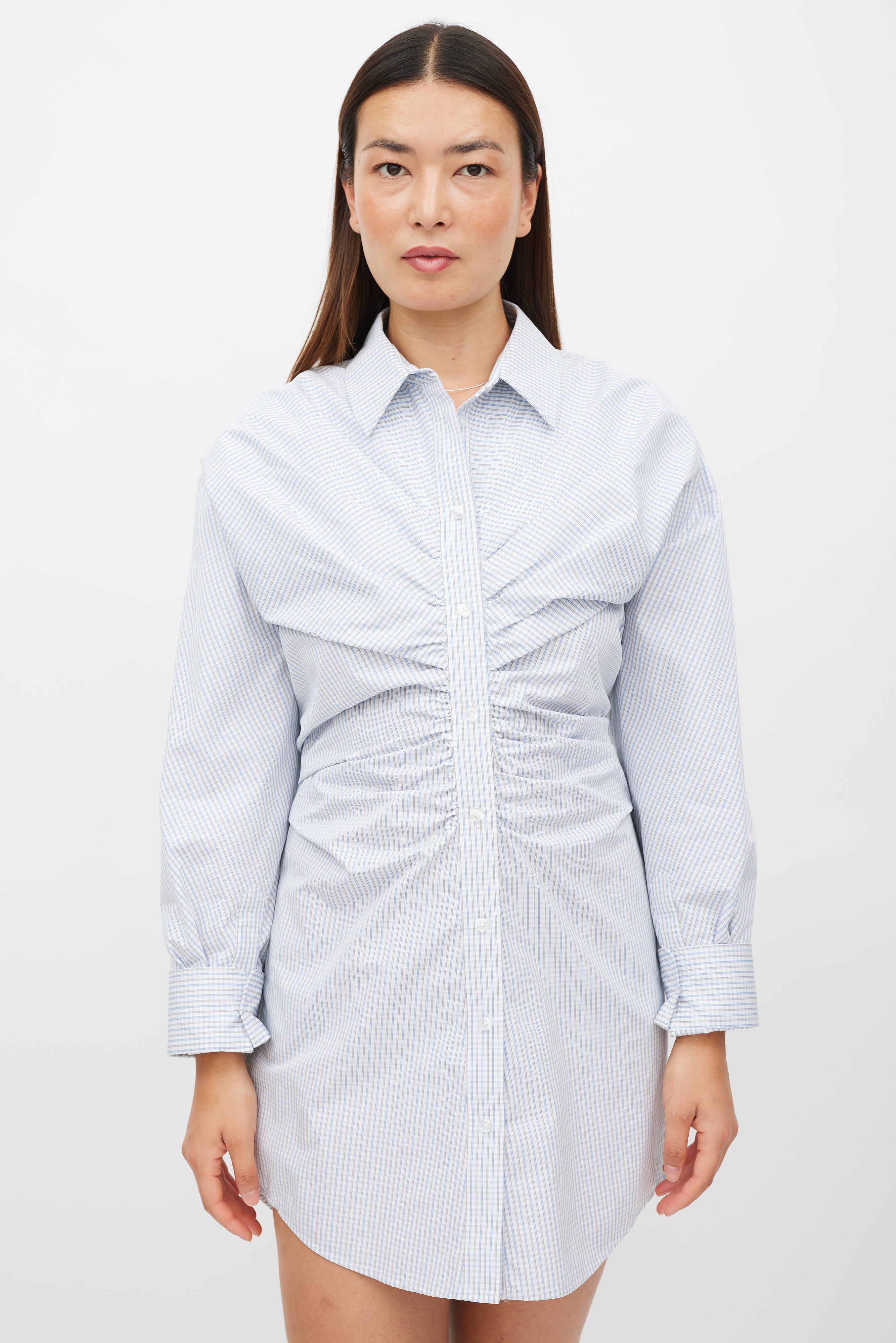Pre-owned Alexander Wang white shirt dress featuring a blue plaid pattern throughout, pointed collar, long sleeves with buttoned cuffs, gathered front, belt detail at back, and button up closure.
