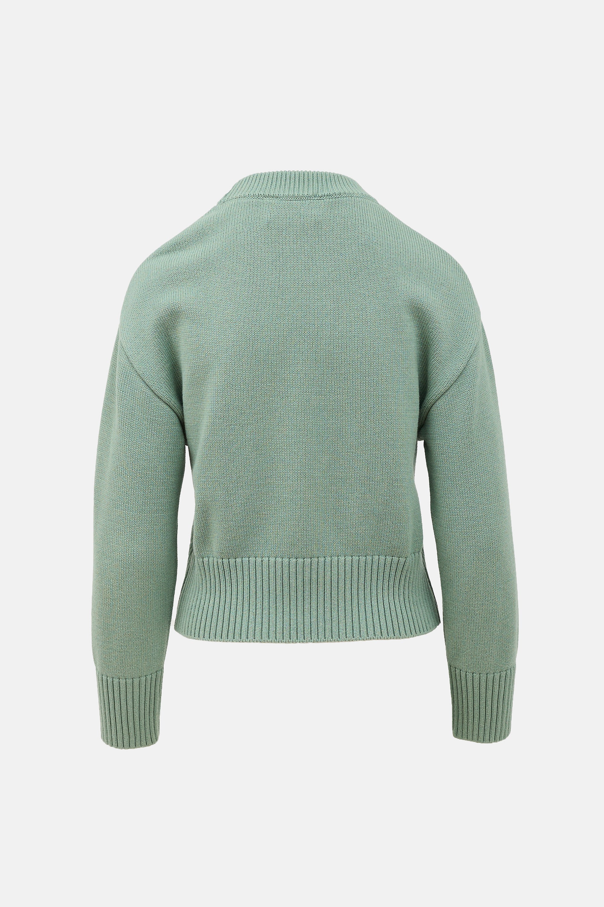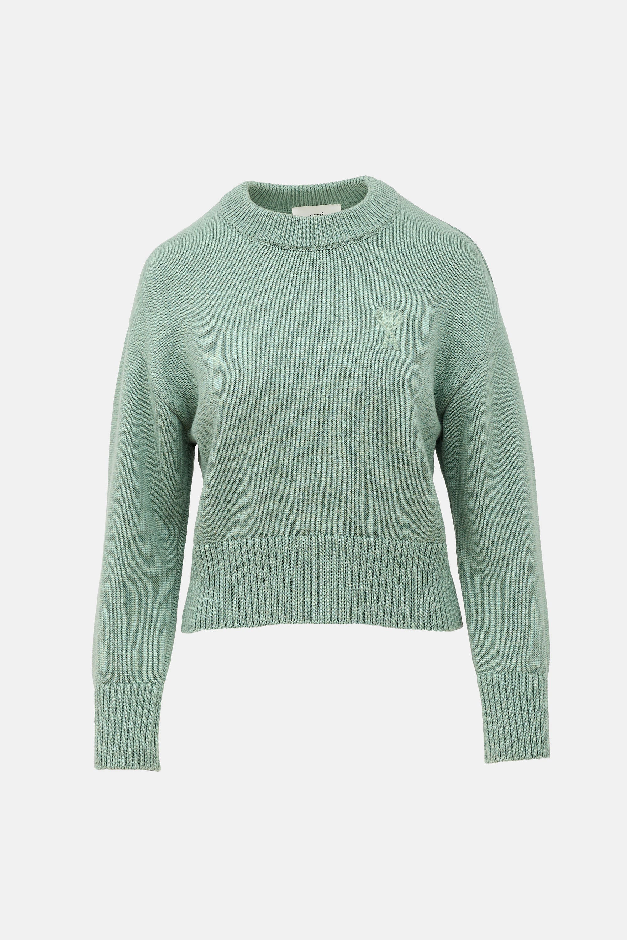 Pre-owned AMI Paris light green wool blend sweater featuring crew neck, tonal embroidered Ami De Coeur logo at left chest, and ribbed collar, hem, and cuffs.