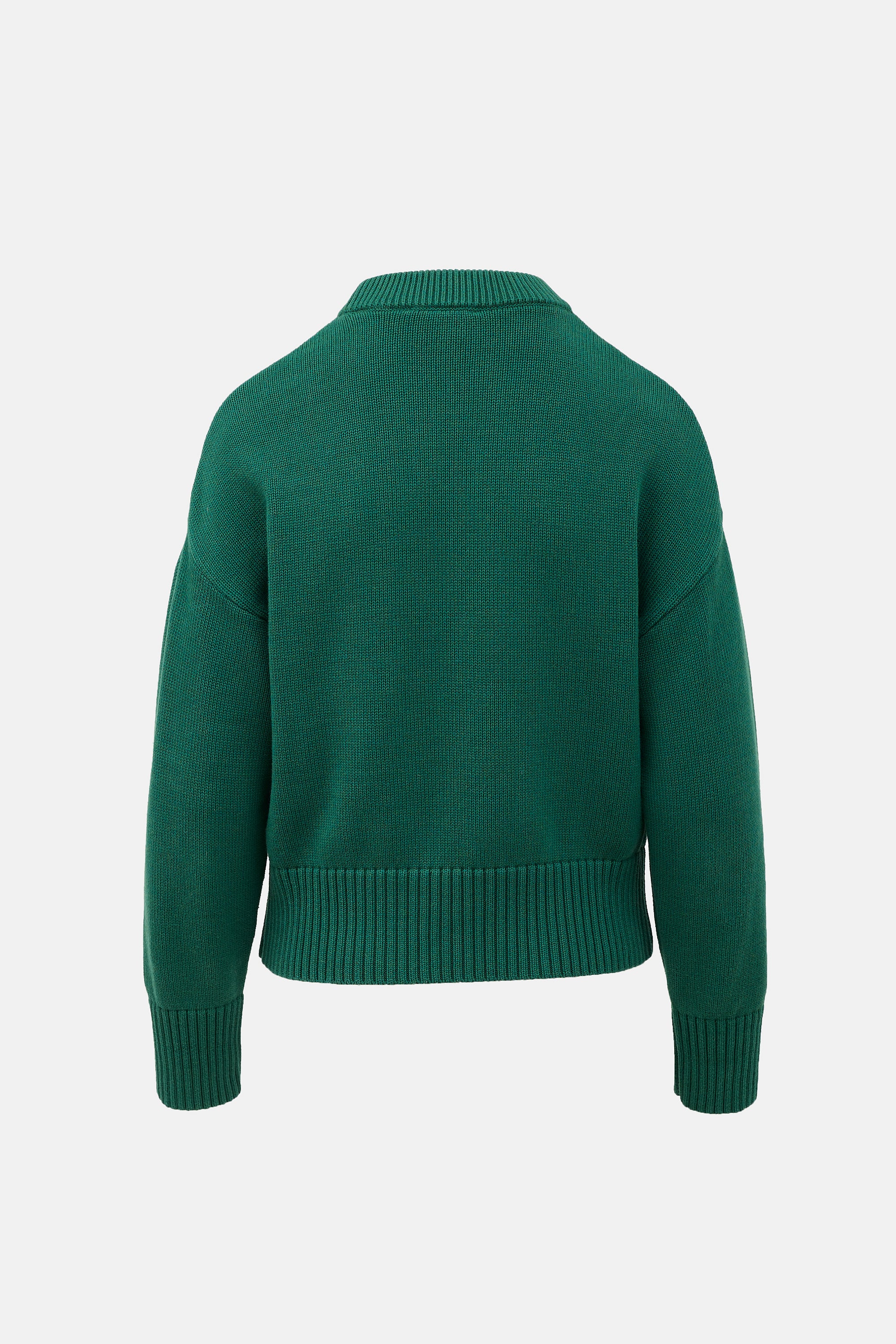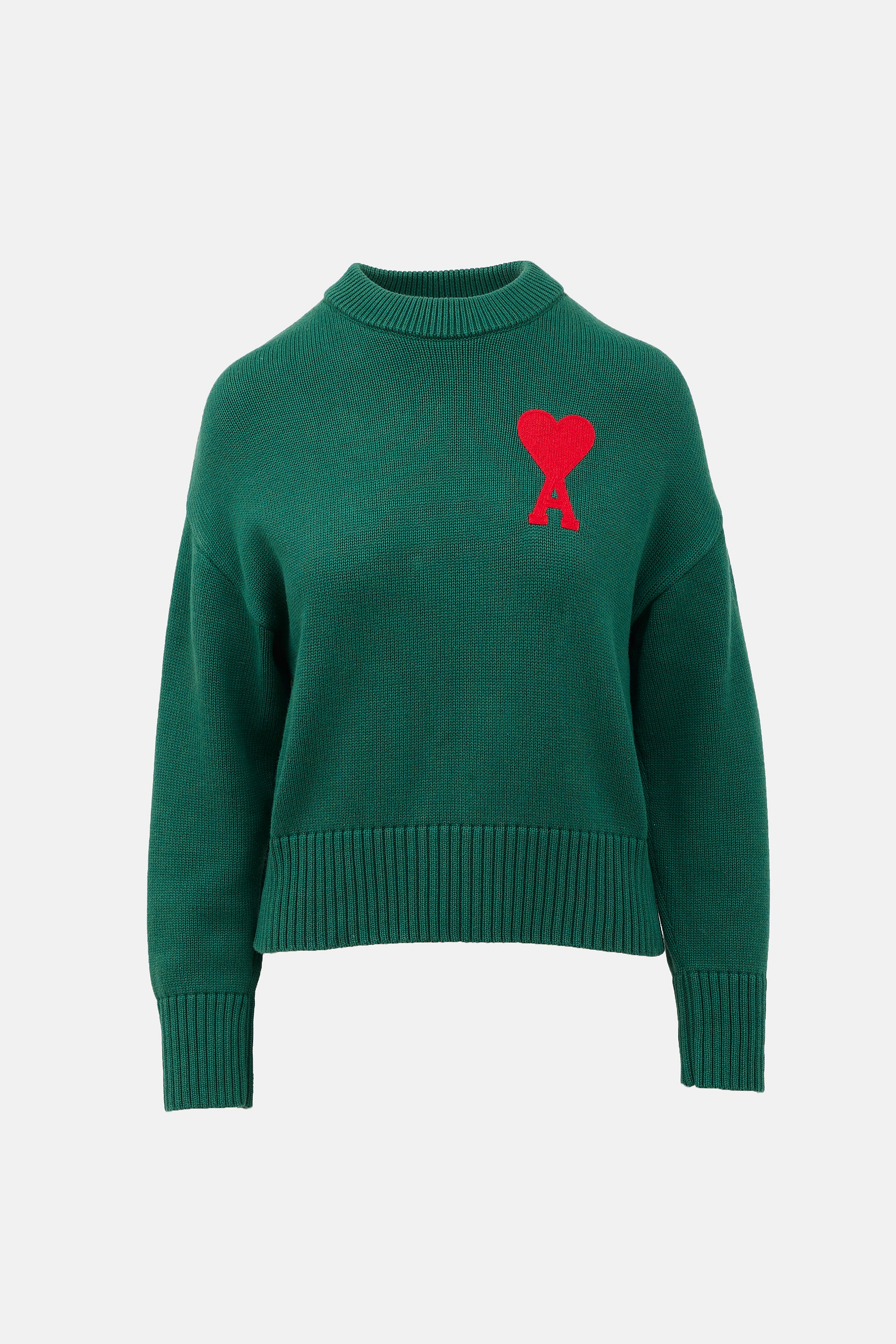 Pre-owned AMI Paris green wool blend sweater featuring crew neck, red embroidered Ami De Coeur logo at left chest, and ribbed collar, hem, and cuffs.