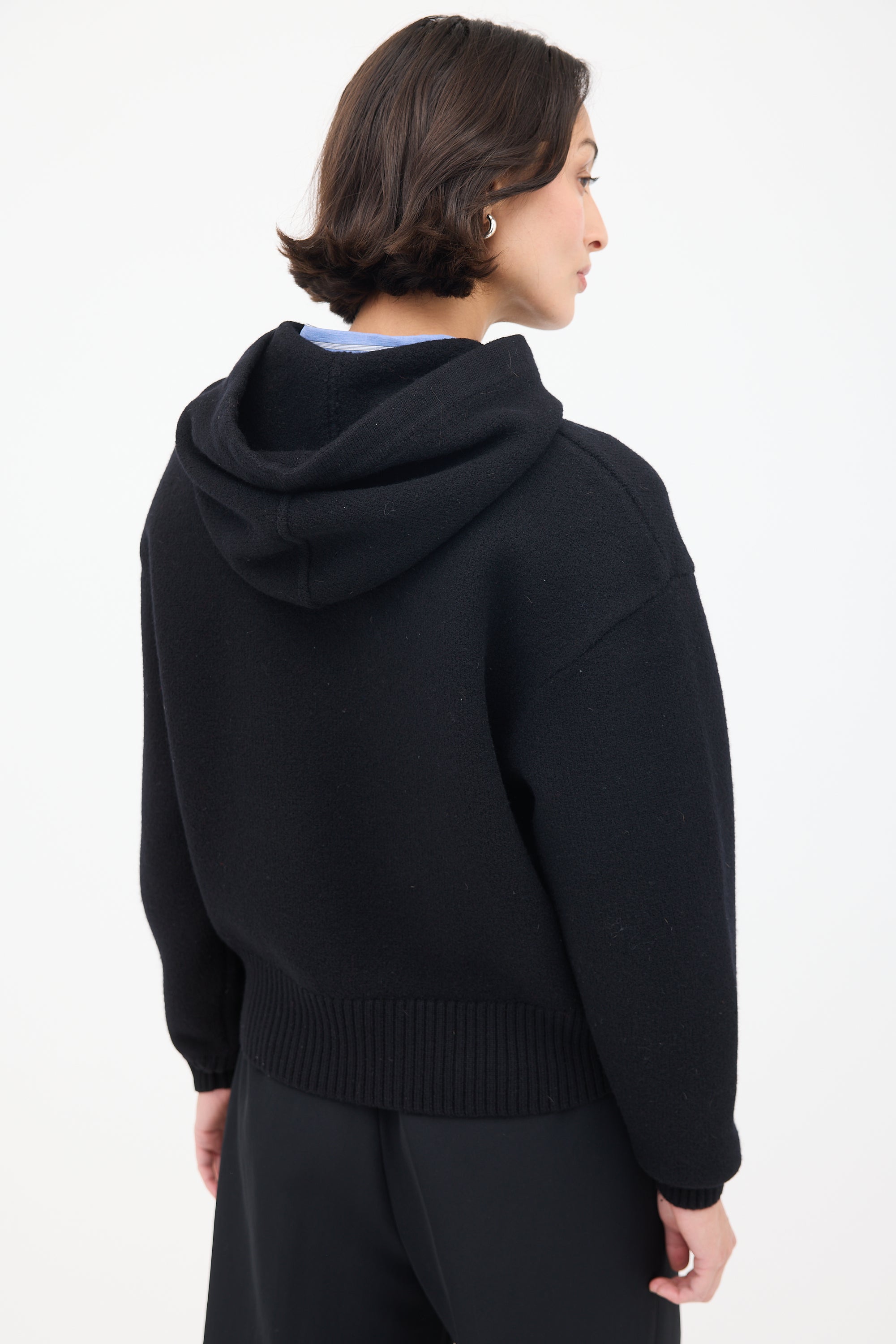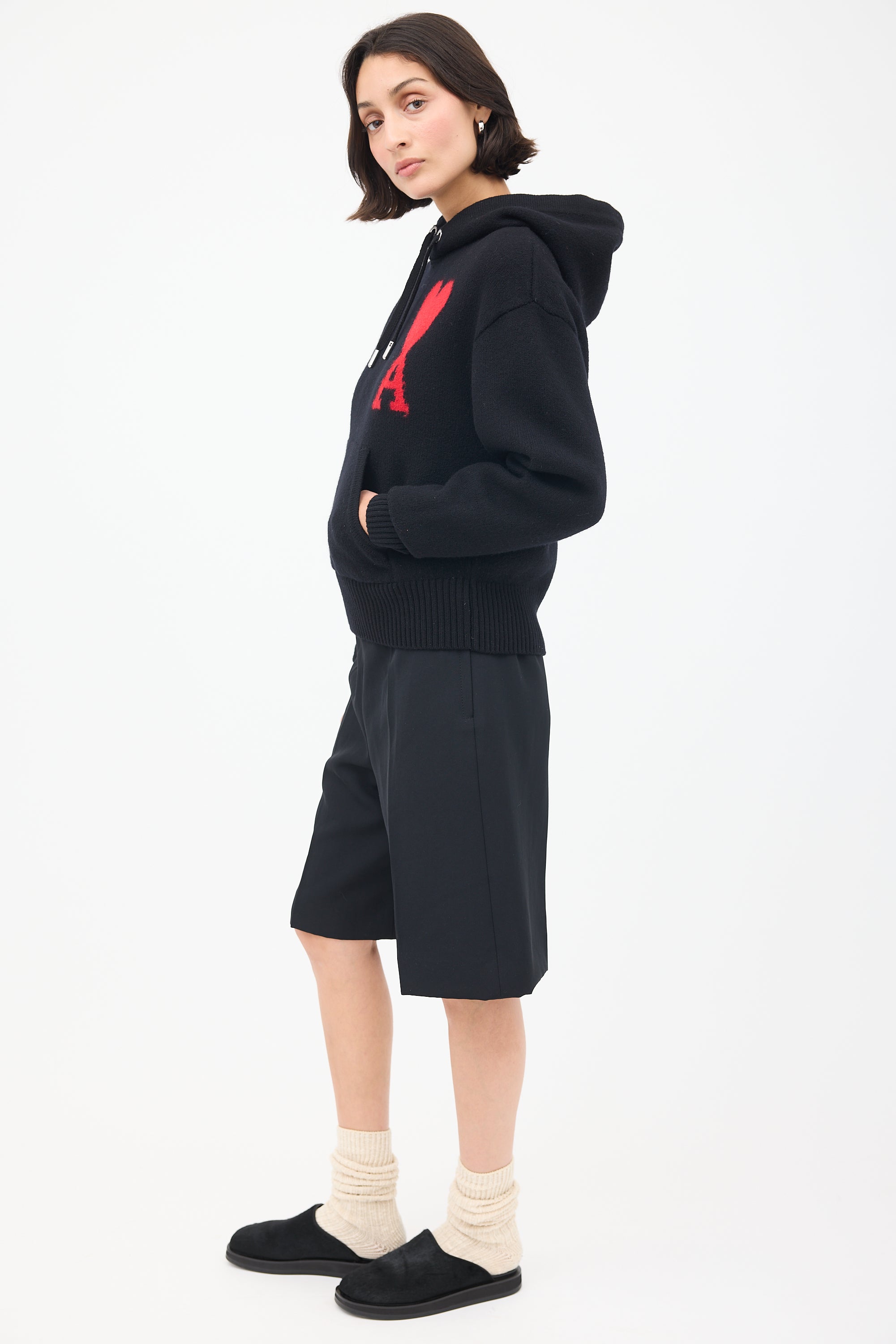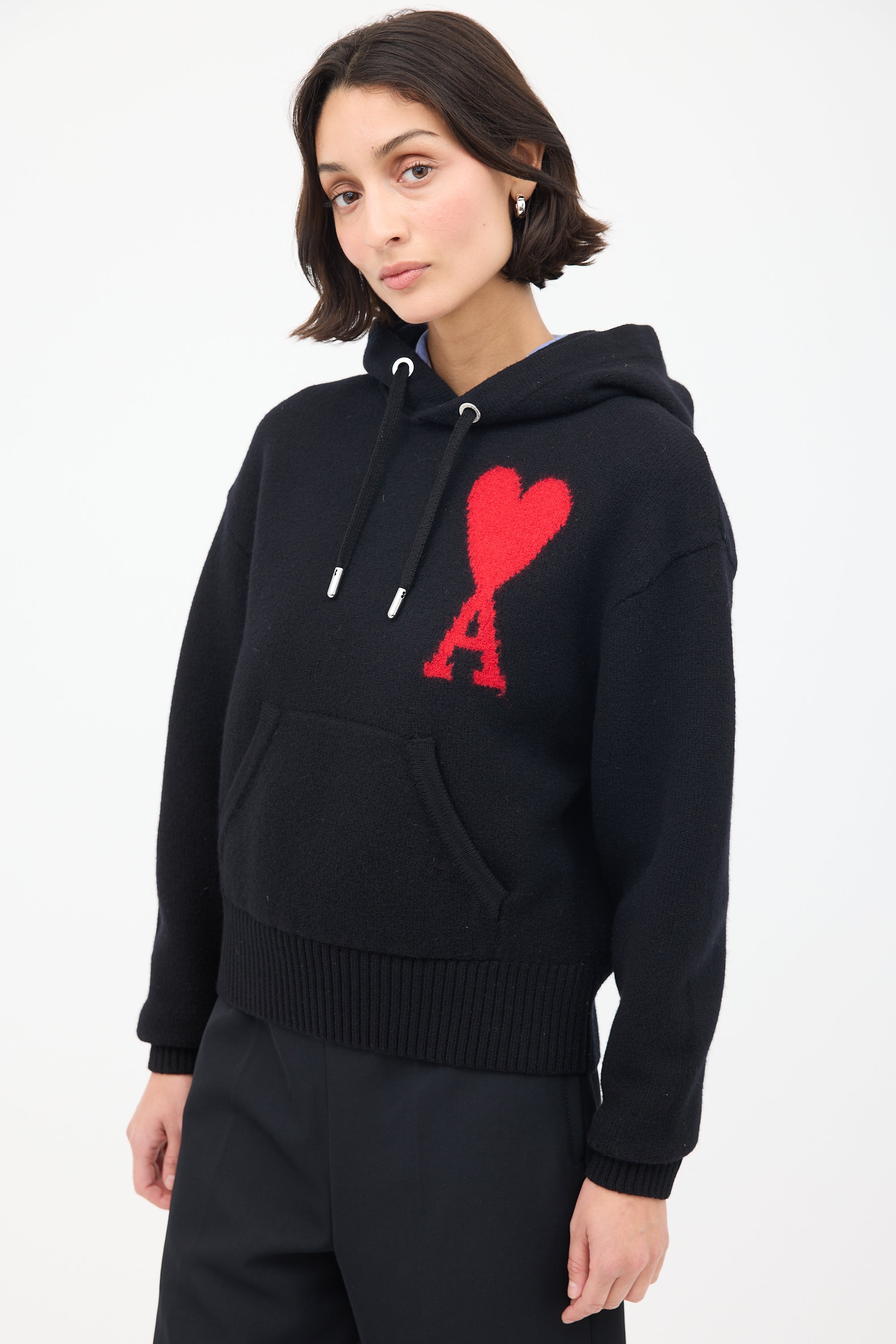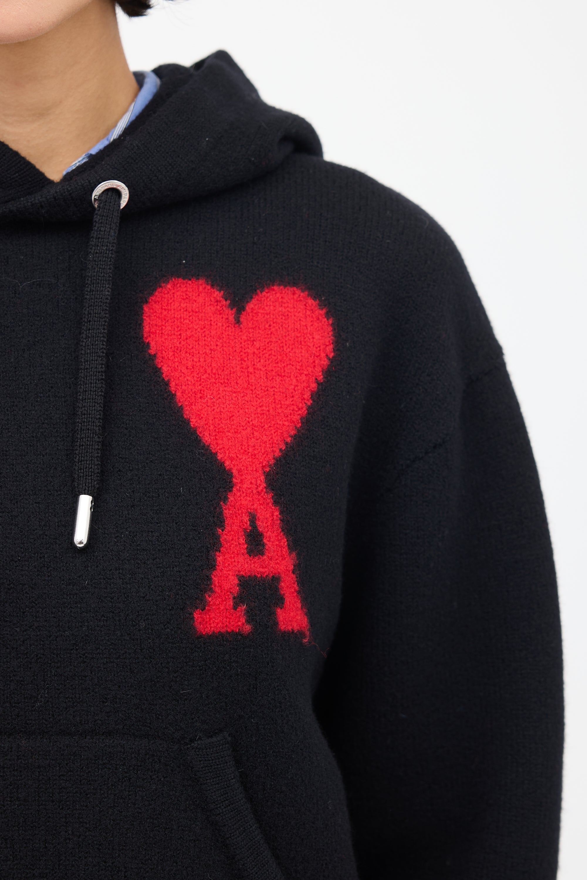 Pre-owned AMI Paris black knit hoodie featuring attached hood with drawstring fastening, drop shoulders, red Ami de Cœur intarsia at chest, and ribbed hem and cuffs.