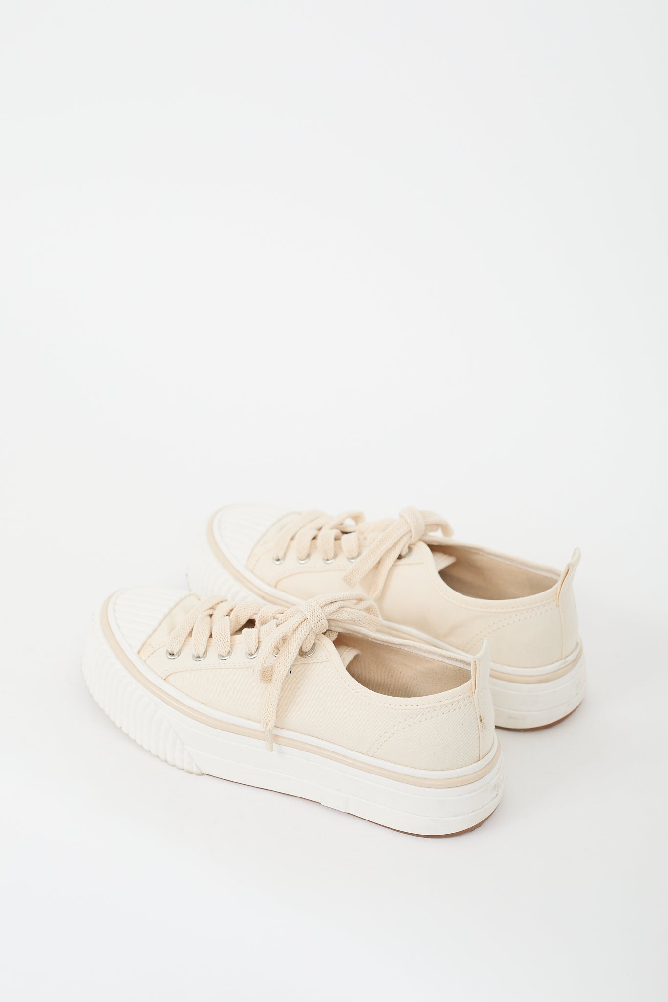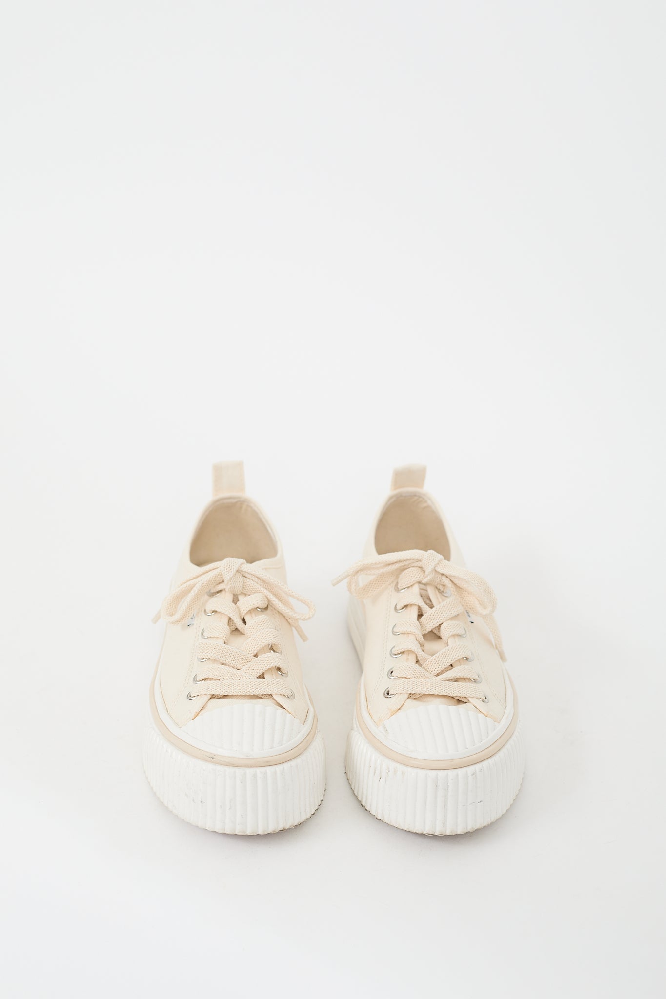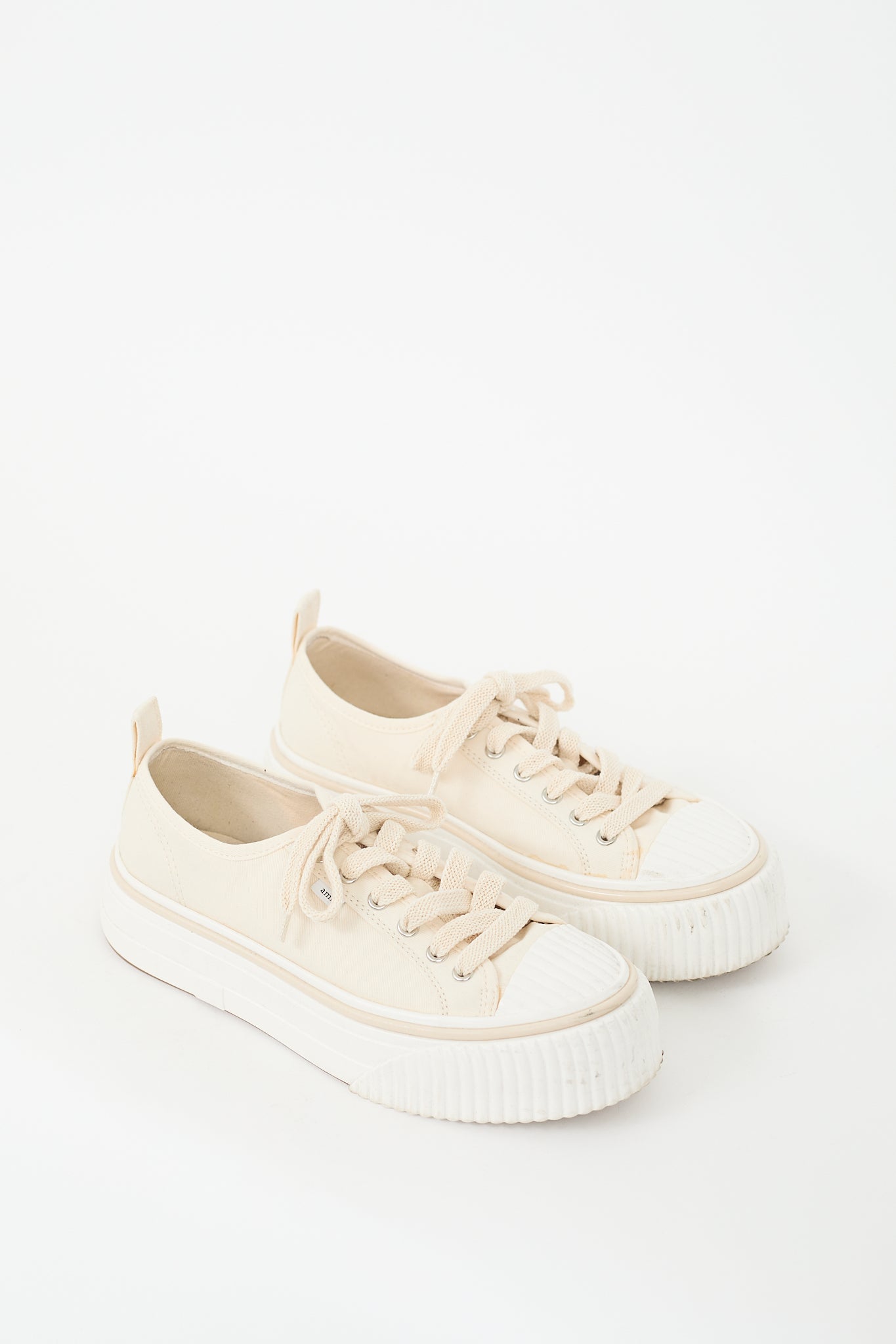 Pre-owned AMI Paris cream and white canvas sneakers featuring rounded rubber cap toe, canvas upper, lace up front, pull tab at counter, and ribbed rubber platform midsole. Comes with original dust bag.