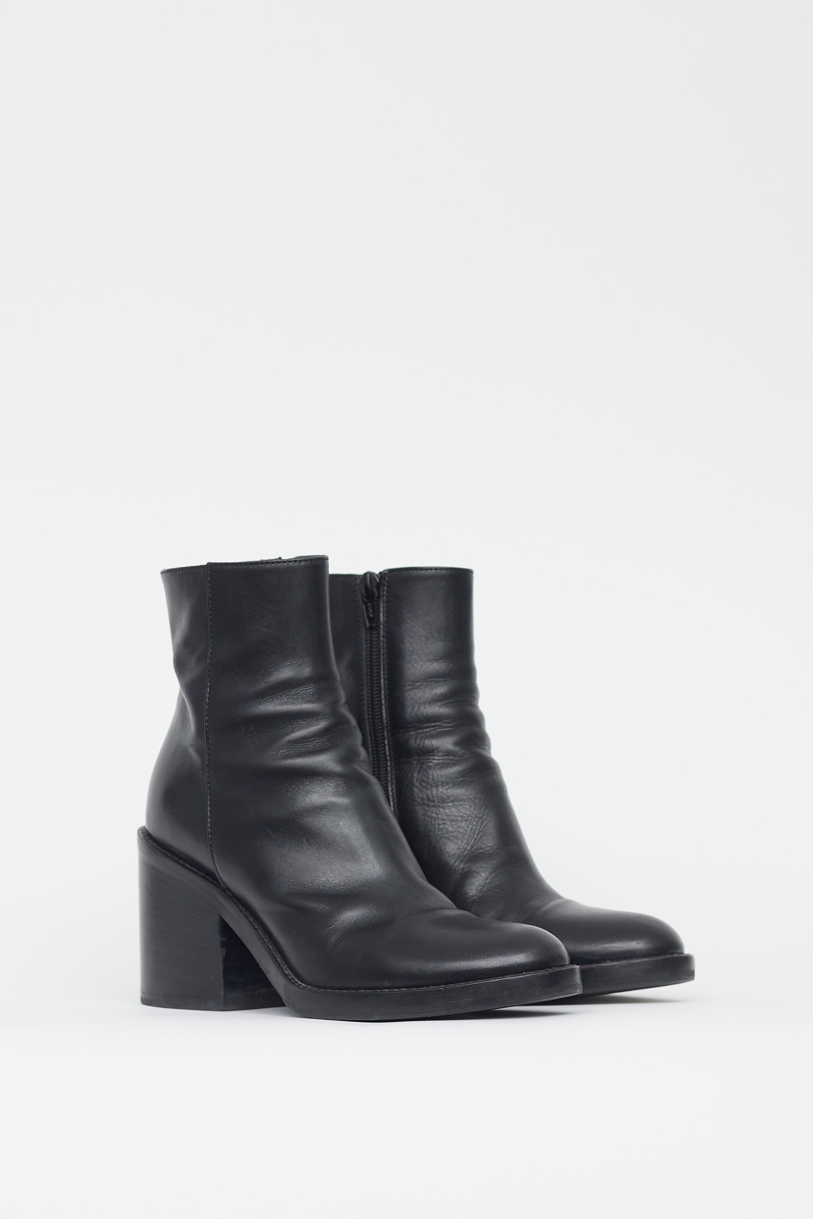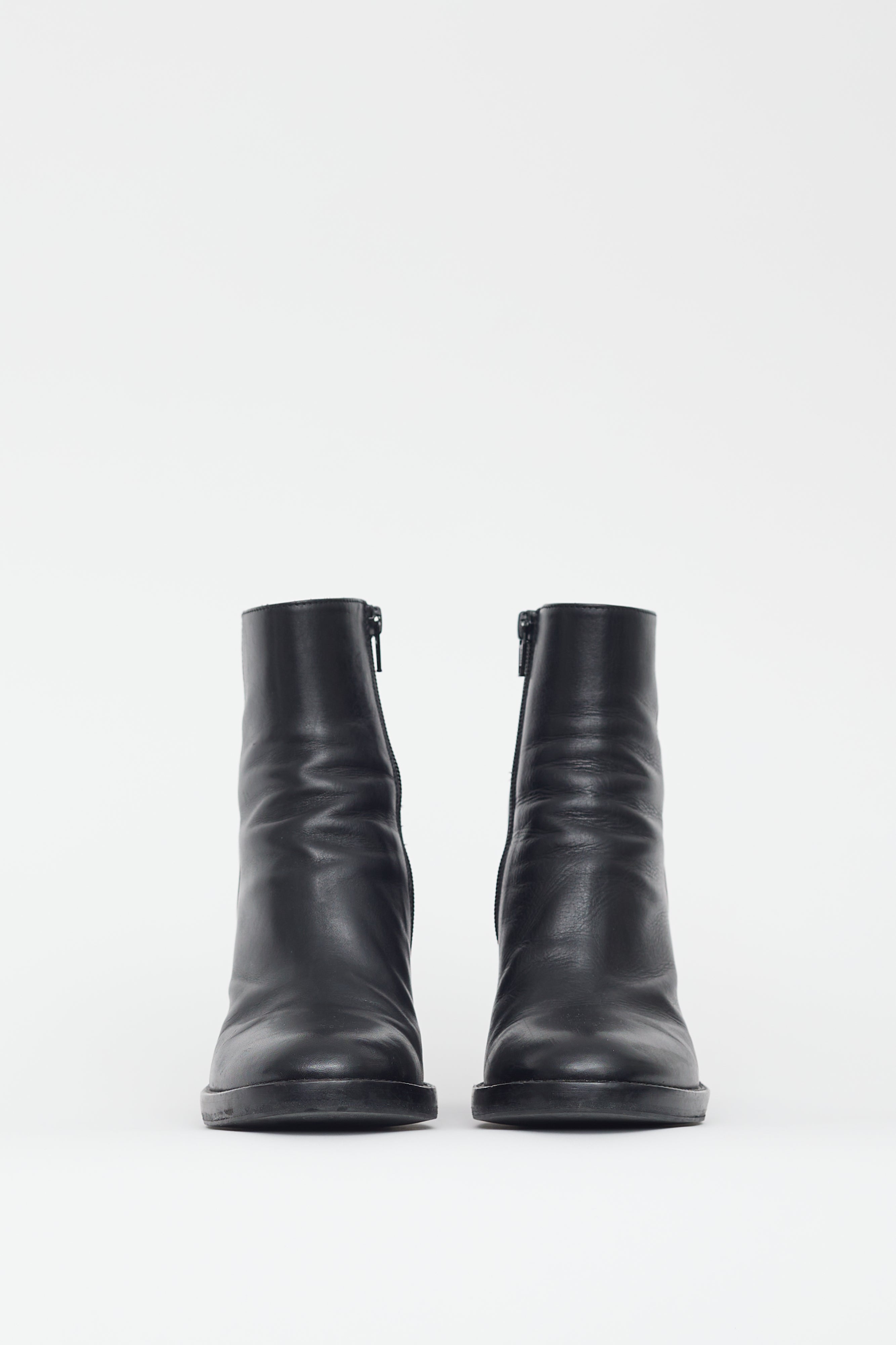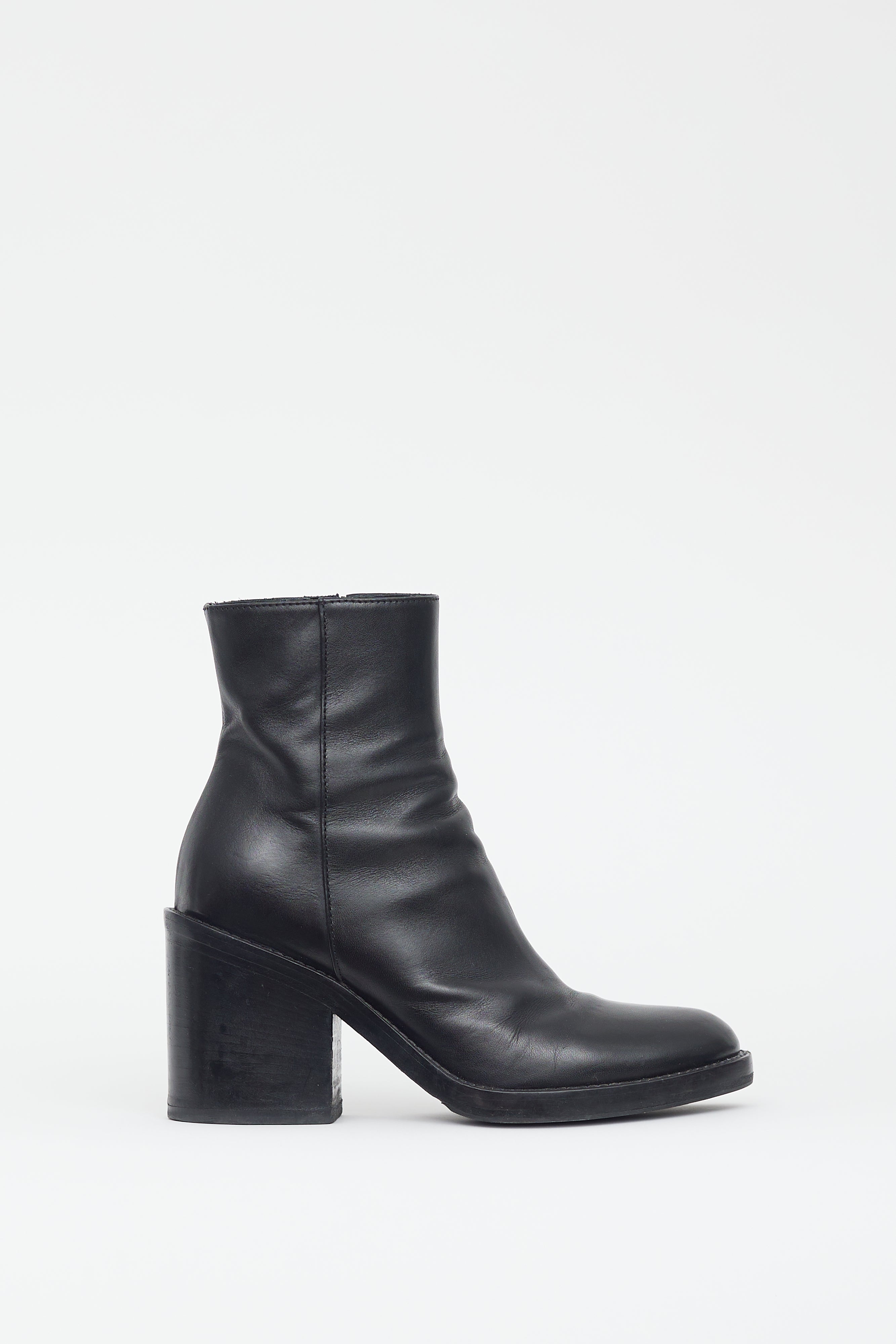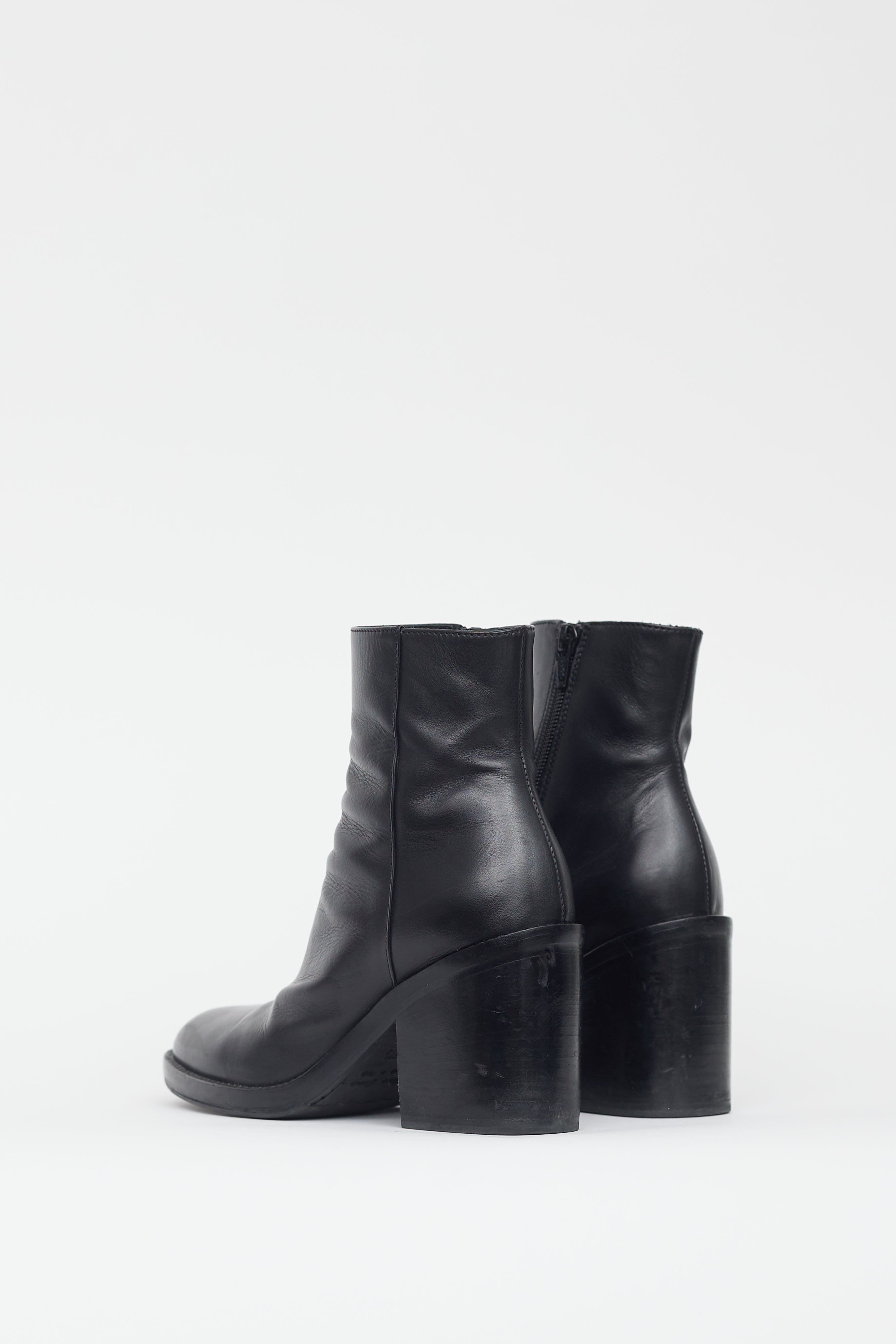 Pre-owned Ann Demeulemeester black leather boots featuring round toe, block heel, tonal zip at side, and leather insoles.