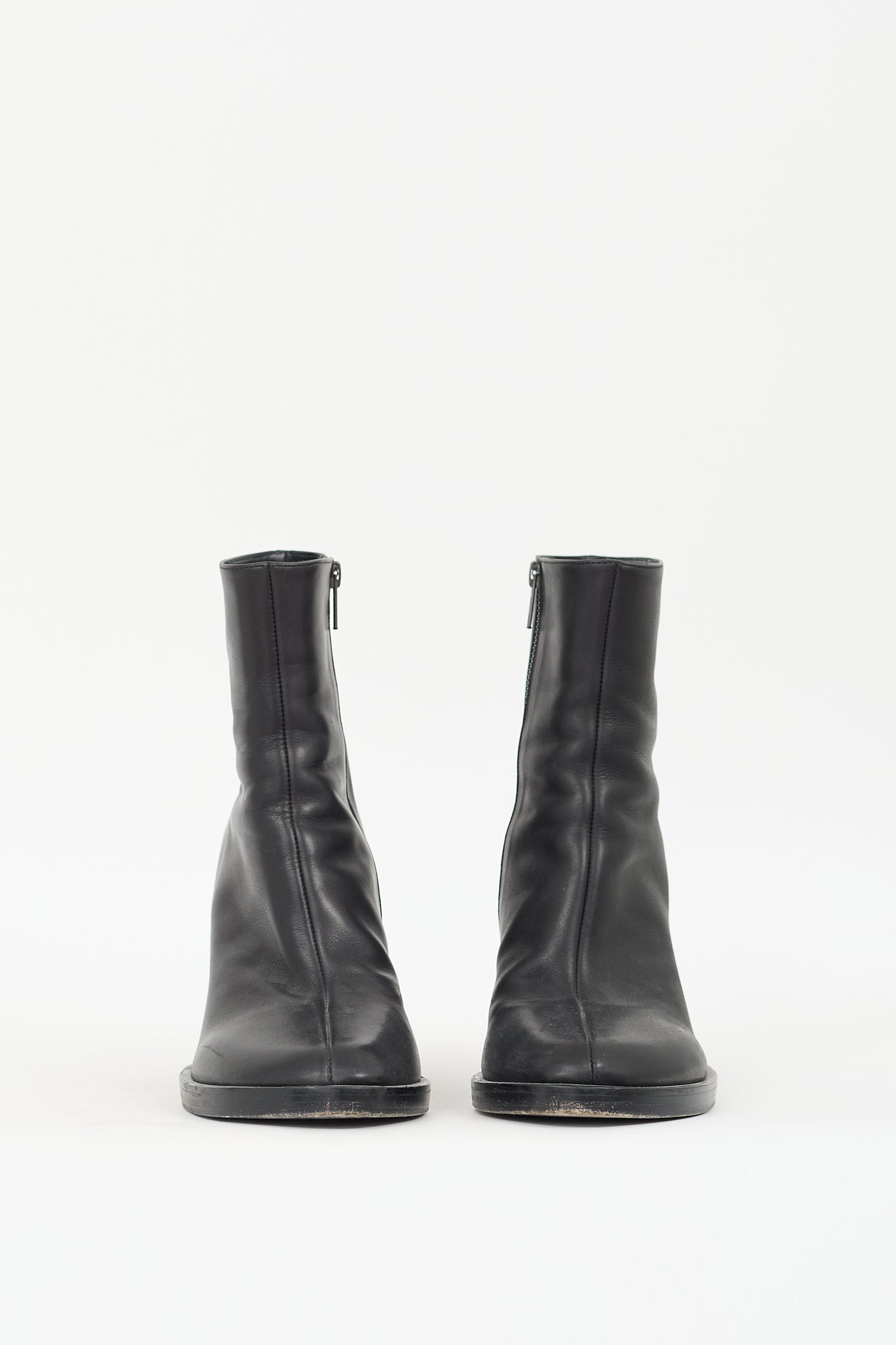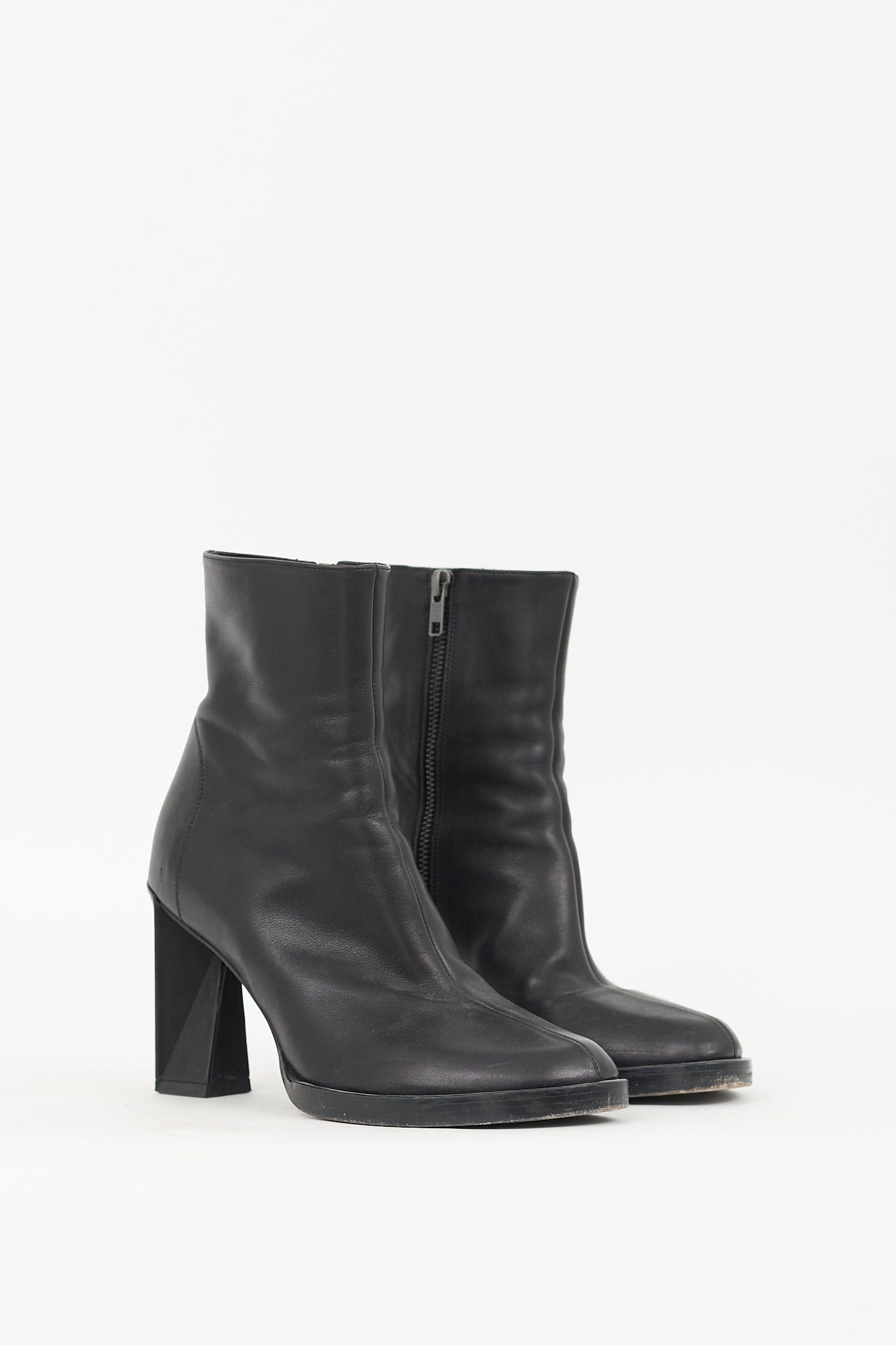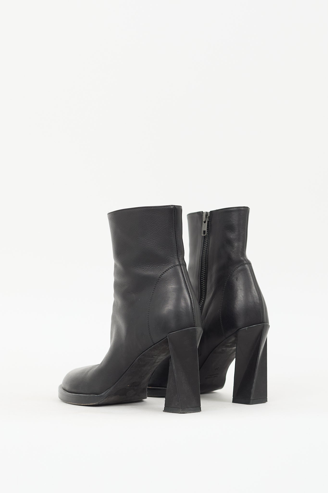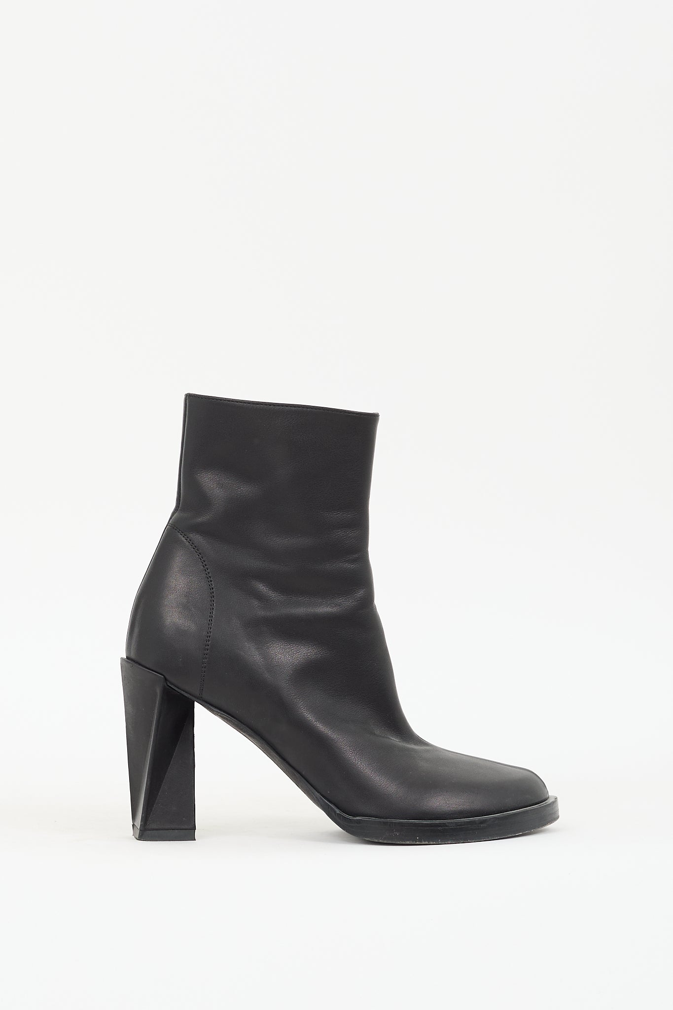 Pre-owned Ann Demeulemeester black leather ankle boots featuring almond toe, center seam, inner side zip closure, and geometrical twist block heel.