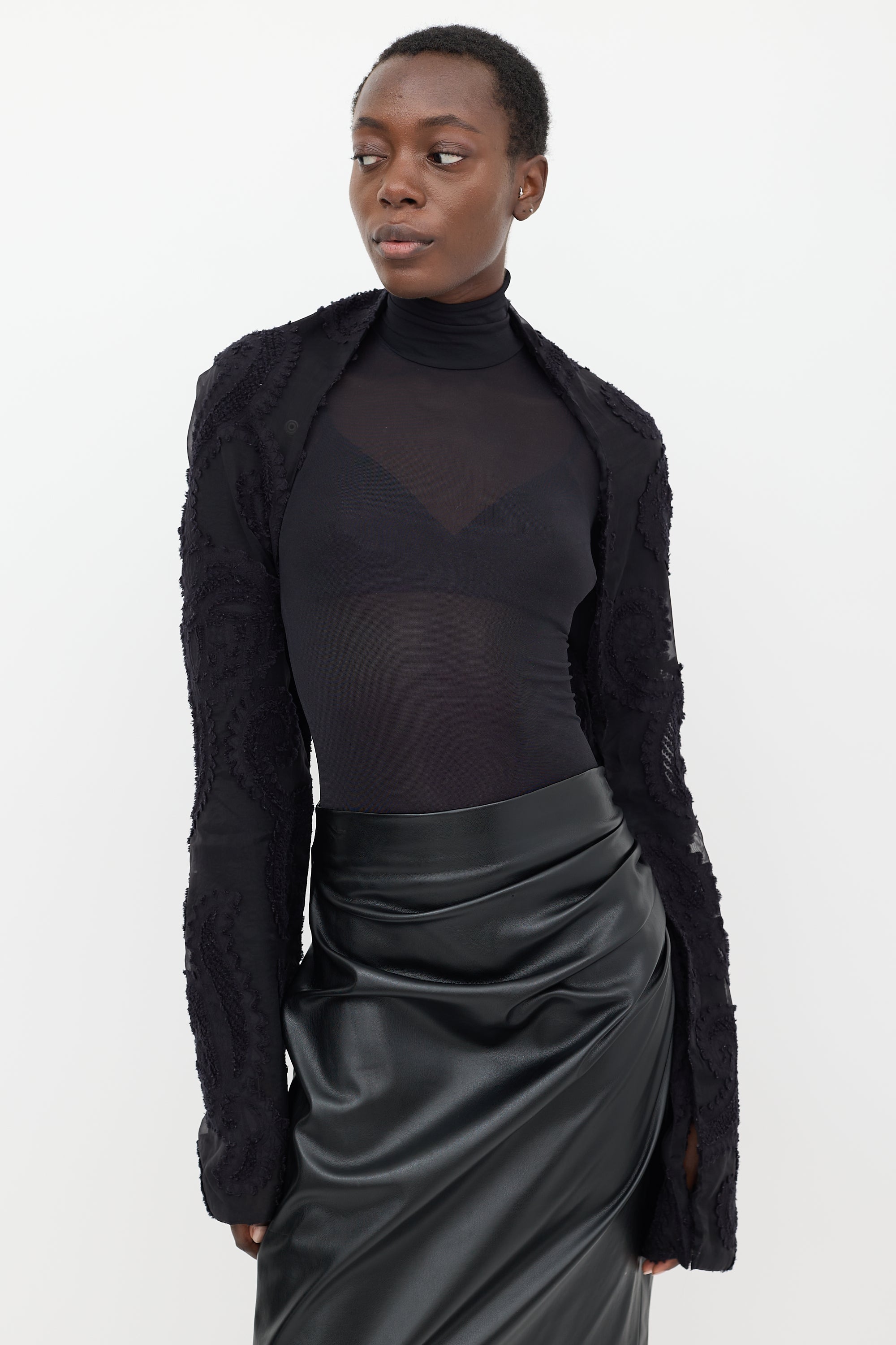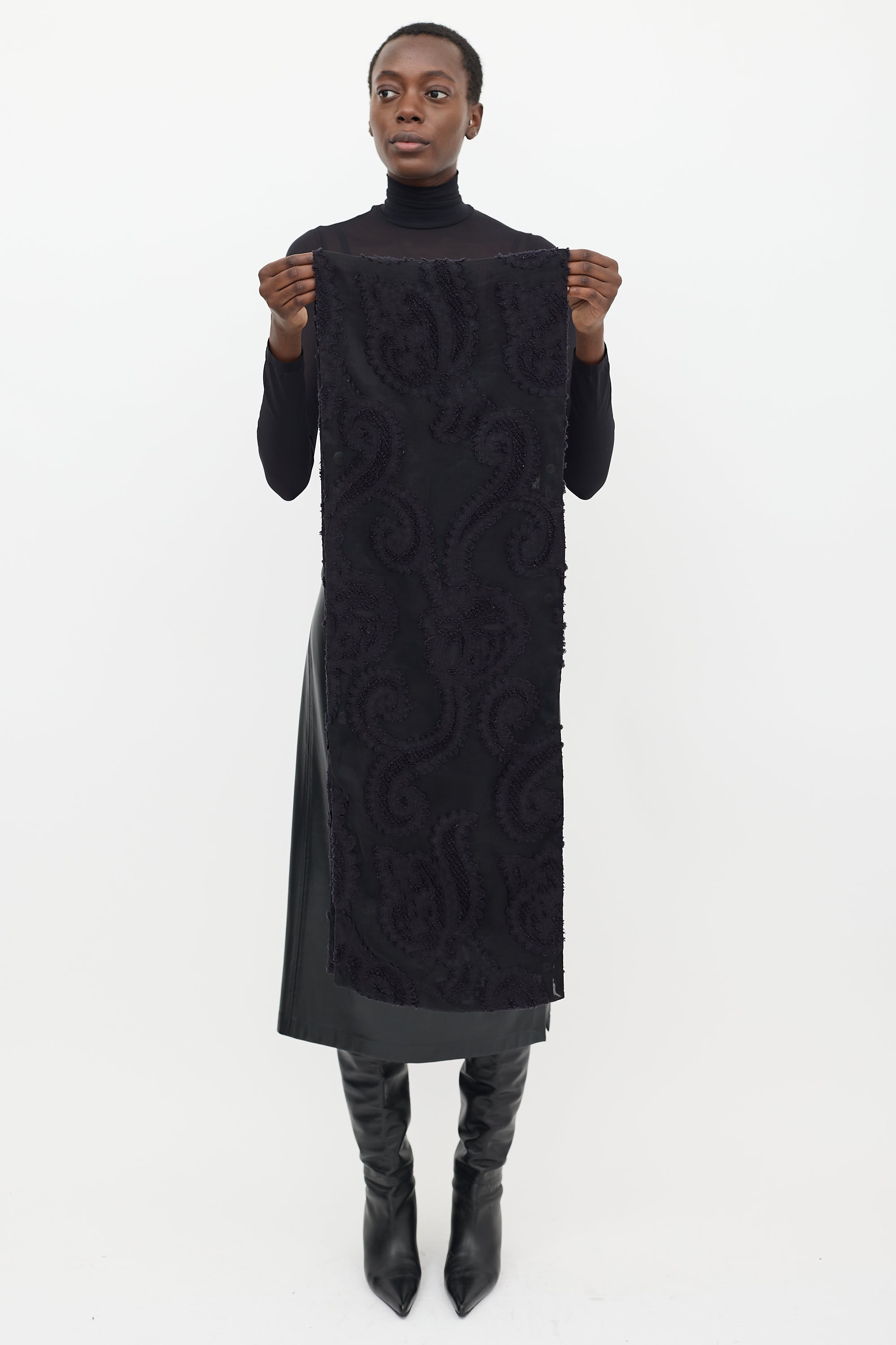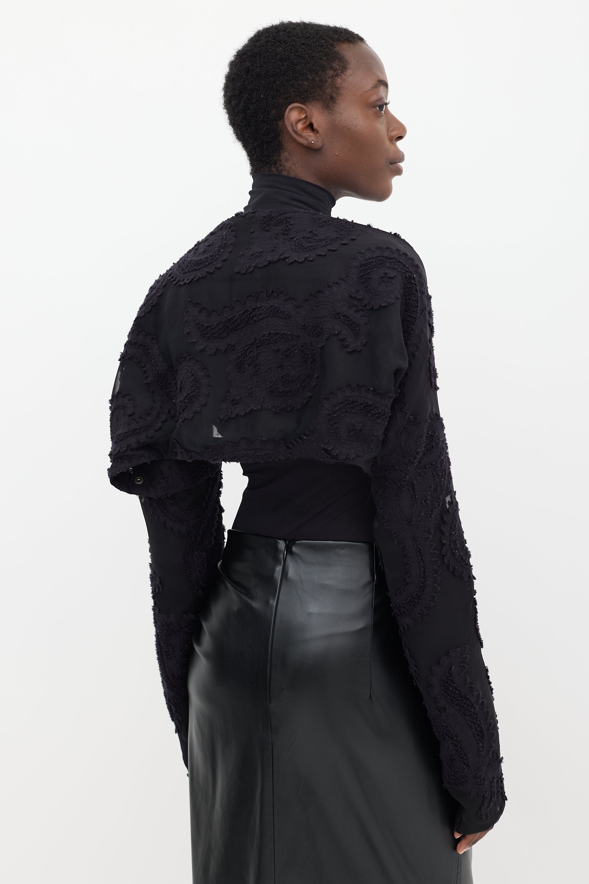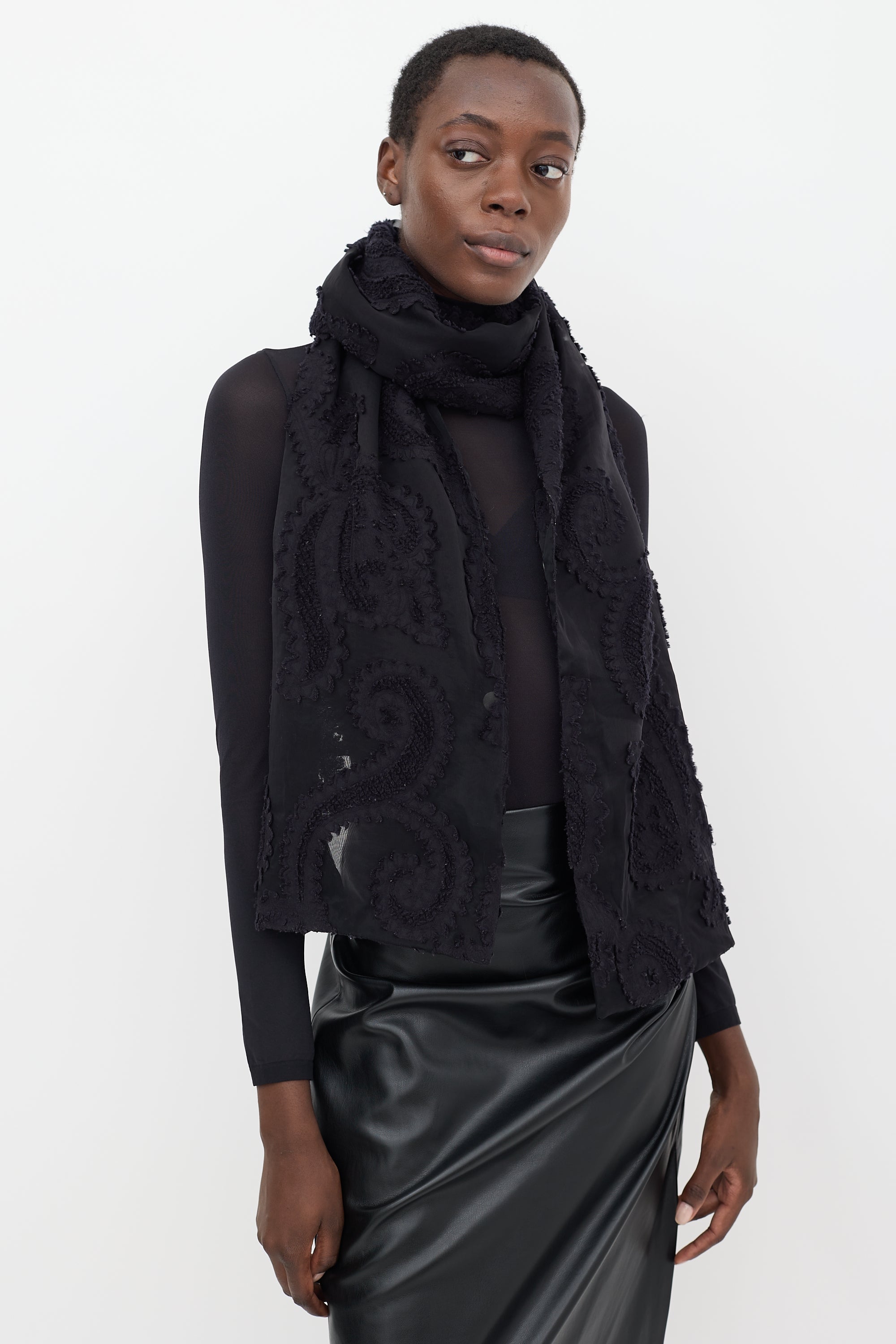Pre-owned Ann Demeulemeester black sheer scarf featuring a tonal paisley pattern throughout, snap detailing at hem, and bolero styling.