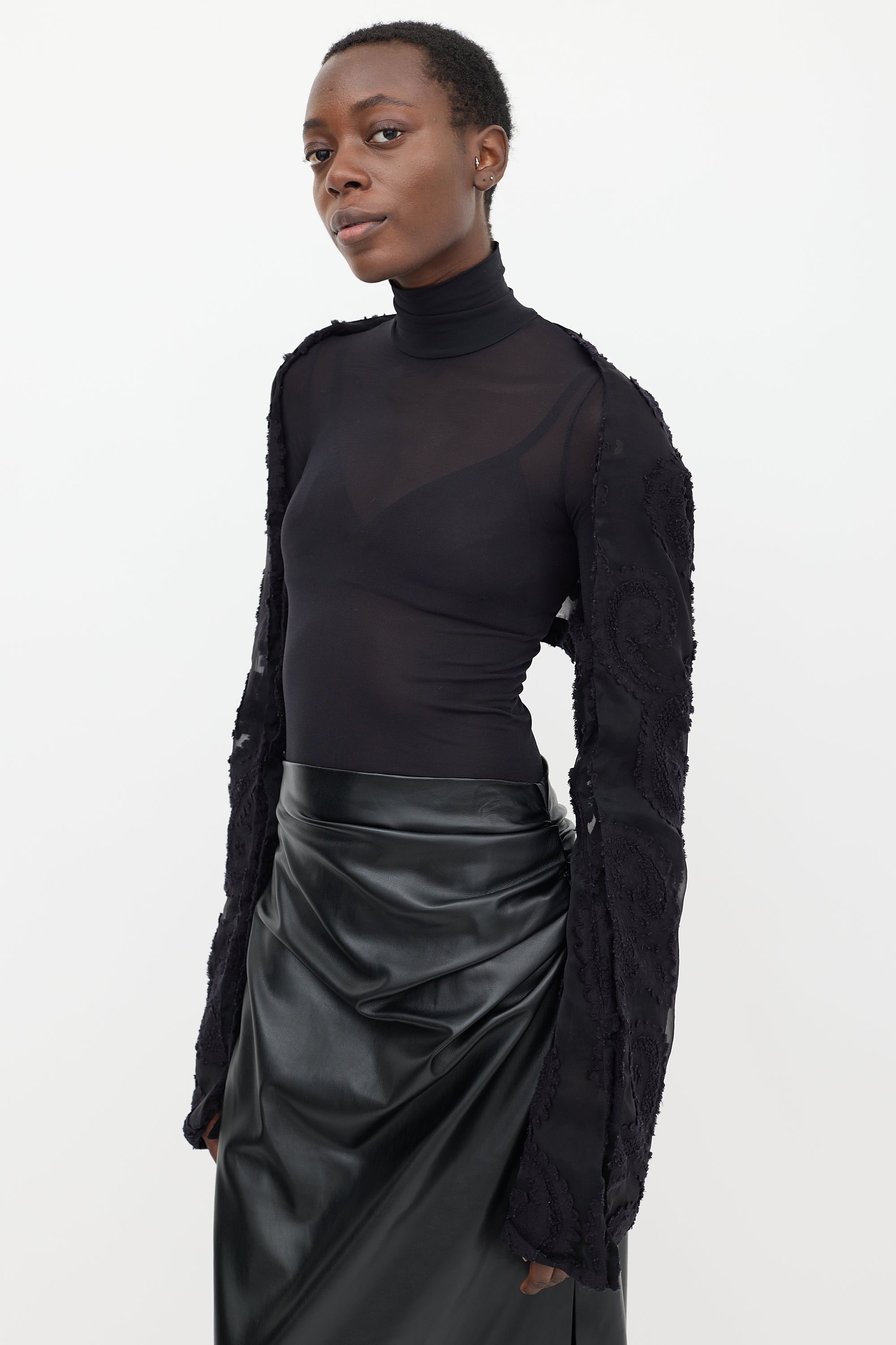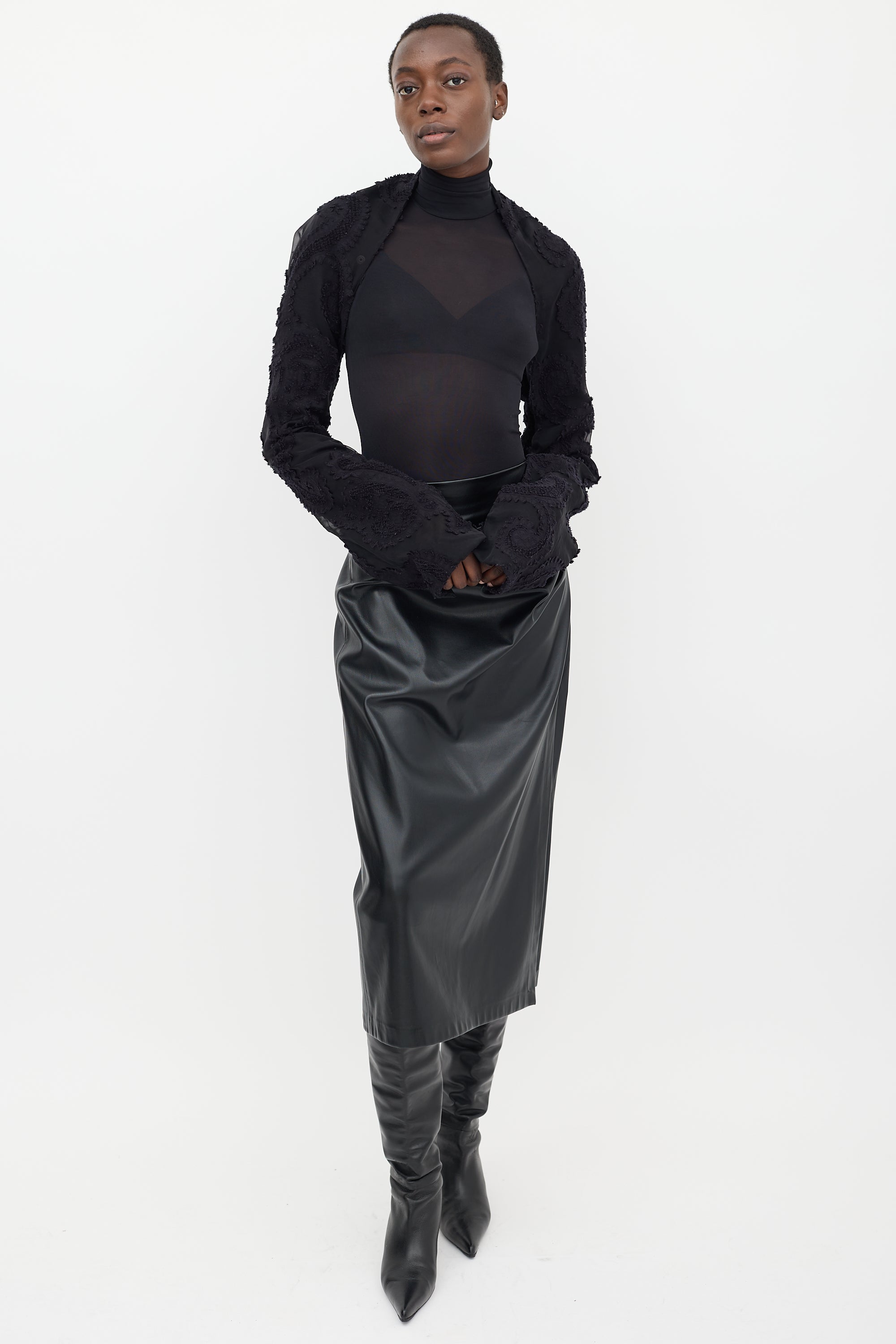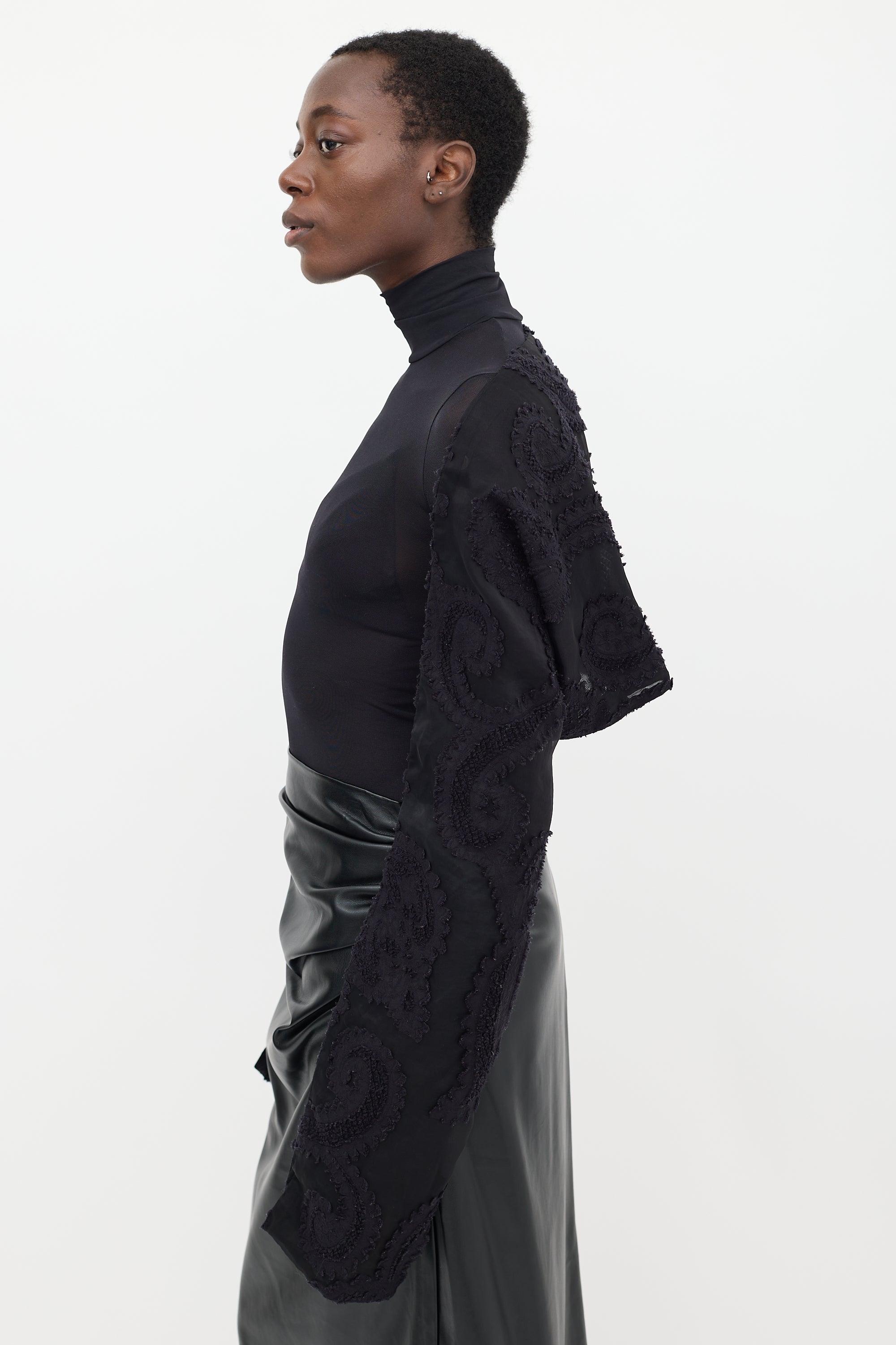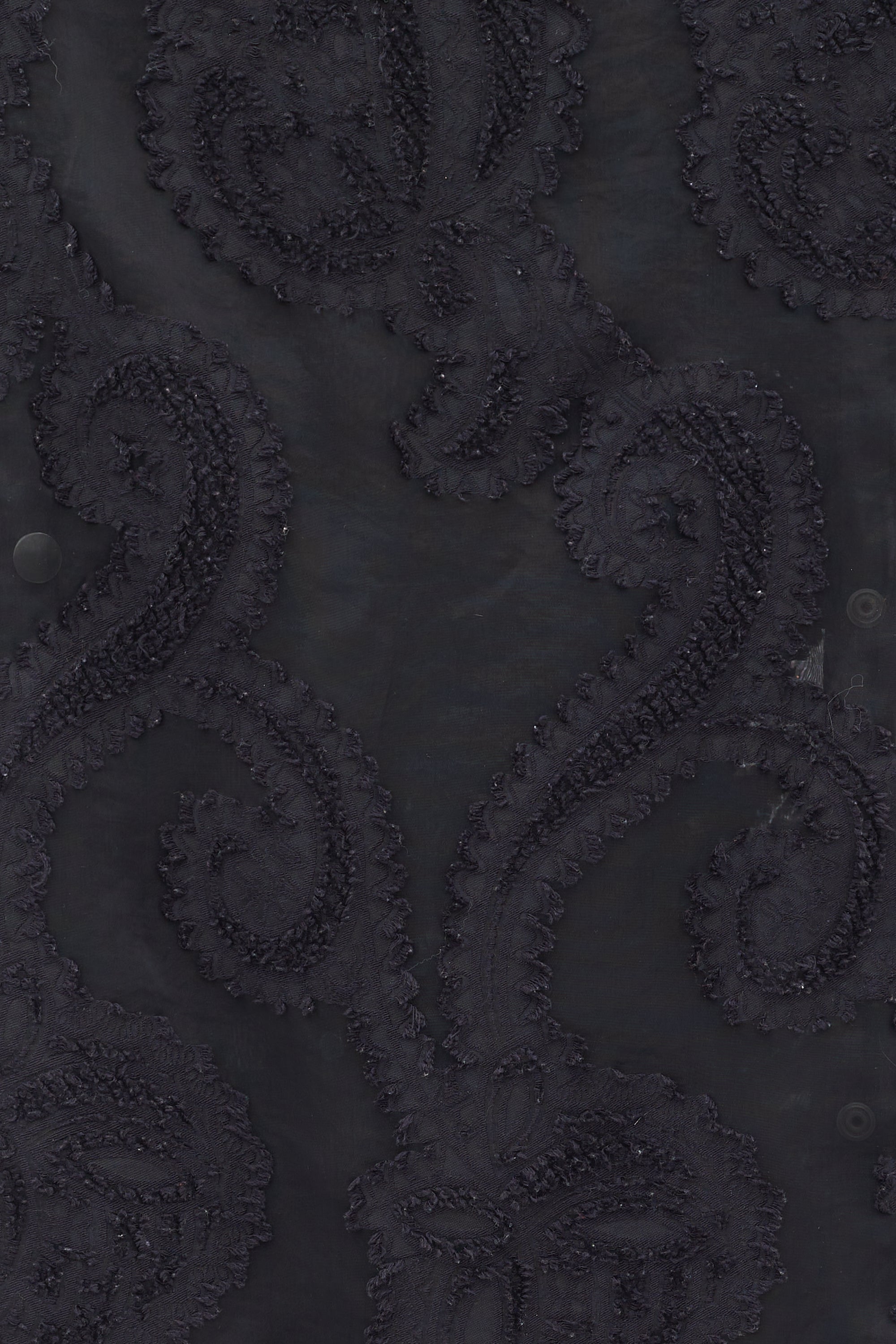 Pre-owned Ann Demeulemeester black sheer scarf featuring a tonal paisley pattern throughout, snap detailing at hem, and bolero styling.