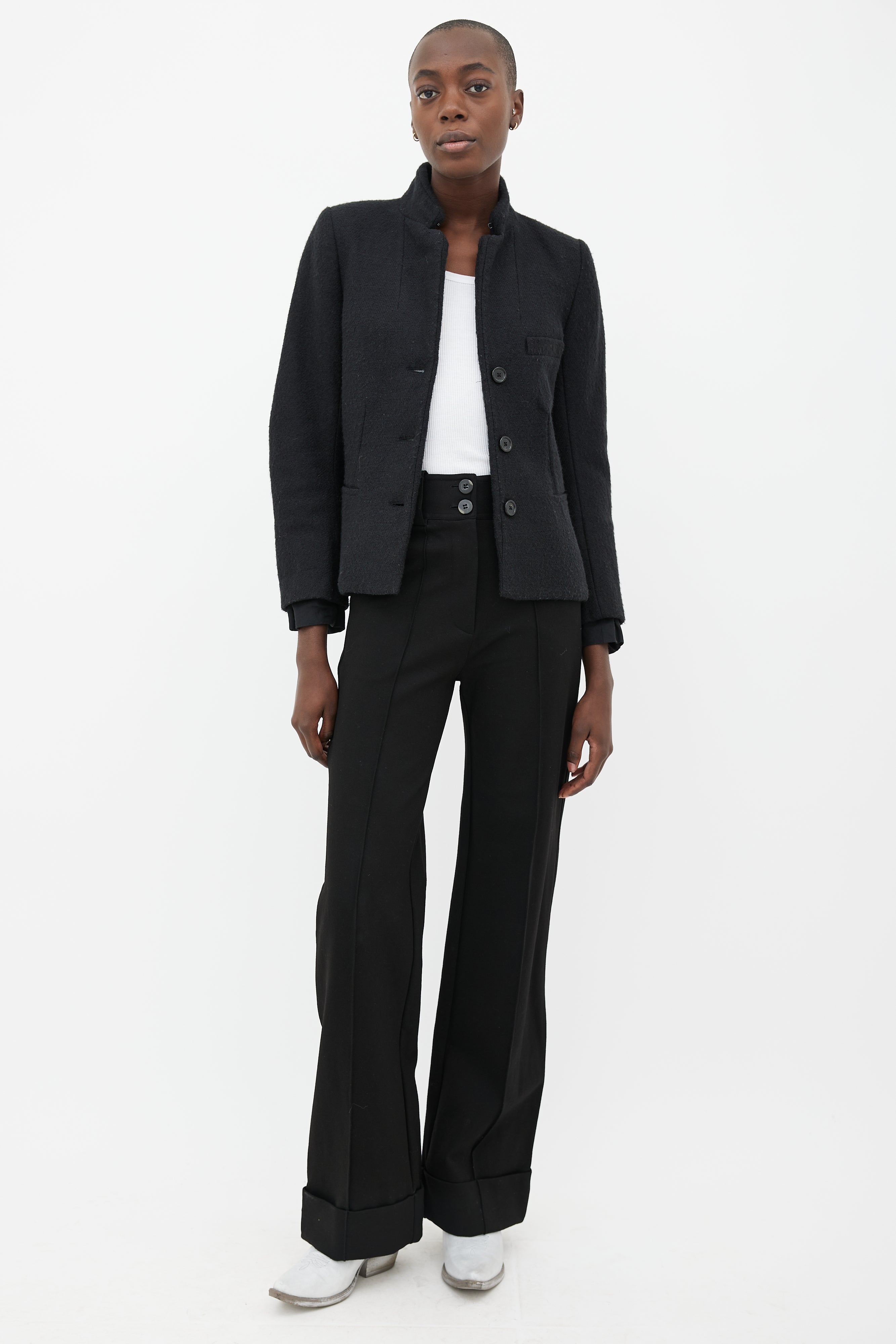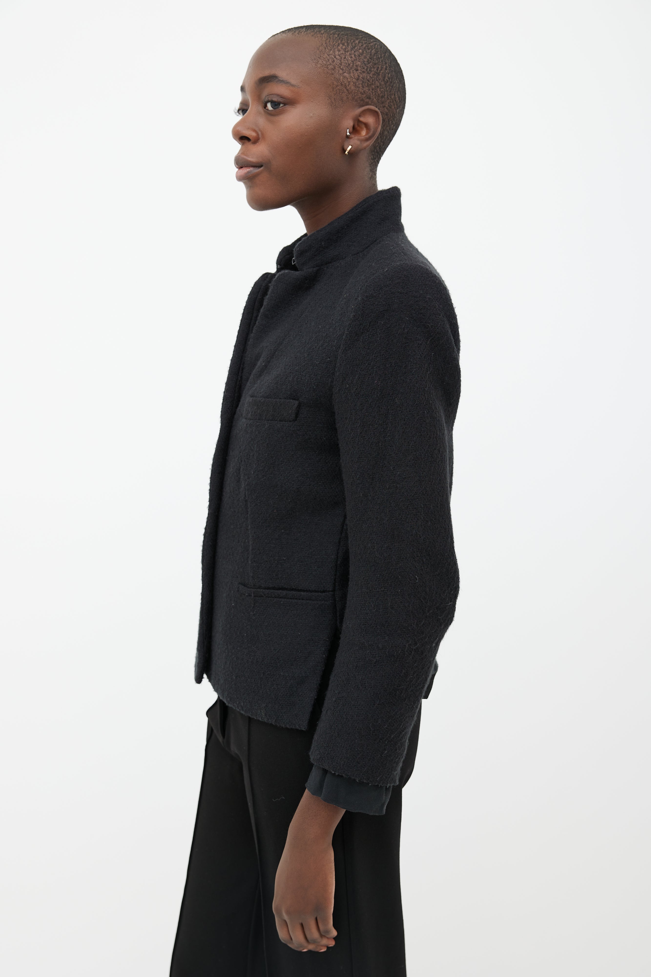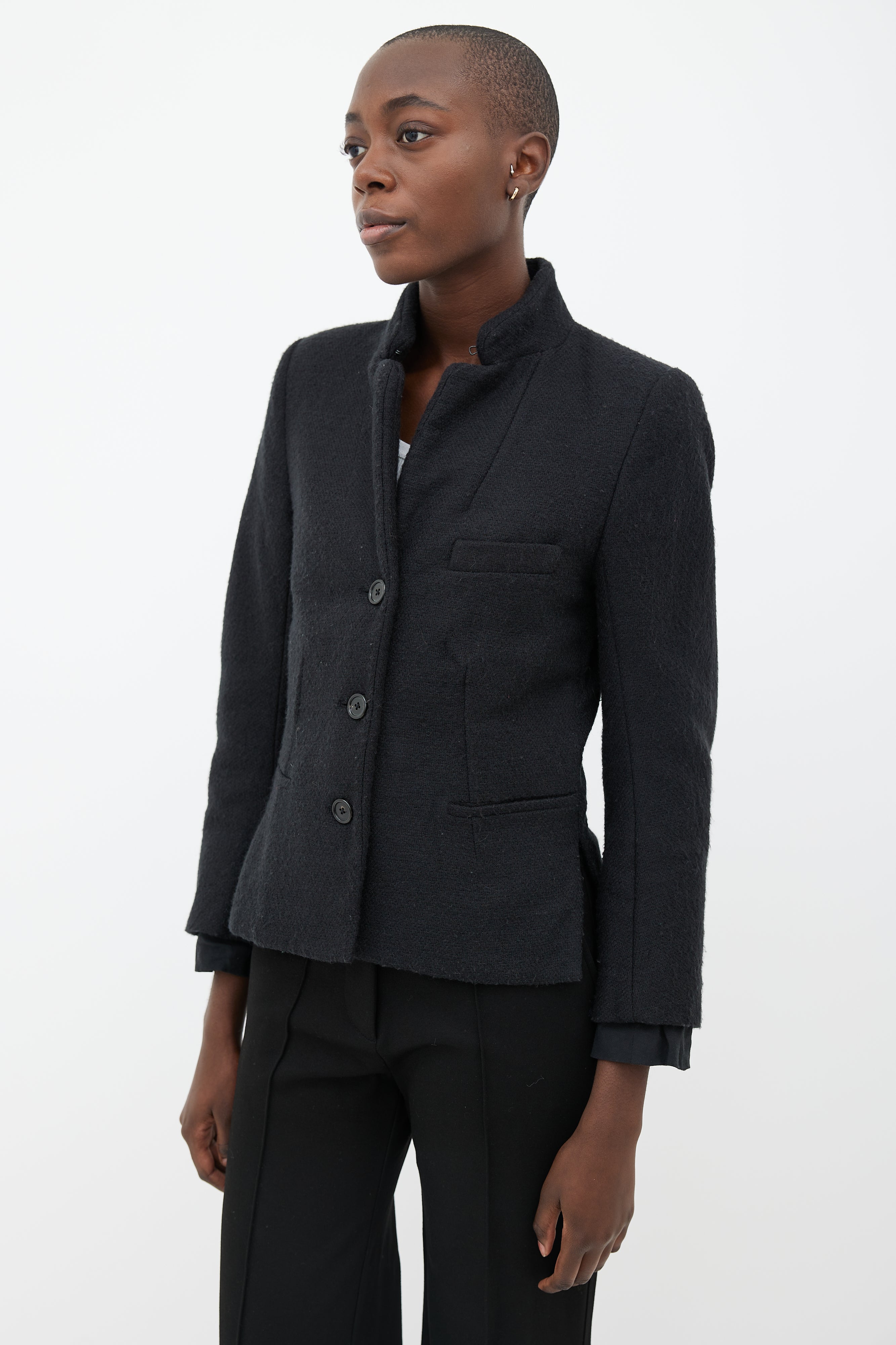 Pre-owned Ann Demeulemeester blazer in black featuring adjustable notch lapel, stand collar with clasp fastener, black button closure at front, three pocket styling, and side slit. Lined.