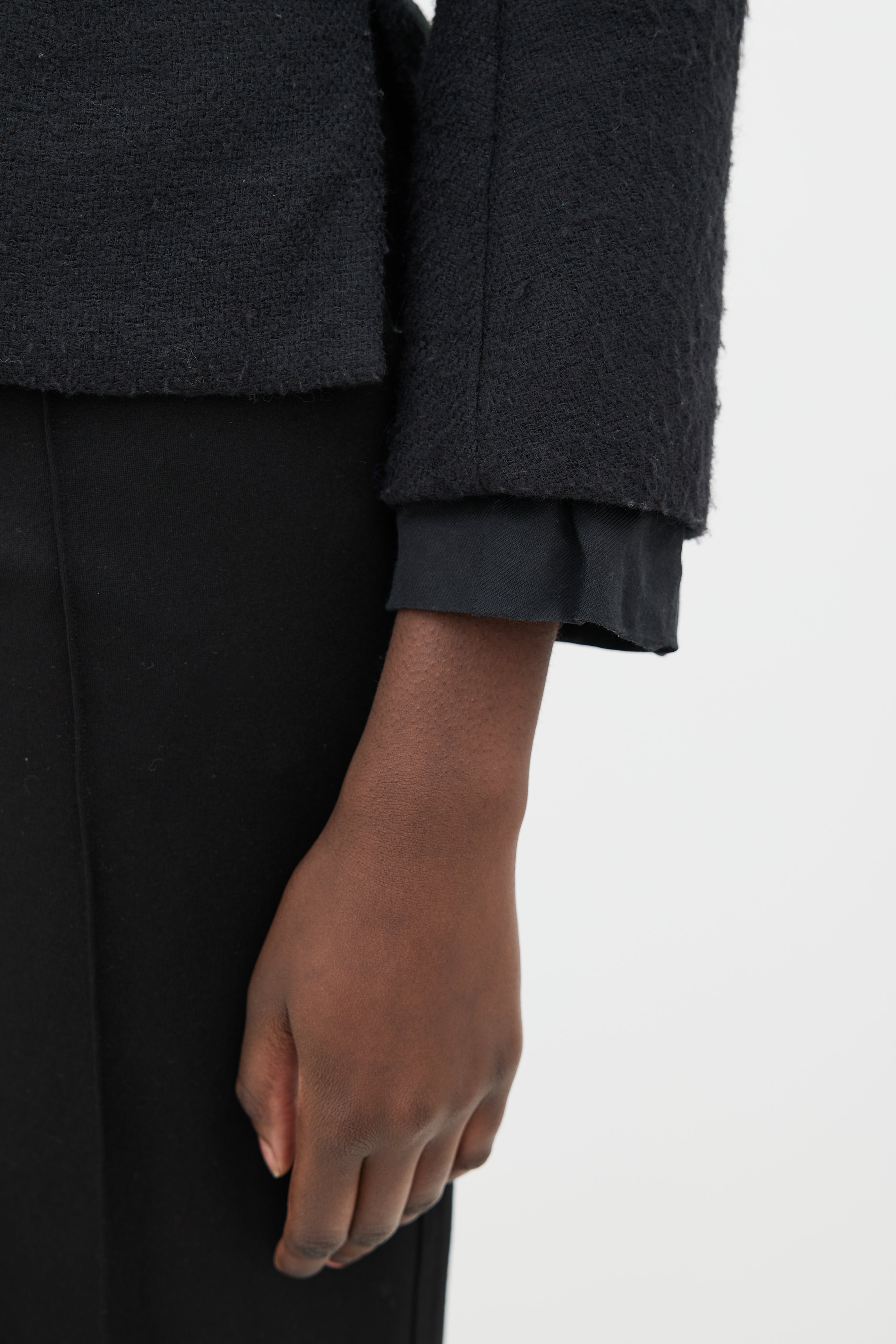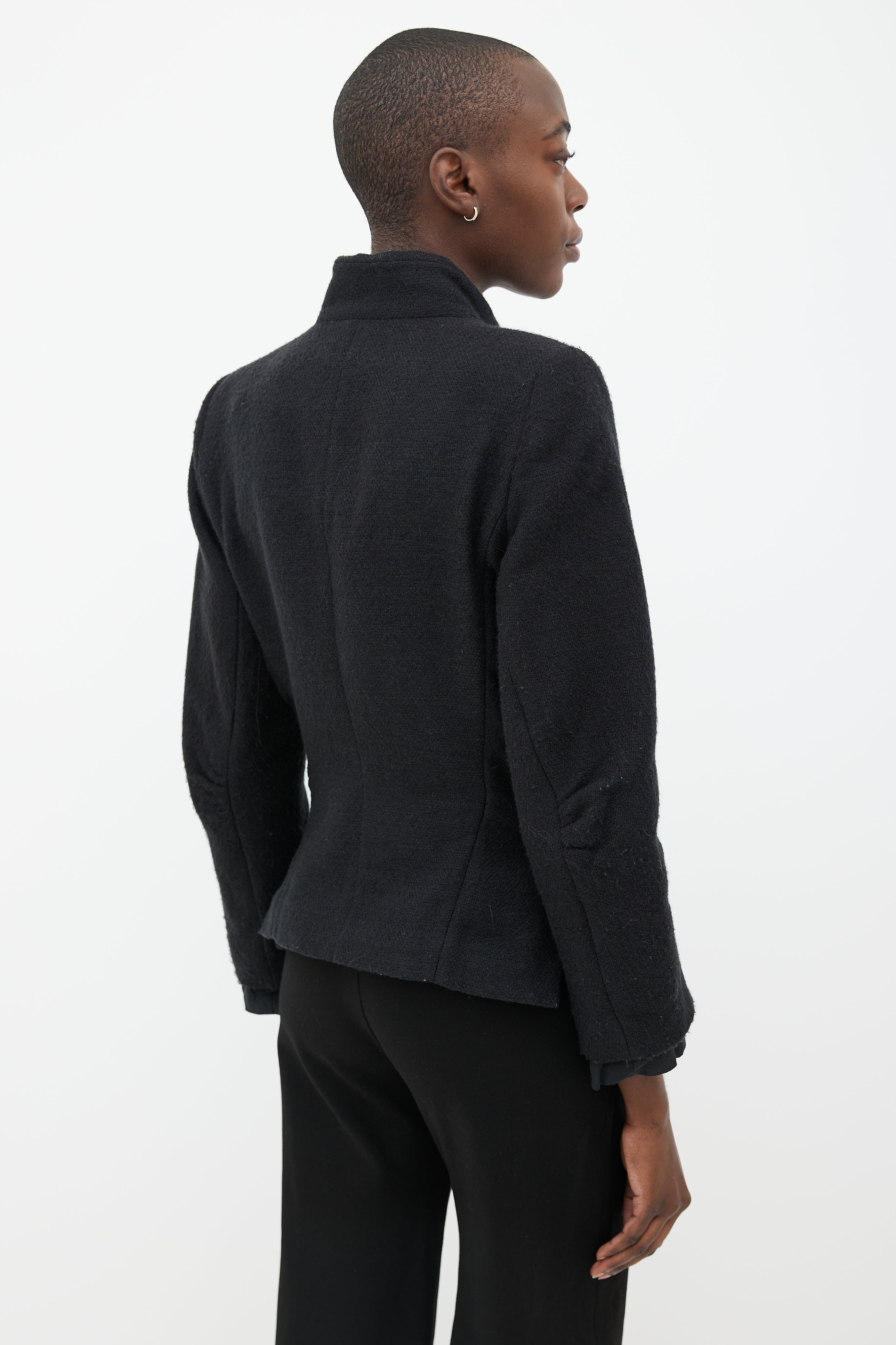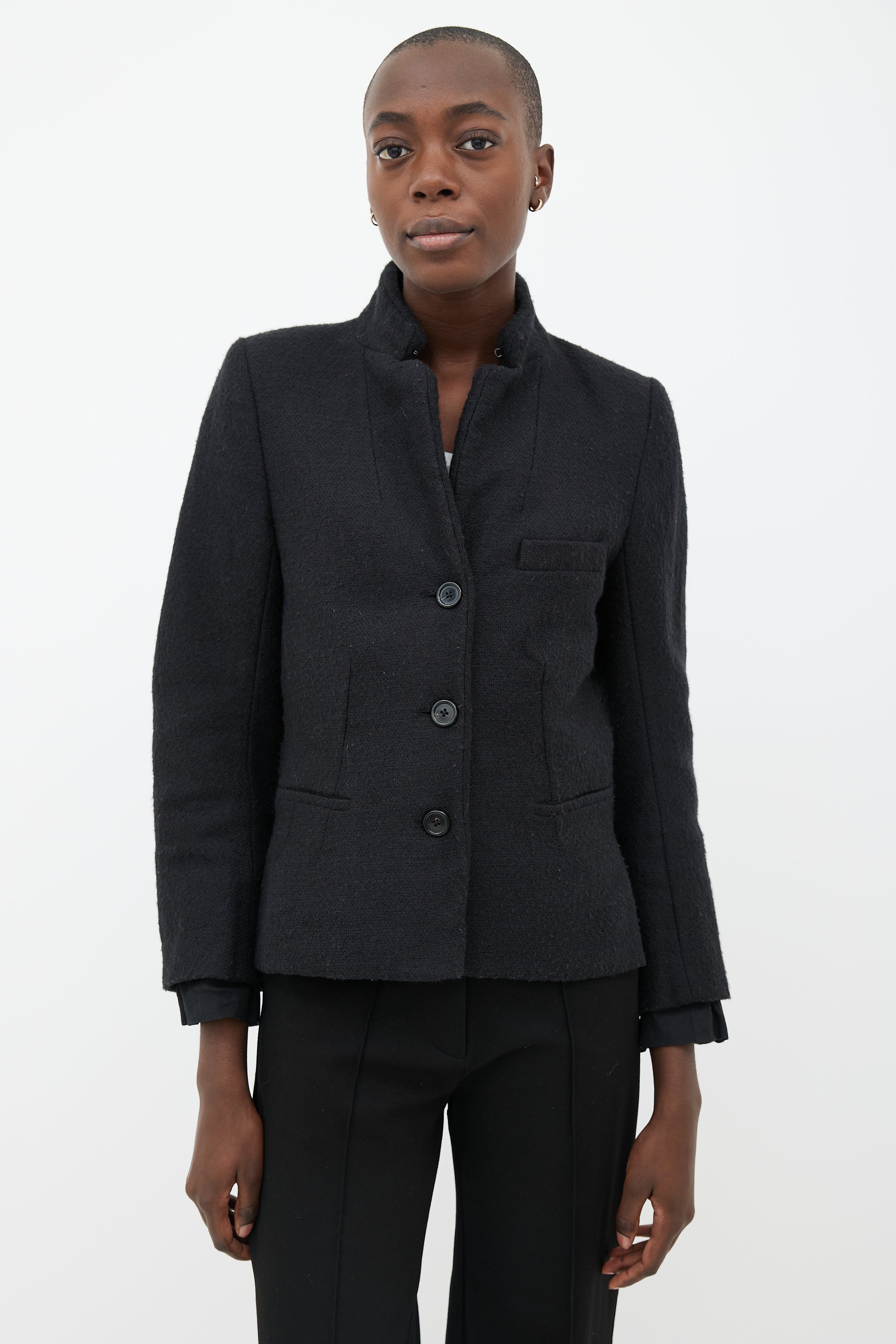 Pre-owned Ann Demeulemeester blazer in black featuring adjustable notch lapel, stand collar with clasp fastener, black button closure at front, three pocket styling, and side slit. Lined.