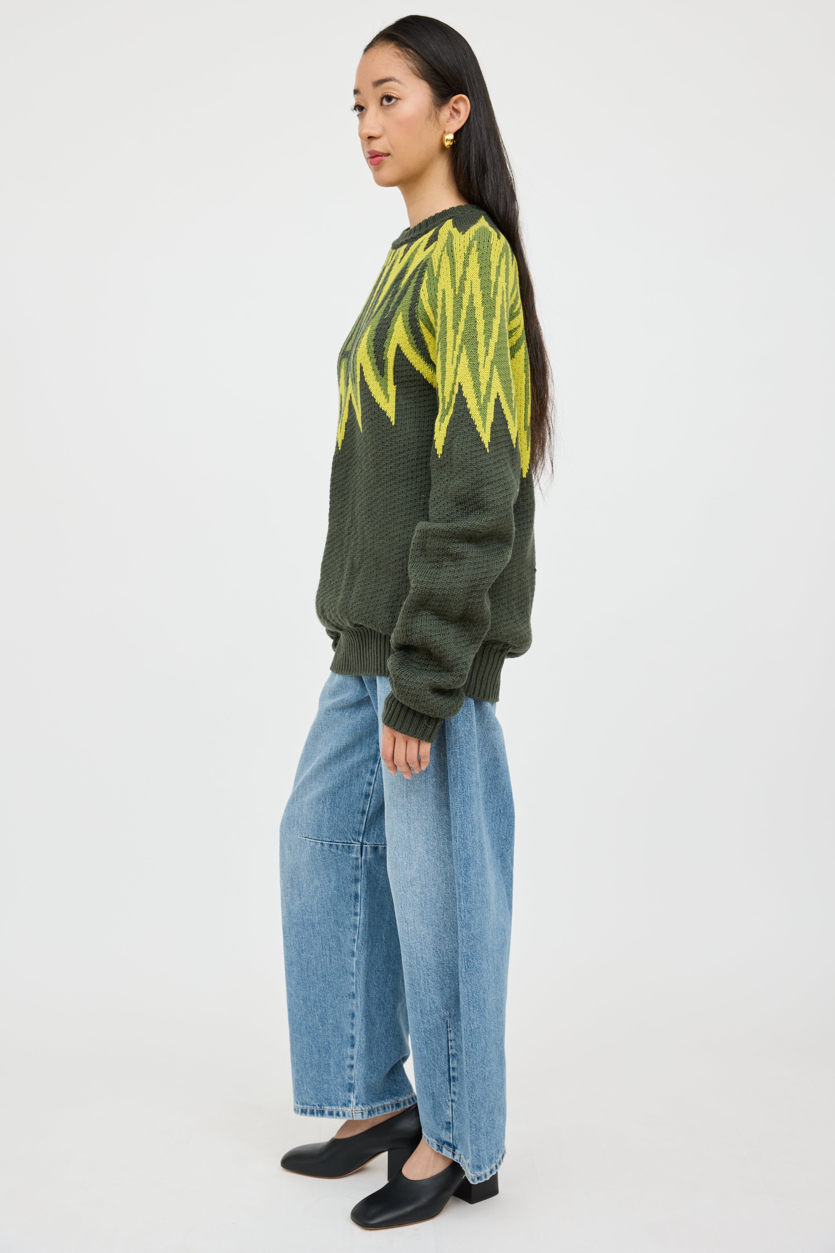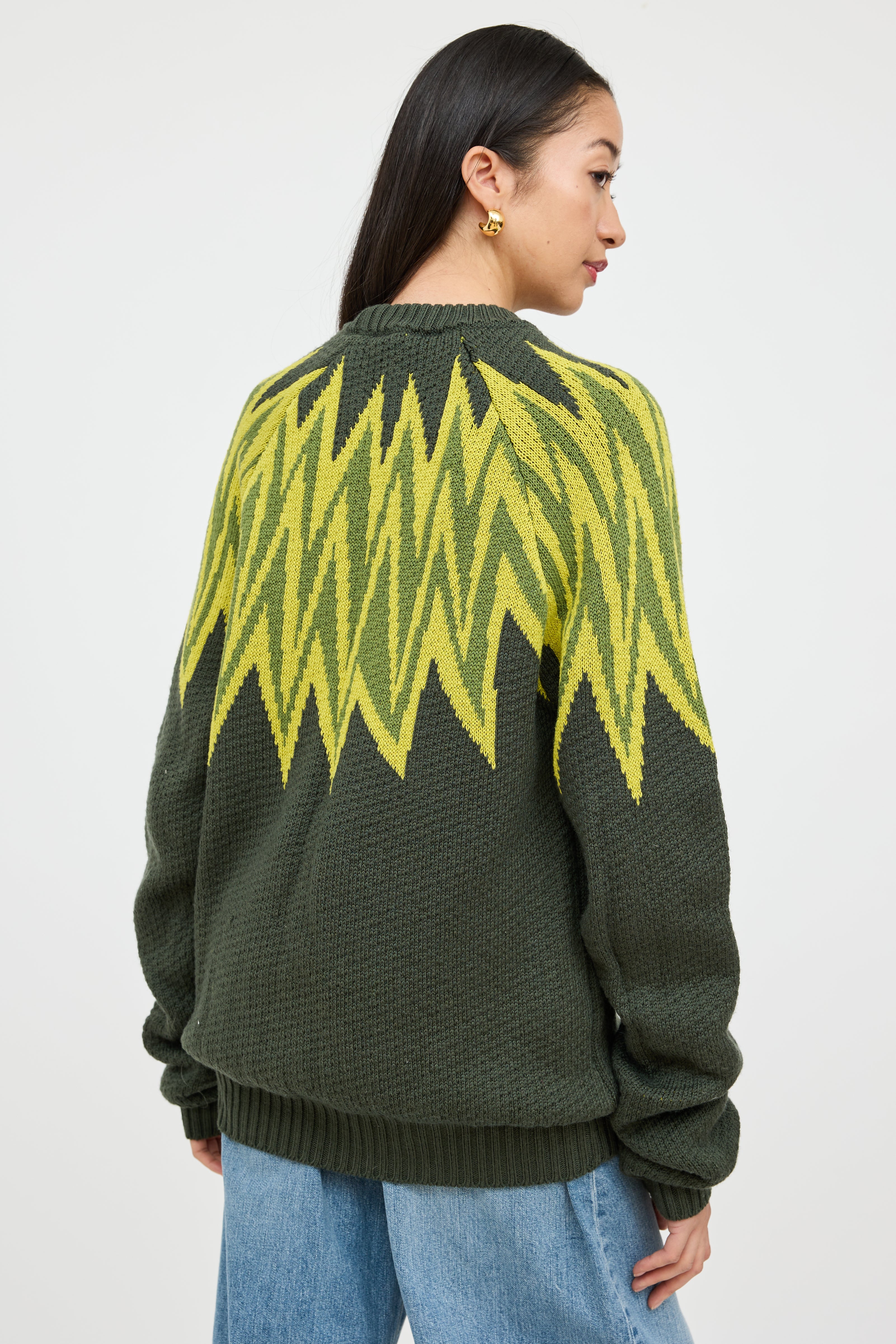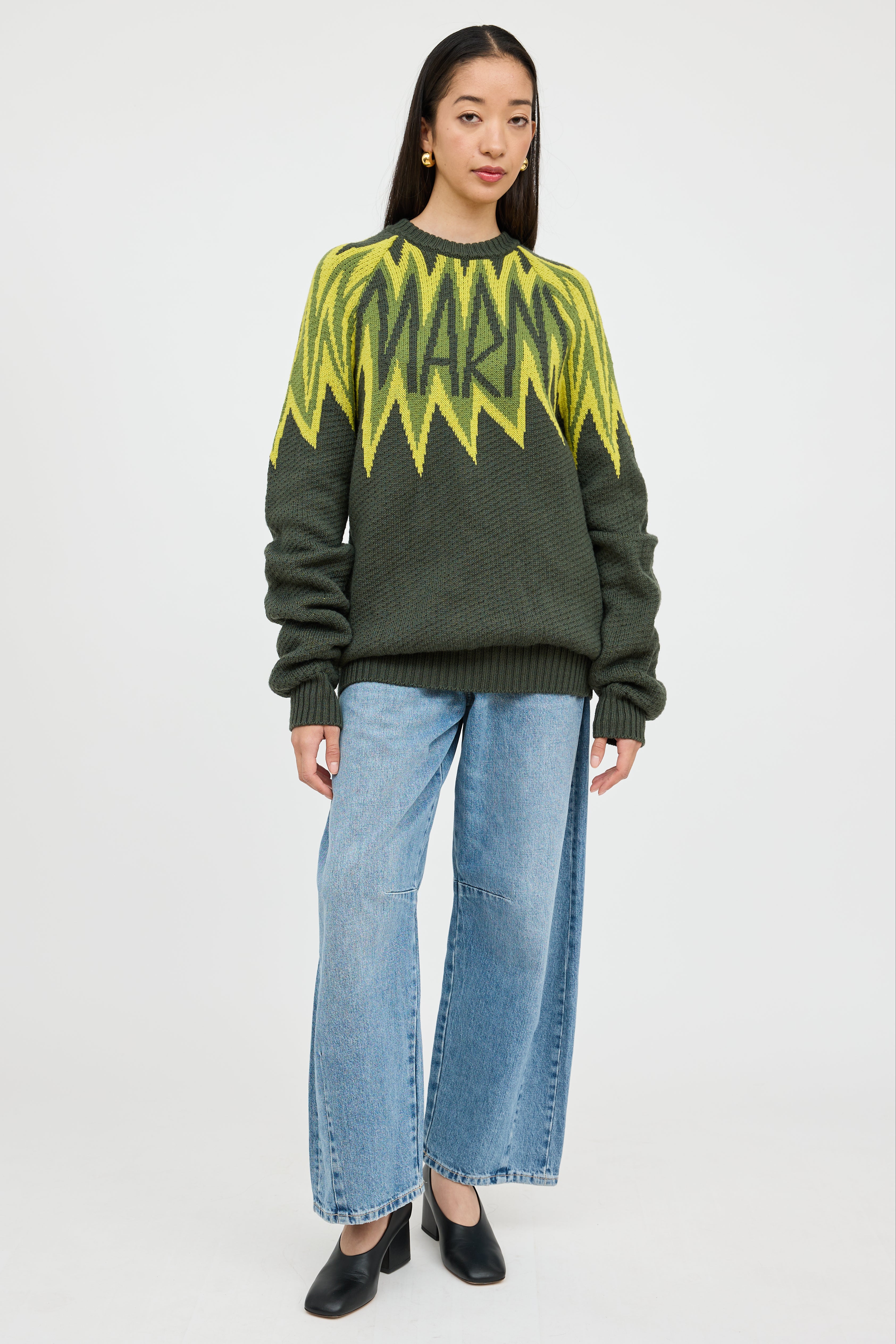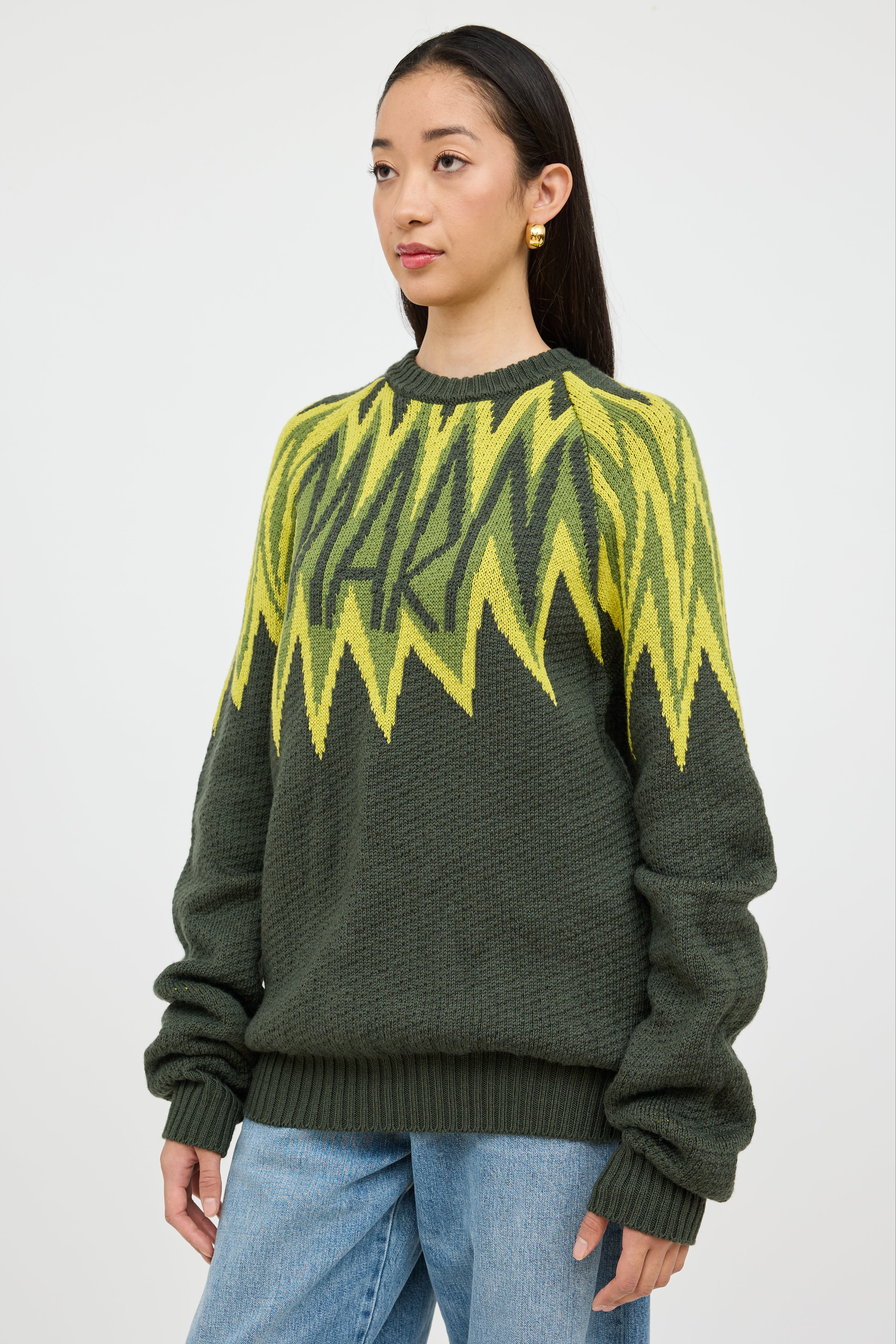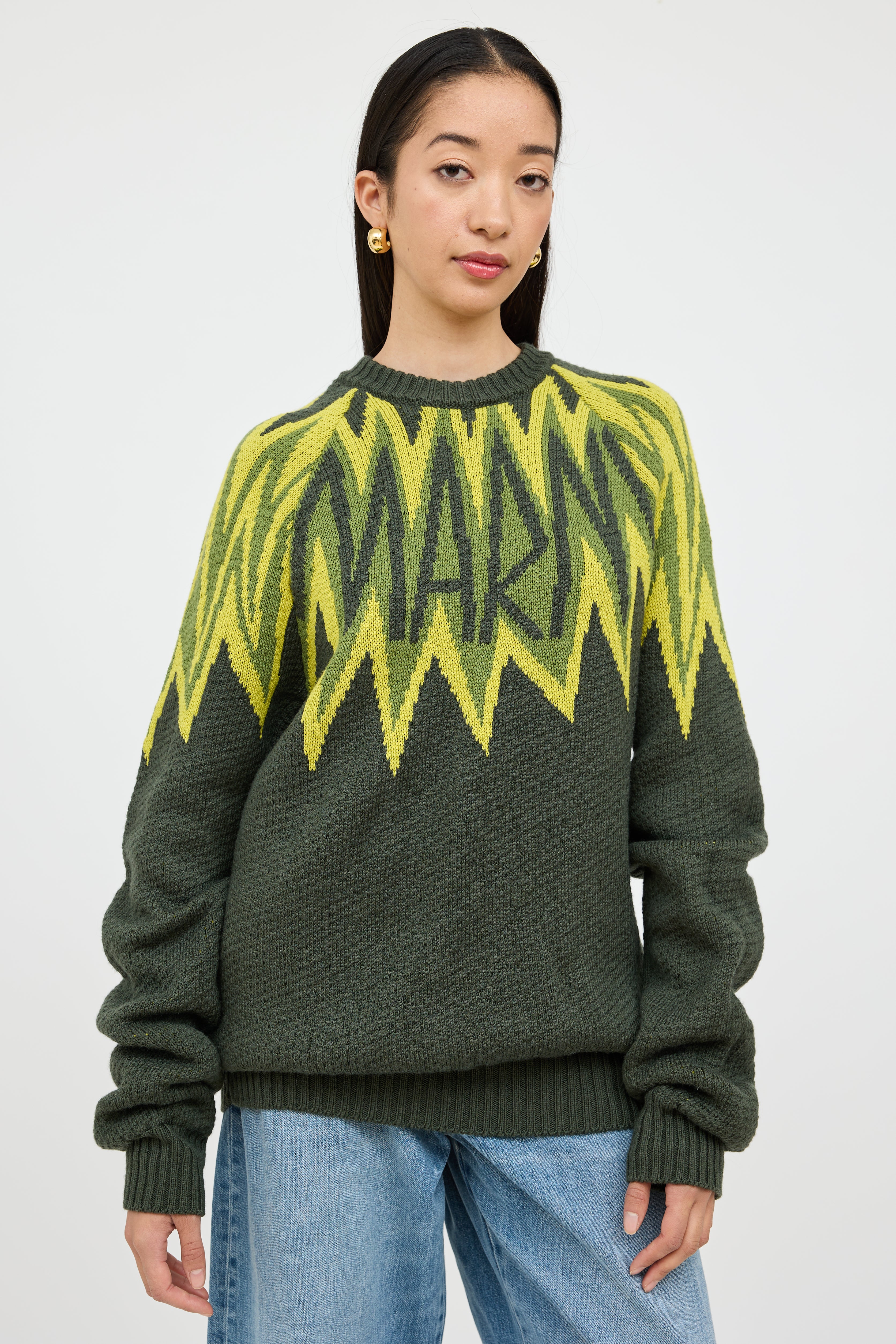 Pre-owned Marni green Fire Island wool knit sweater featuring a tonal woven logo at chest with geometric pattern, round neckline, long raglan sleeves, and ribbed hem.