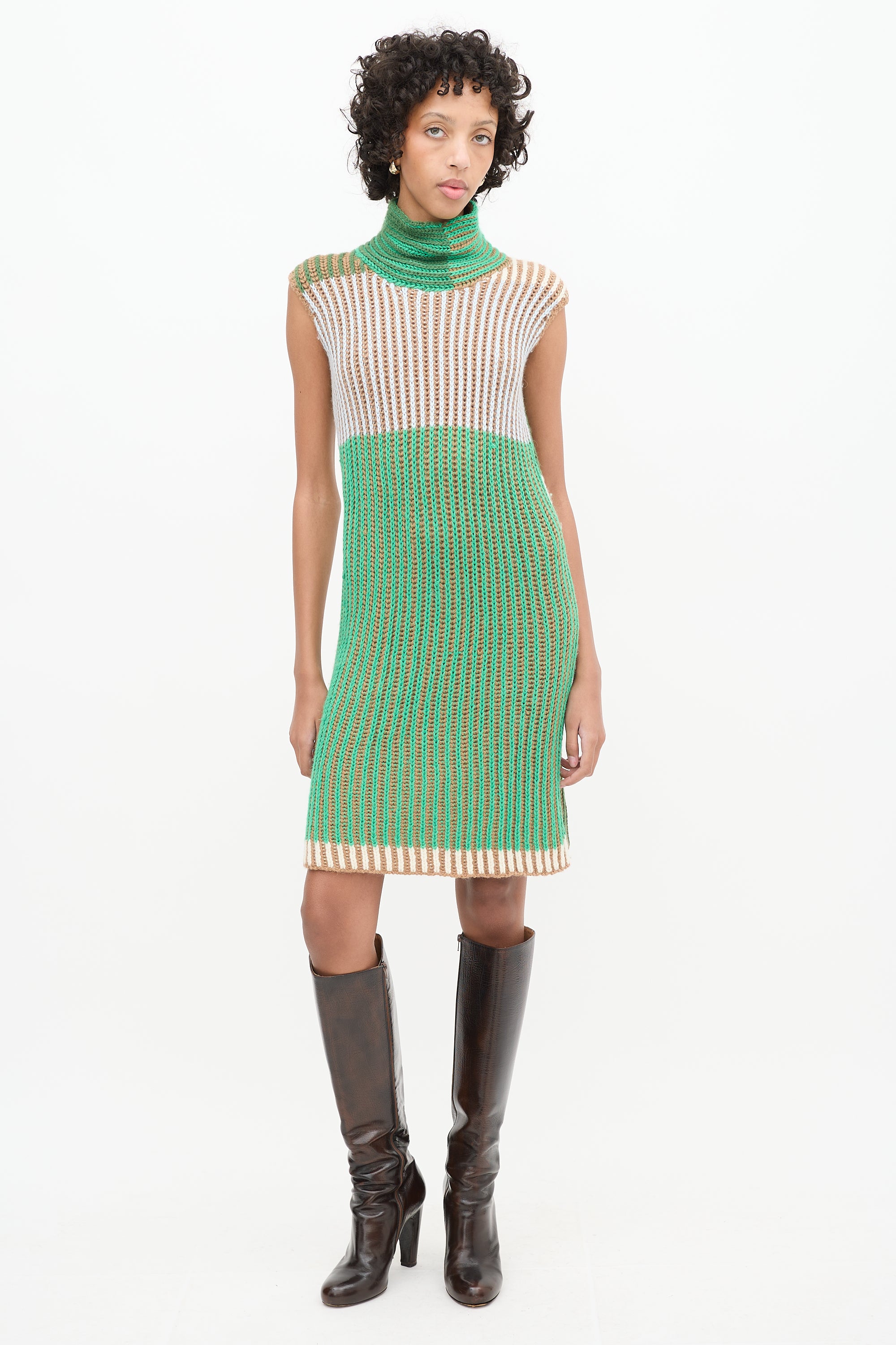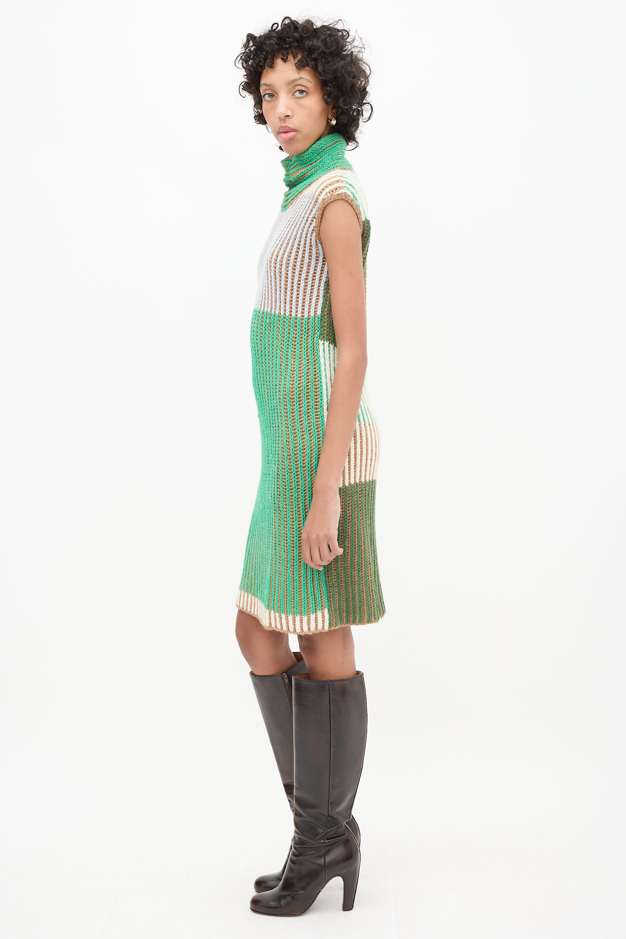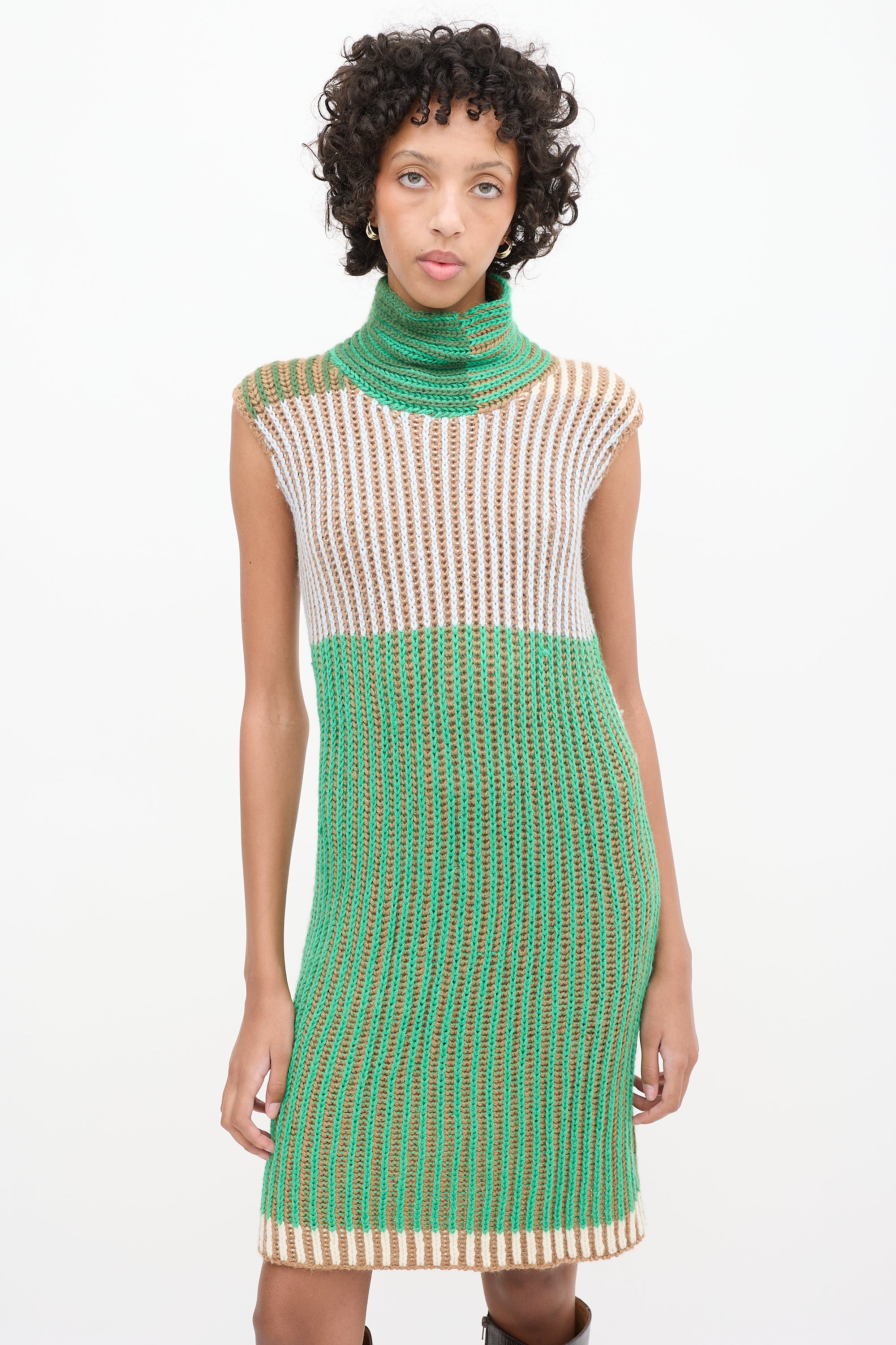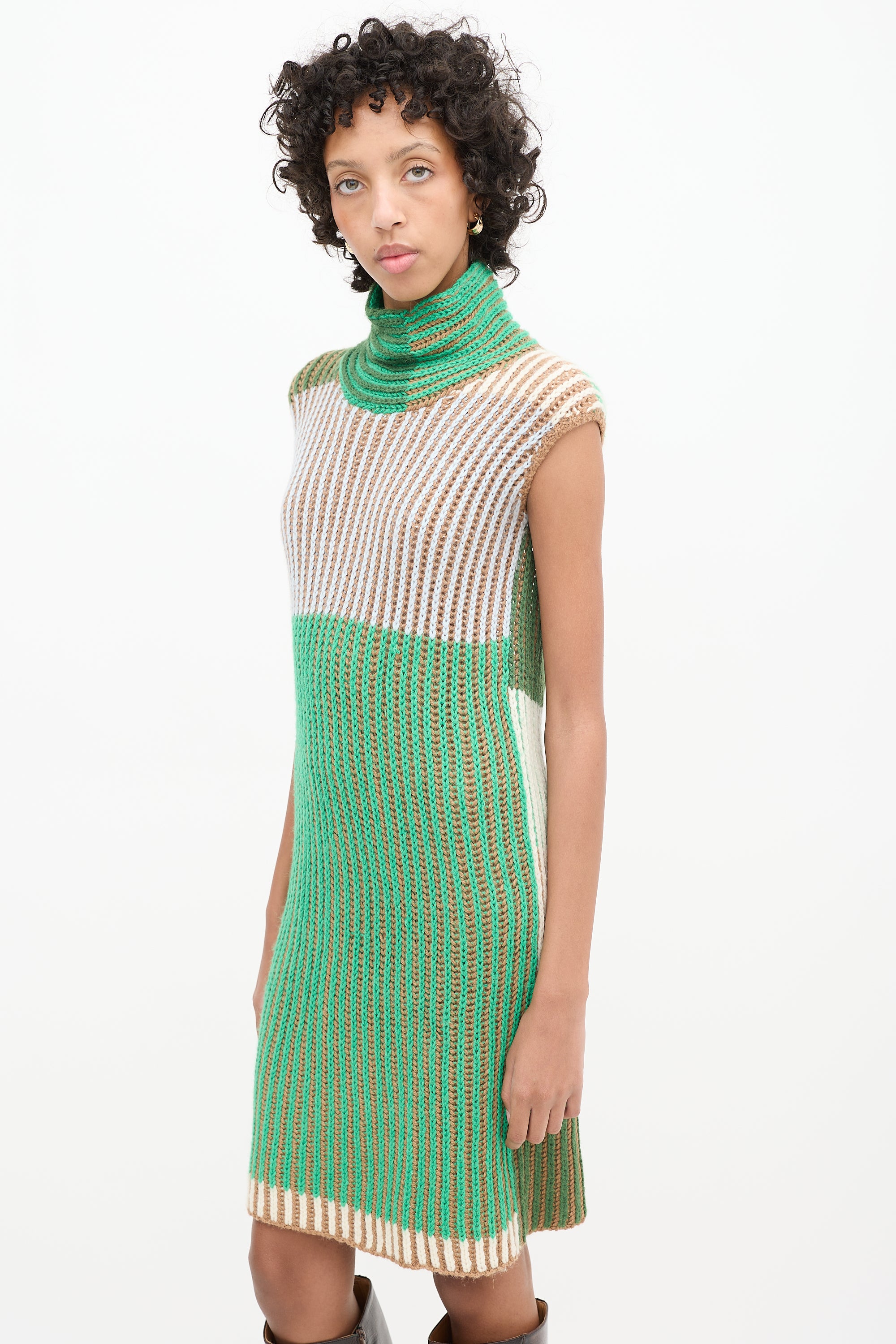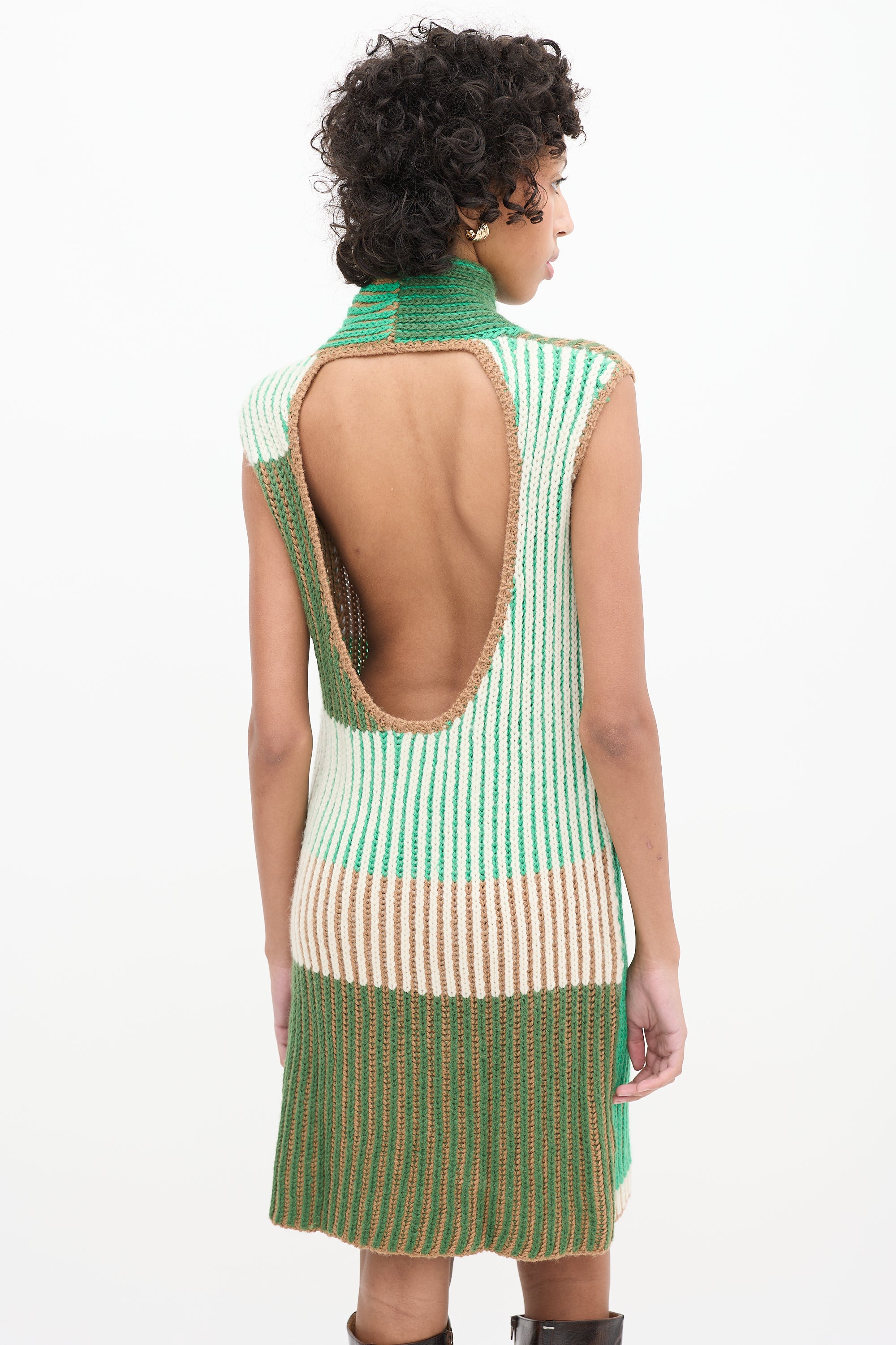 Pre-owned Eckhaus Latta green and multicolour alpaca knit mini dress featuring a high mock neck, sleeveless design, and back cutout.