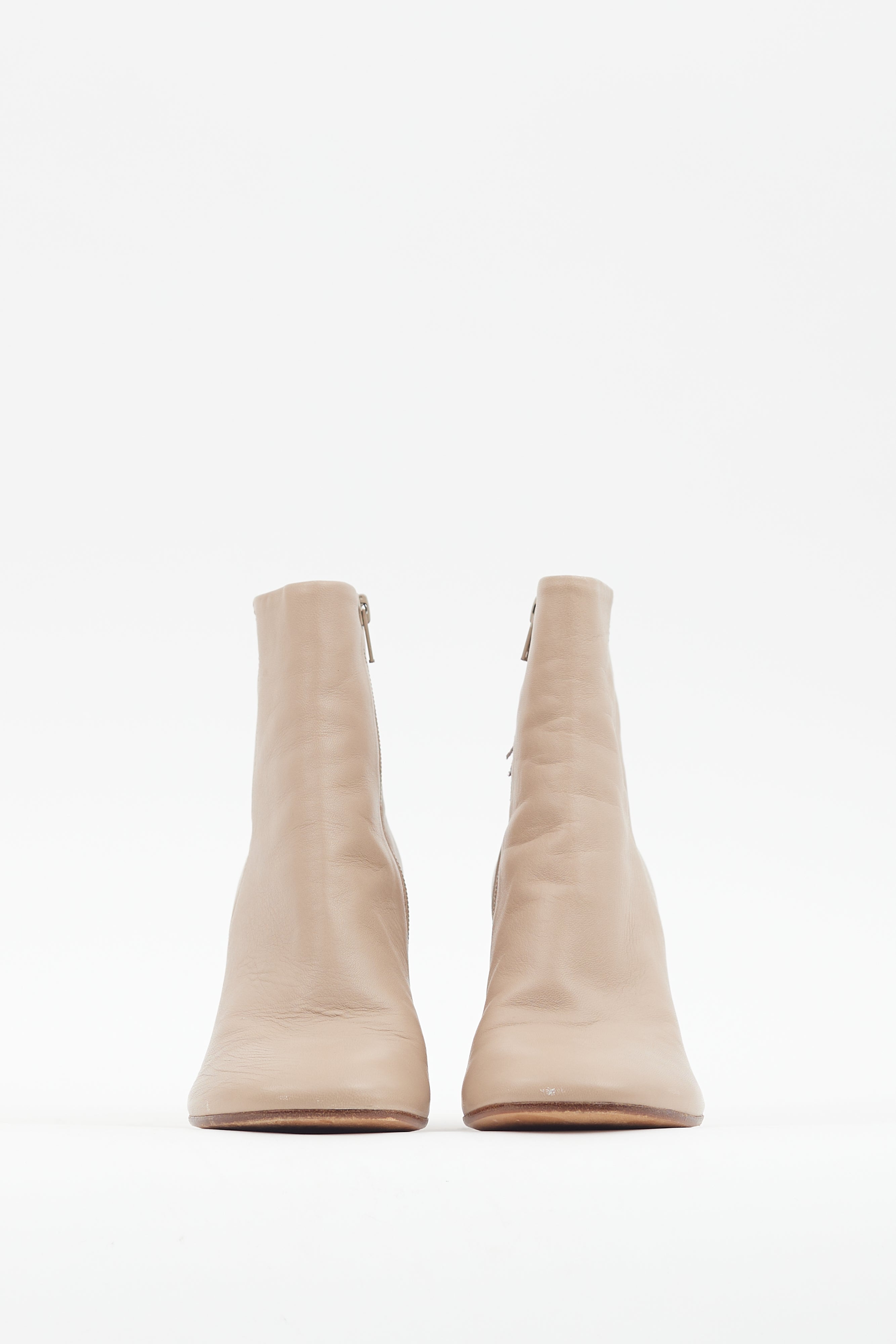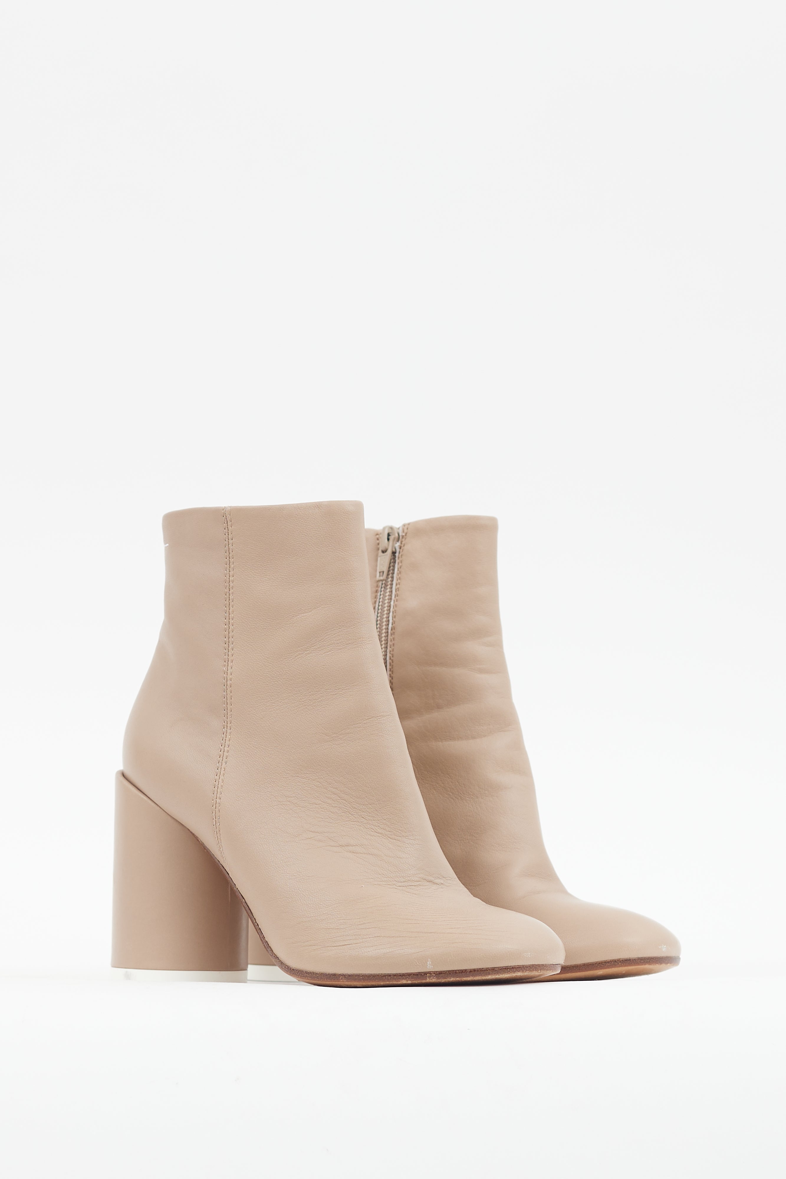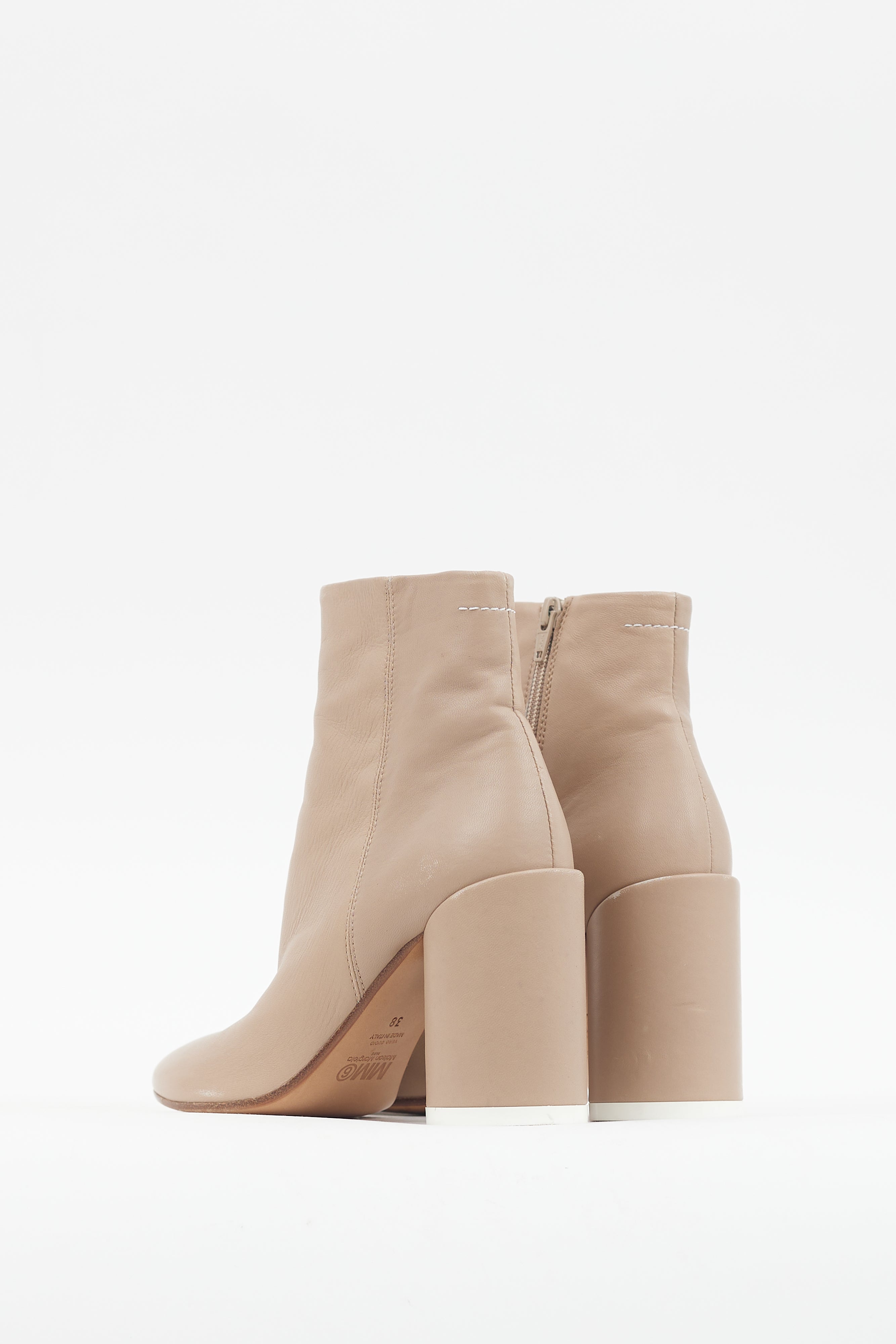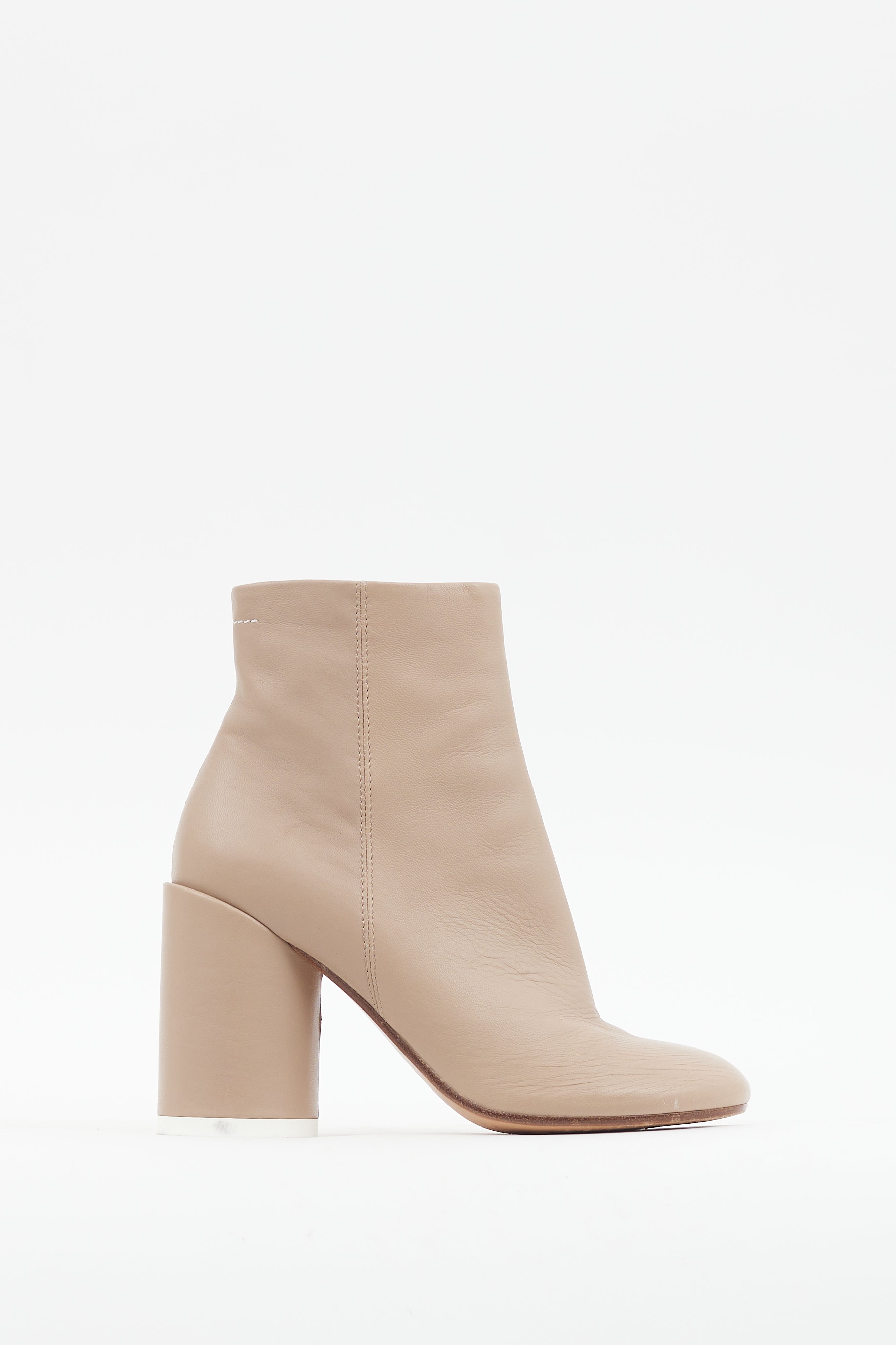 Pre-owned MM6 Maison Margiela beige leather boots featuring a rounded toe, signature white stitching at back collar, inner side zip closure, and cylinder heel with logo stamp at outsole.