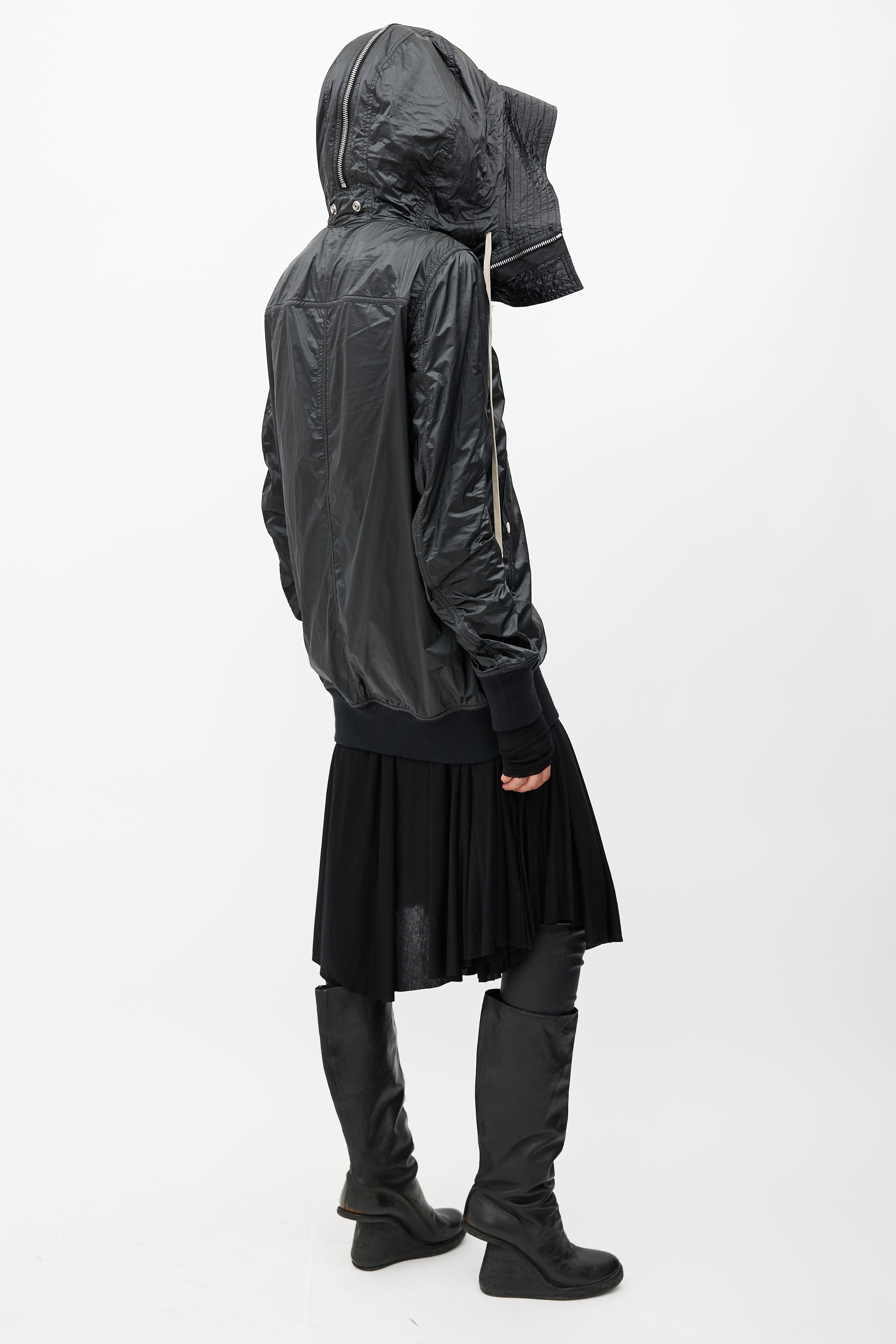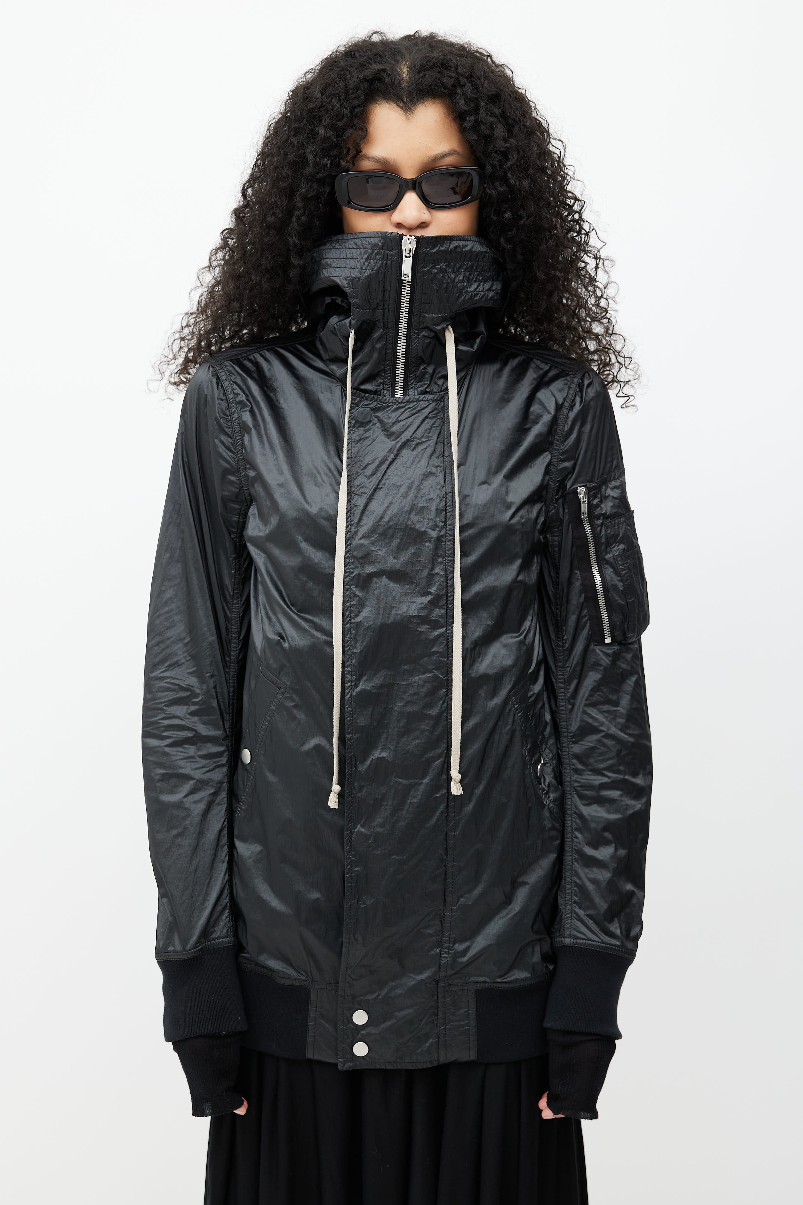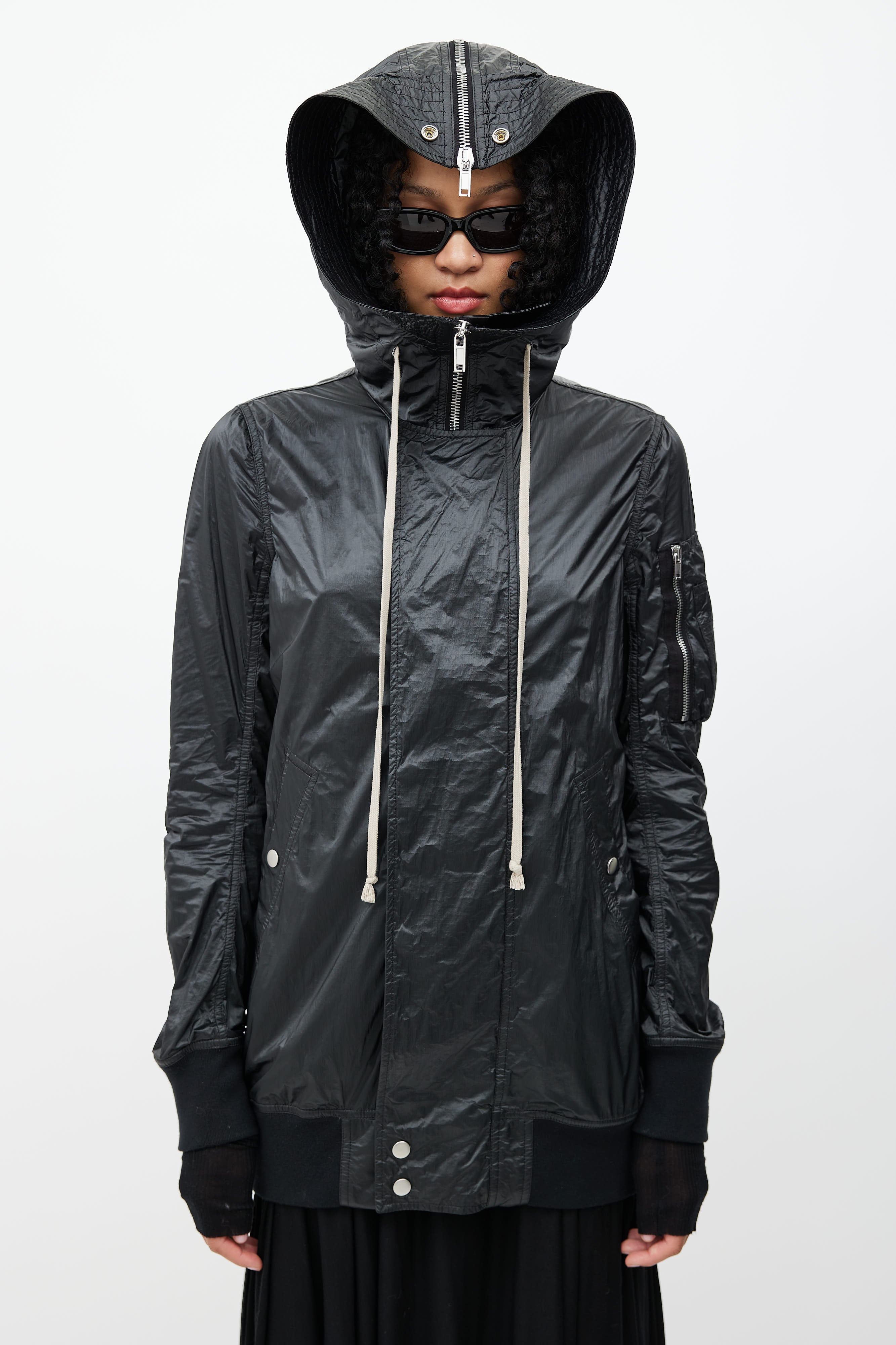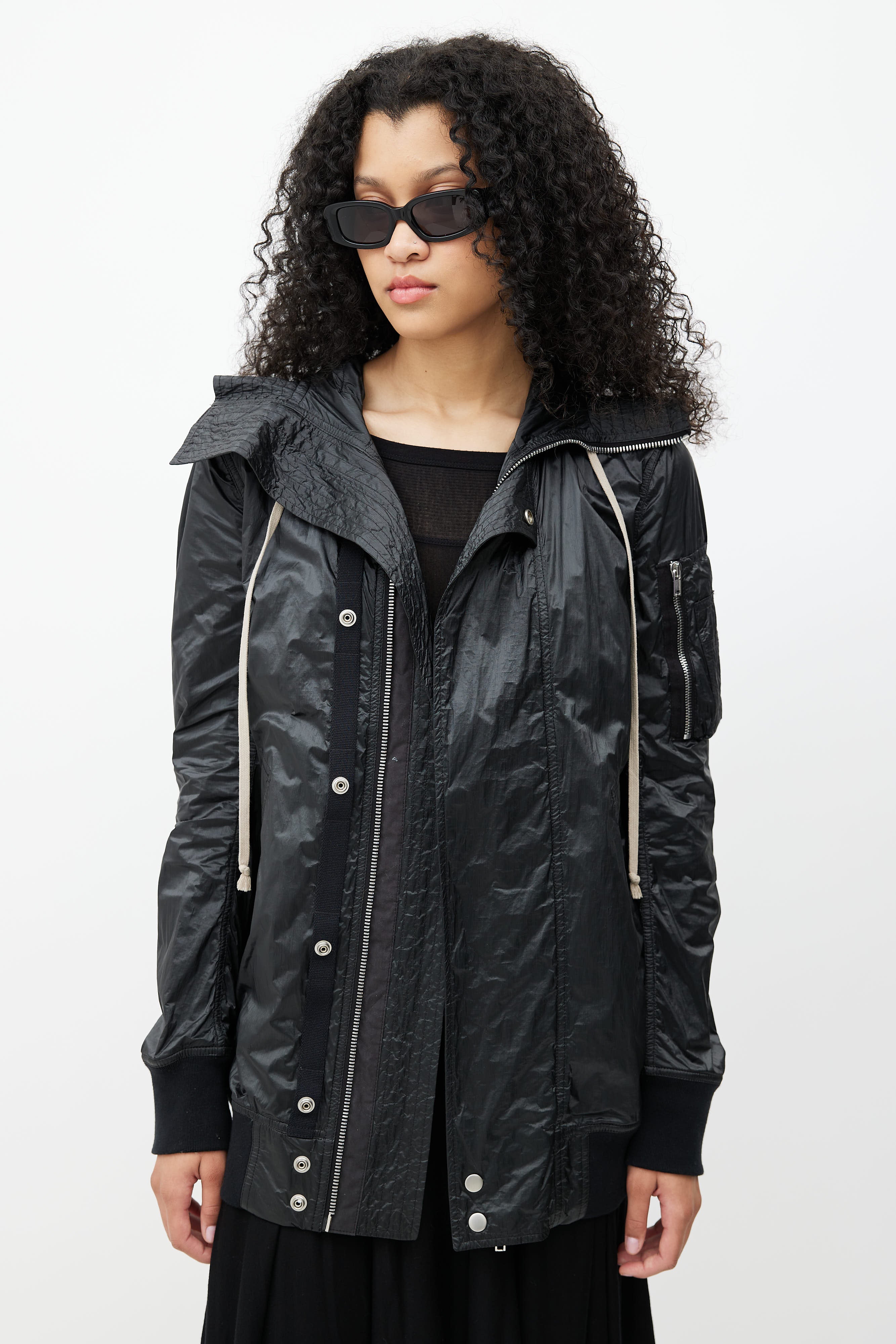 Pre-owned Rick Owens Drkshdw black jacket featuring full zip closure with snap buttons fastening, zip pocket at sleeve, attached convertible hood with zip fastening, taupe long drawstring, two snap buttoned pocket, and ribbed hem and cuffs.