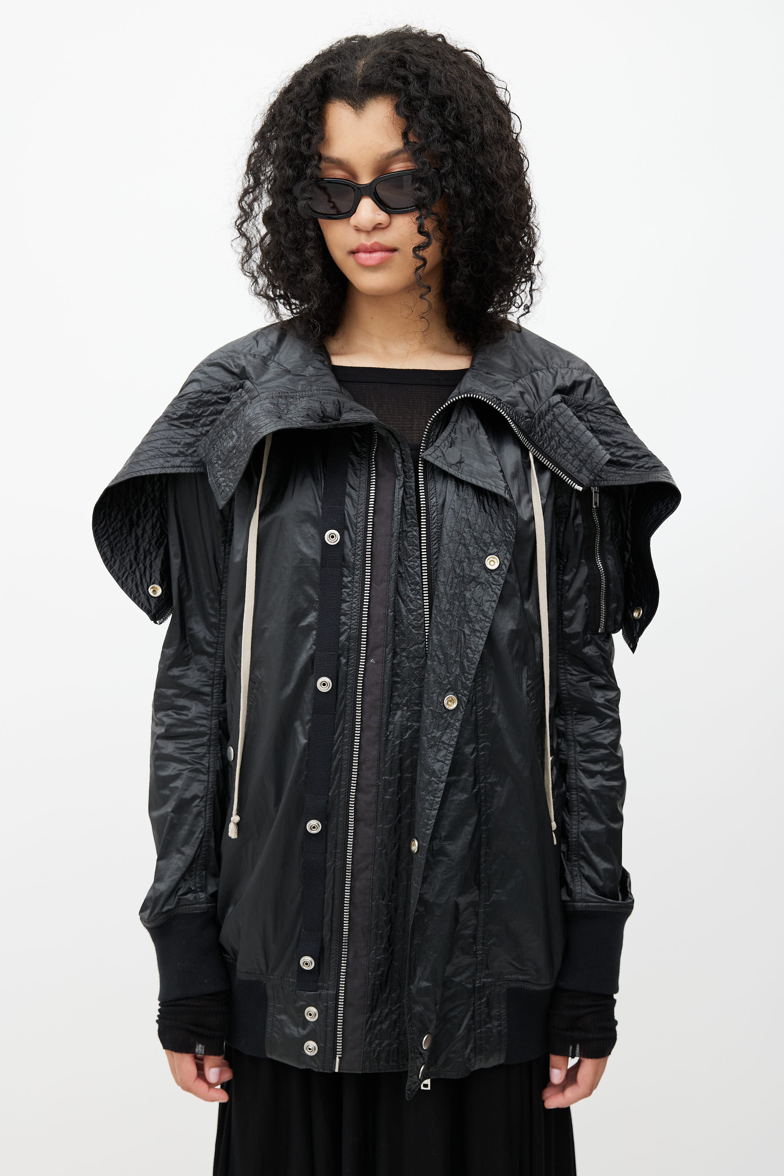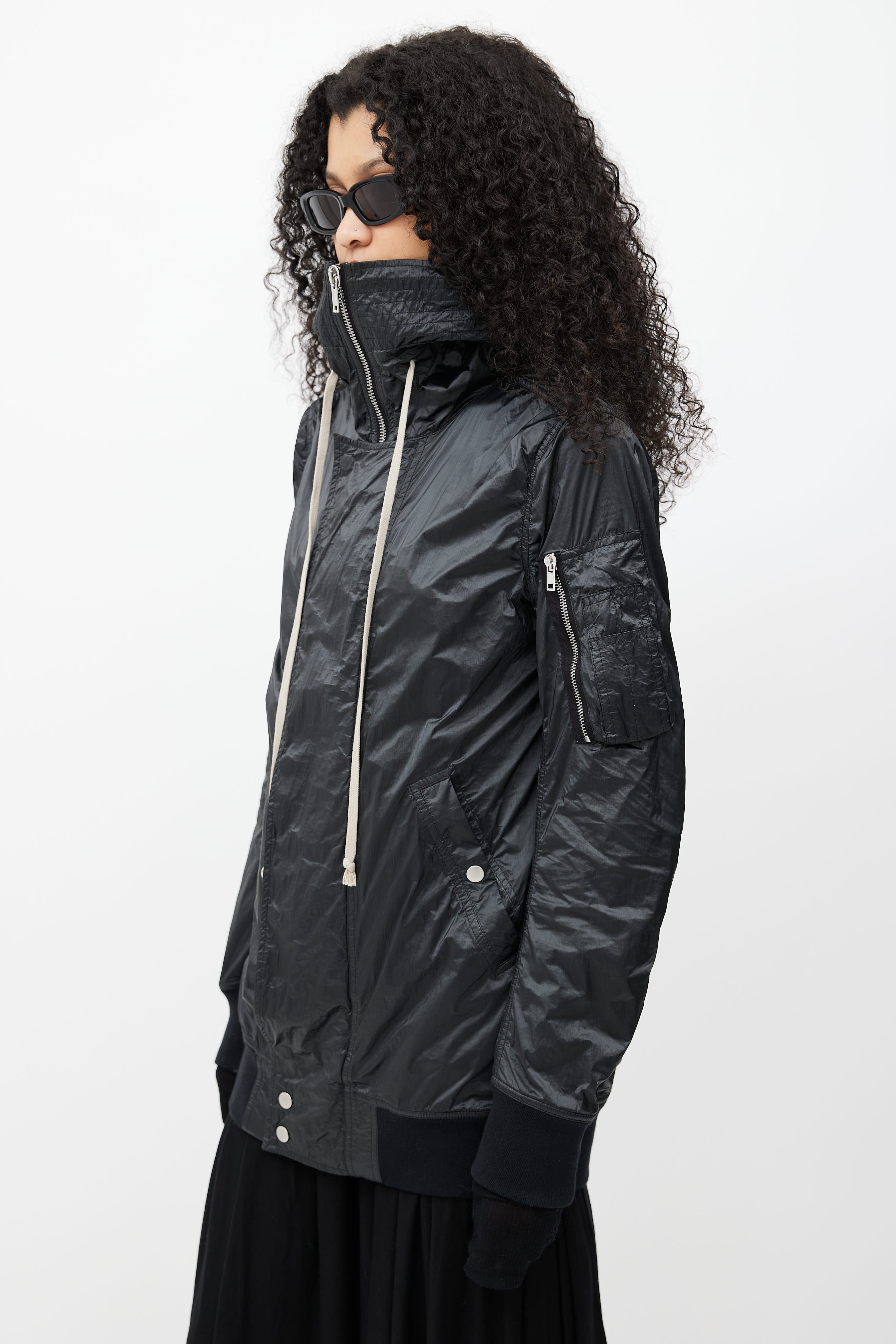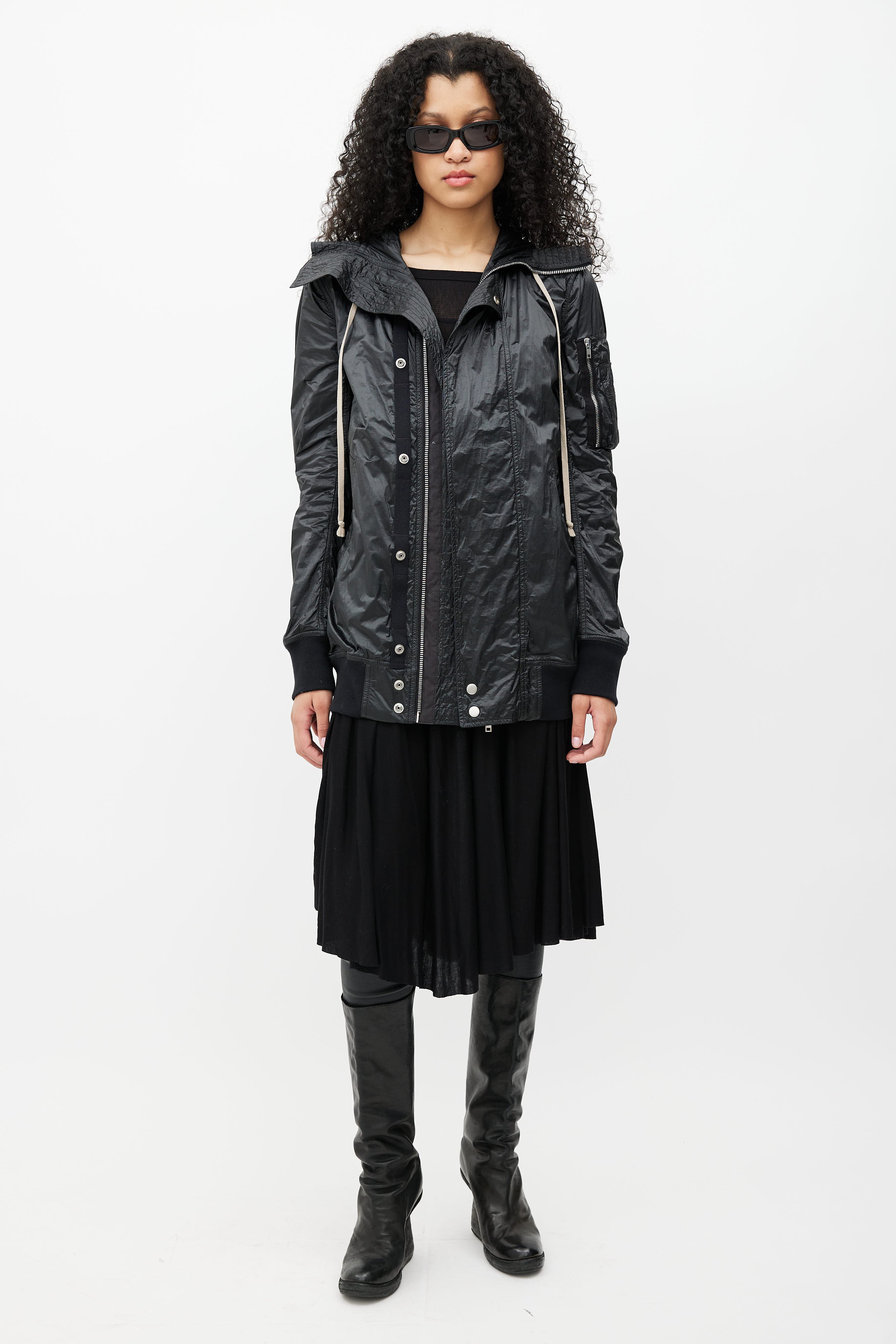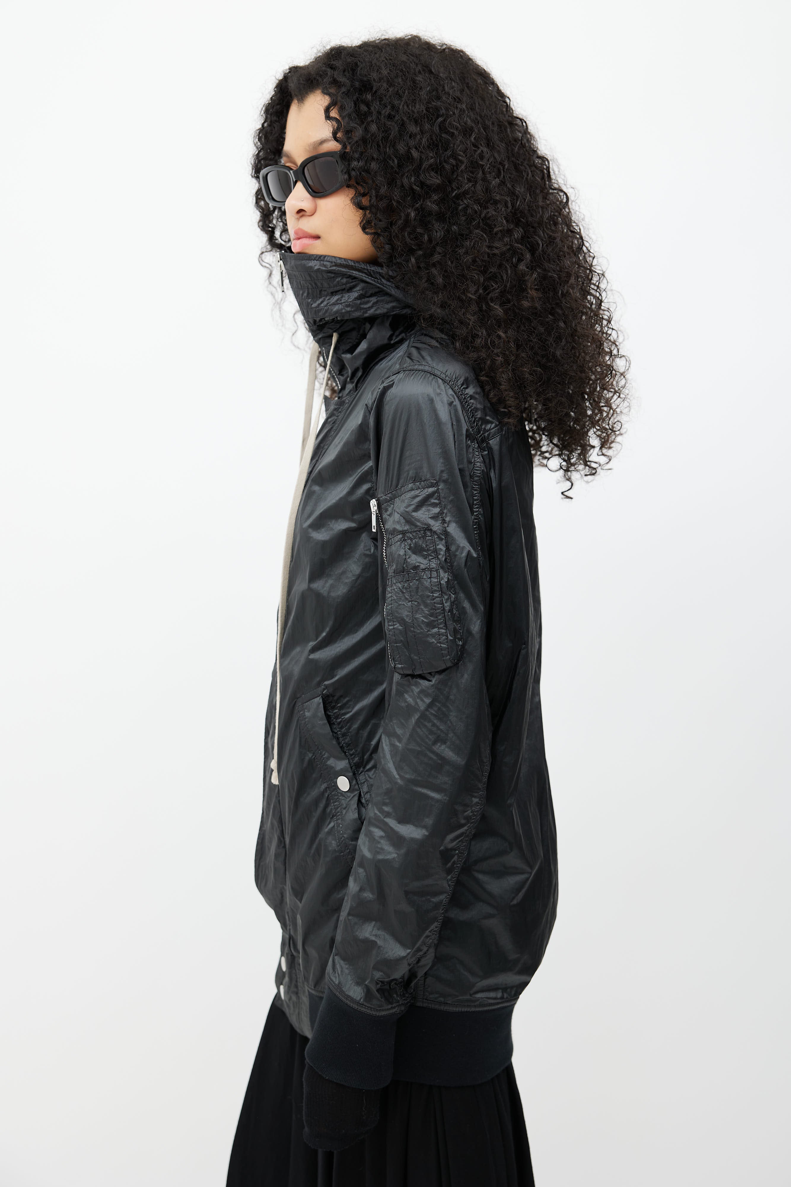 Pre-owned Rick Owens Drkshdw black jacket featuring full zip closure with snap buttons fastening, zip pocket at sleeve, attached convertible hood with zip fastening, taupe long drawstring, two snap buttoned pocket, and ribbed hem and cuffs.