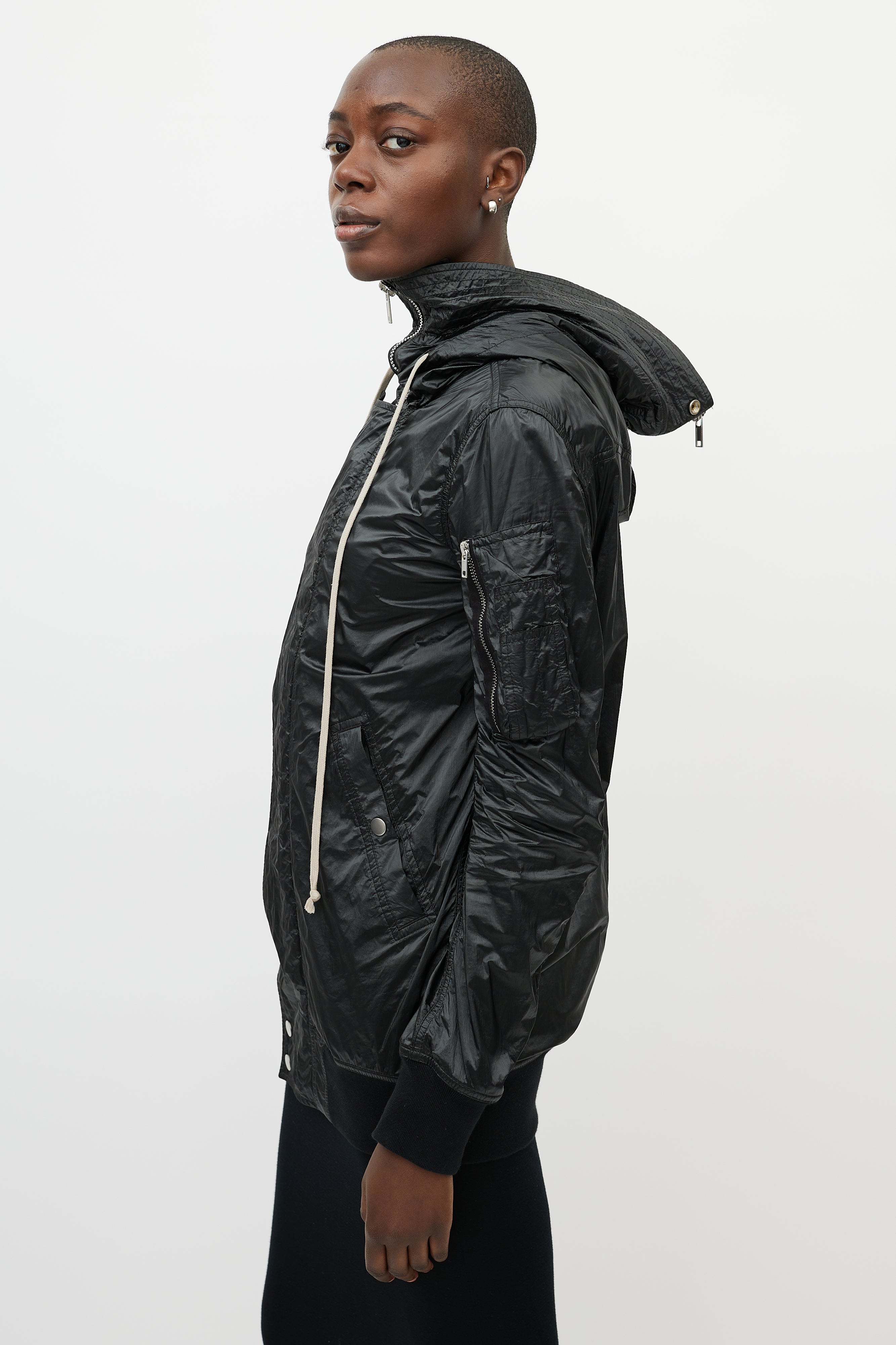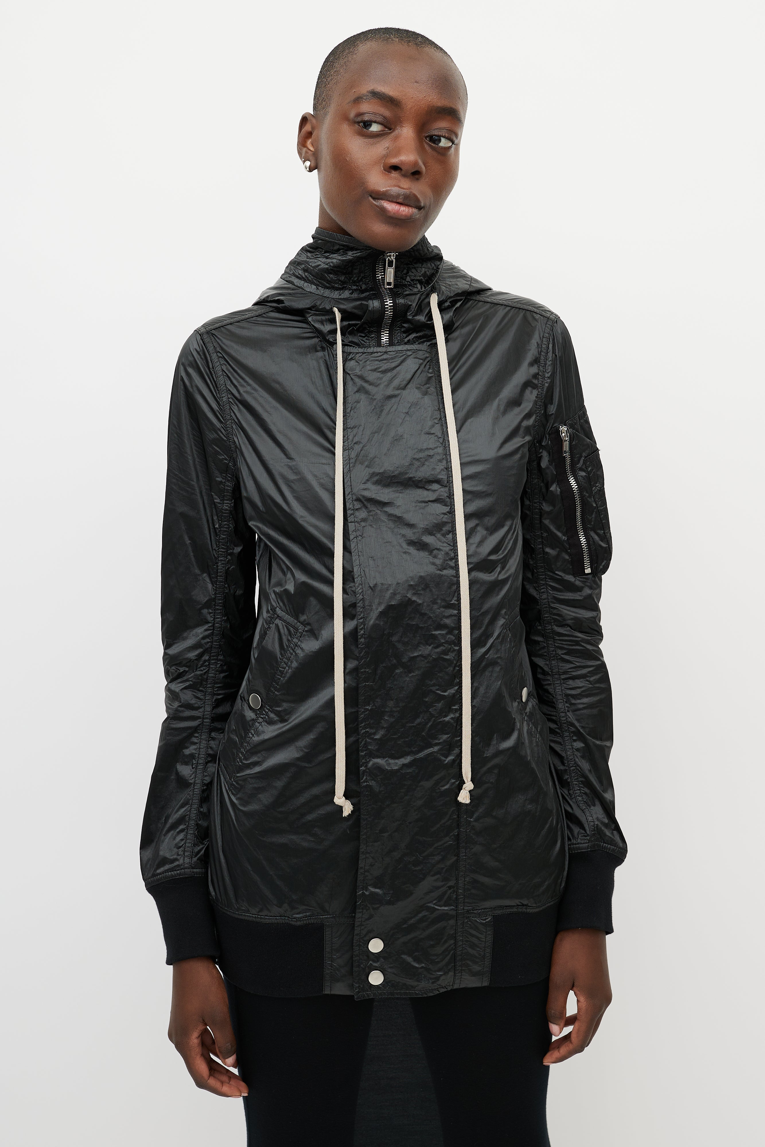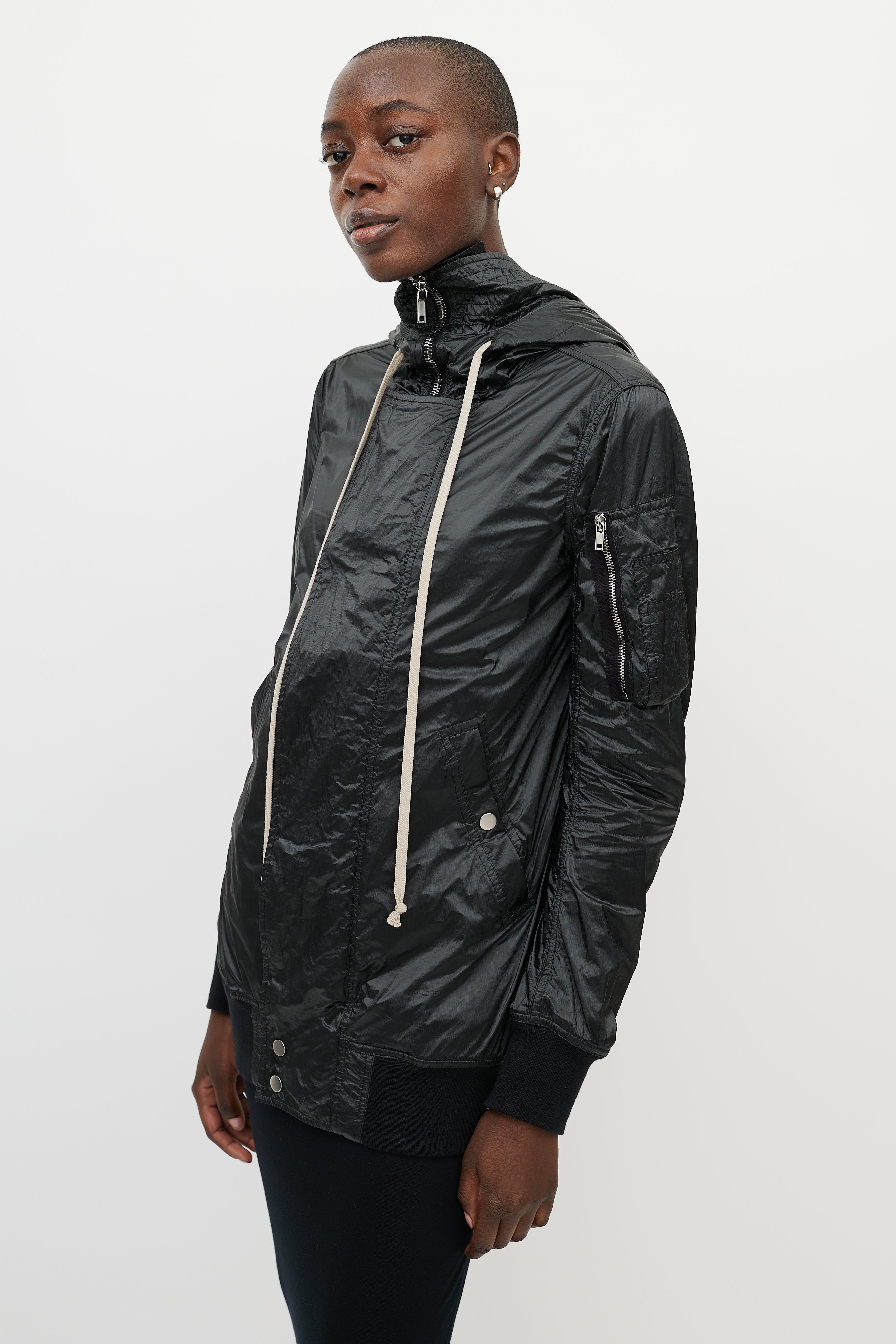 Pre-owned Rick Owens DRKSHDW black shiny nylon jacket featuring zip up hood, silver tone hardware, front zip with snap closures, storm cuffs, two snap closure pockets at waist, and long beige pull strings at hood.