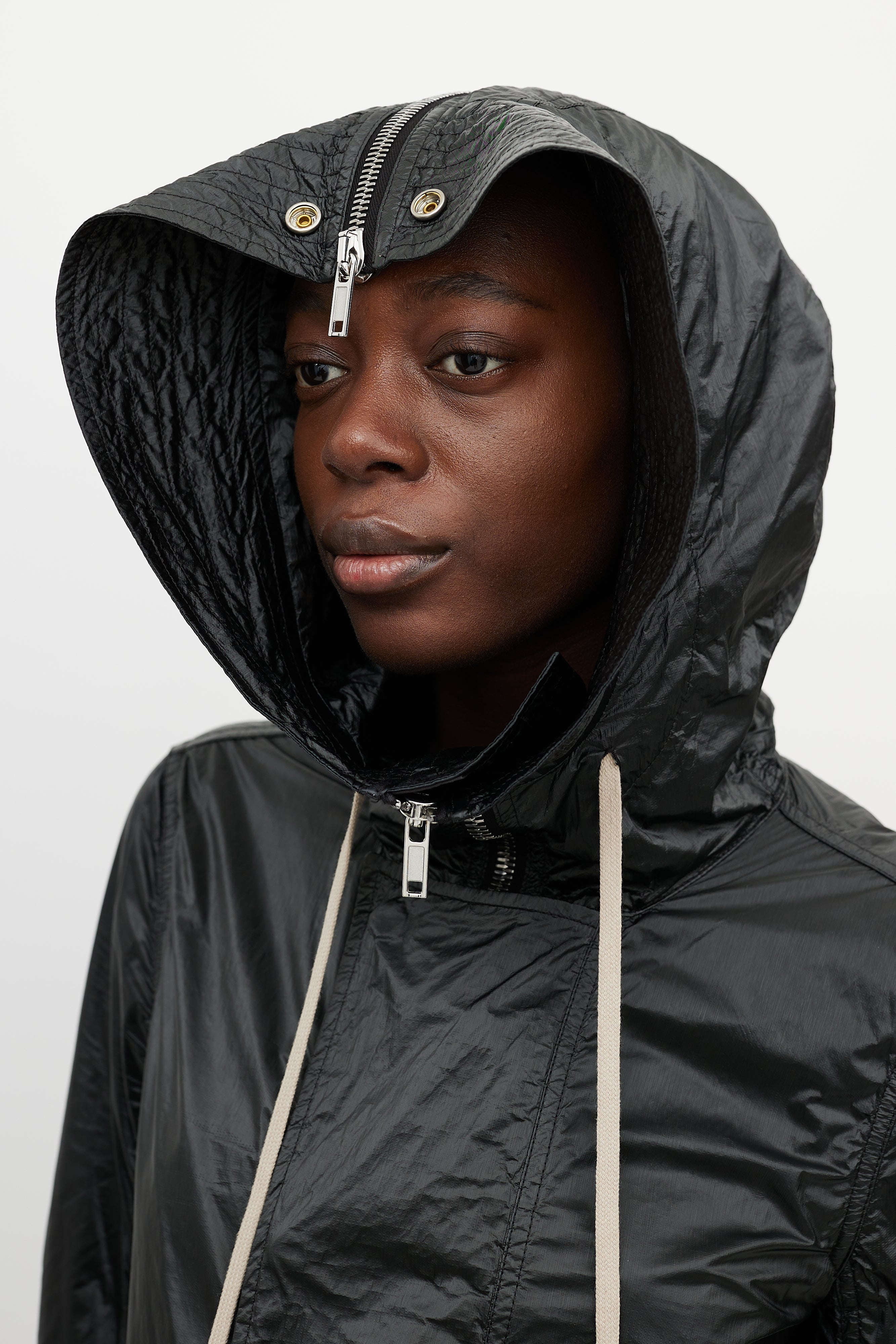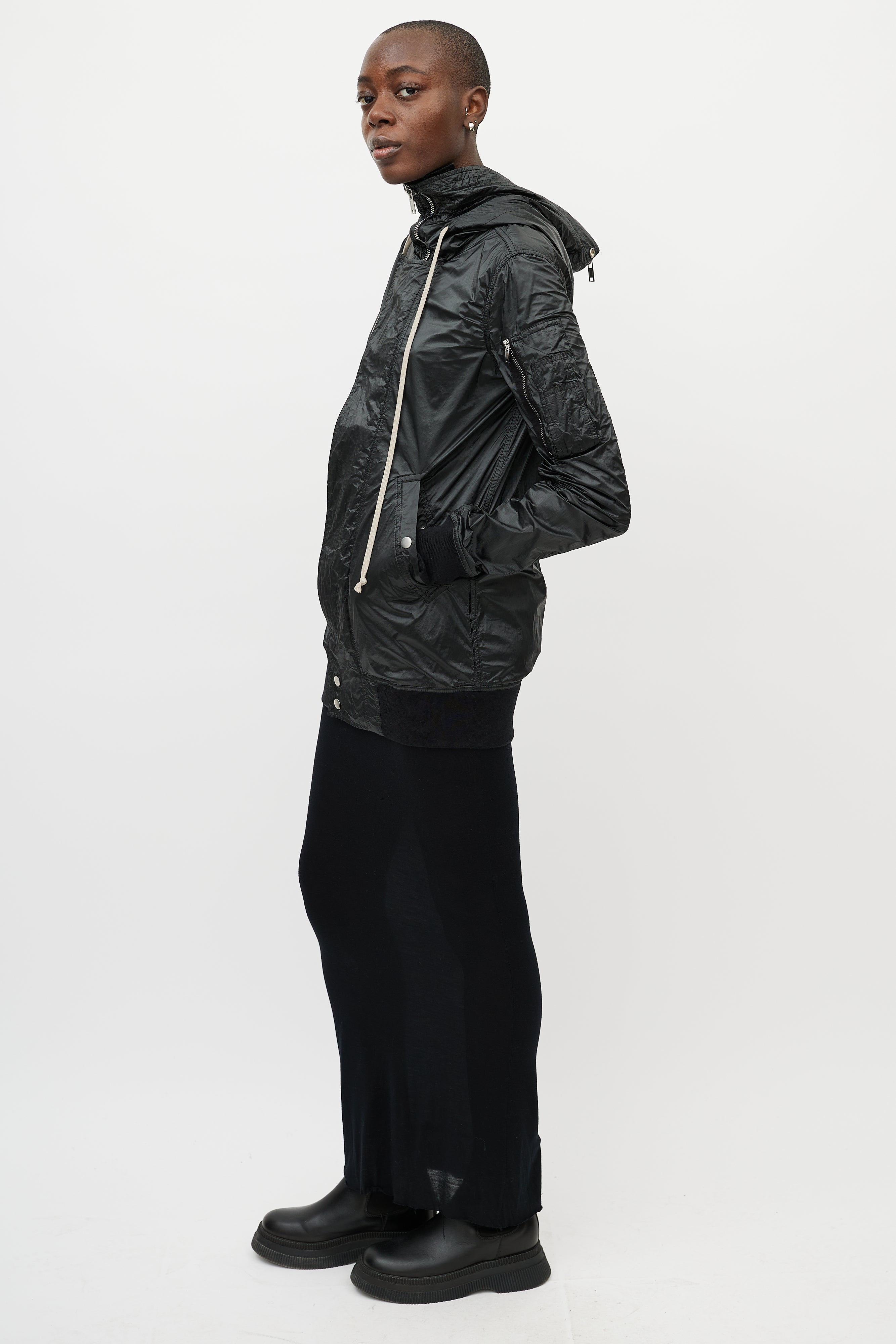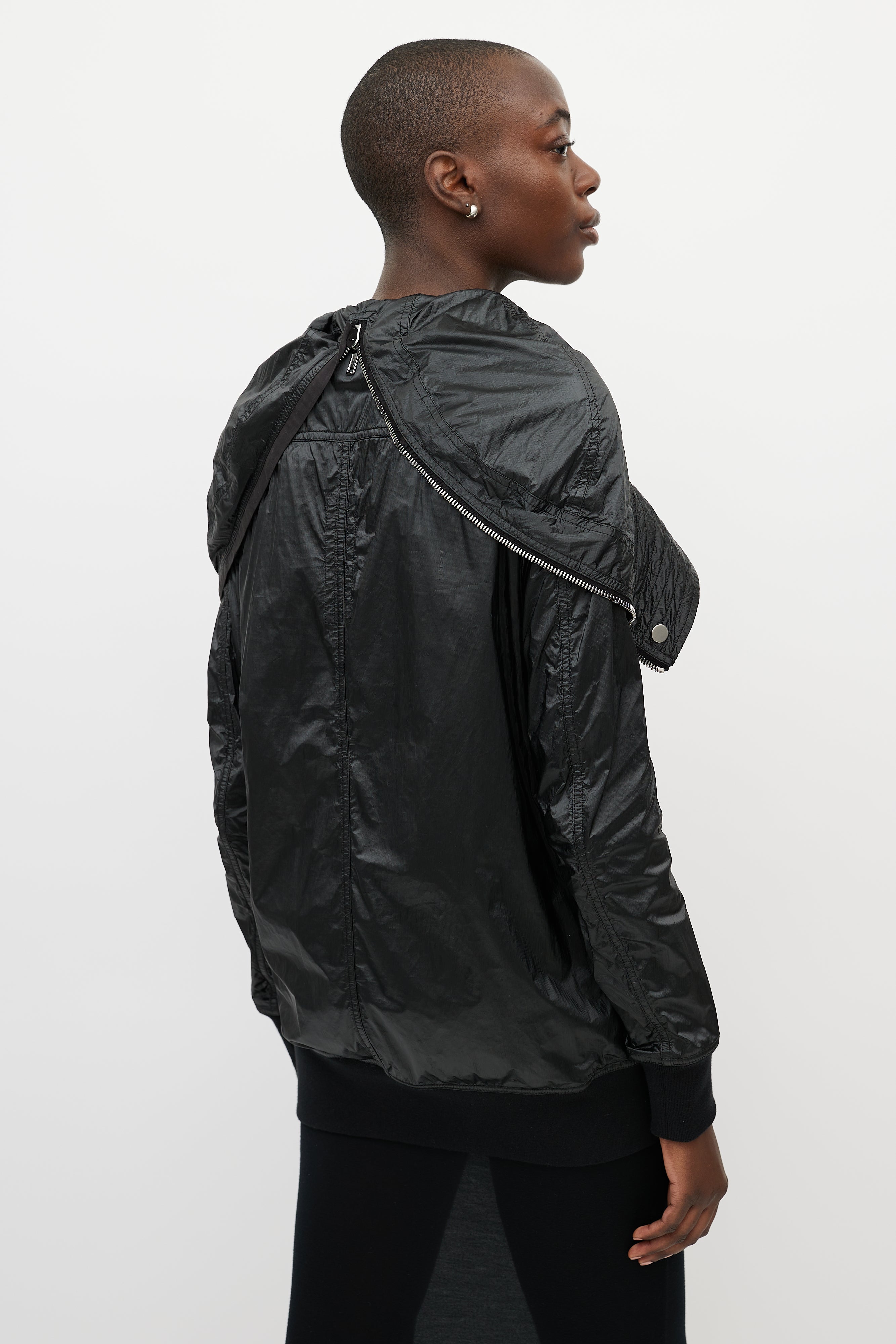 Pre-owned Rick Owens DRKSHDW black shiny nylon jacket featuring zip up hood, silver tone hardware, front zip with snap closures, storm cuffs, two snap closure pockets at waist, and long beige pull strings at hood.