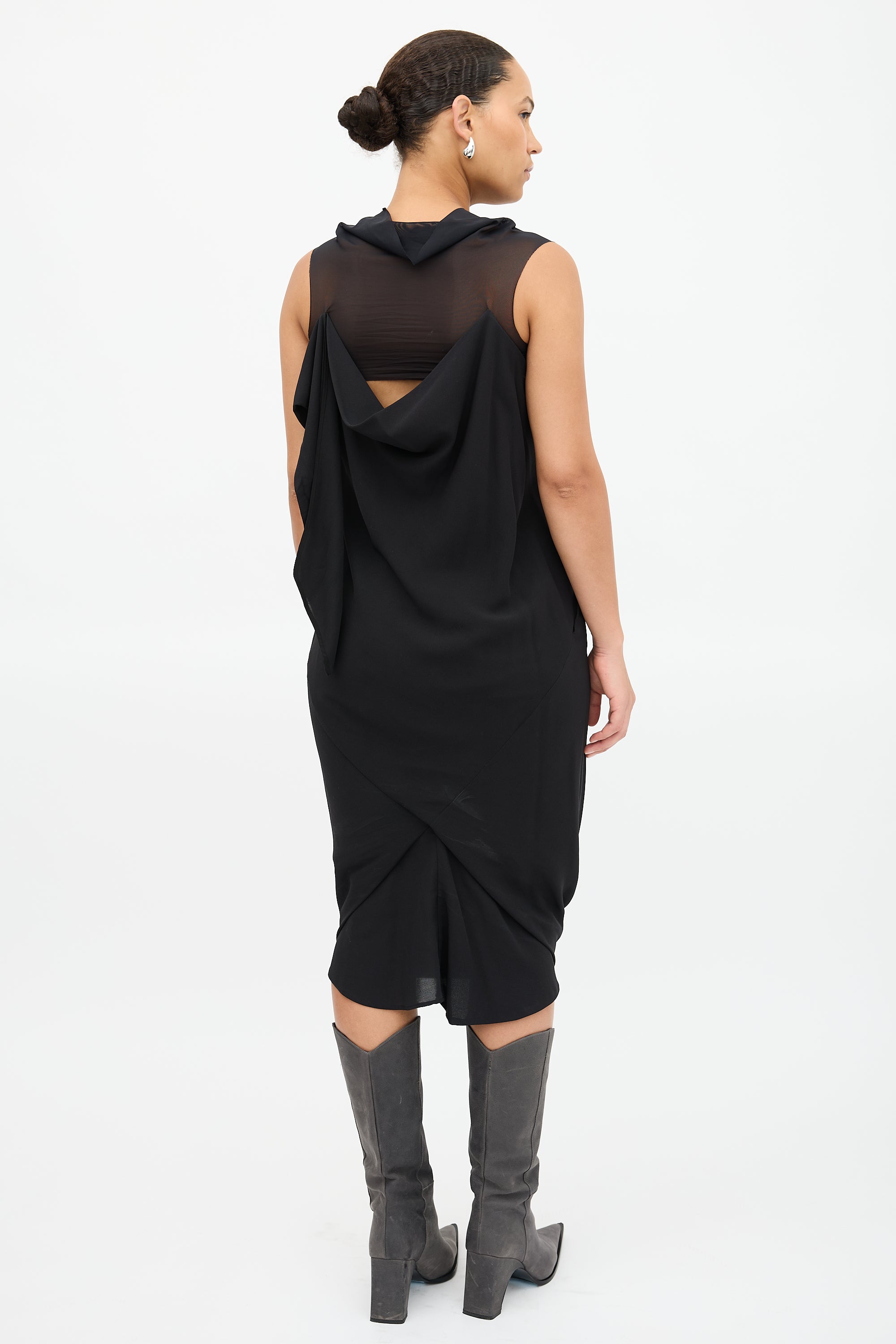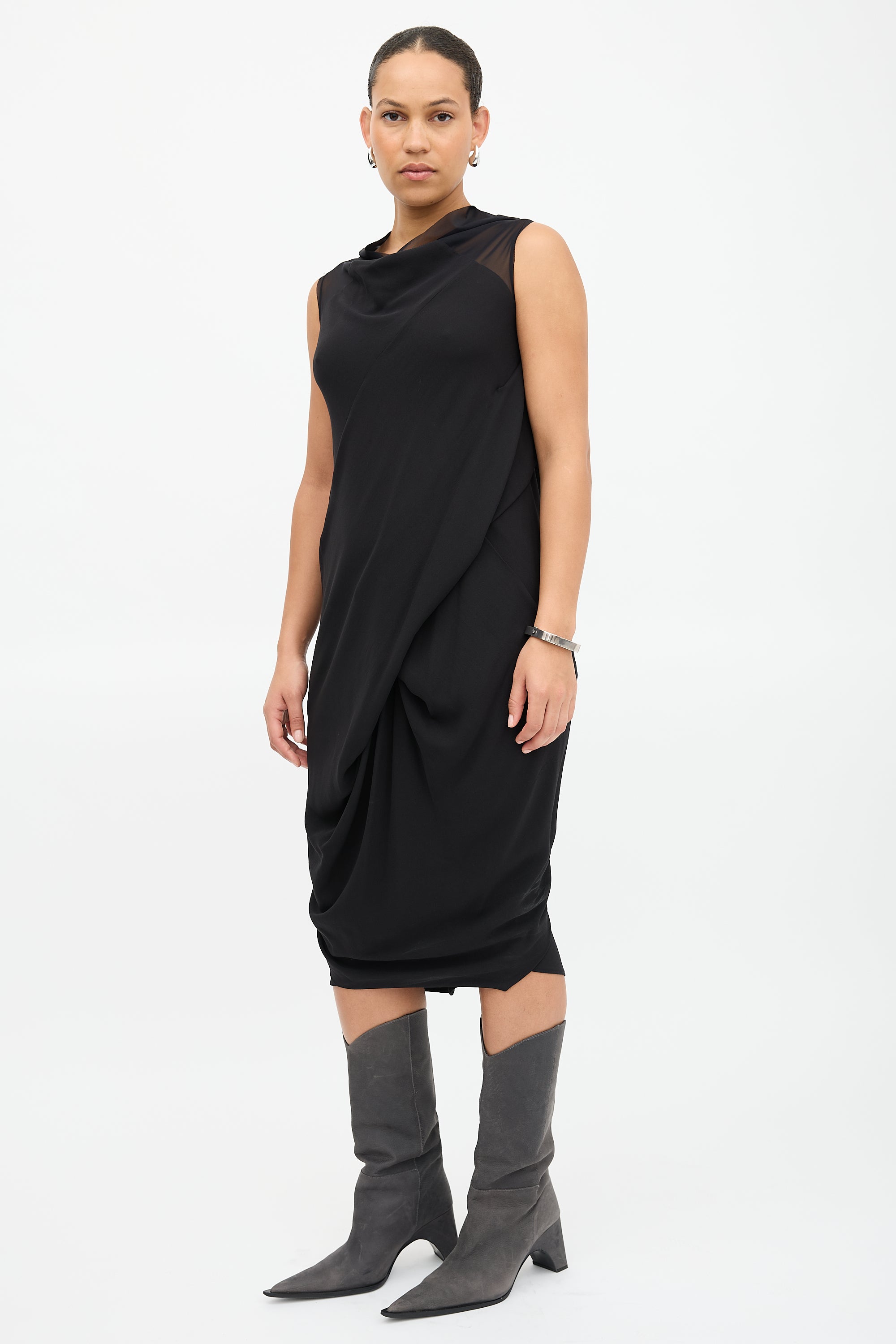 Pre-owned Rick Owens SS 2008 black silk dress featuring asymmetrical drape, two concealed hip pockets, stretch mesh shoulders, and cutout at back. From the Creatch collection.