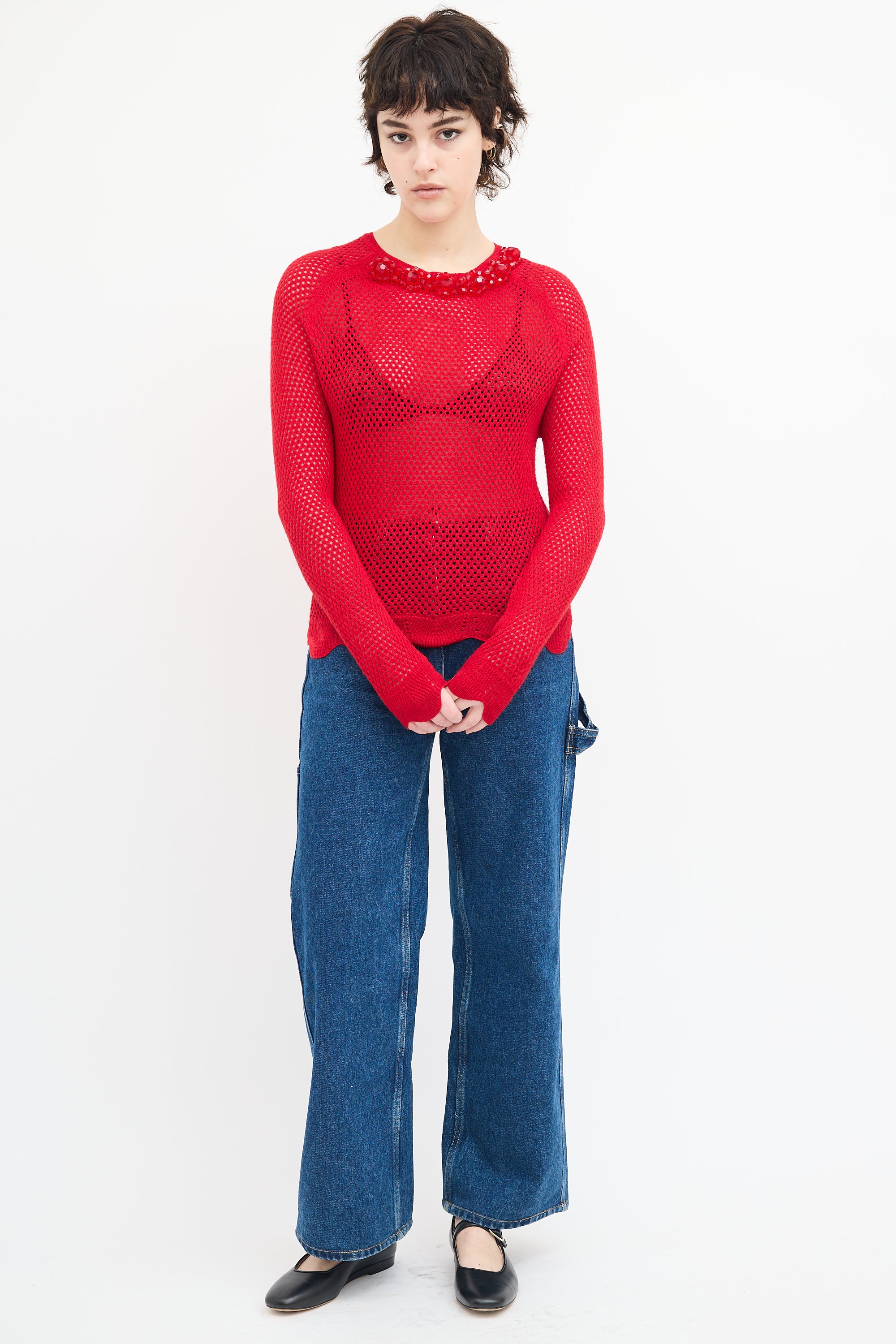Red Wool Knit Mesh Embellished Sweater Large Size Guide