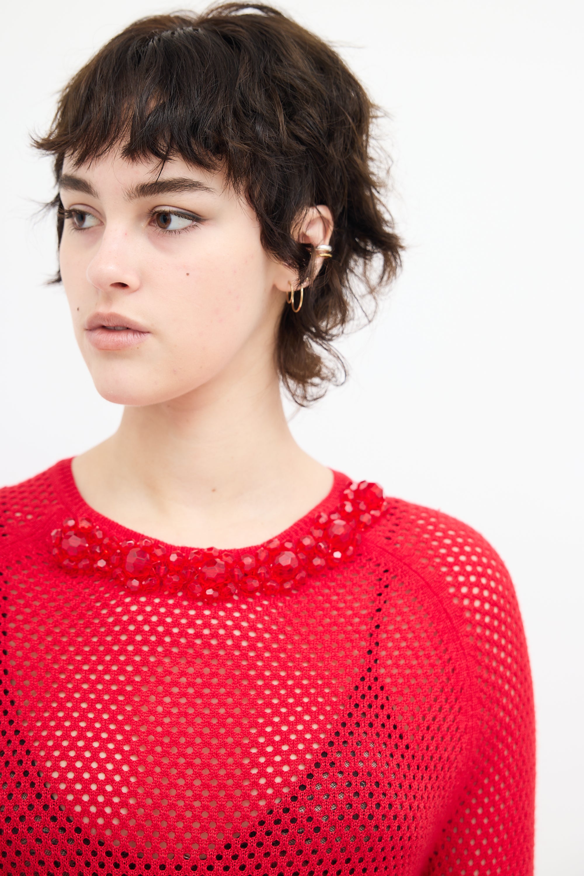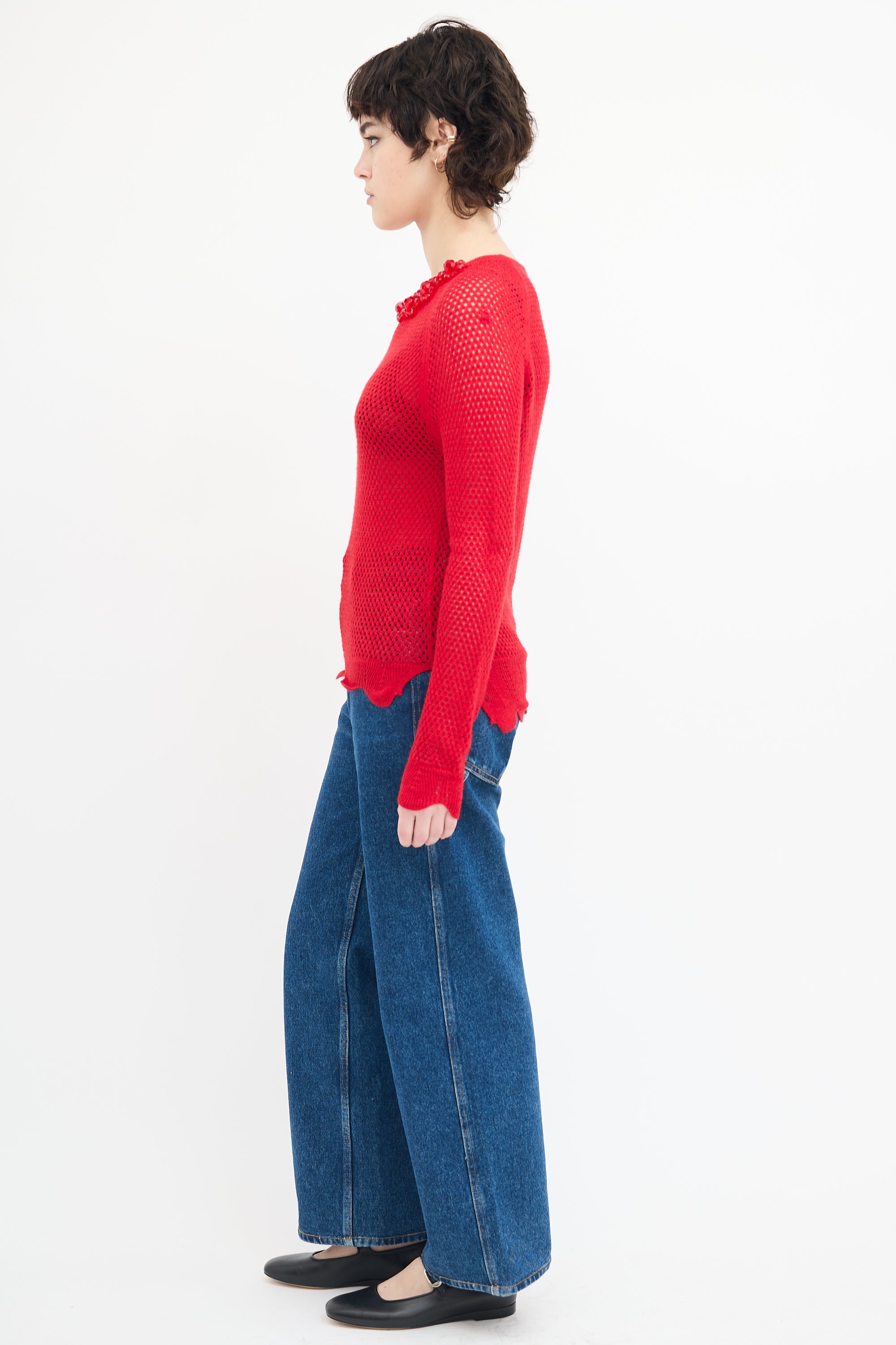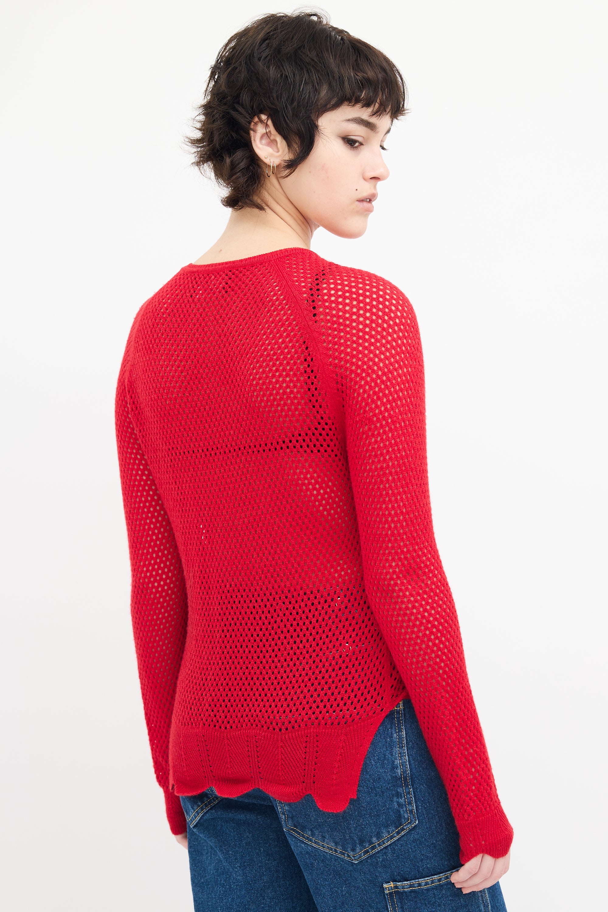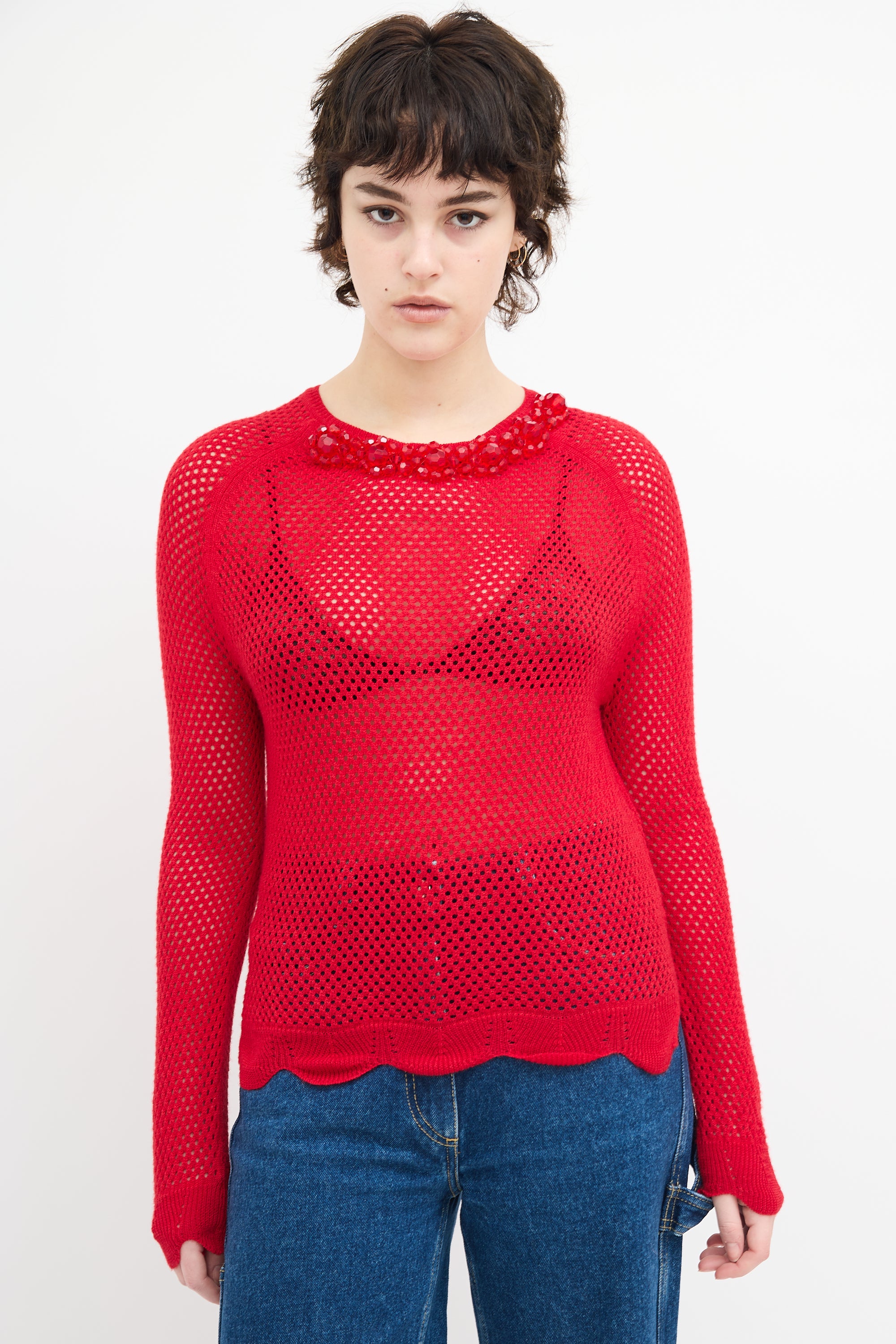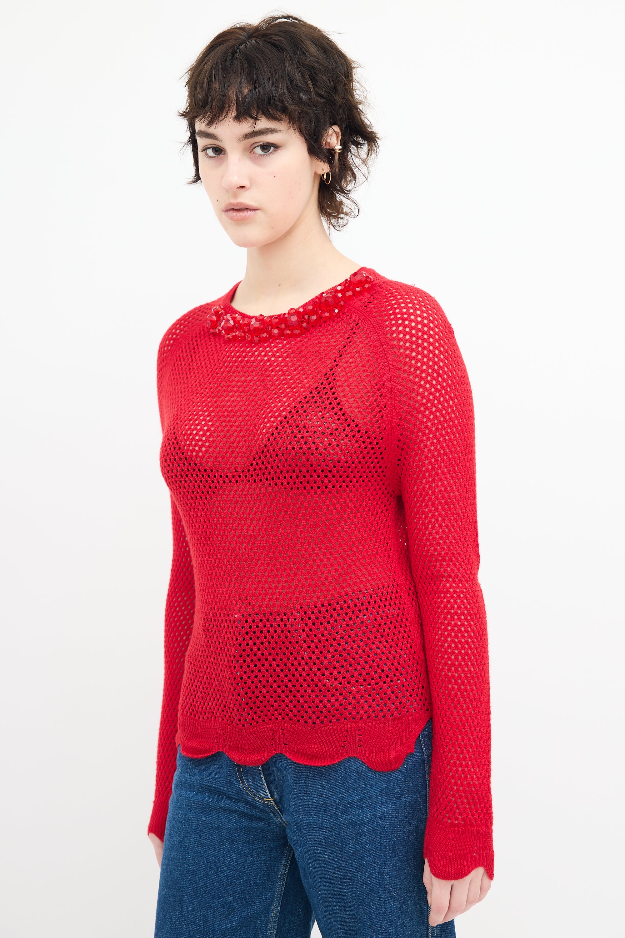 Pre-owned Simone Rocha red wool and silk blend knit mesh sweater featuring a round neckline, tonal beaded collar embellishment, side vents, and scalloped hem and cuffs.