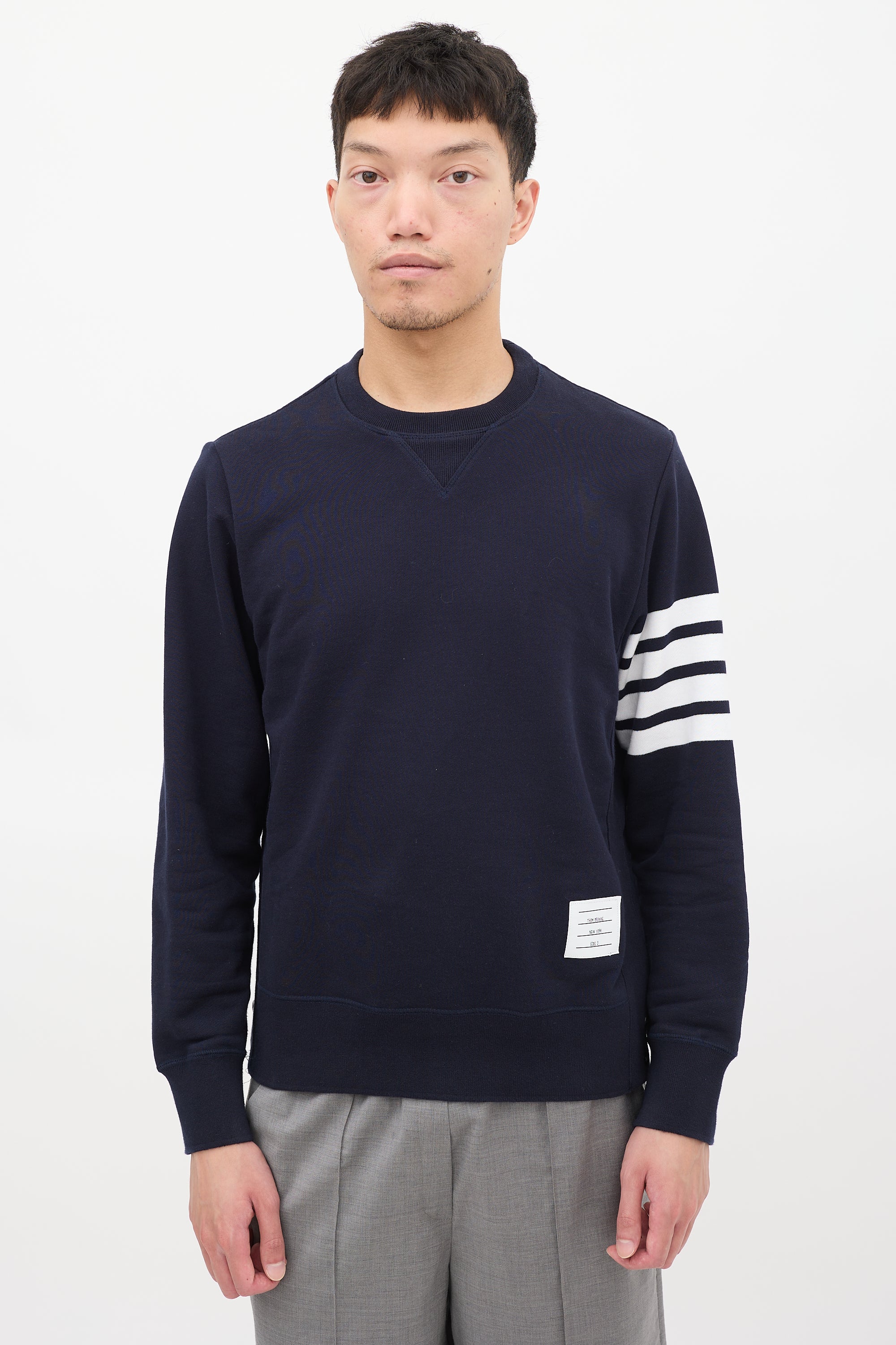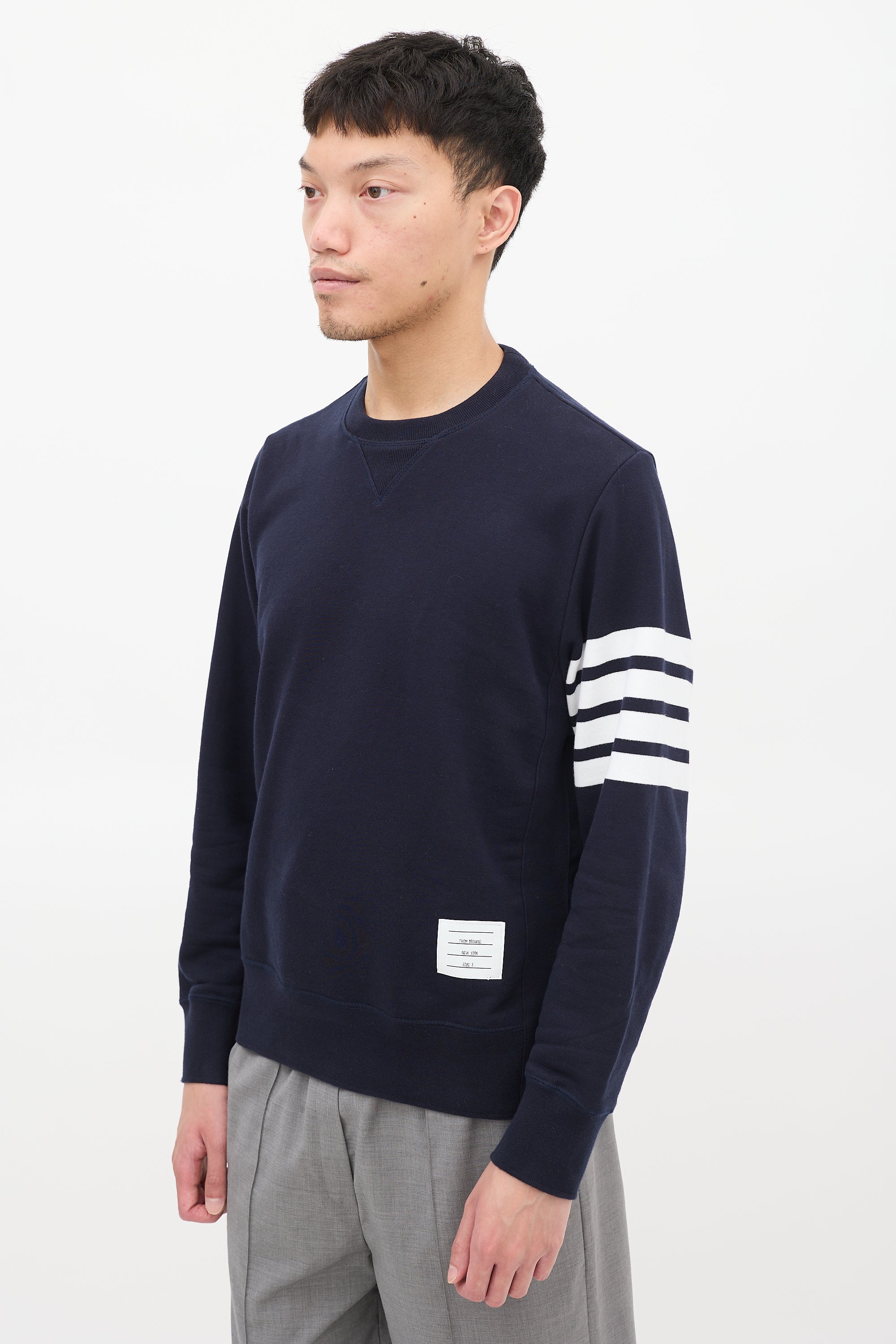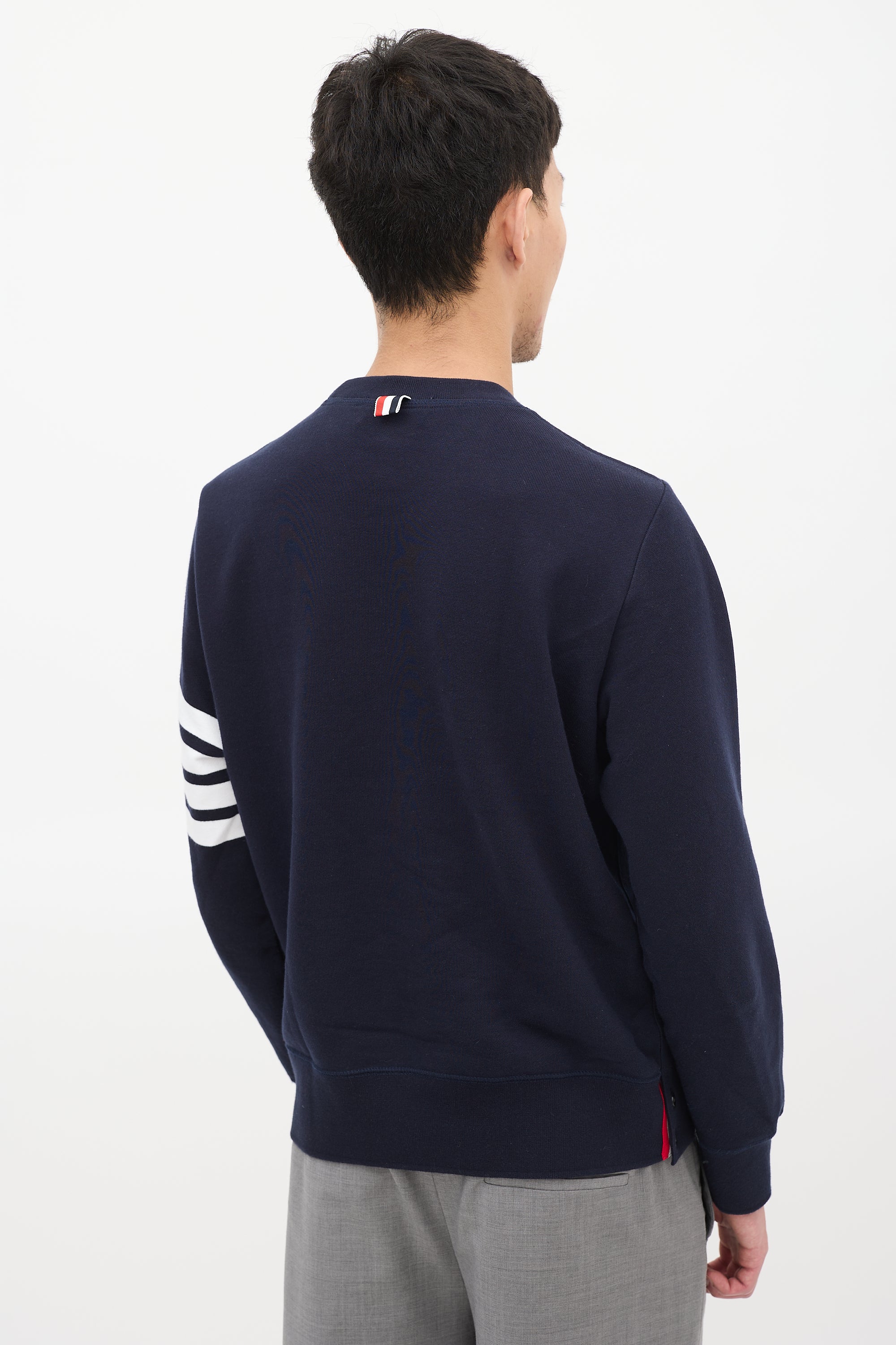 Pre-owned Thom Browne navy cotton sweater featuring a crew neck, signature tricolour grosgrain ribbon detail at back neck, white label at left hem, button up sides, long sleeves, four white bar detail at left arm, and ribbing at neck, sides, hem, and cuffs.