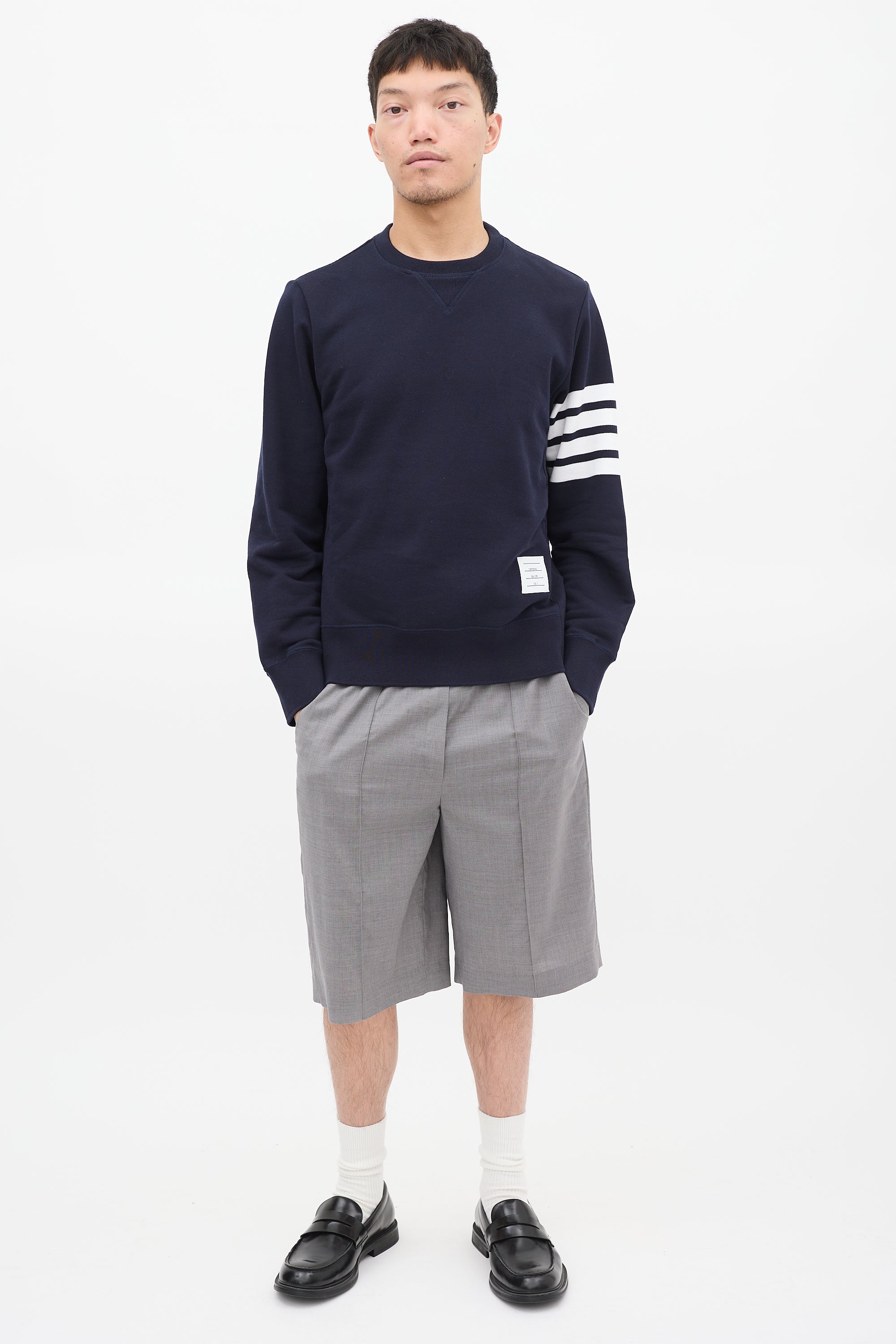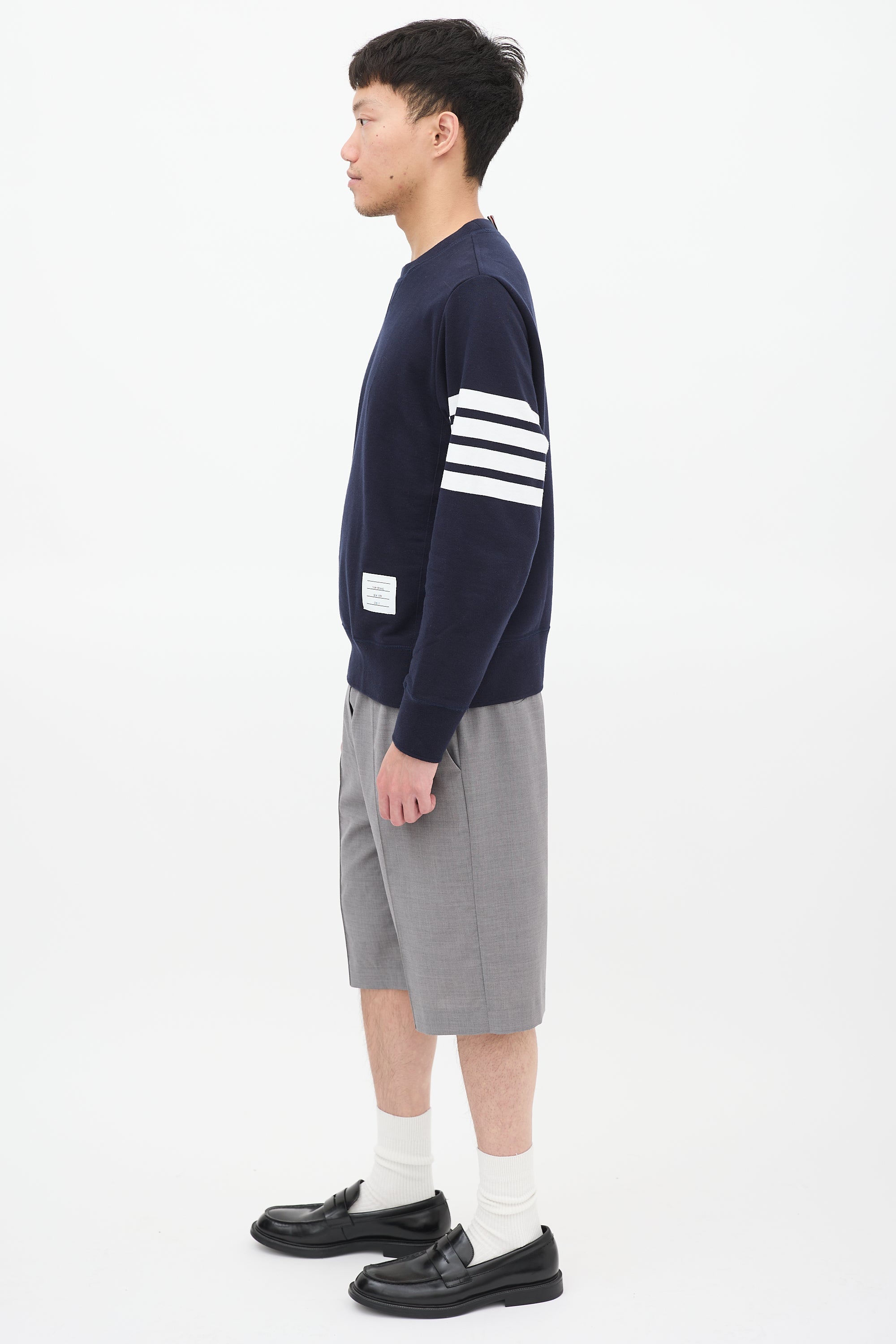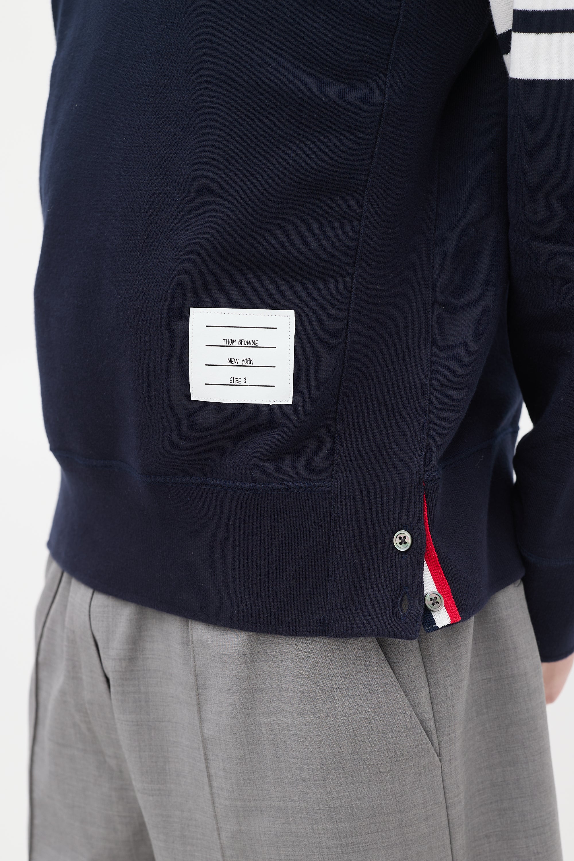 Pre-owned Thom Browne navy cotton sweater featuring a crew neck, signature tricolour grosgrain ribbon detail at back neck, white label at left hem, button up sides, long sleeves, four white bar detail at left arm, and ribbing at neck, sides, hem, and cuffs.