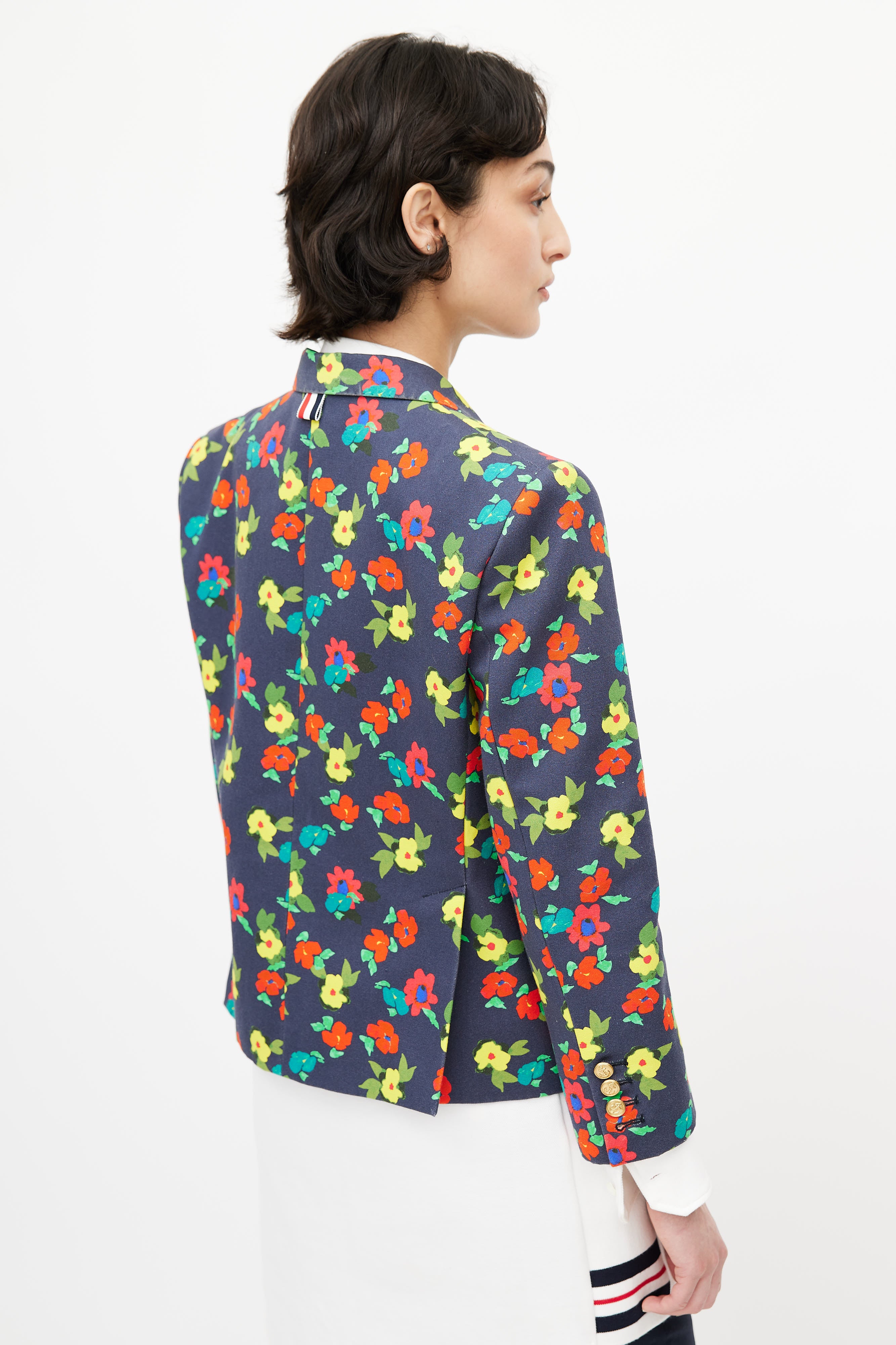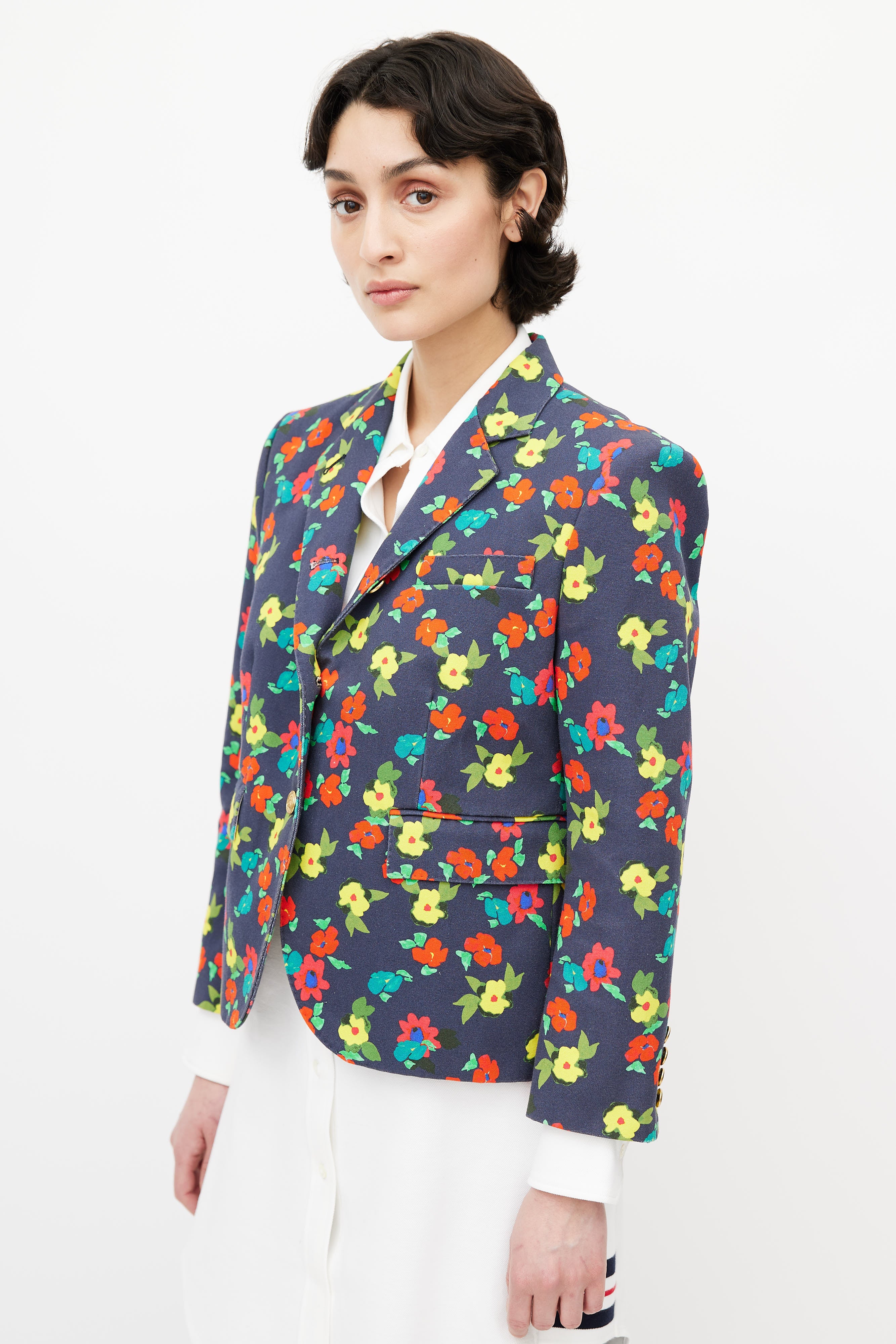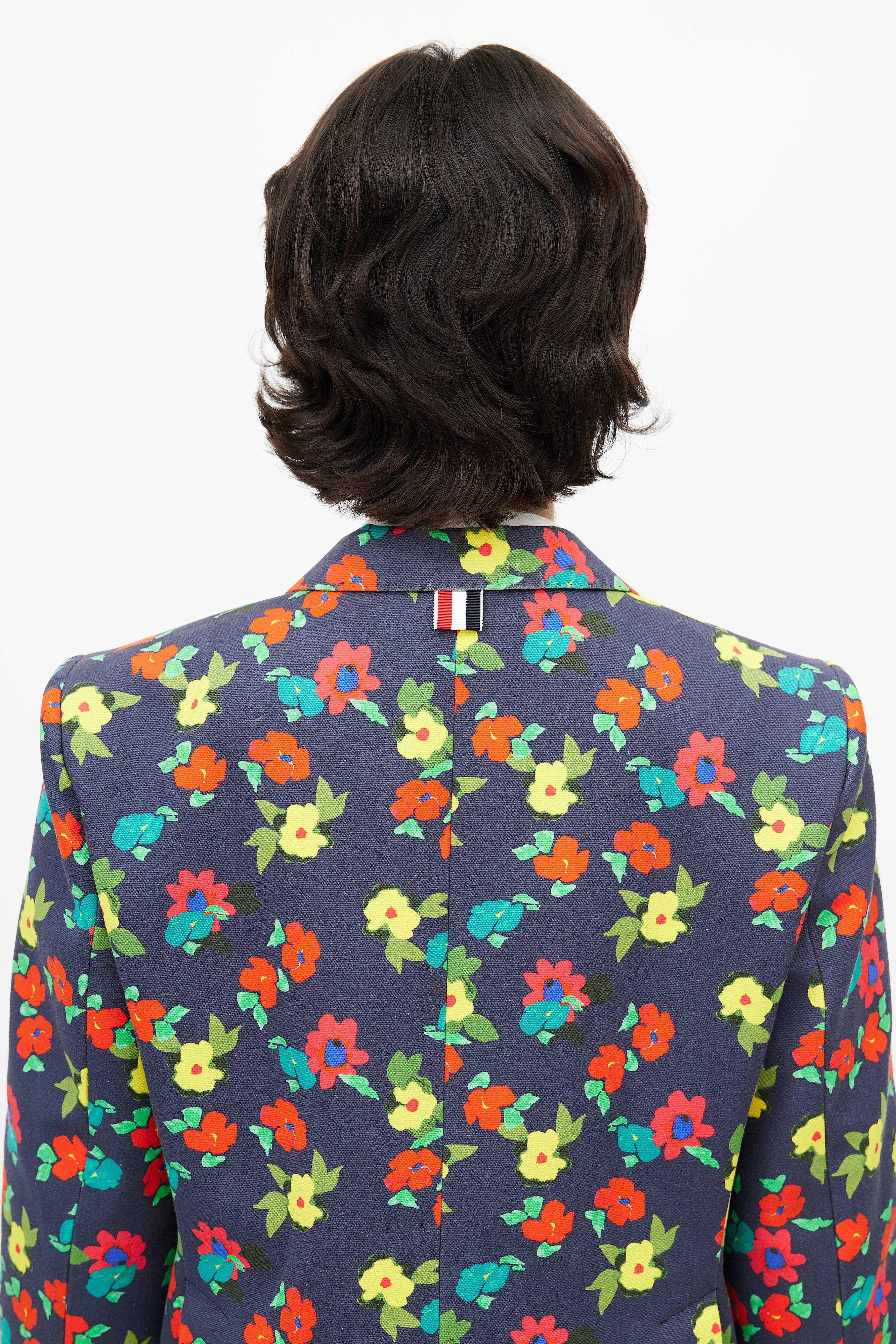 Pre-owned Thom Browne navy blazer featuring a multicolour floral print throughout, notched lapel, two flap pockets at hip, one patch pocket at chest, two vents at back, fully lined striped interior, and gold tone button up closure at front.