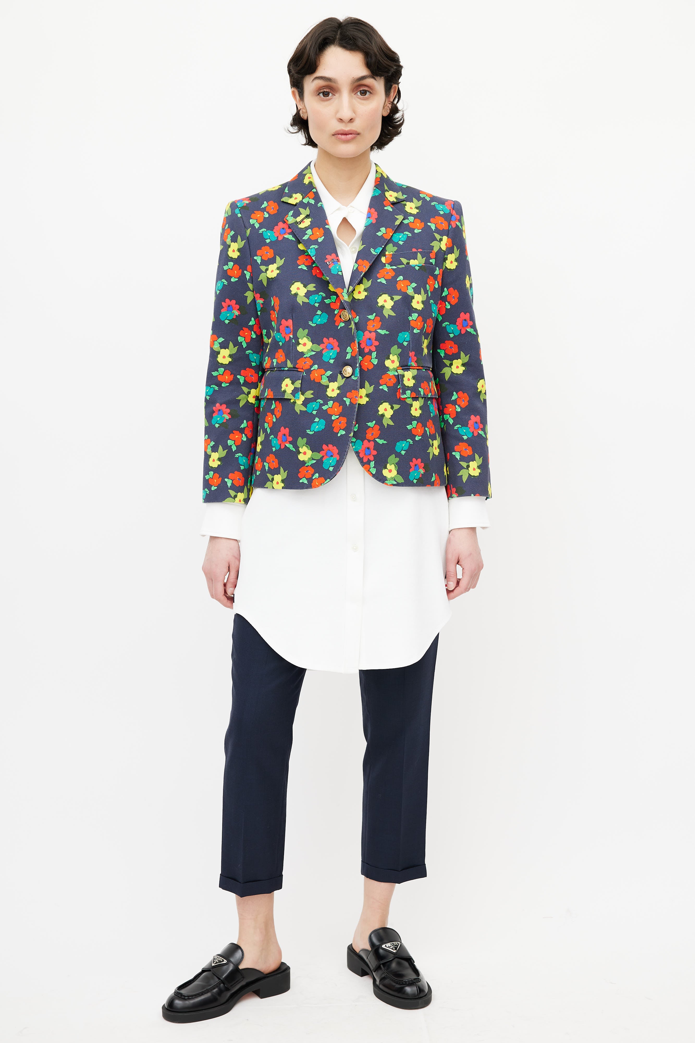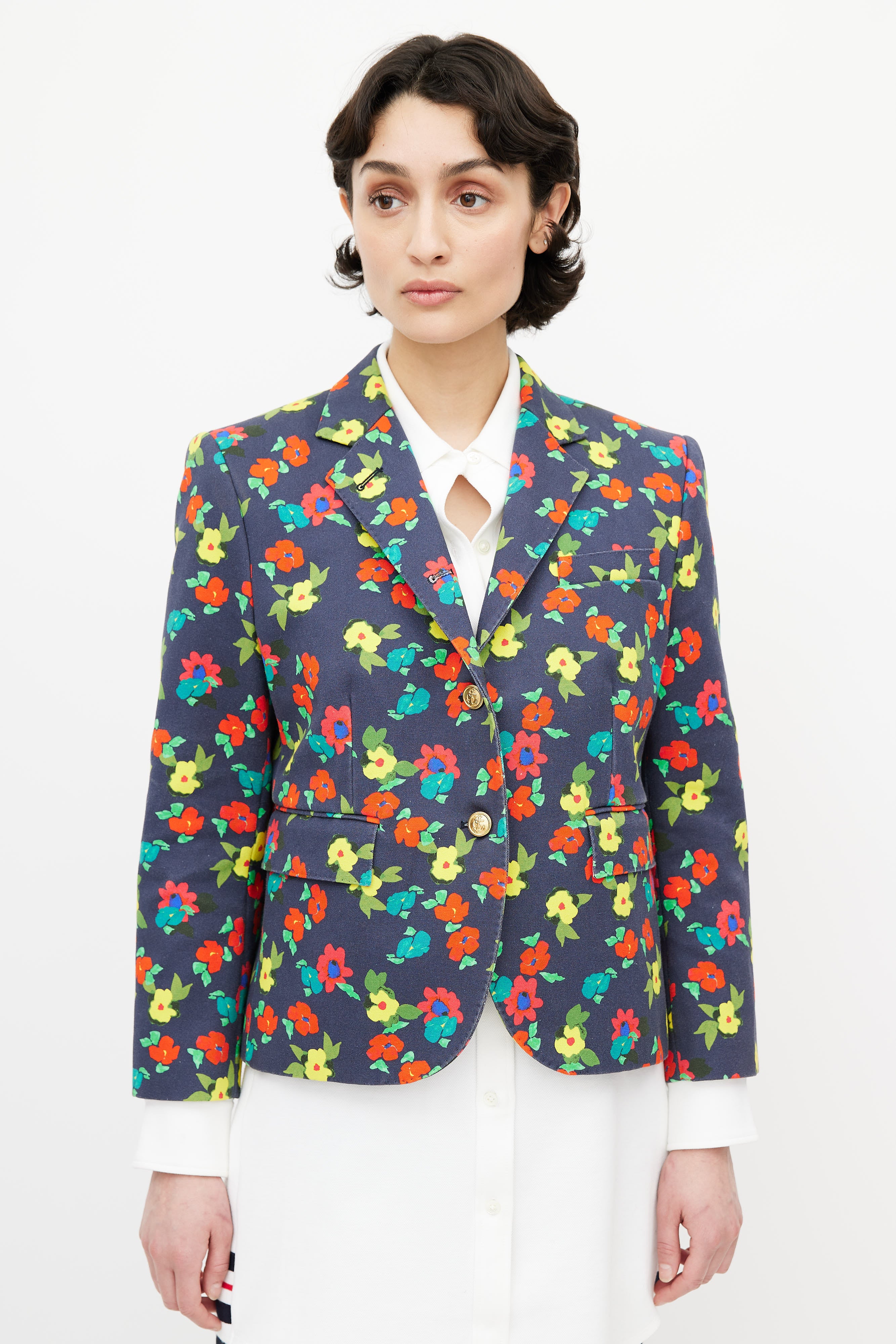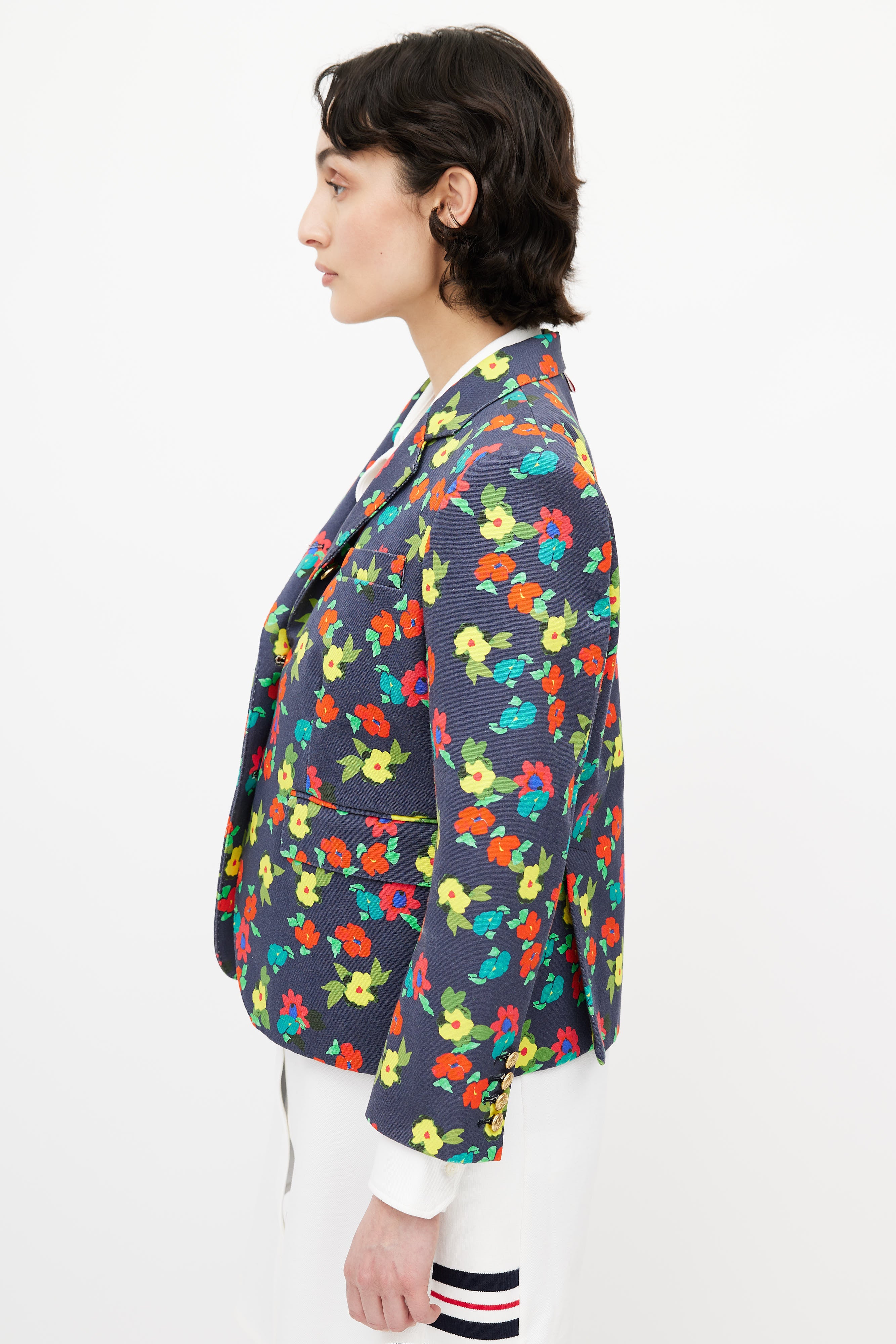 Pre-owned Thom Browne navy blazer featuring a multicolour floral print throughout, notched lapel, two flap pockets at hip, one patch pocket at chest, two vents at back, fully lined striped interior, and gold tone button up closure at front.